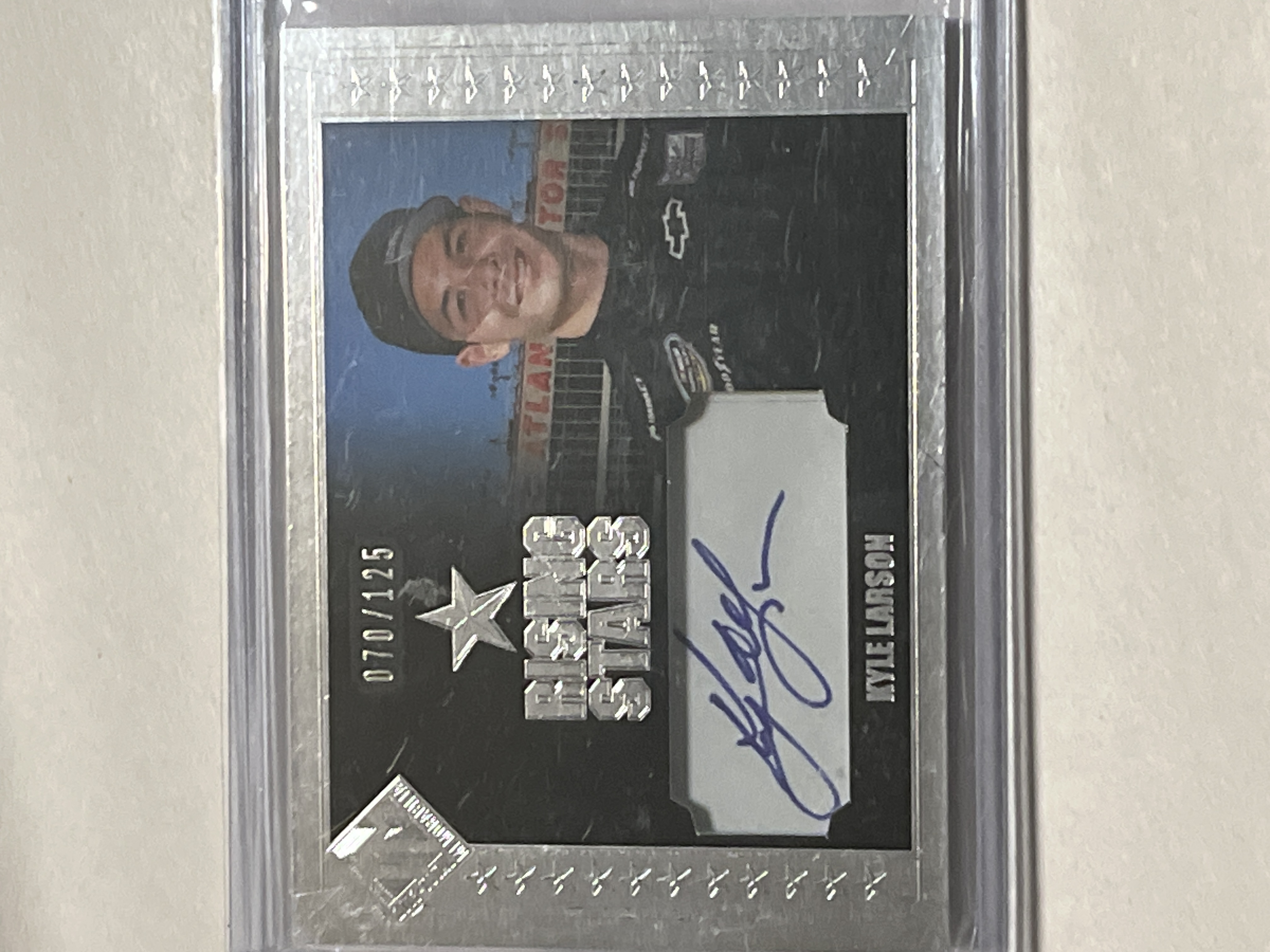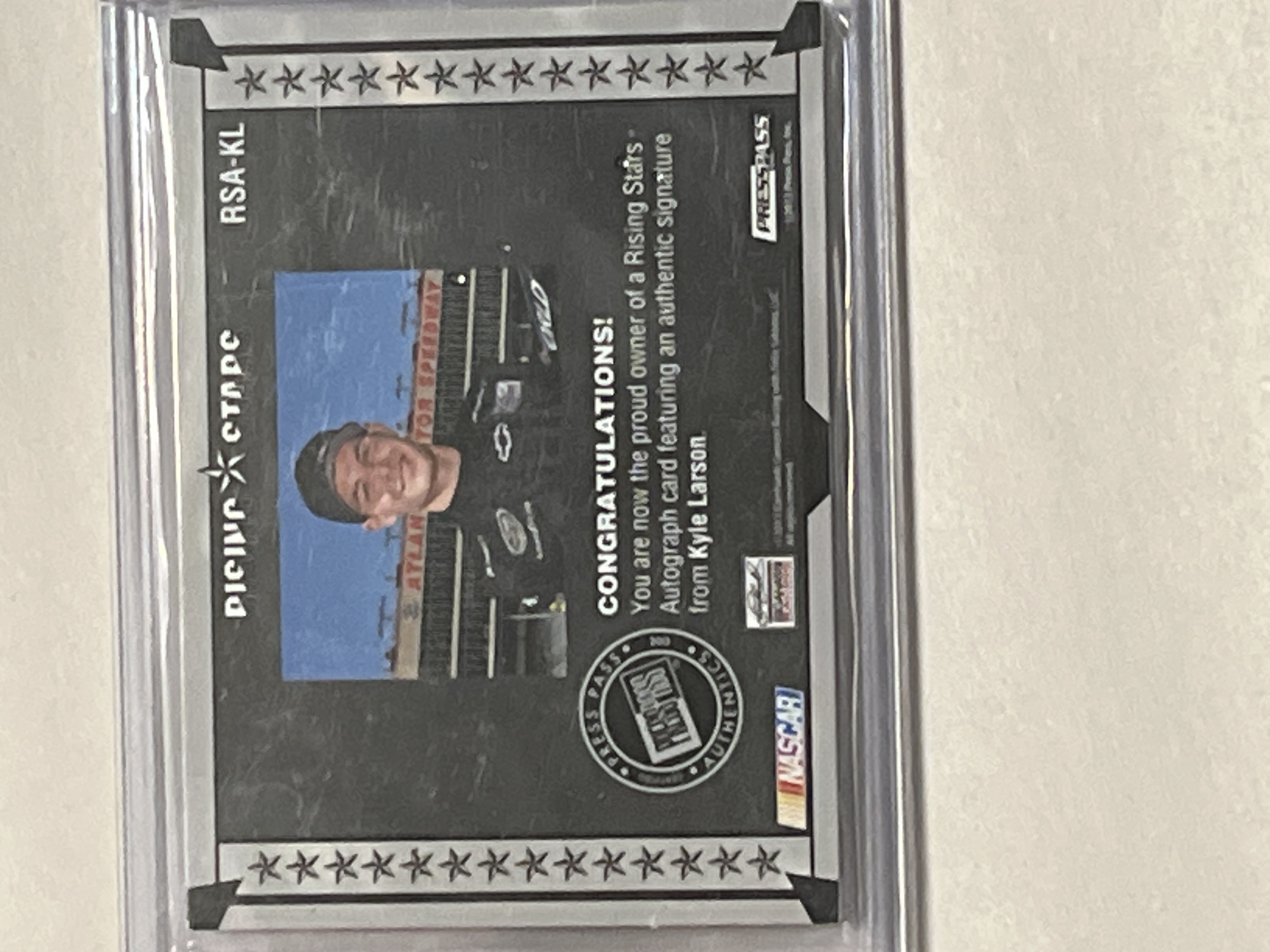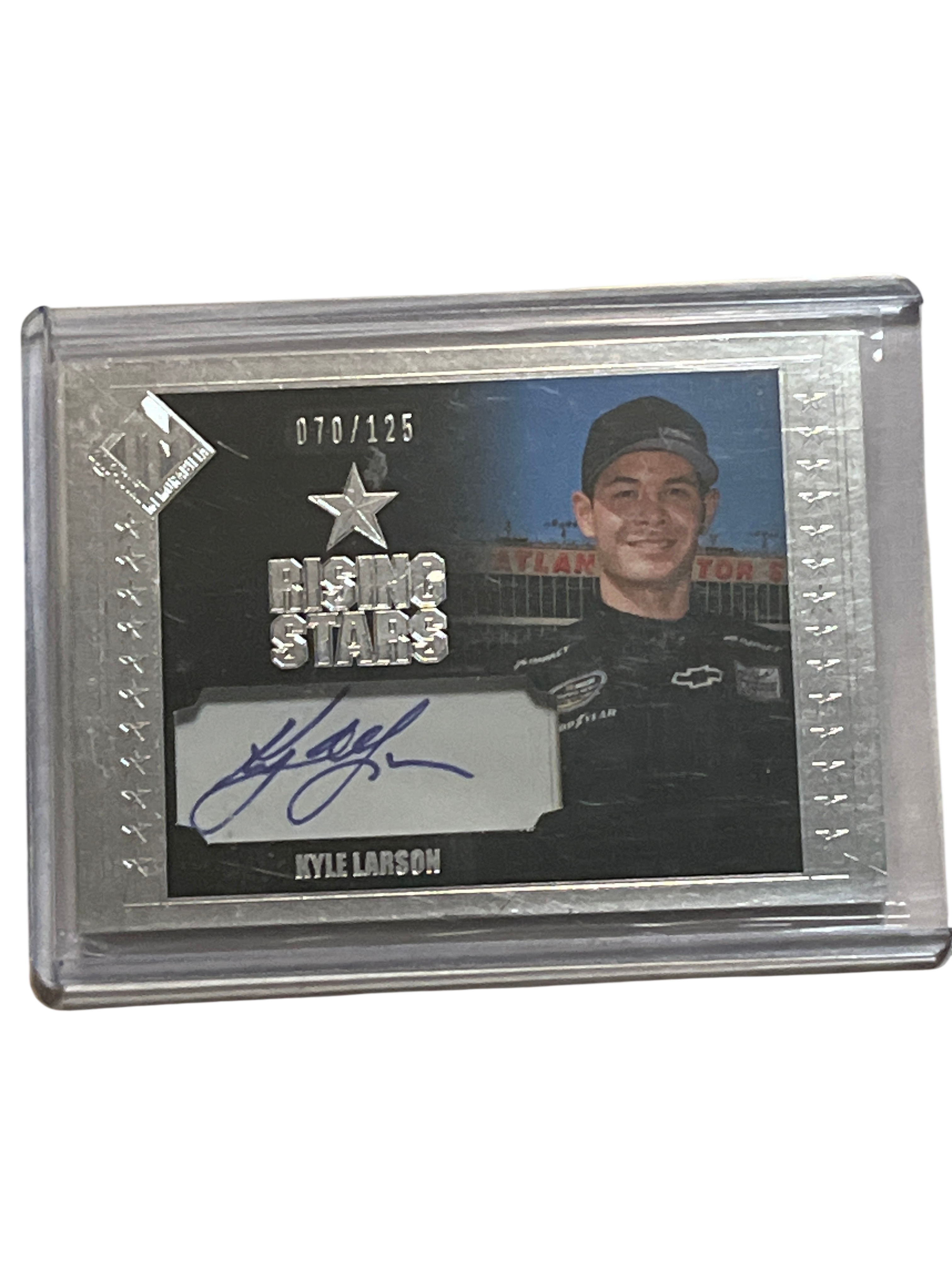 2013 Press Pass Rising Stars Kyle Larson rookie autograph trading card, number RSA-KL. The card features a blue ink on-card signature and is hand-numbered 070/125 on the front. It includes a rookie shield designation and official NASCAR branding on the reverse.