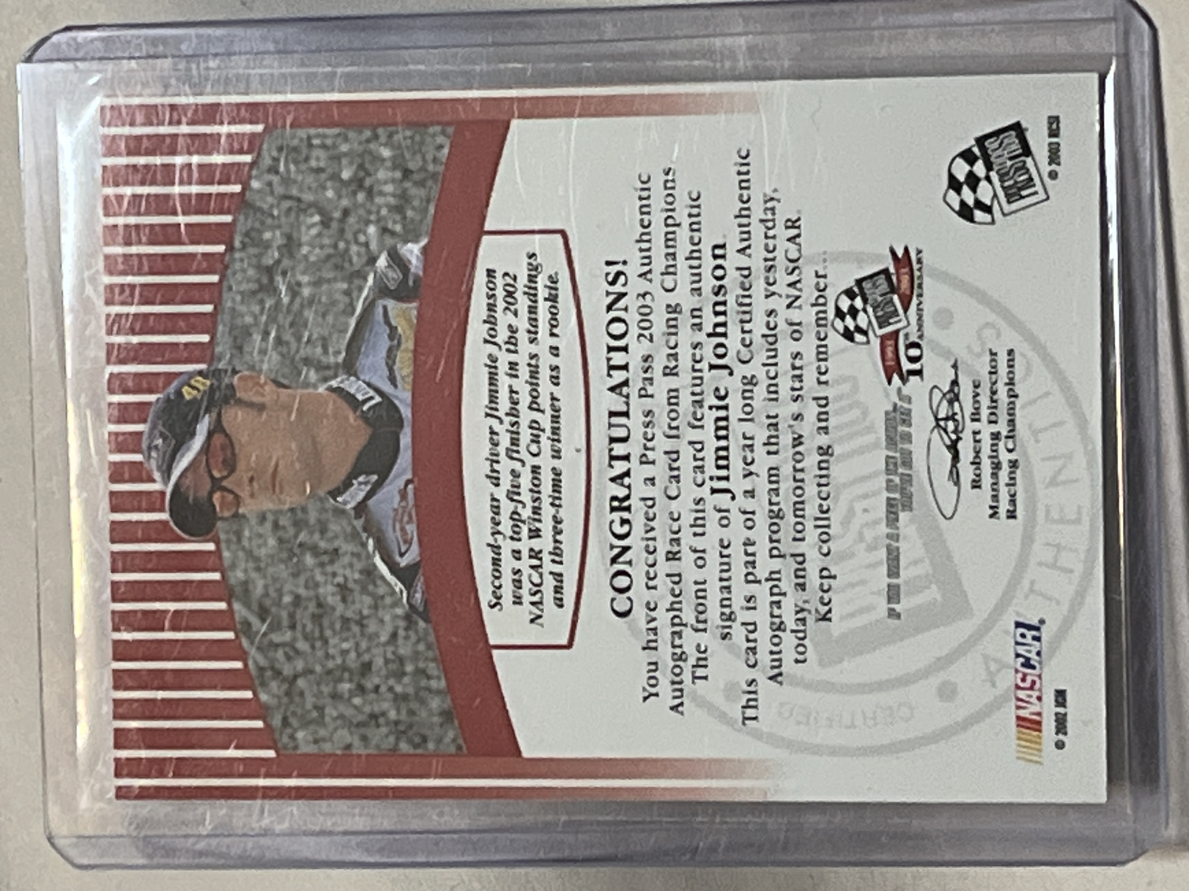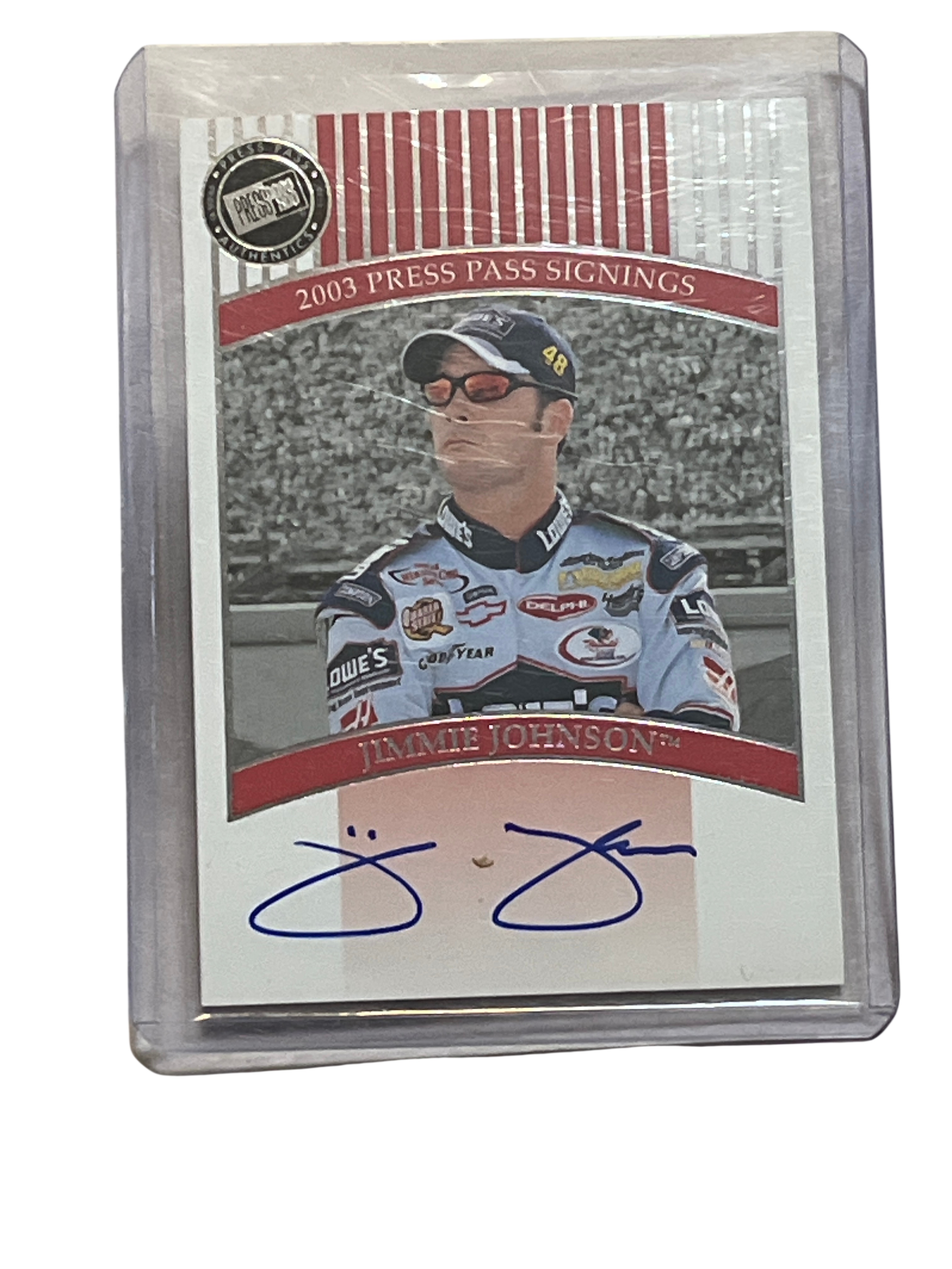 Press Pass Signings certified autograph trading card featuring NASCAR driver Jimmie Johnson, produced in 2003. This second-year card features an on-card signature in blue ink and includes the Press Pass Authentics logo. The reverse contains a statement of authenticity from Racing Champions and notes regarding the driver’s 2002 rookie season.