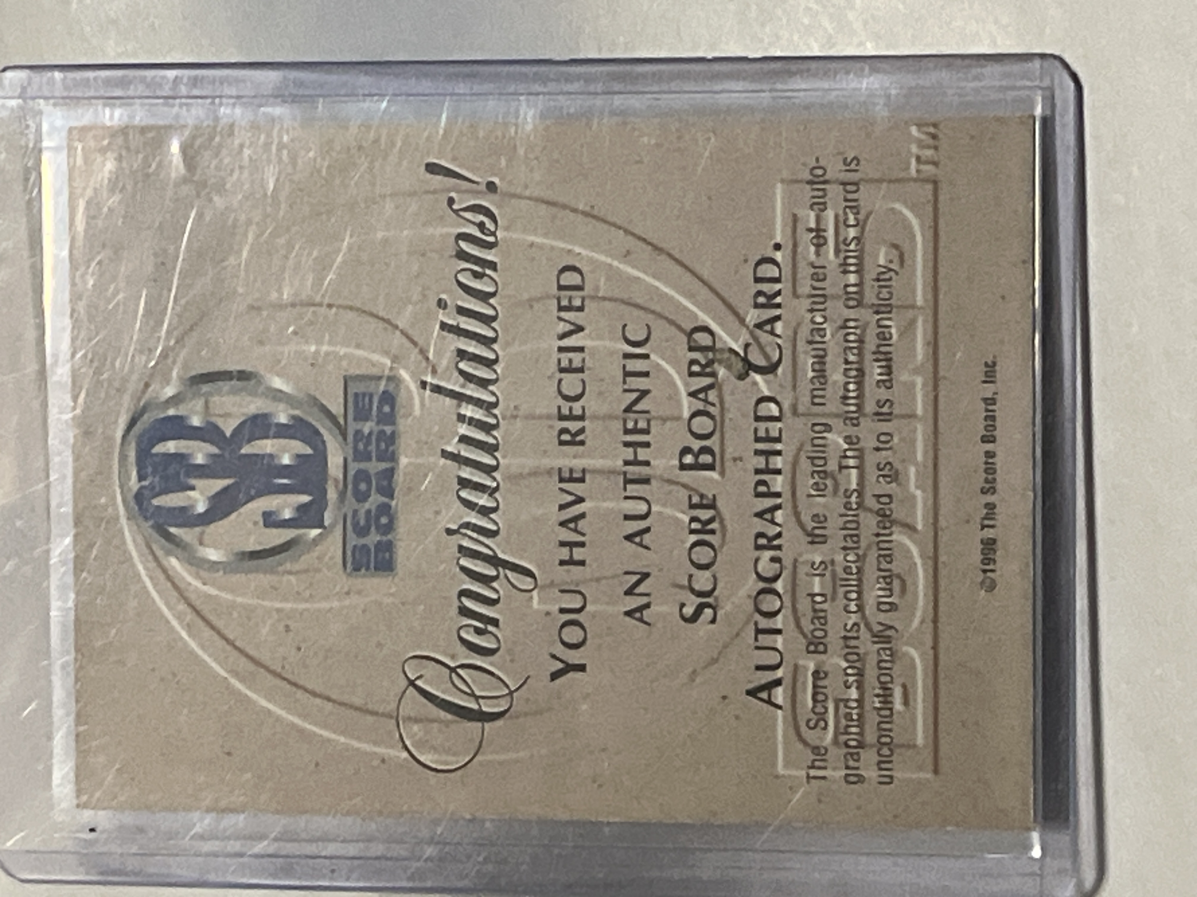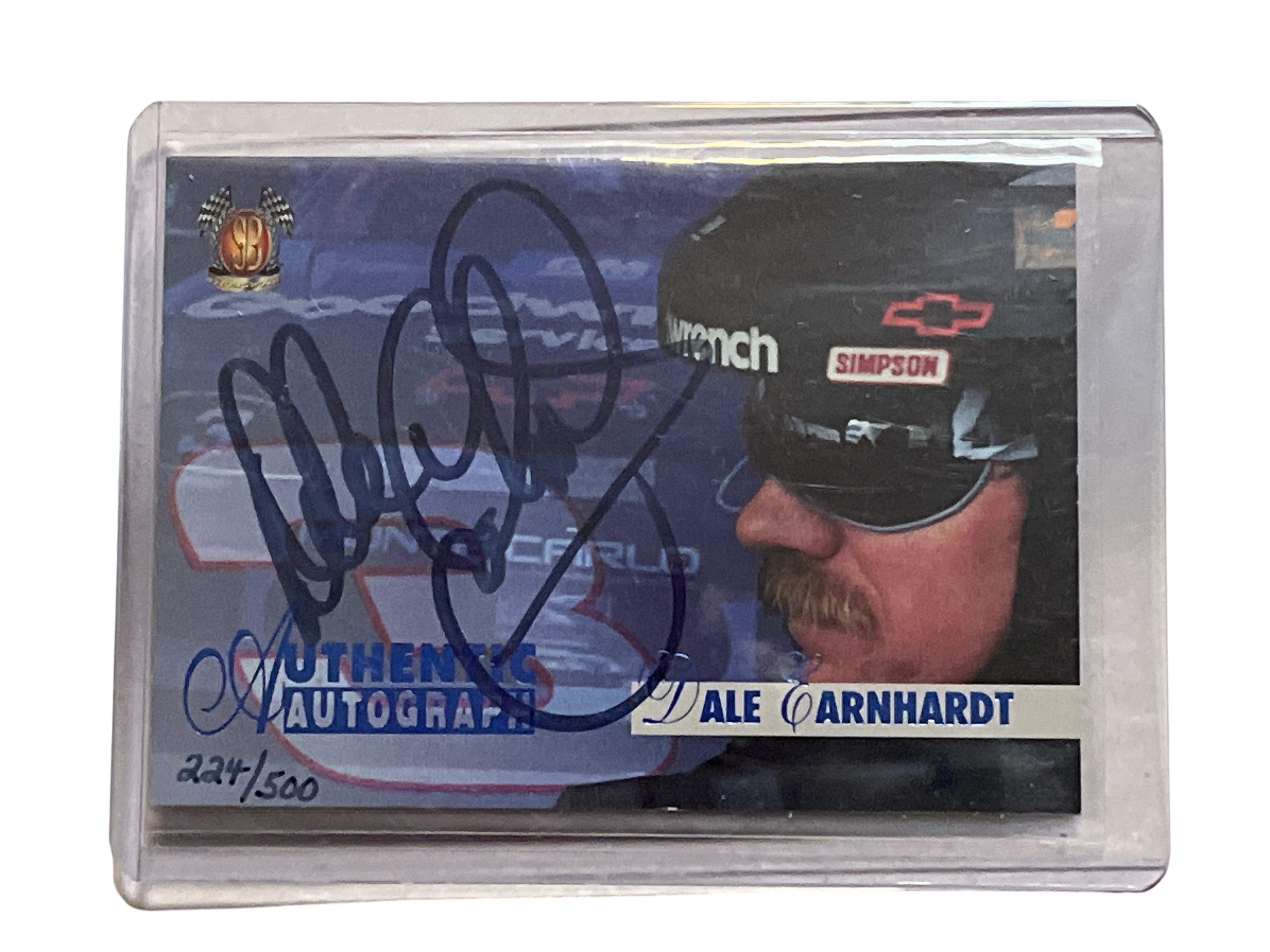 1996 Score Board, Inc. Dale Earnhardt authentic autographed trading card. The front features a hand-signed signature in blue ink across the center and hand-written numbering 224/500 in the lower-left corner. The reverse displays a manufacturer-guaranteed authenticity statement and the Score Board logo.