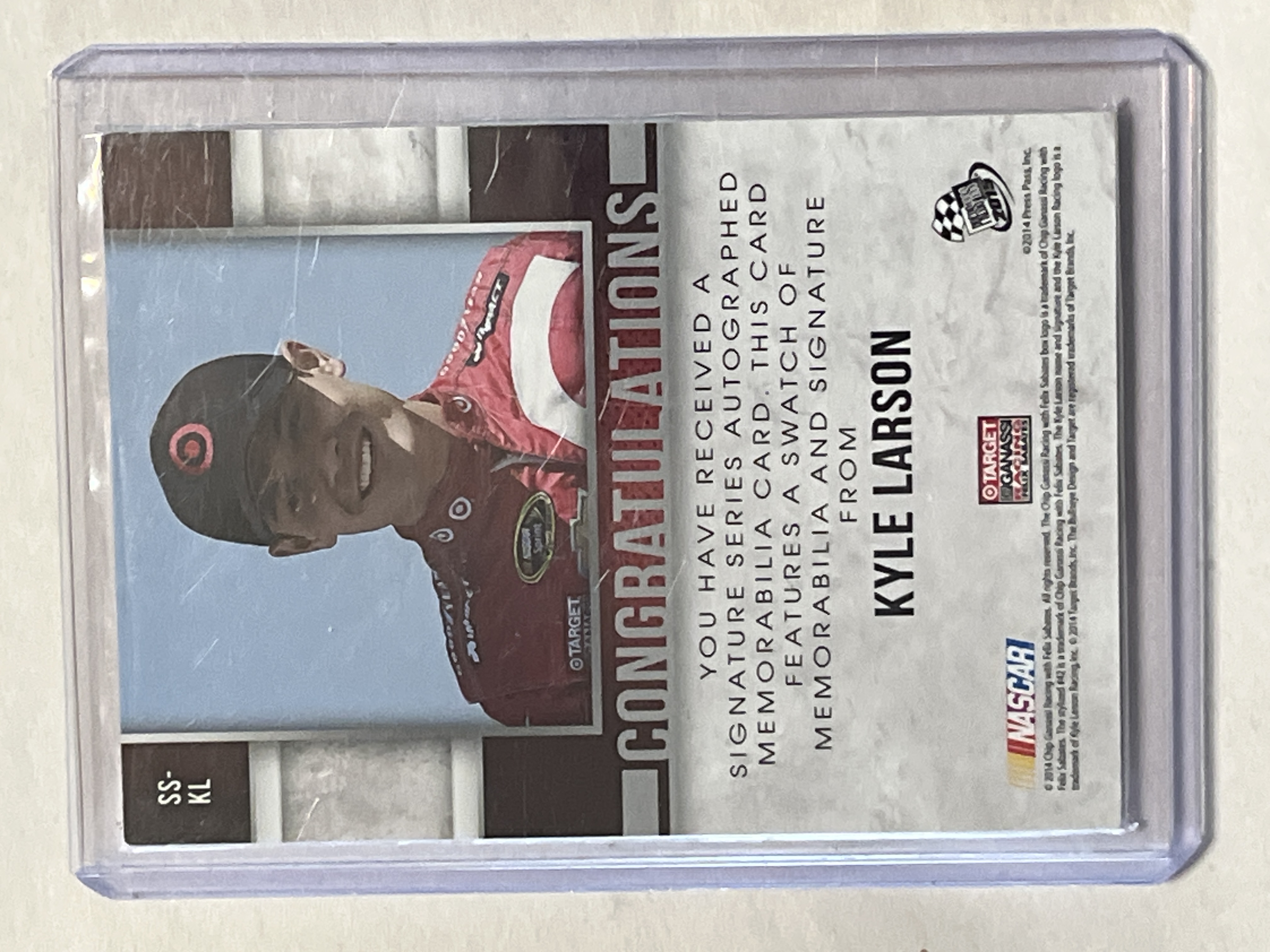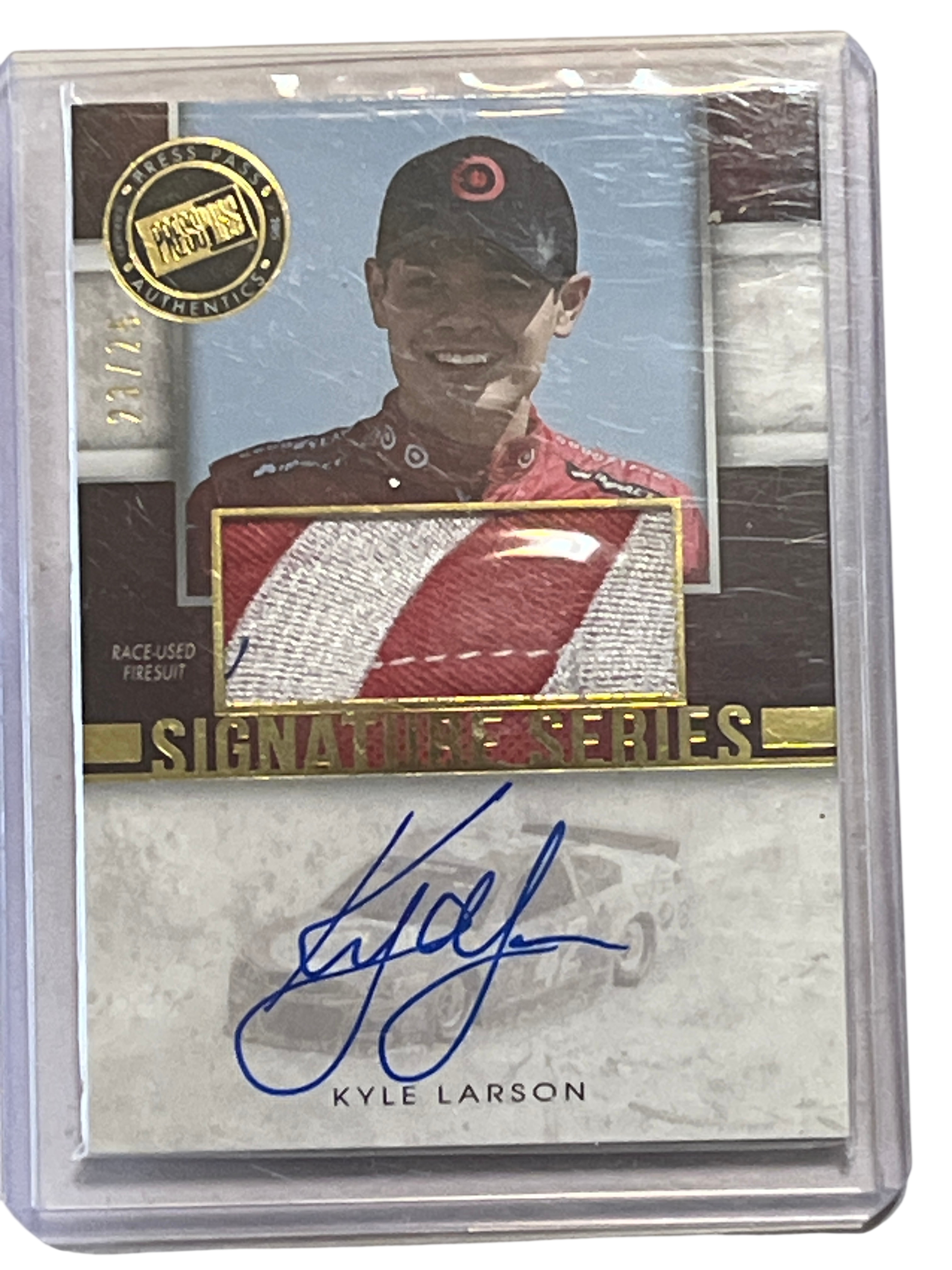 2014 Press Pass Signature Series autographed memorabilia card featuring NASCAR driver Kyle Larson, card number SS-KL. The card features an inset multi-color swatch of race-used firesuit and a hand-signed on-card autograph in blue ink. It is hand-numbered 23/25 in gold ink on the front and includes a Press Pass Authentics gold foil seal. The reverse displays official licensing from NASCAR and Target Chip Ganassi Racing alongside the manufacturer copyright.