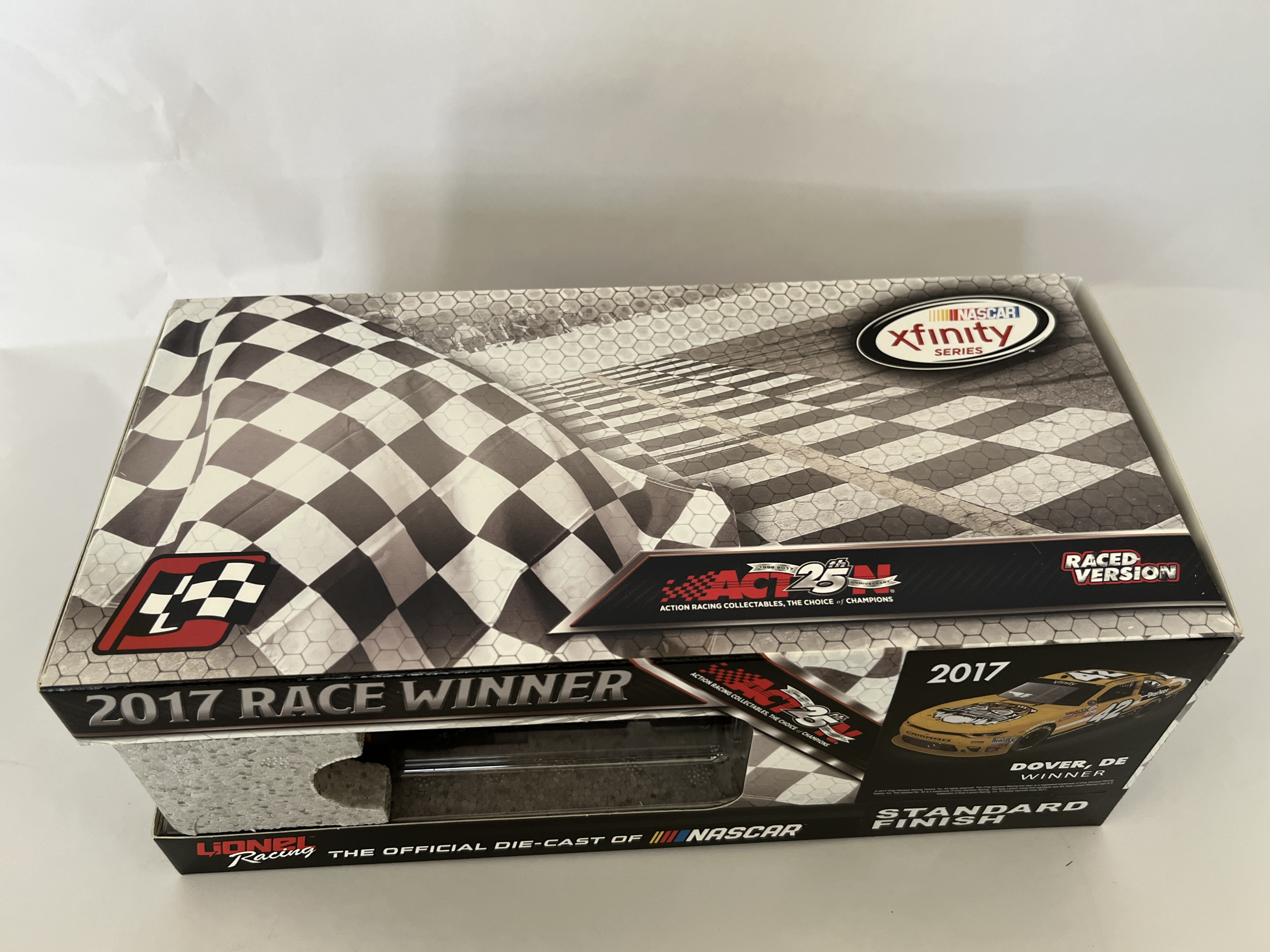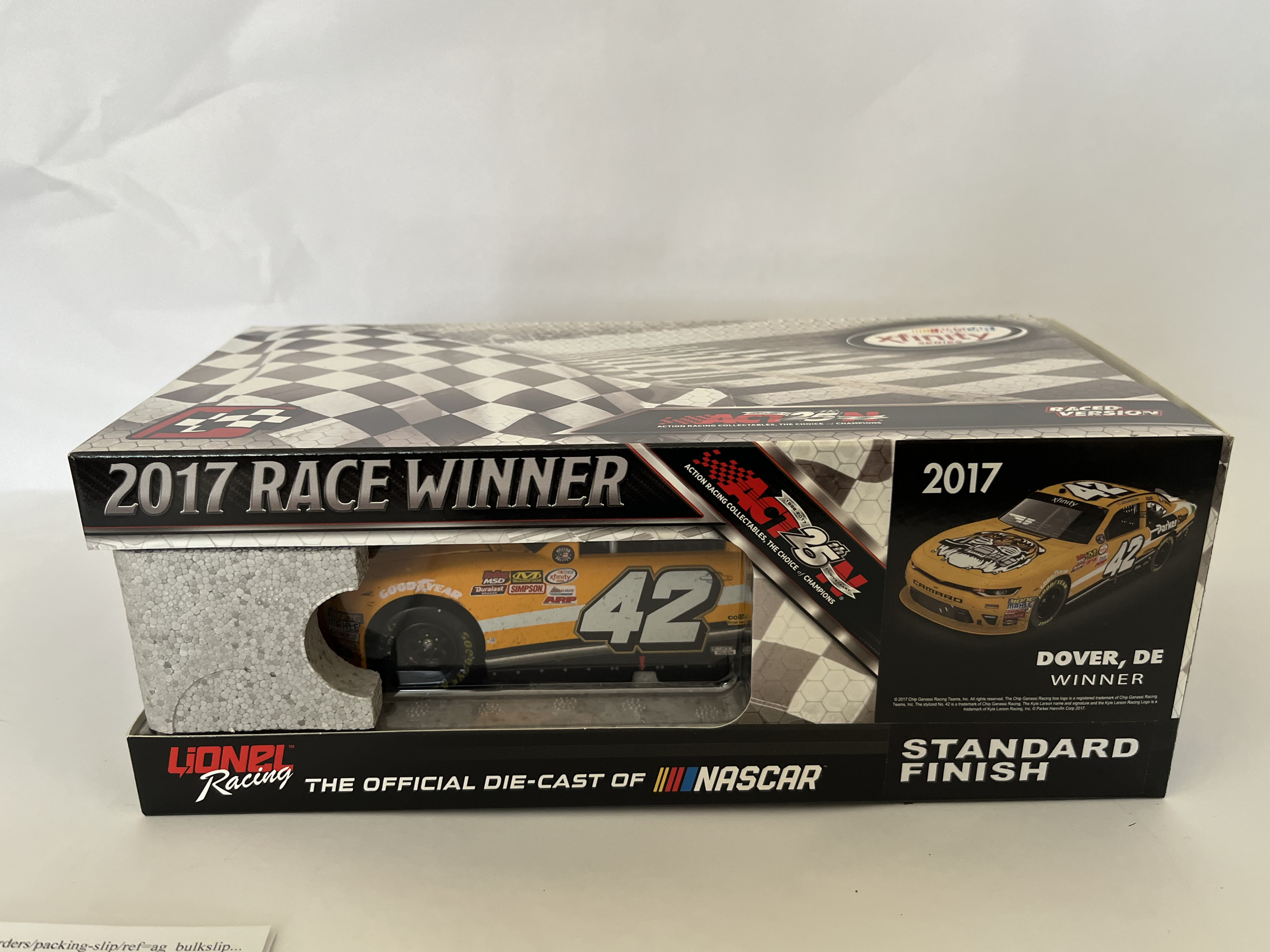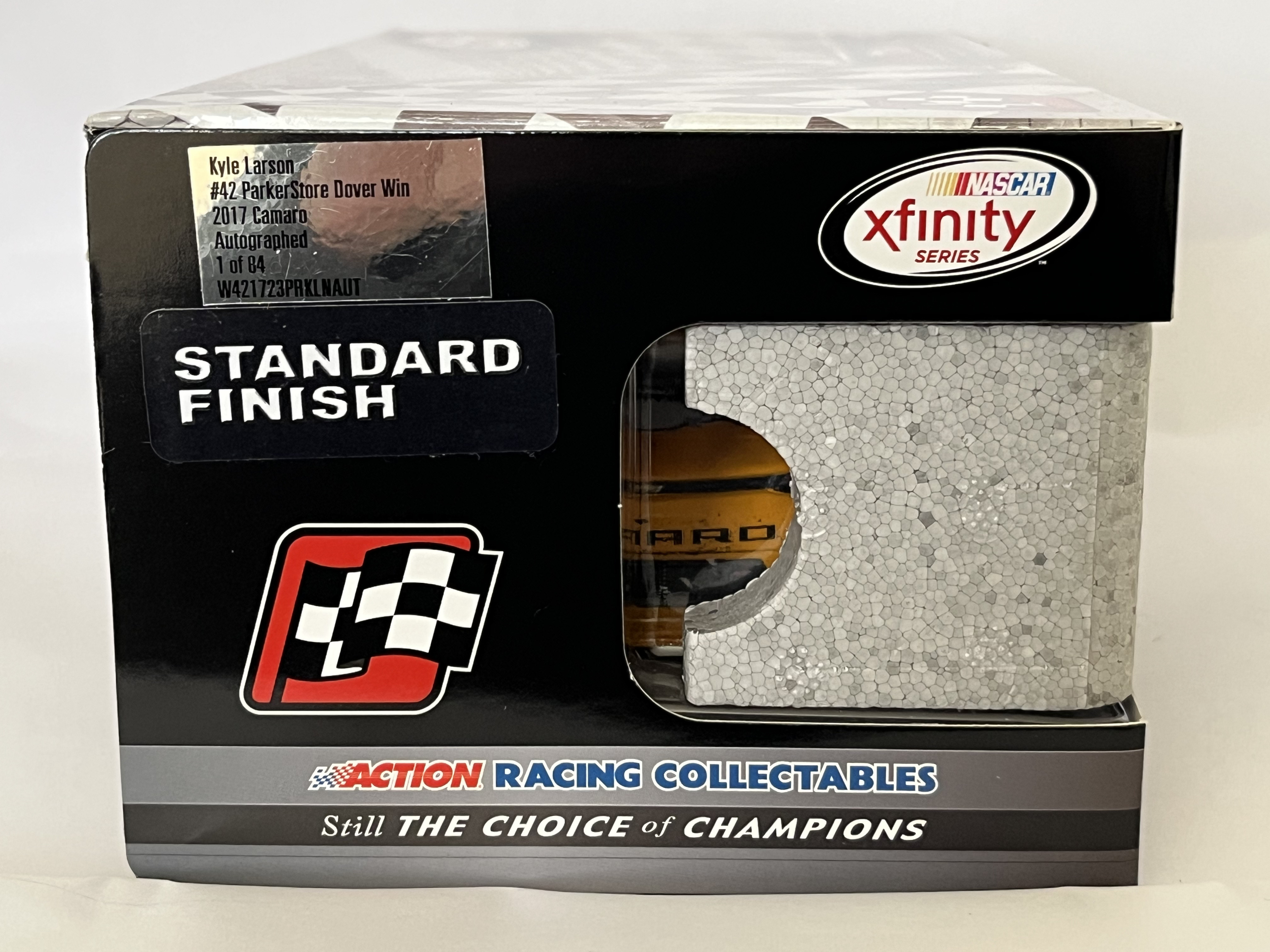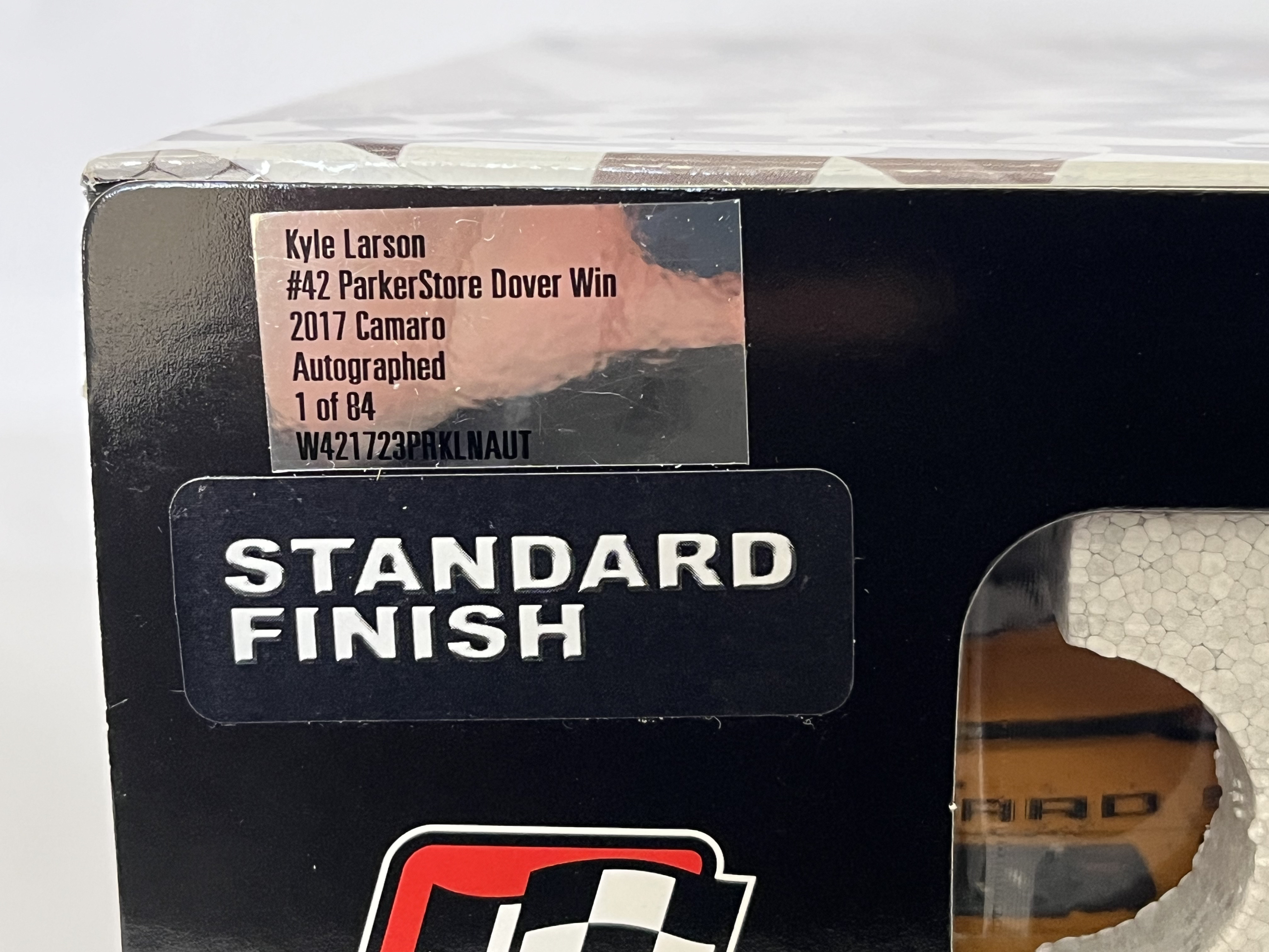 Lionel Racing Action Racing Collectables (ARC) 1:24 scale die-cast model of the Kyle Larson #42 ParkerStore Chevrolet Camaro. This Raced Version commemorates the 2017 Dover, DE race win and features simulated race-day grime and damage as seen on the car in victory lane. The model is a limited-edition autographed release, authenticated by a silver holographic manufacturer label on the side panel specifying Kyle Larson #42 ParkerStore Dover Win 2017 Camaro Autographed 1 of 84 with serial code W421723PRKLNAUT. Approximately 10 x 4.5 x 3.5 inches.
