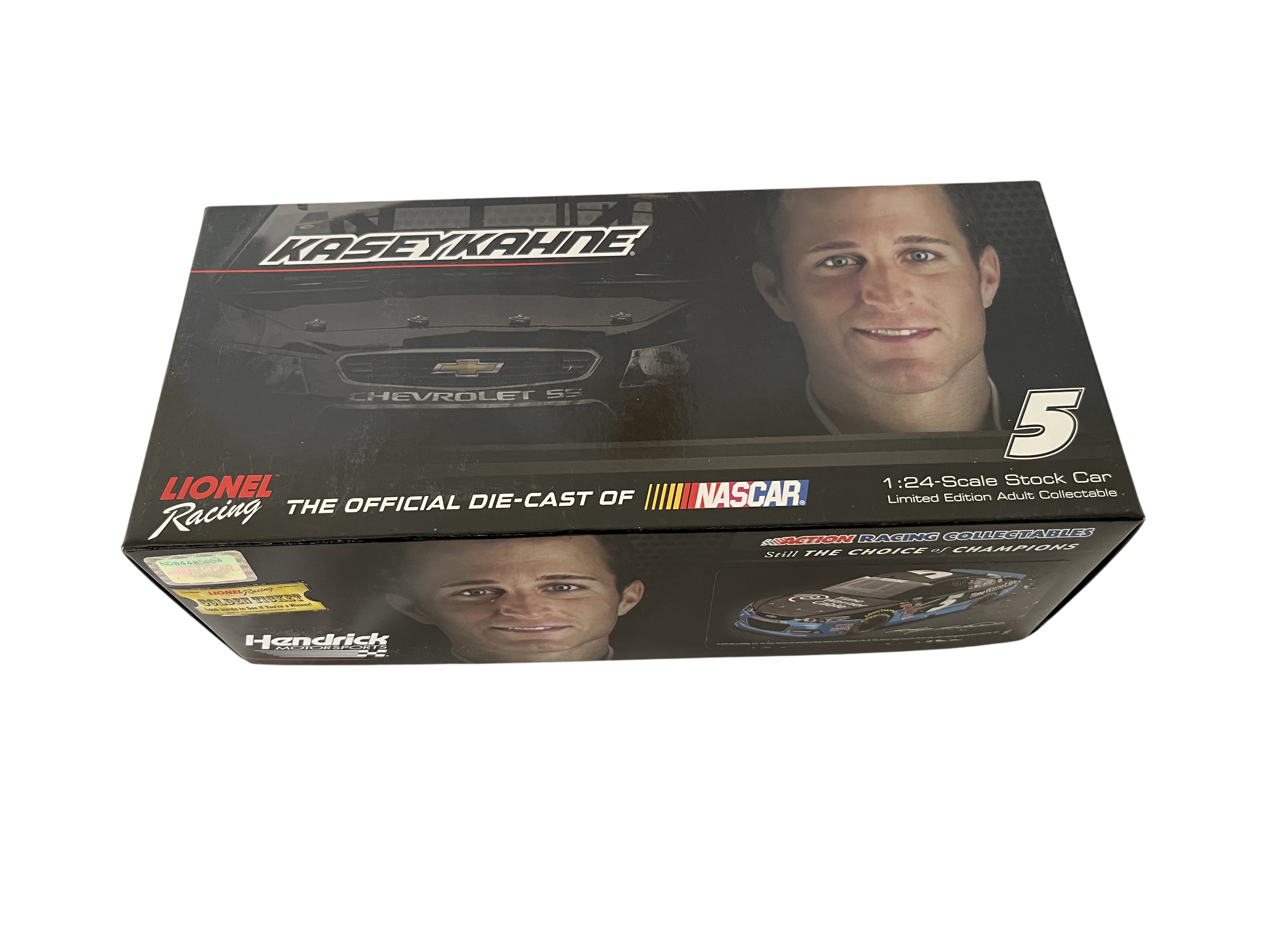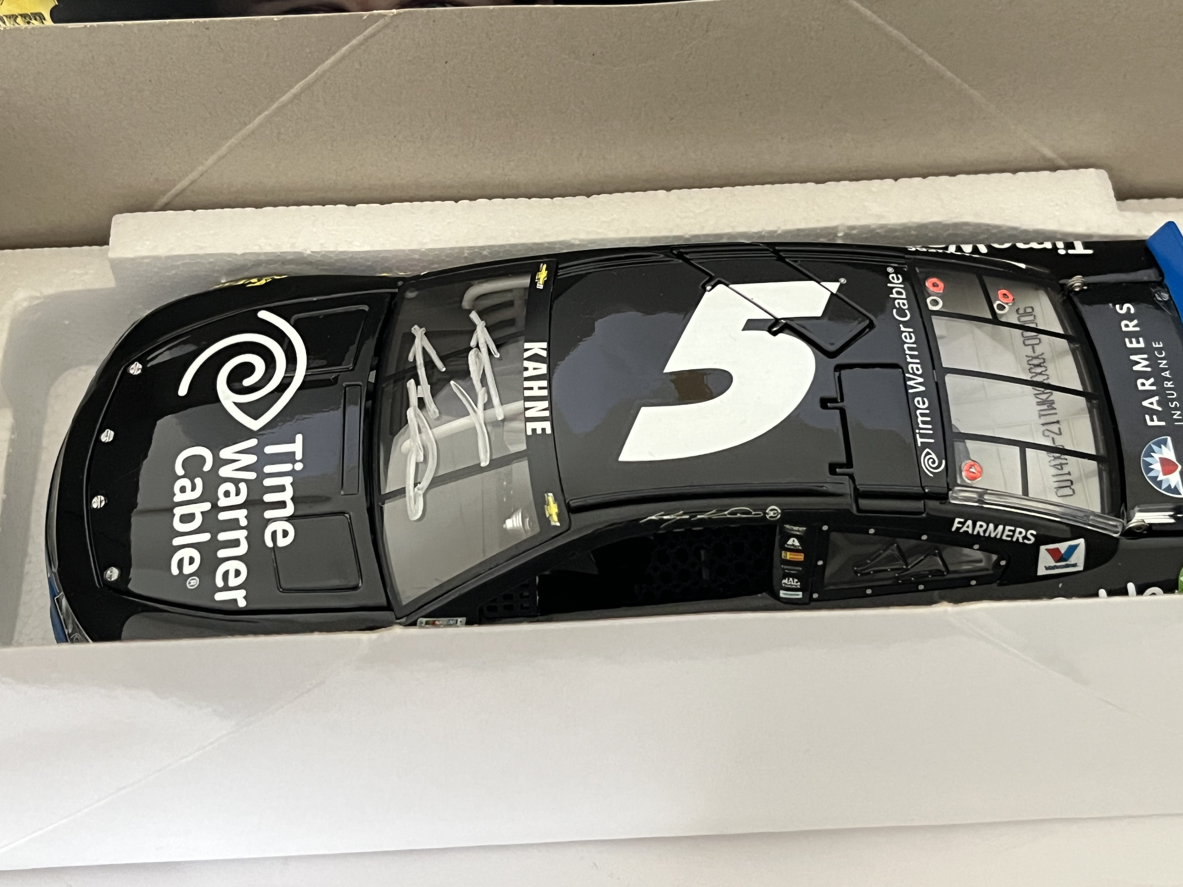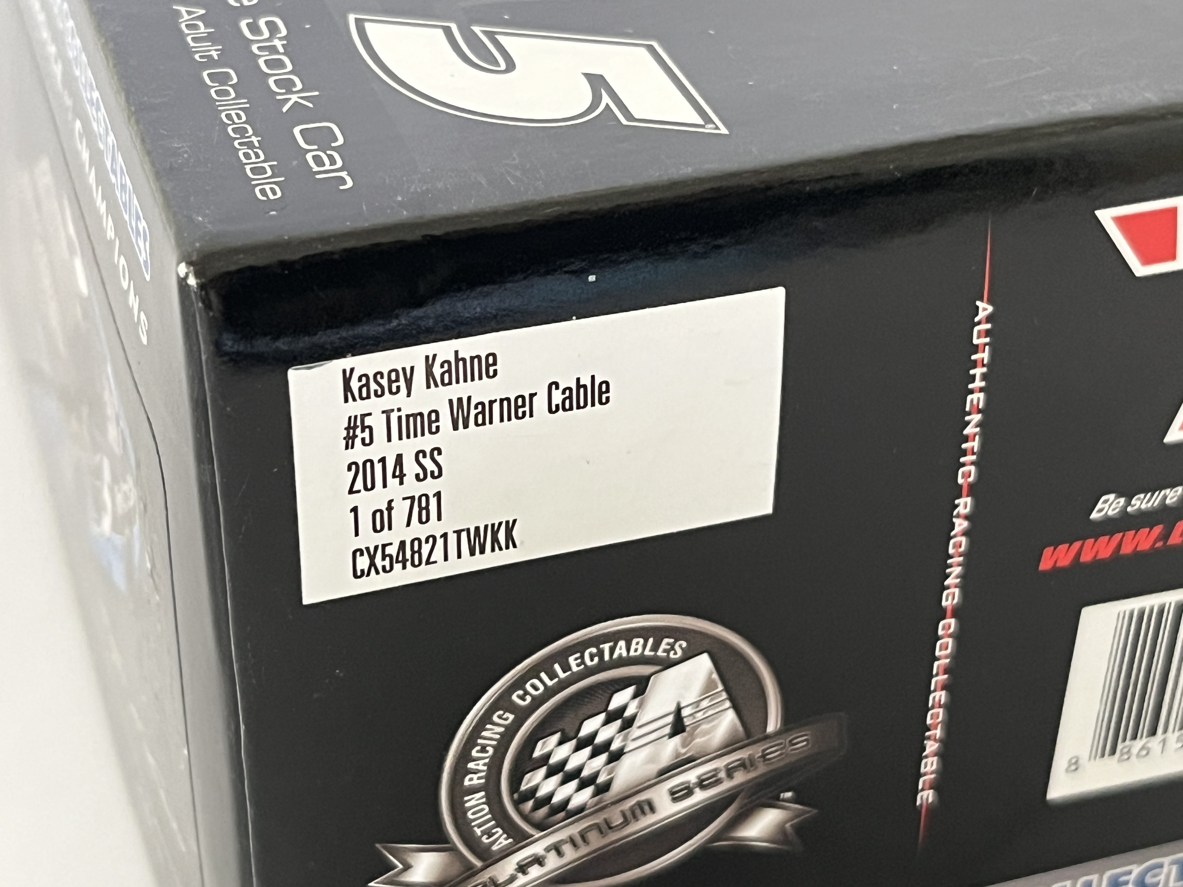 This 1:24 scale die-cast model represents Kasey Kahne’s #5 Time Warner Cable Chevrolet SS as campaigned during the 2014 NASCAR season. Produced by Lionel Racing under the Action Racing Collectables Platinum Series, the vehicle features a detailed black paint scheme with sponsor decals for Time Warner Cable, Farmers Insurance, and Goodyear. The front windshield bears a signature in white paint marker attributed to driver Kasey Kahne. This item is a limited edition release, noted on the packaging as “1 of 781” with SKU CX54821TWKK. A unique Diecast Identification Number (DIN) CU14X-21TWKK-XXX-00006 is visible through the rear window. The model is constructed of die-cast metal with plastic detailing and includes an opening hood and trunk. It is housed in its original branded box with the factory styrofoam interior and includes a “Golden Ticket” promotional insert.