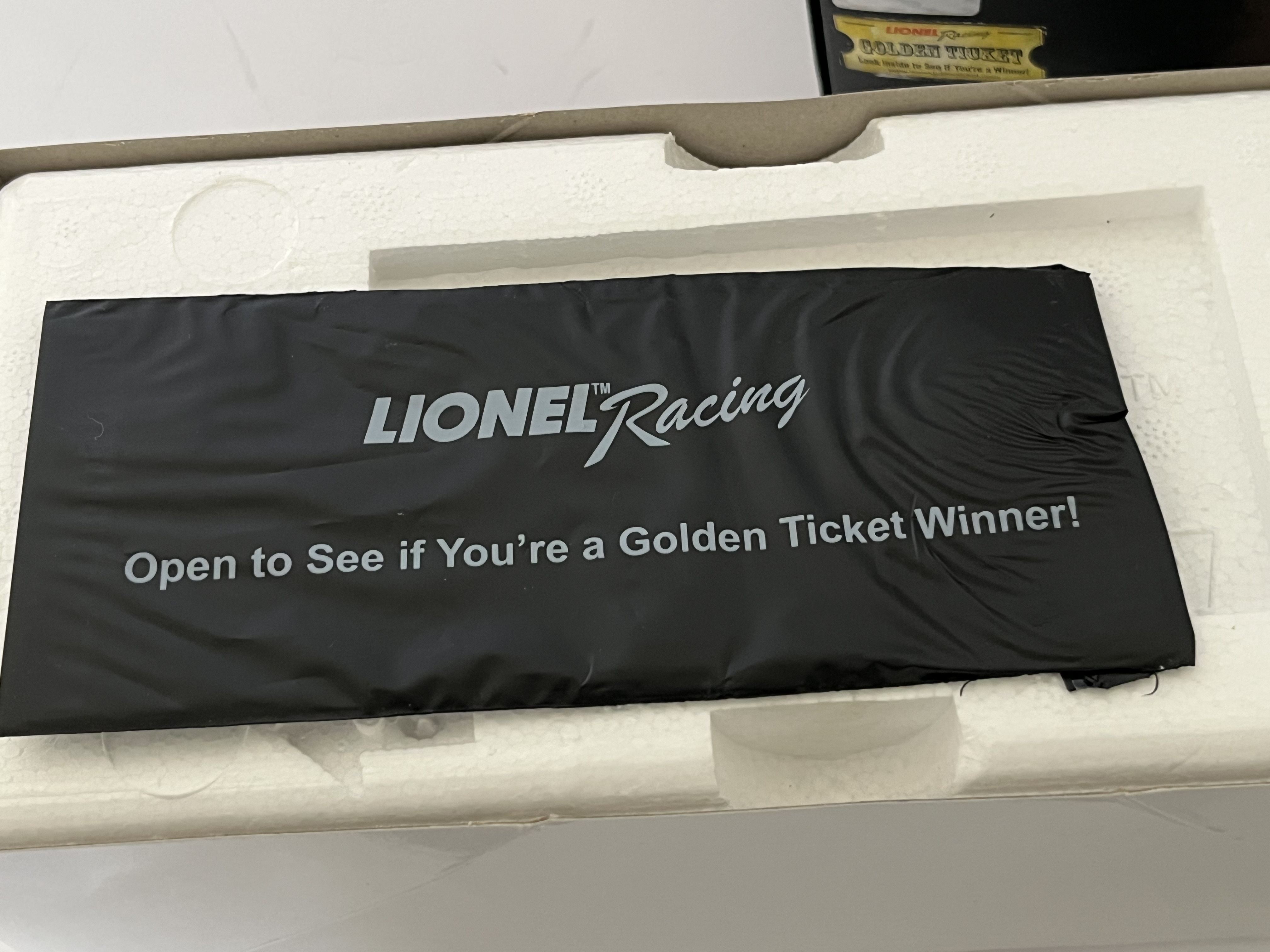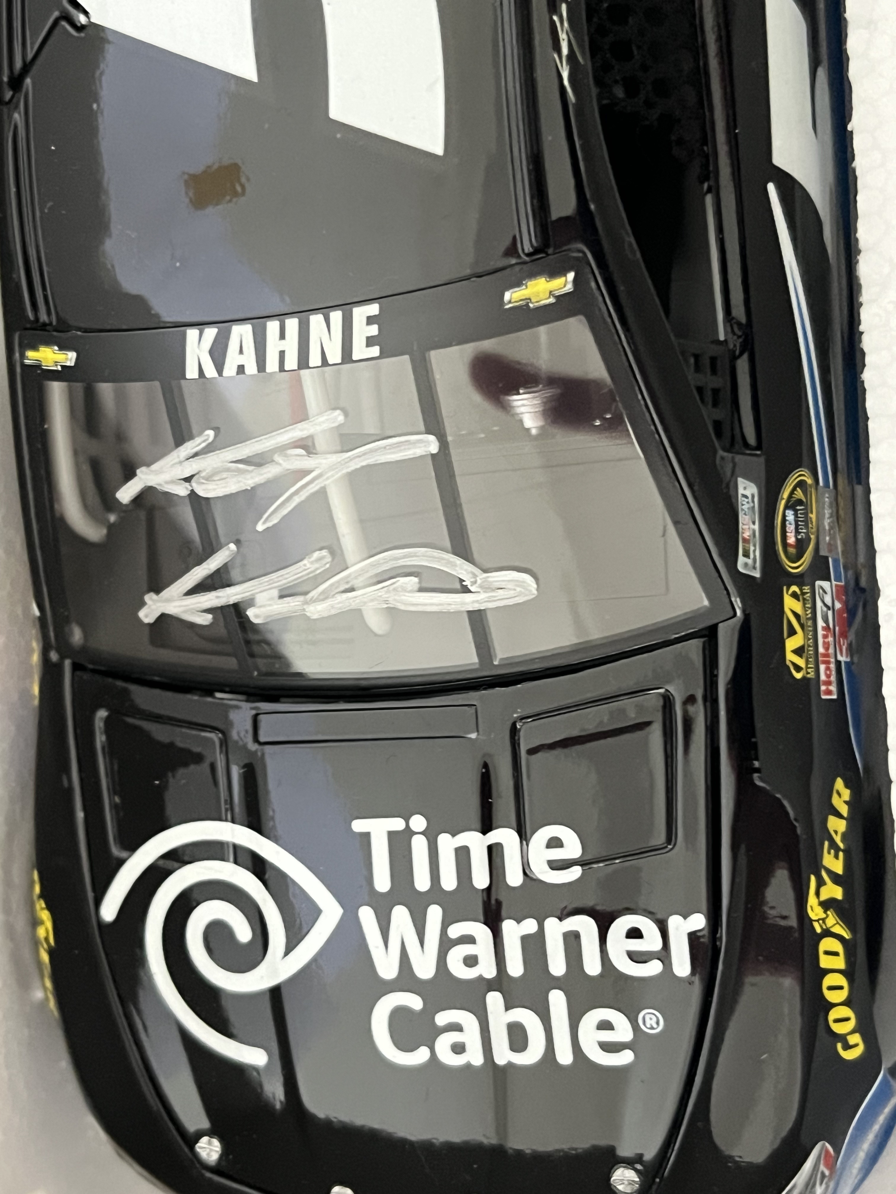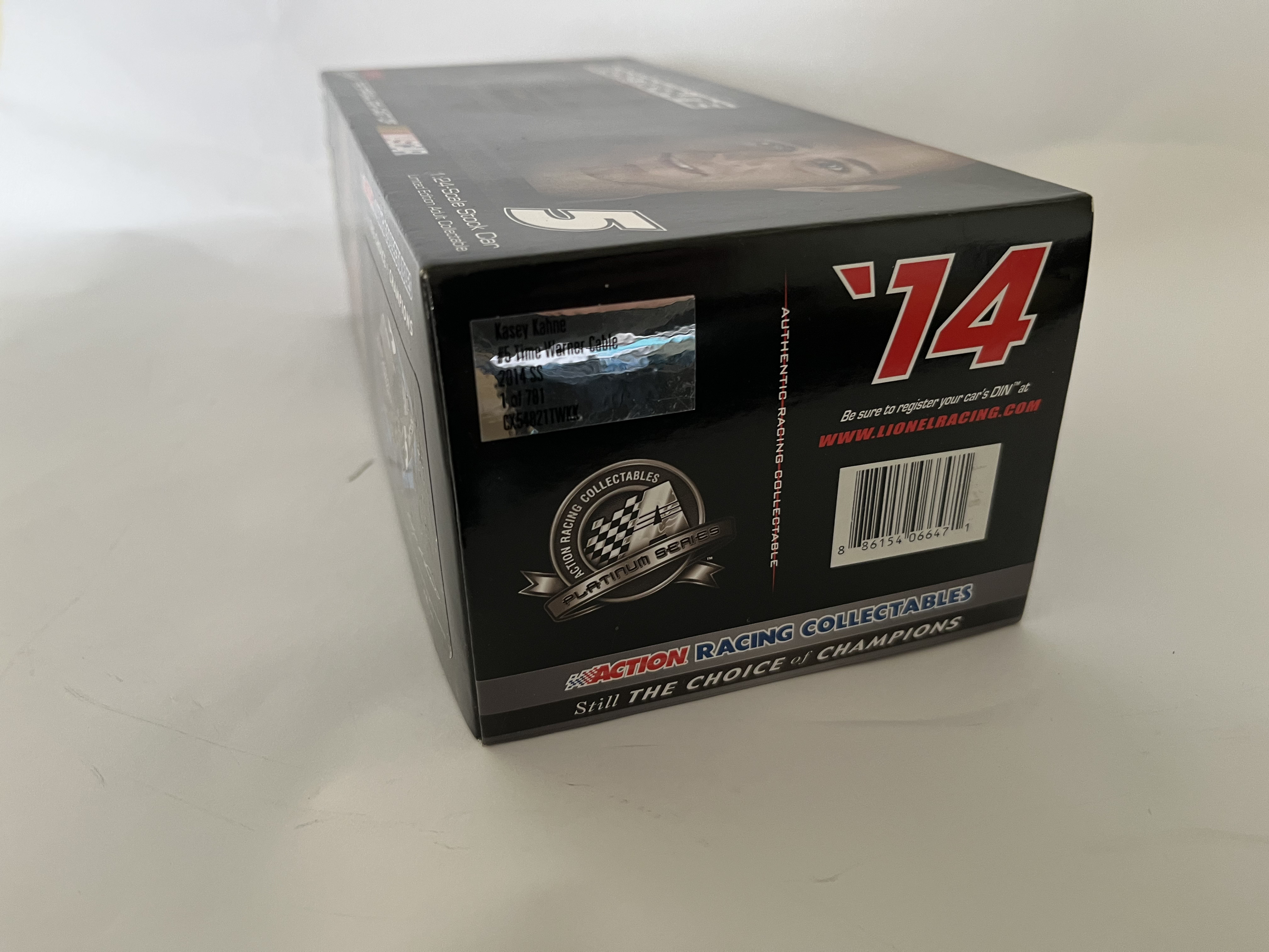This 1:24 scale die-cast model represents Kasey Kahne’s #5 Time Warner Cable Chevrolet SS as campaigned during the 2014 NASCAR season. Produced by Lionel Racing under the Action Racing Collectables Platinum Series, the vehicle features a detailed black paint scheme with sponsor decals for Time Warner Cable, Farmers Insurance, and Goodyear. The front windshield bears a signature in white paint marker attributed to driver Kasey Kahne. This item is a limited edition release, noted on the packaging as “1 of 781” with SKU CX54821TWKK. A unique Diecast Identification Number (DIN) CU14X-21TWKK-XXX-00006 is visible through the rear window. The model is constructed of die-cast metal with plastic detailing and includes an opening hood and trunk. It is housed in its original branded box with the factory styrofoam interior and includes a “Golden Ticket” promotional insert.