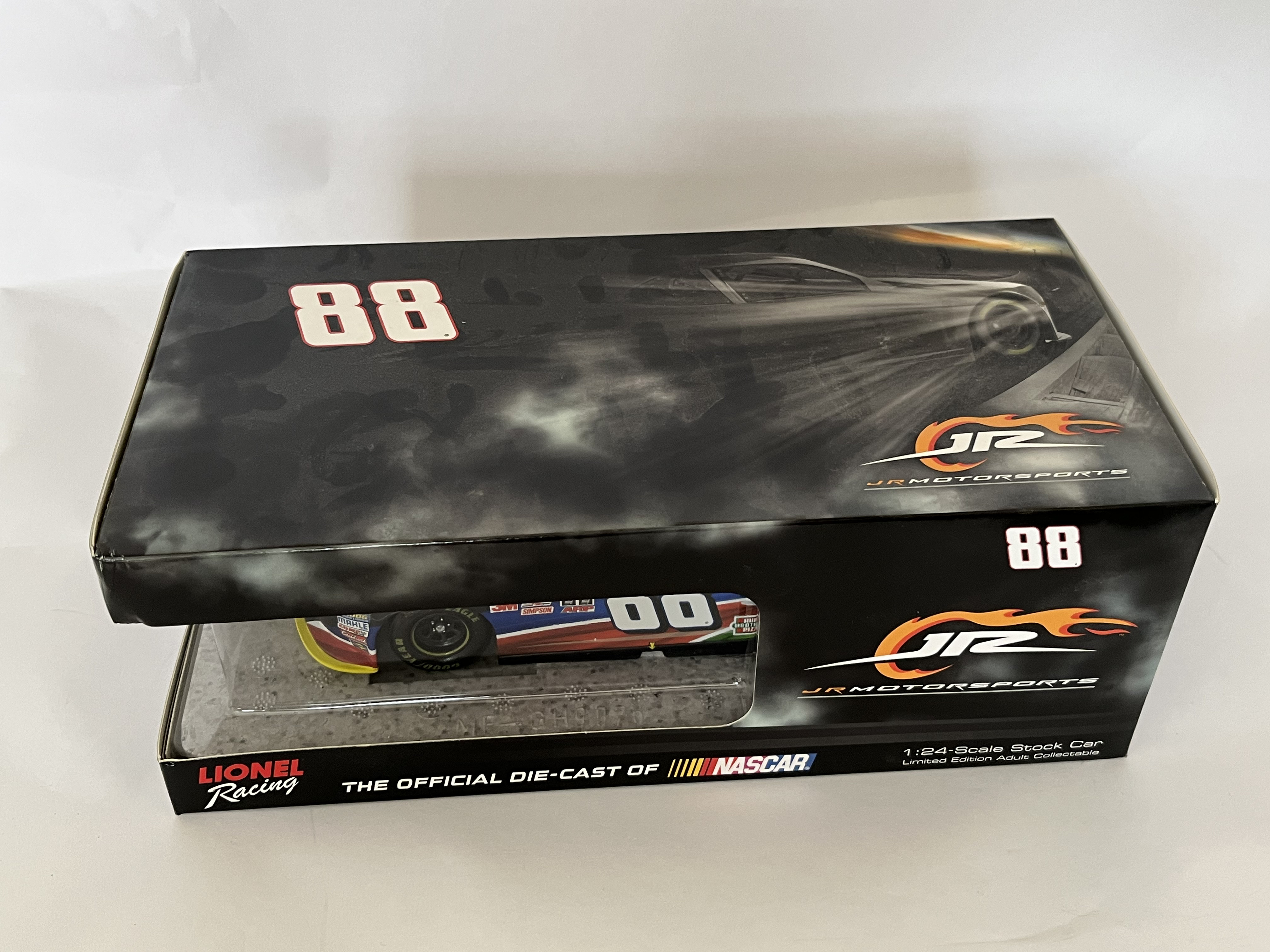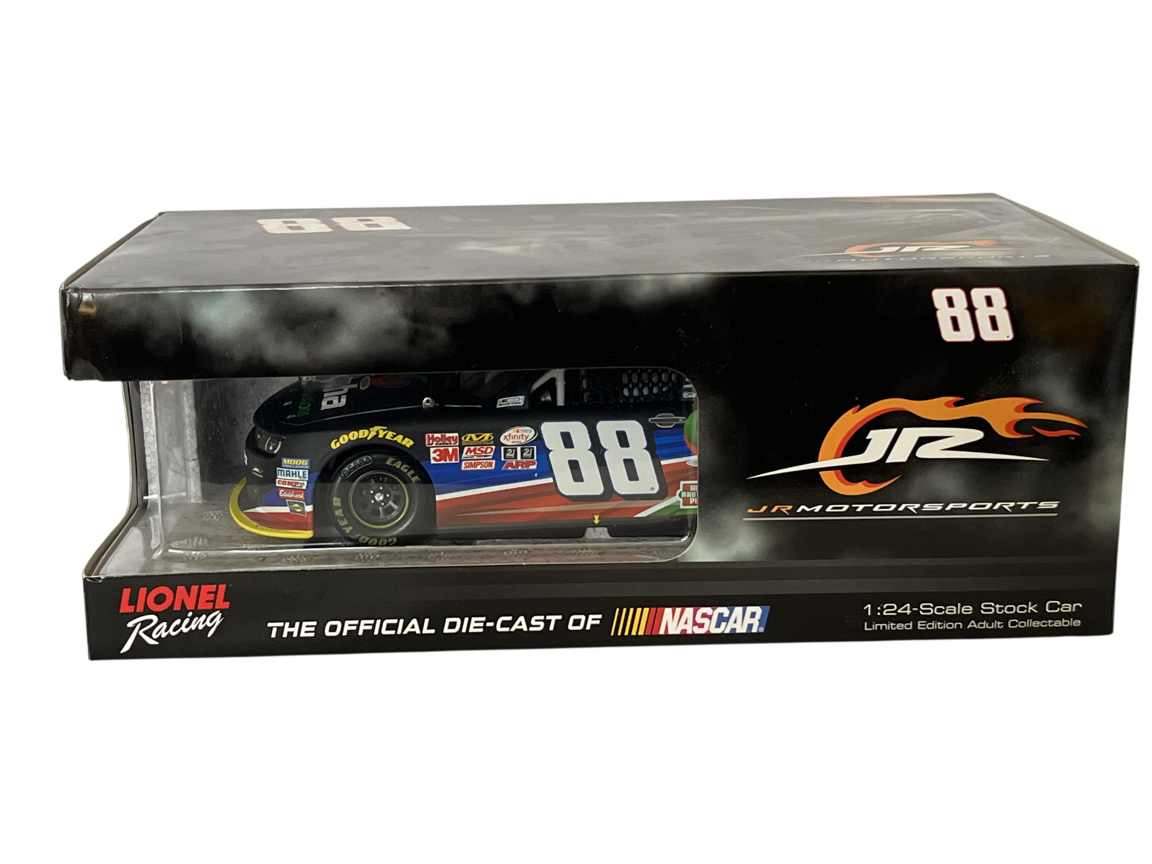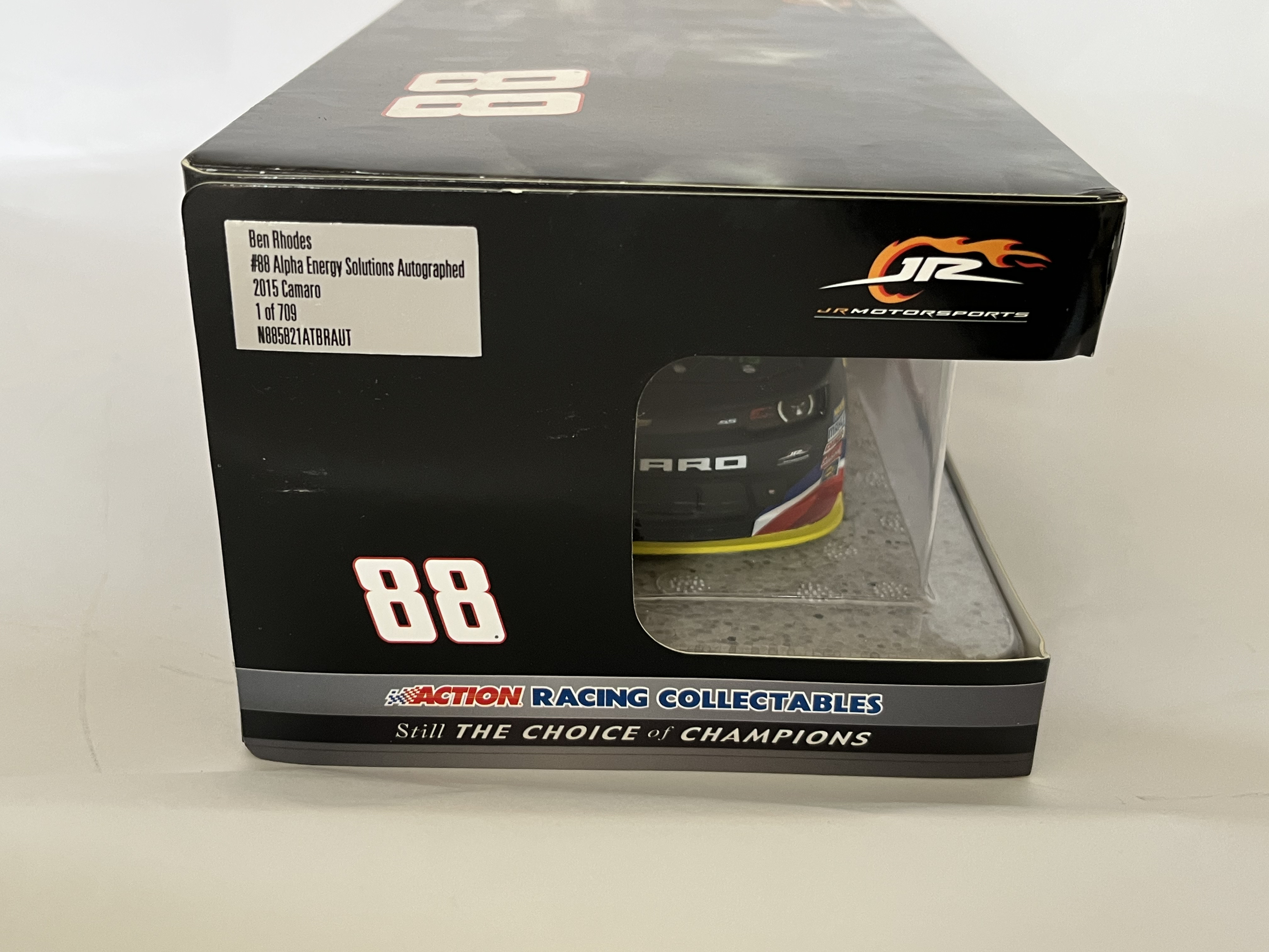 Die-Cast 1 of 709, Produced by Lionel Racing under the Action Racing Collectables brand, this 1:24 scale stock car replicates the #88 Alpha Energy Solutions Chevrolet Camaro driven by Ben Rhodes for JR Motorsports during the 2015 NASCAR Xfinity Series season. The model is constructed with a die-cast metal body, a plastic chassis, and detailed interior components. The multi-color racing livery features the primary Alpha Energy Solutions sponsorship along with contingency decals for Goodyear, 3M, Holley, MSD, Simpson, ARP, and the NASCAR Xfinity Series logo. This item is a factory-authenticated autographed limited edition, identified by the manufacturer’s side label as 1 of 709 with product code N885821ATBRAUT. The car is mounted on a plastic display base and housed in its original JR Motorsports branded window box, which identifies the piece as a Limited Edition Adult Collectible. Approximately 8.5 inches in length.