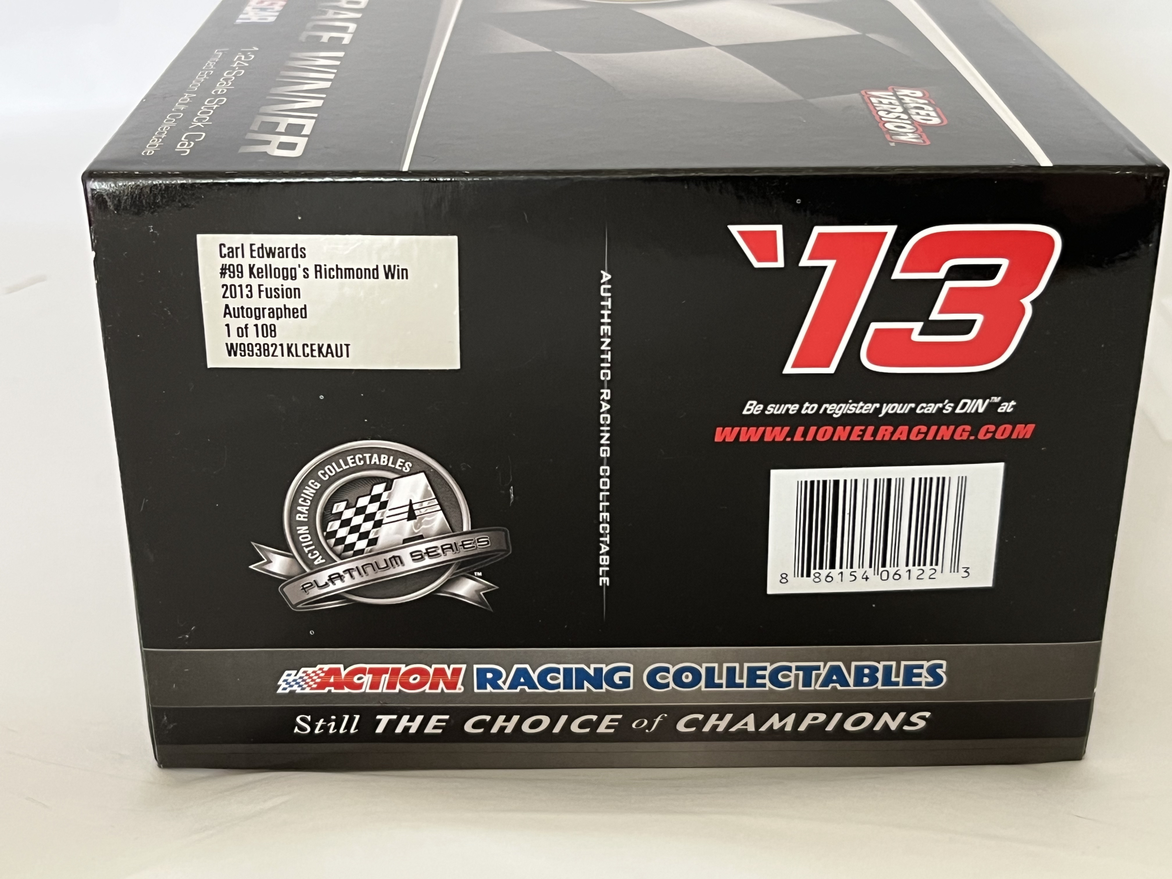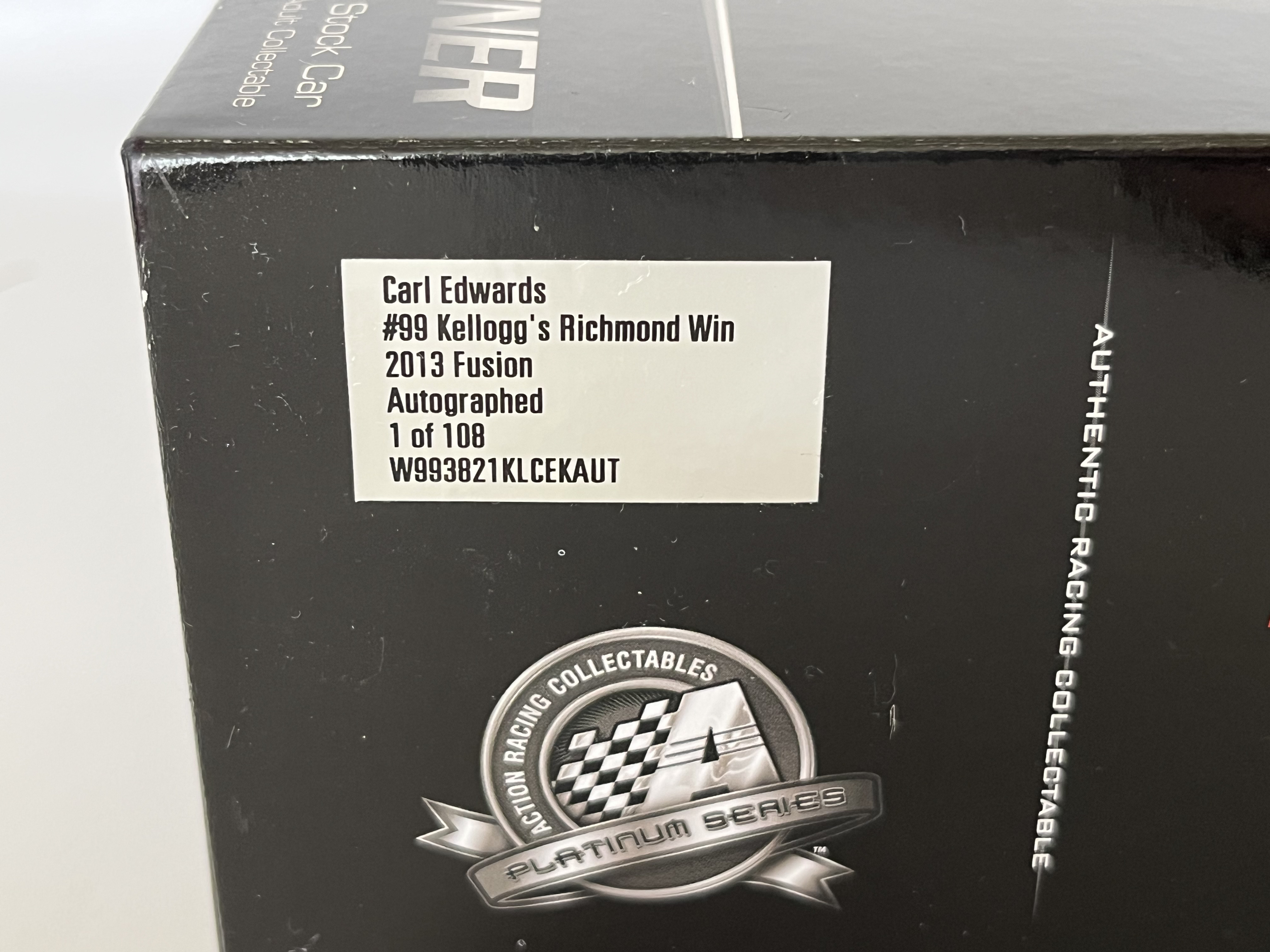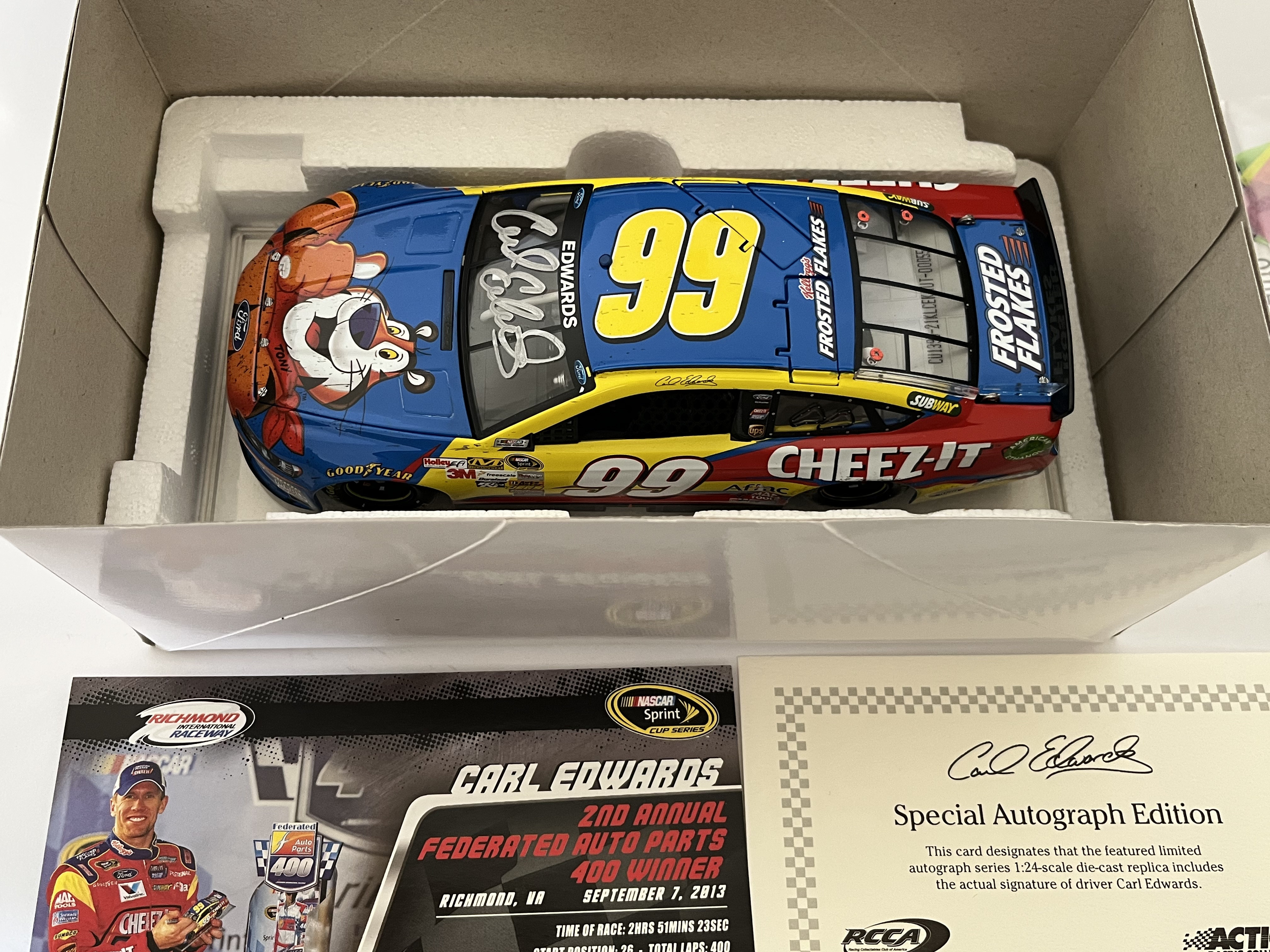 Produced by Lionel NASCAR Collectables, this 1:24-scale die-cast model replicates Carl Edwards’ No. 99 Kellogg’s Frosted Flakes/Cheez-It Ford Fusion. This Special Autograph Edition features a silver-tone signature by Carl Edwards on the front windshield. The model is part of a limited production run of only 108 units (part number W993821KLCEKAUT) and features a visible Diecast Identification Number (DIN). The item is housed in its original retail packaging with the protective styrofoam insert and includes a commemorative winner’s card and a Certificate of Authenticity (COA) from the Racing Collectables Club of America (RCCA).
