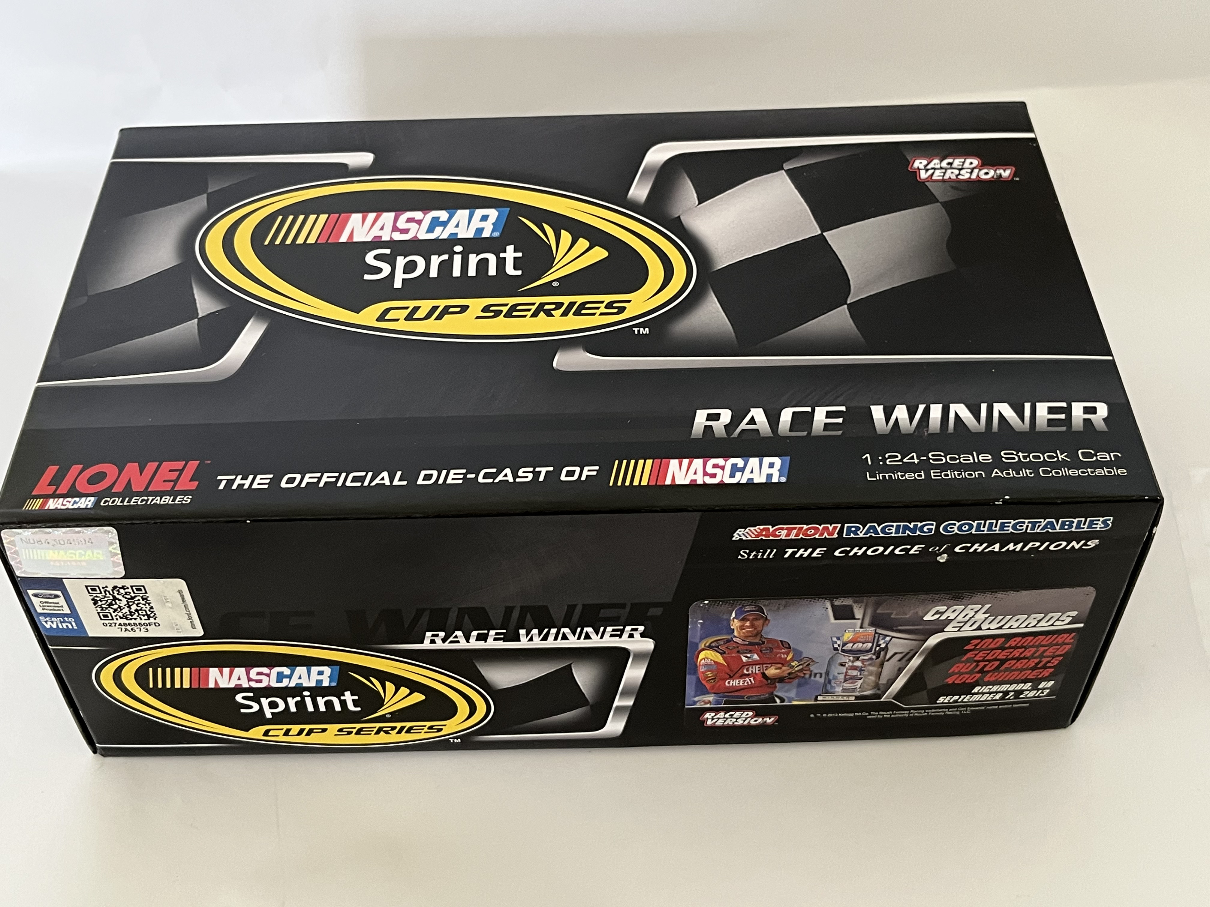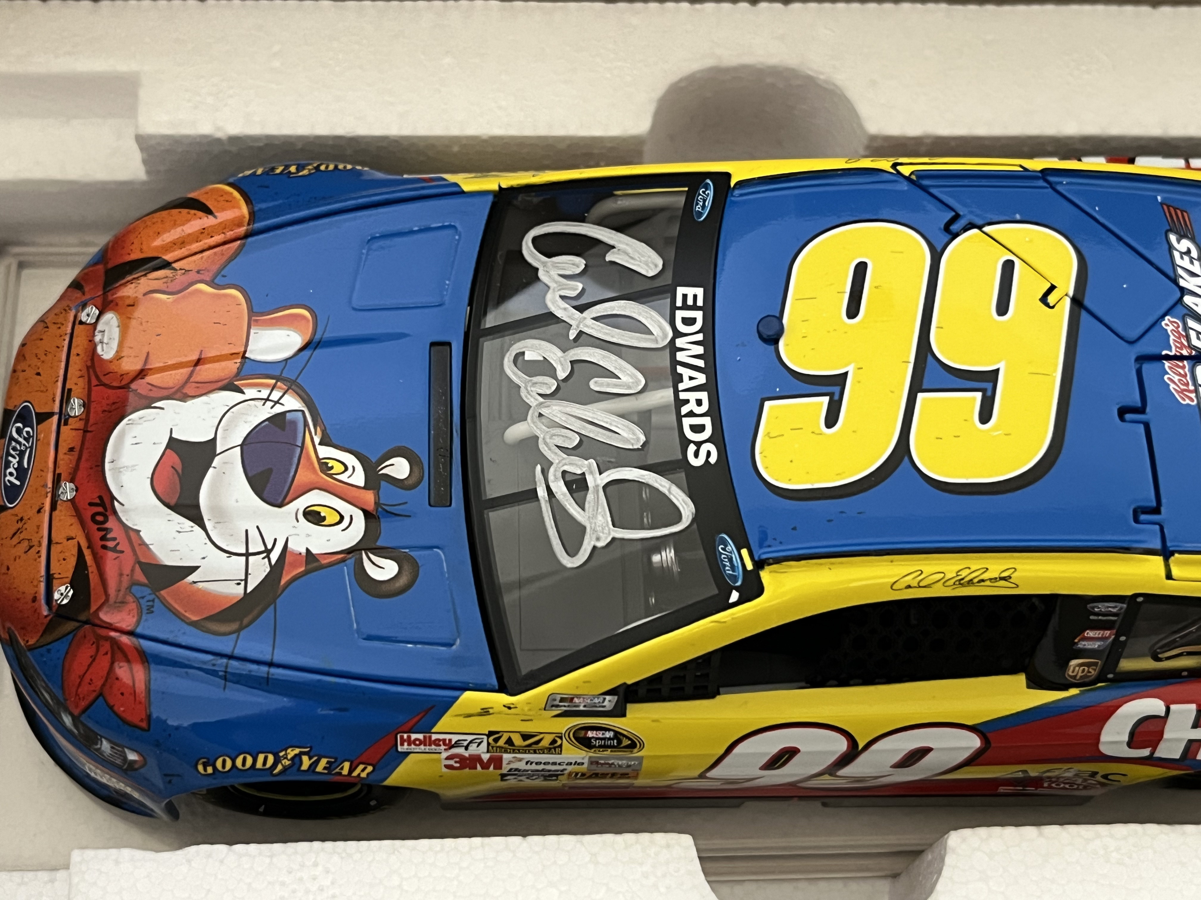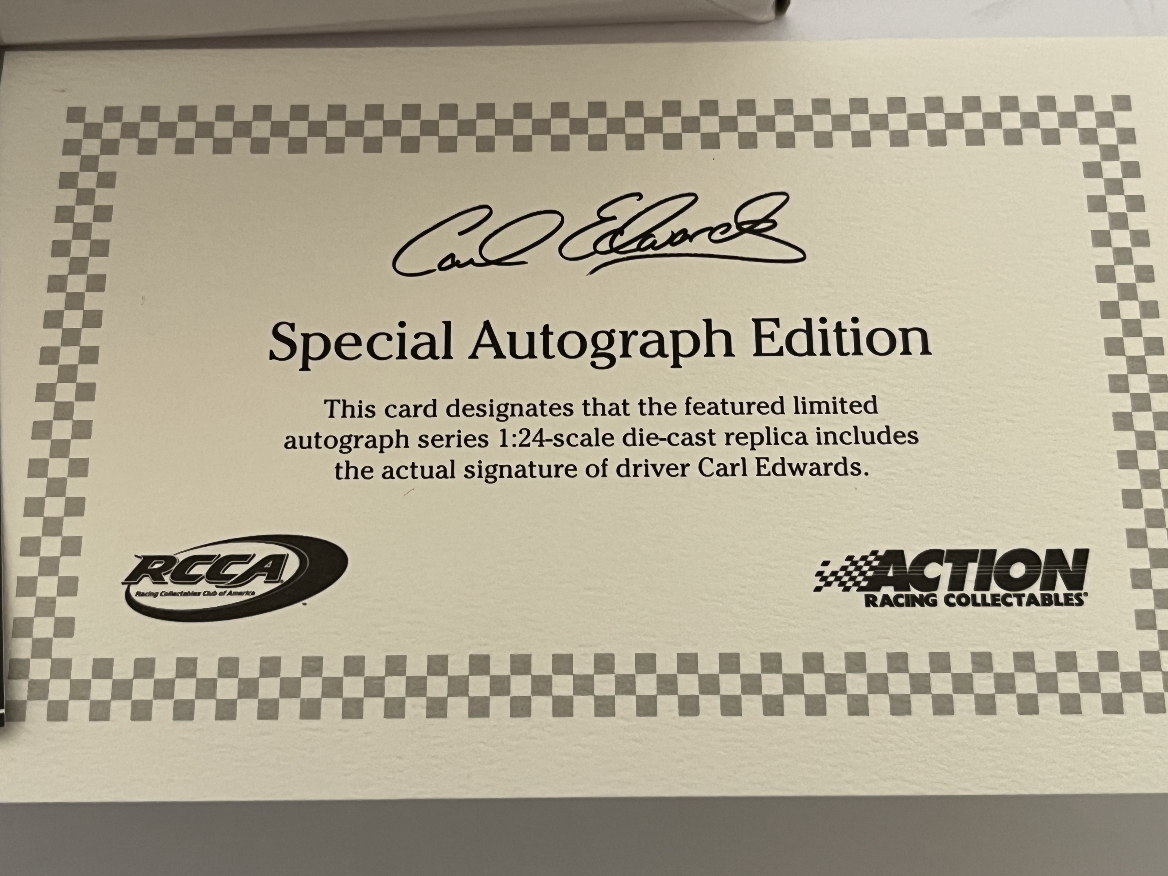 Produced by Lionel NASCAR Collectables, this 1:24-scale die-cast model replicates Carl Edwards’ No. 99 Kellogg’s Frosted Flakes/Cheez-It Ford Fusion. This Special Autograph Edition features a silver-tone signature by Carl Edwards on the front windshield. The model is part of a limited production run of only 108 units (part number W993821KLCEKAUT) and features a visible Diecast Identification Number (DIN). The item is housed in its original retail packaging with the protective styrofoam insert and includes a commemorative winner’s card and a Certificate of Authenticity (COA) from the Racing Collectables Club of America (RCCA).