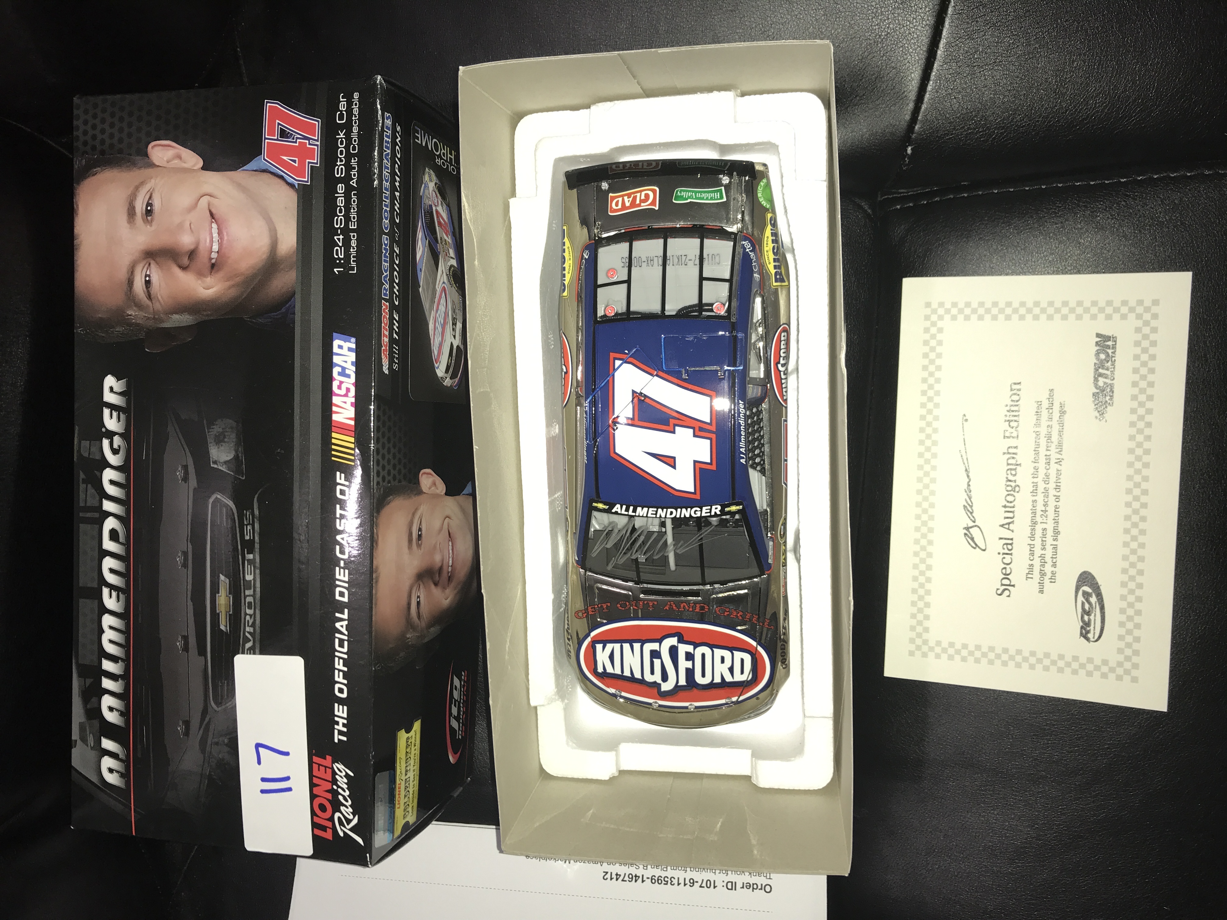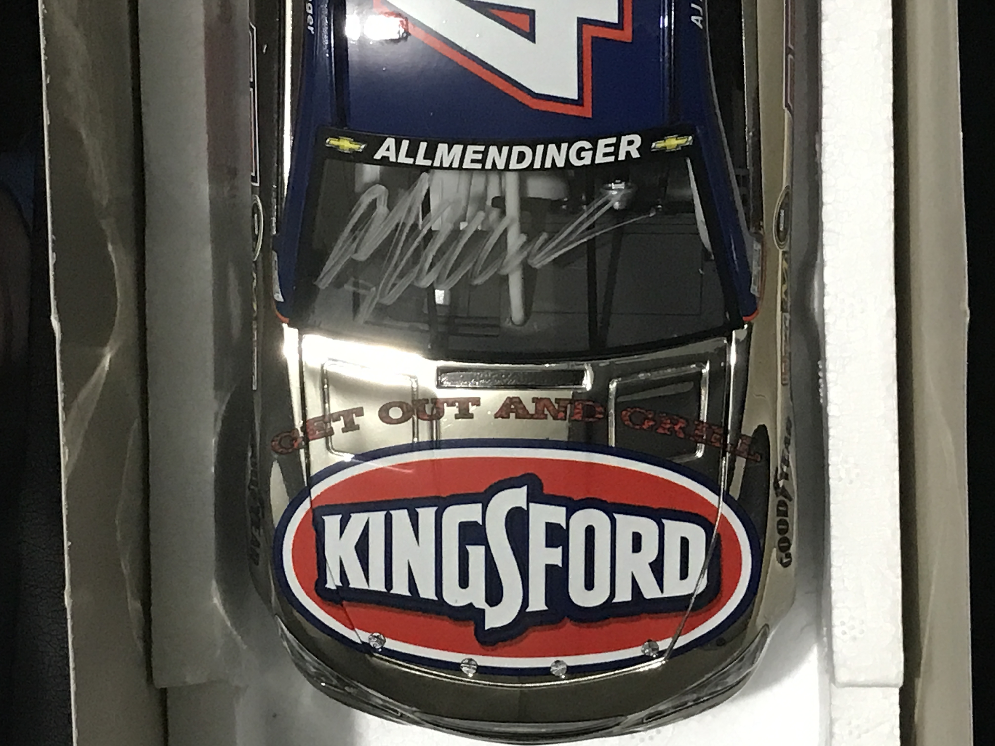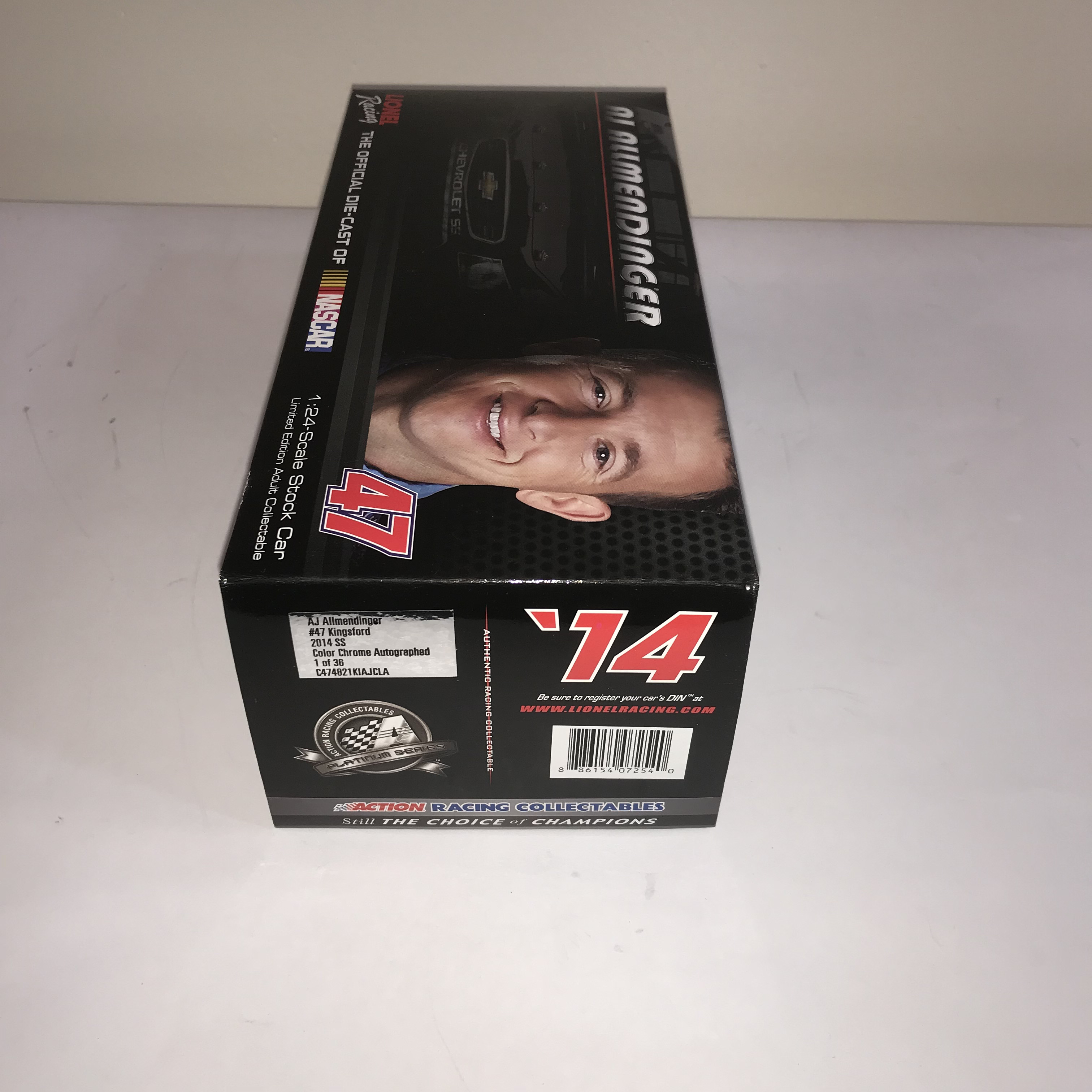 Lionel Racing Action Racing Collectables Platinum Series 1:24 scale die-cast stock car, 2014. This model represents AJ Allmendinger’s #47 Kingsford Chevrolet SS for JTG Daugherty Racing featuring a special Color Chrome finish. The item is a limited edition of only 36 produced and includes a factory-authenticated autograph with NASCAR hologram L200278201.