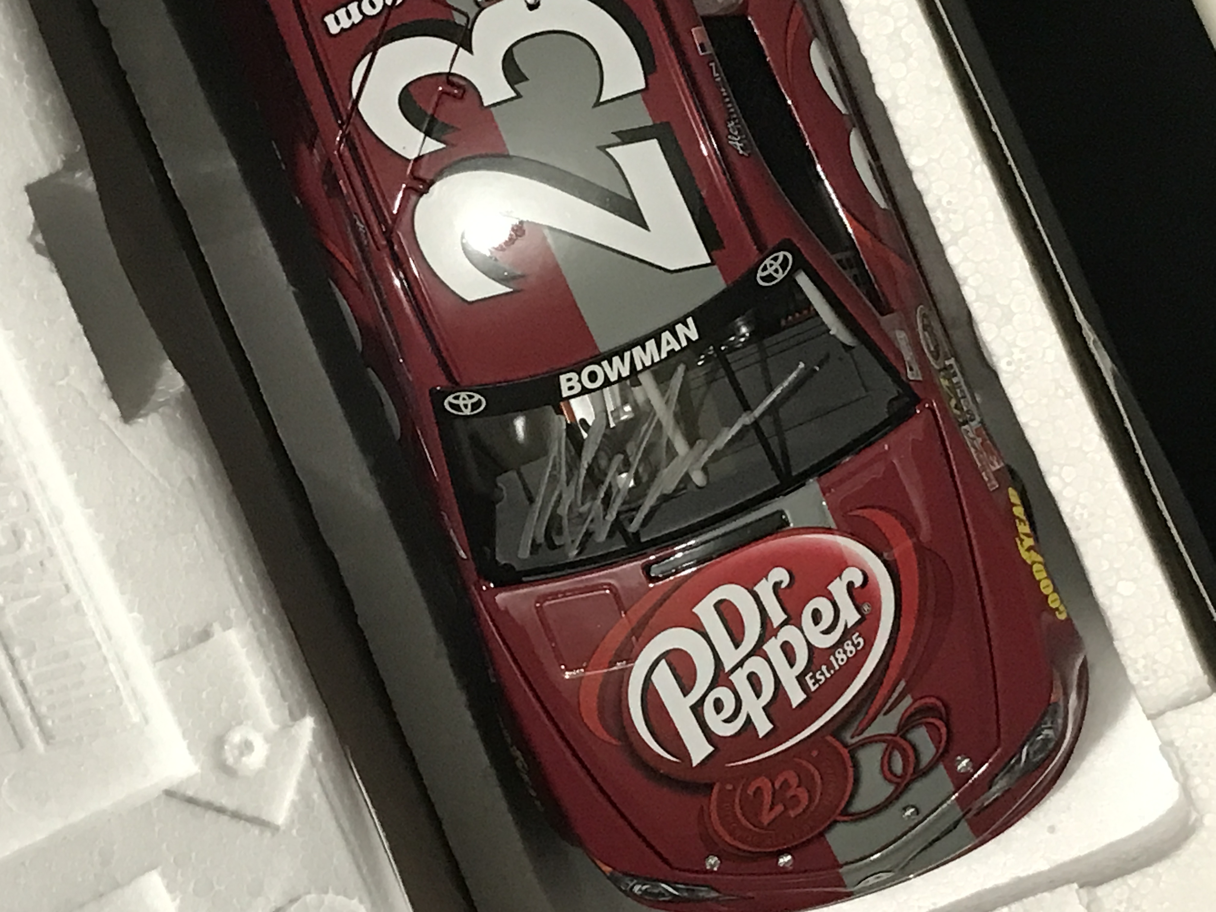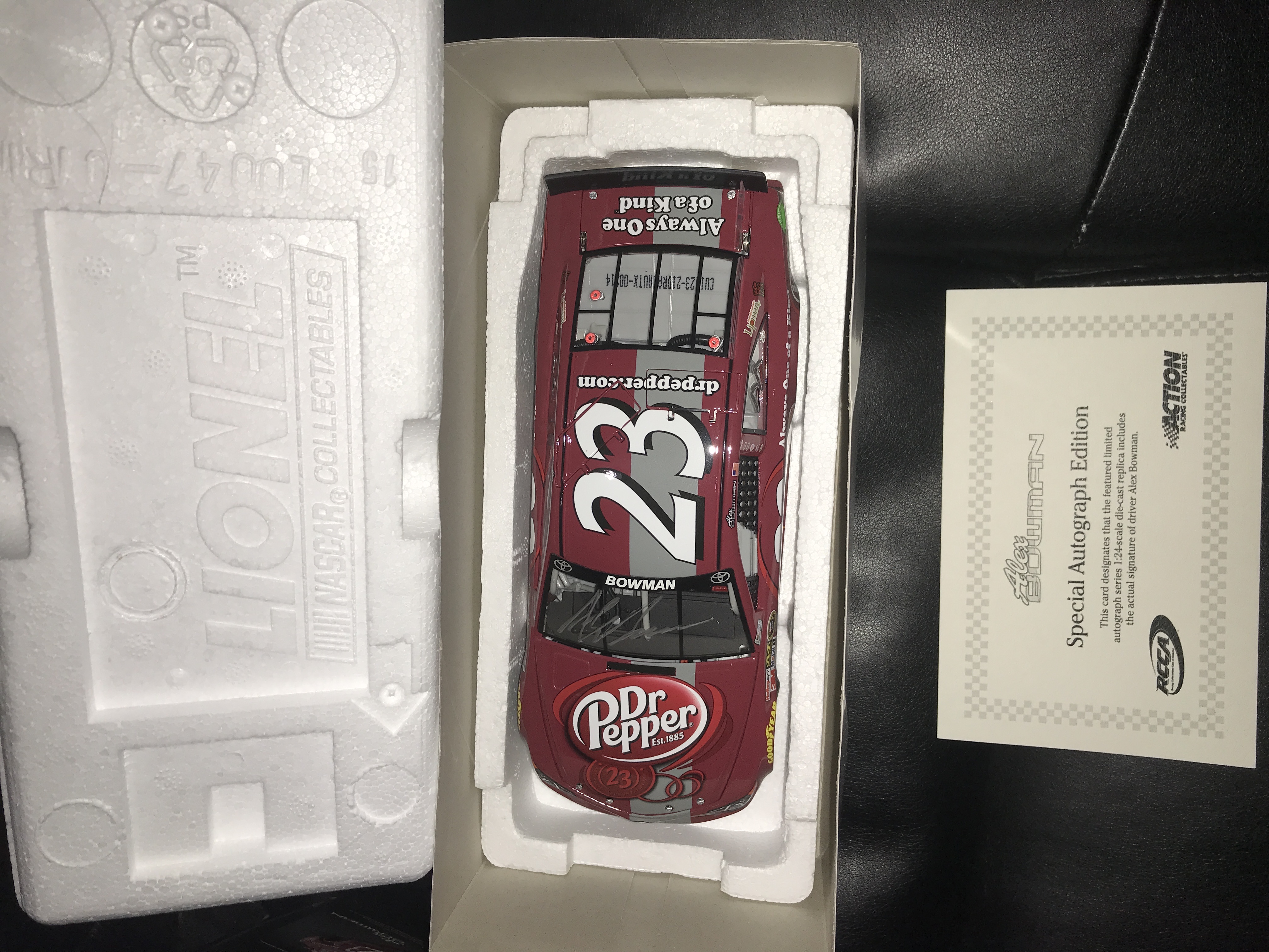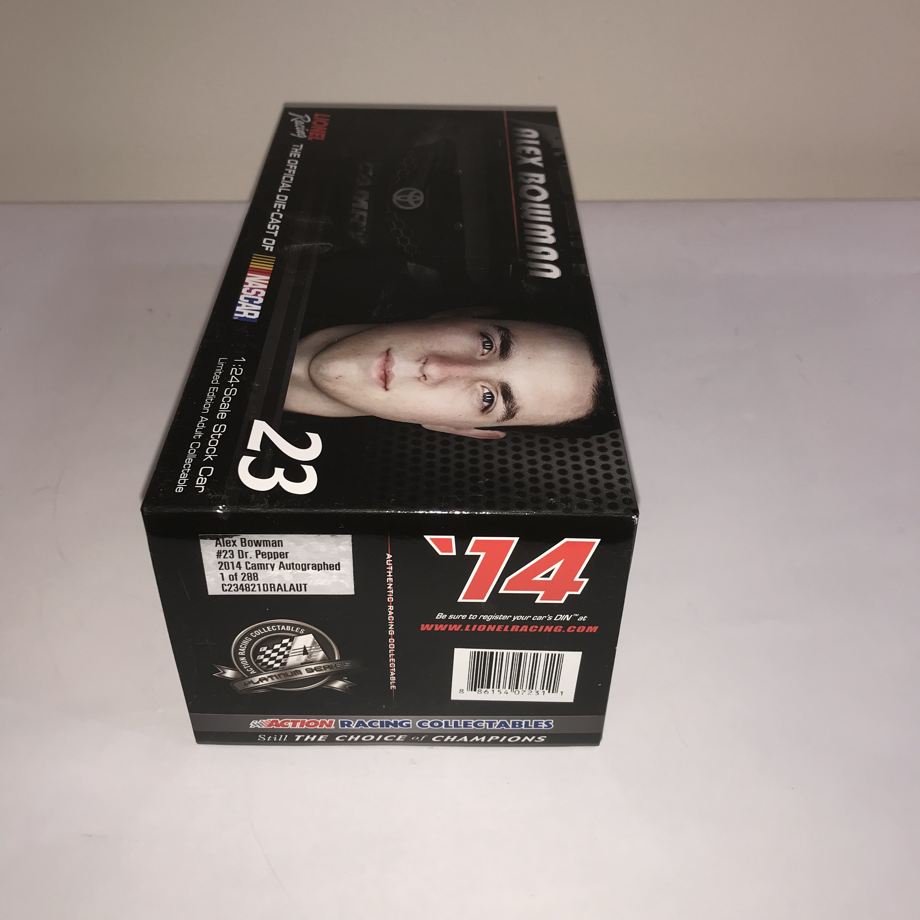 Autographed, Action Racing Collectables Platinum Series stock car manufactured by Lionel Racing in 2014. This model depicts Alex Bowman’s #23 Dr. Pepper Toyota Camry for BK Racing and features a die-cast metal body with plastic details. The limited edition autographed release is identified on the manufacturer label as 1 of 288 units and includes the original packaging with a Lionel Racing Golden Ticket sticker.