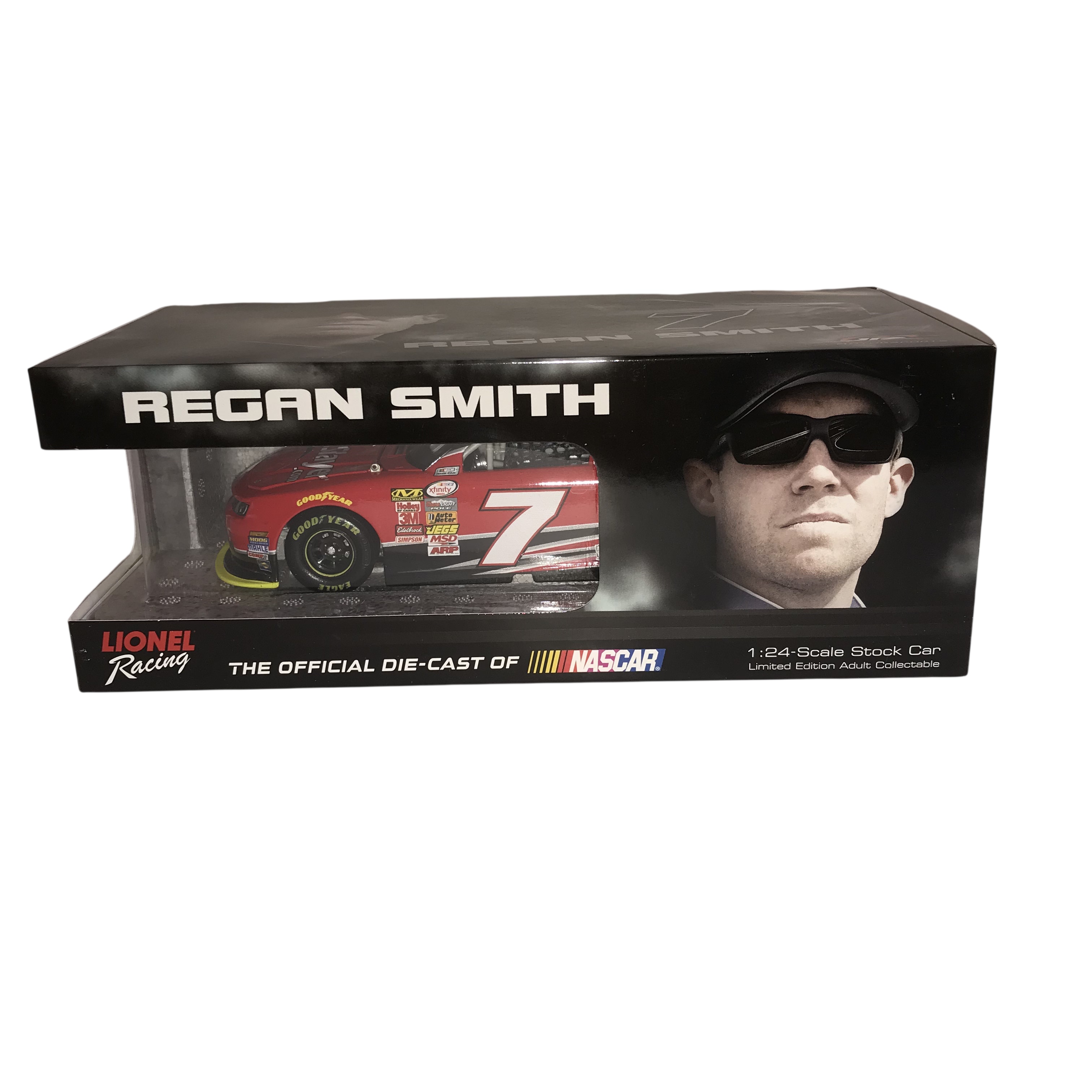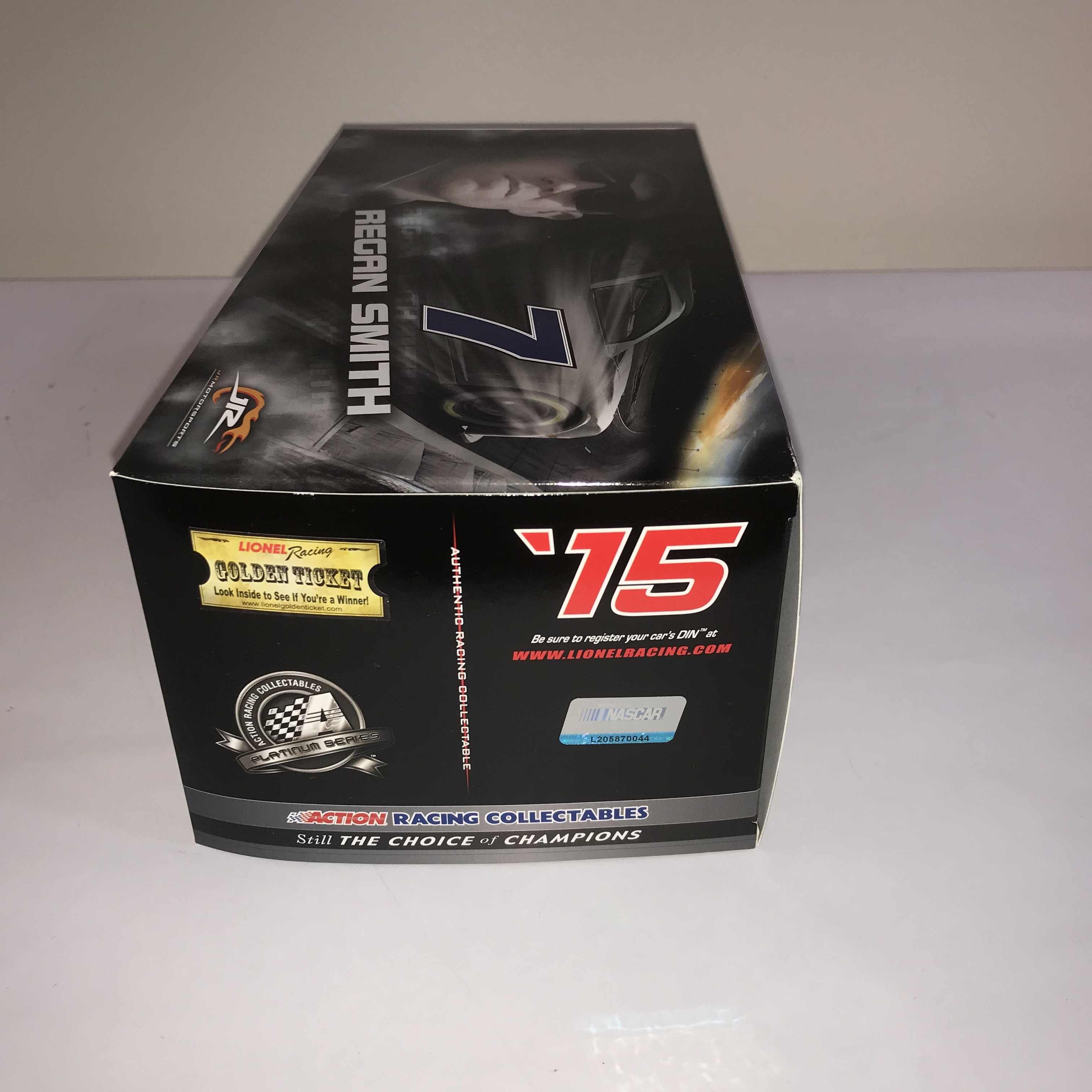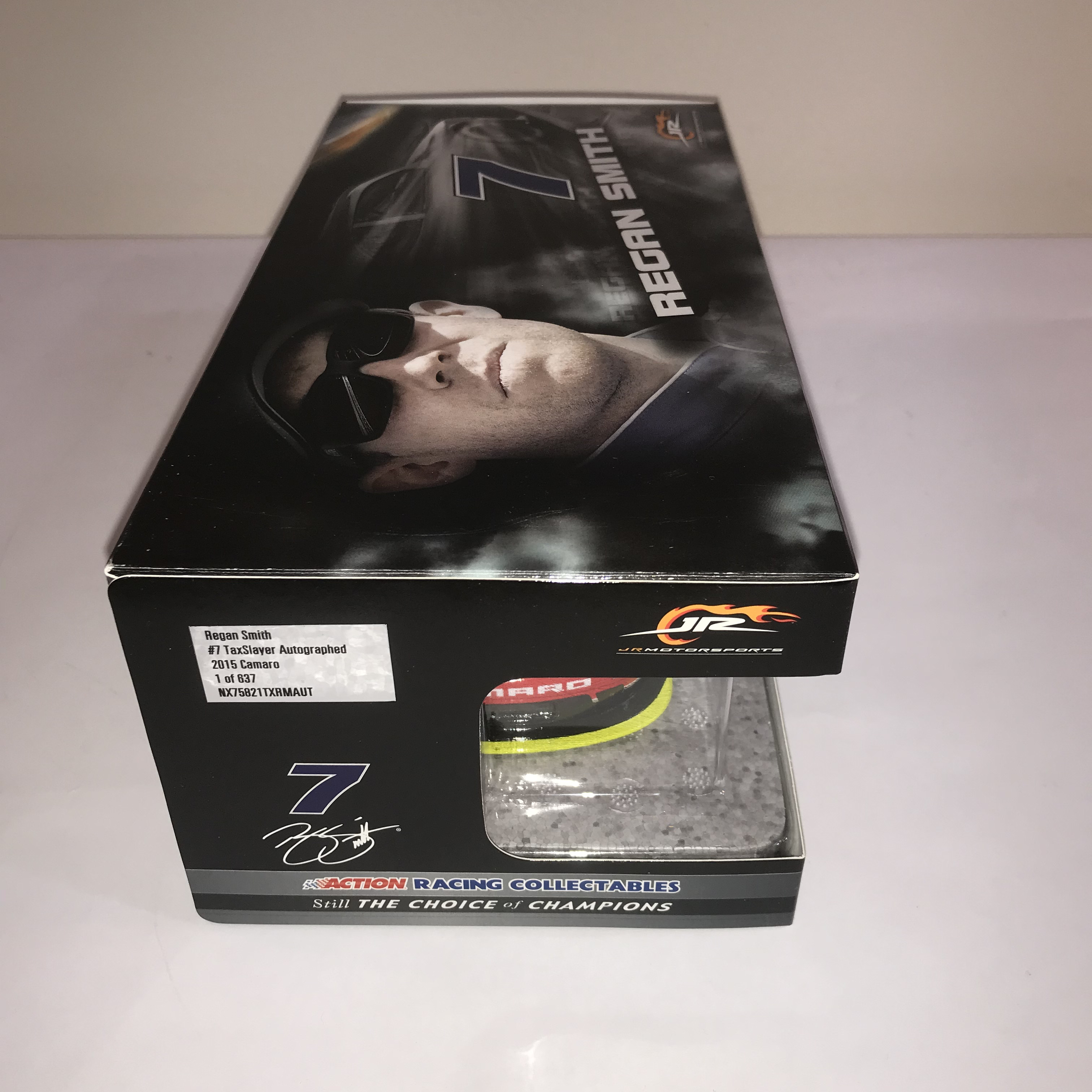 Lionel Racing Action Racing Collectables Platinum Series 1:24 scale NASCAR stock car, 2015. Modeled after the #7 TaxSlayer Chevrolet Camaro driven by Regan Smith for JR Motorsports, the vehicle is constructed with a die-cast metal body and rubber tires. This limited edition autographed release is numbered 1 of 637 and includes the original window box with a factory Golden Ticket promotional insert.