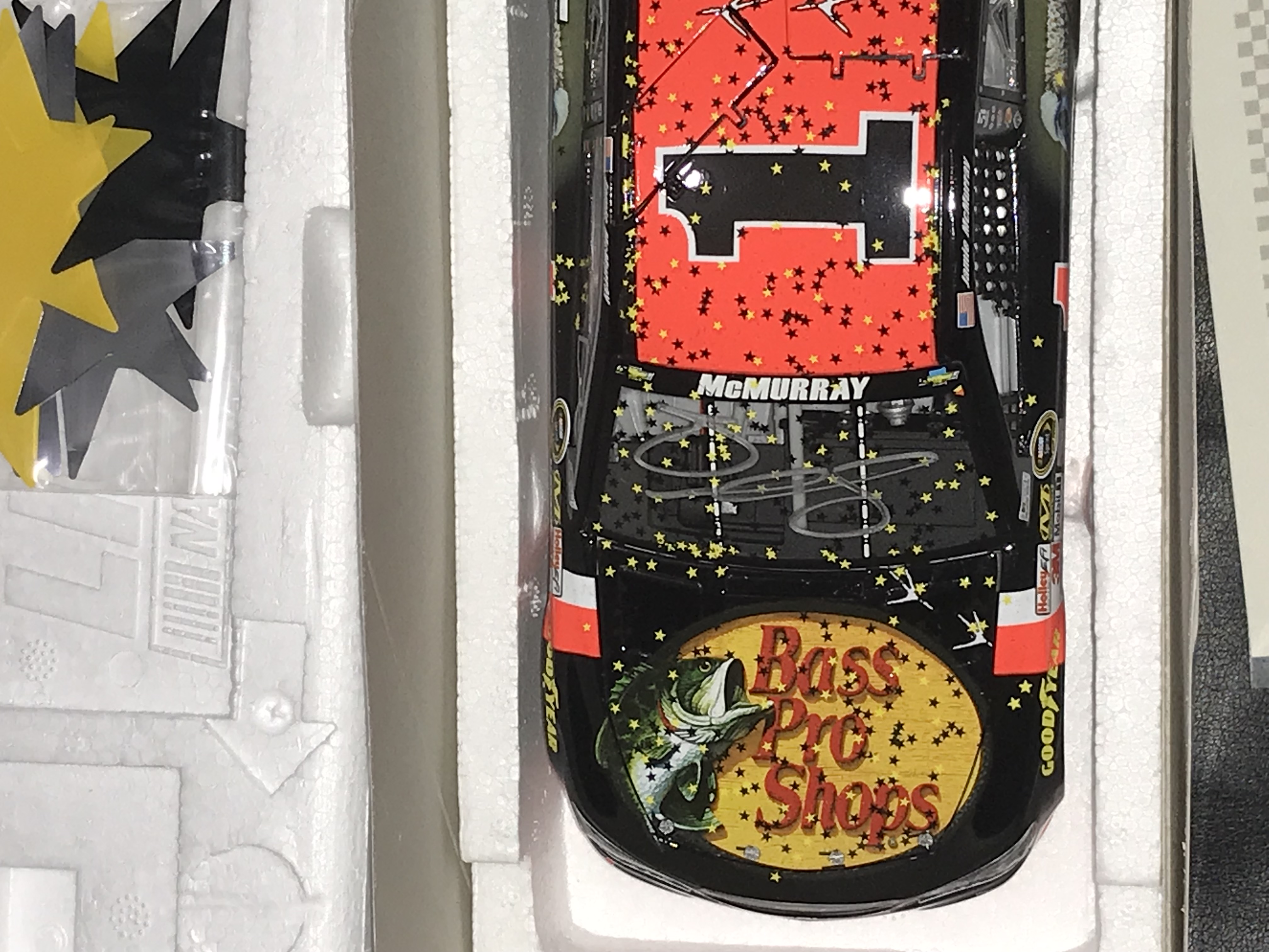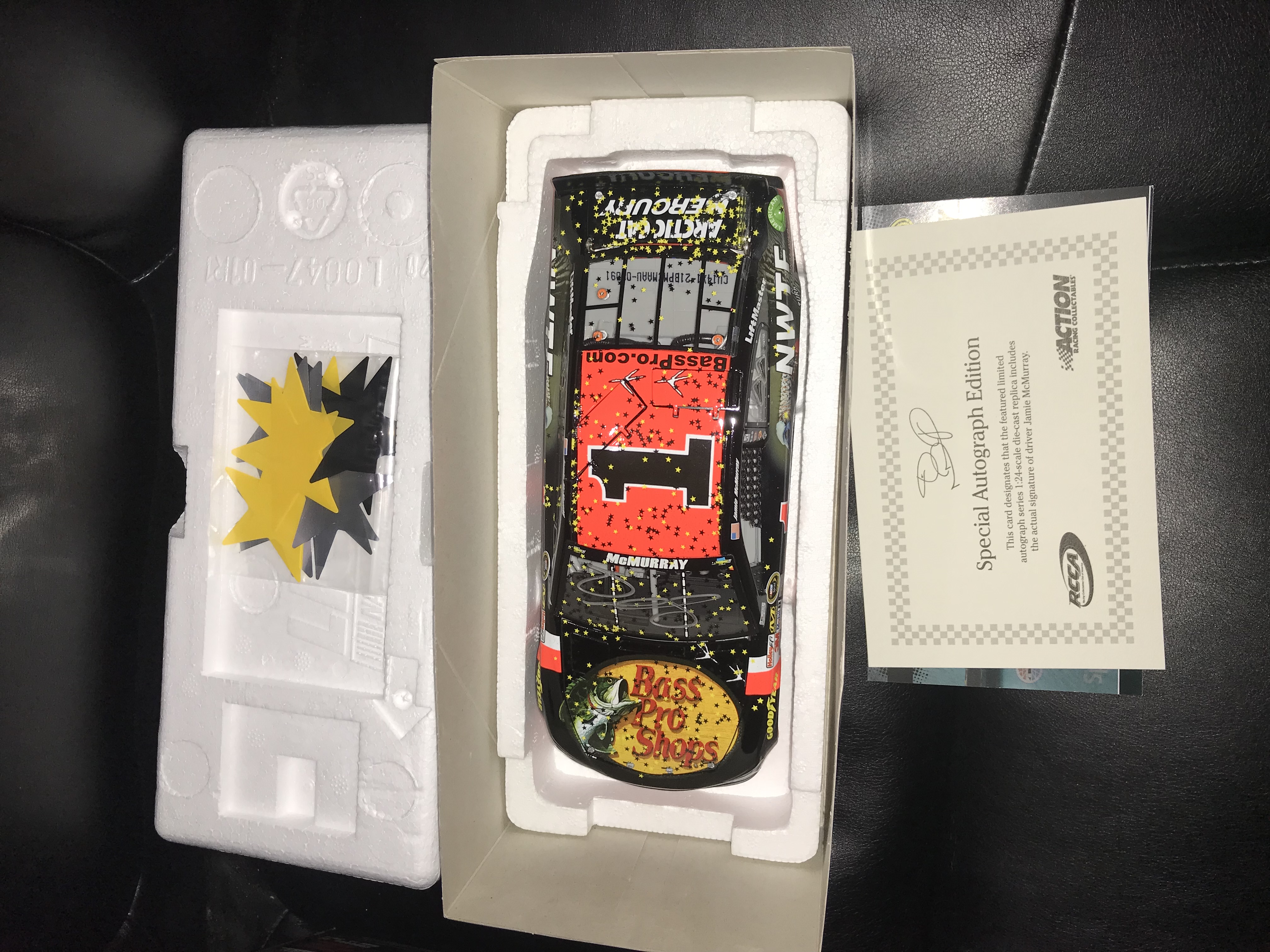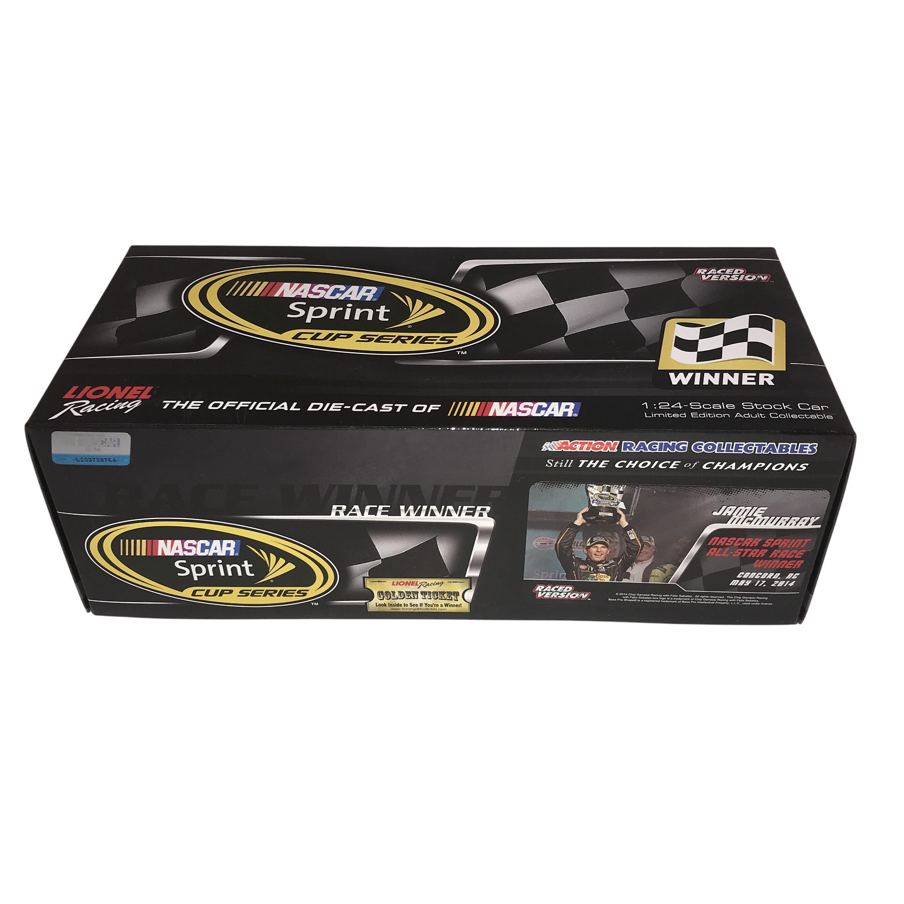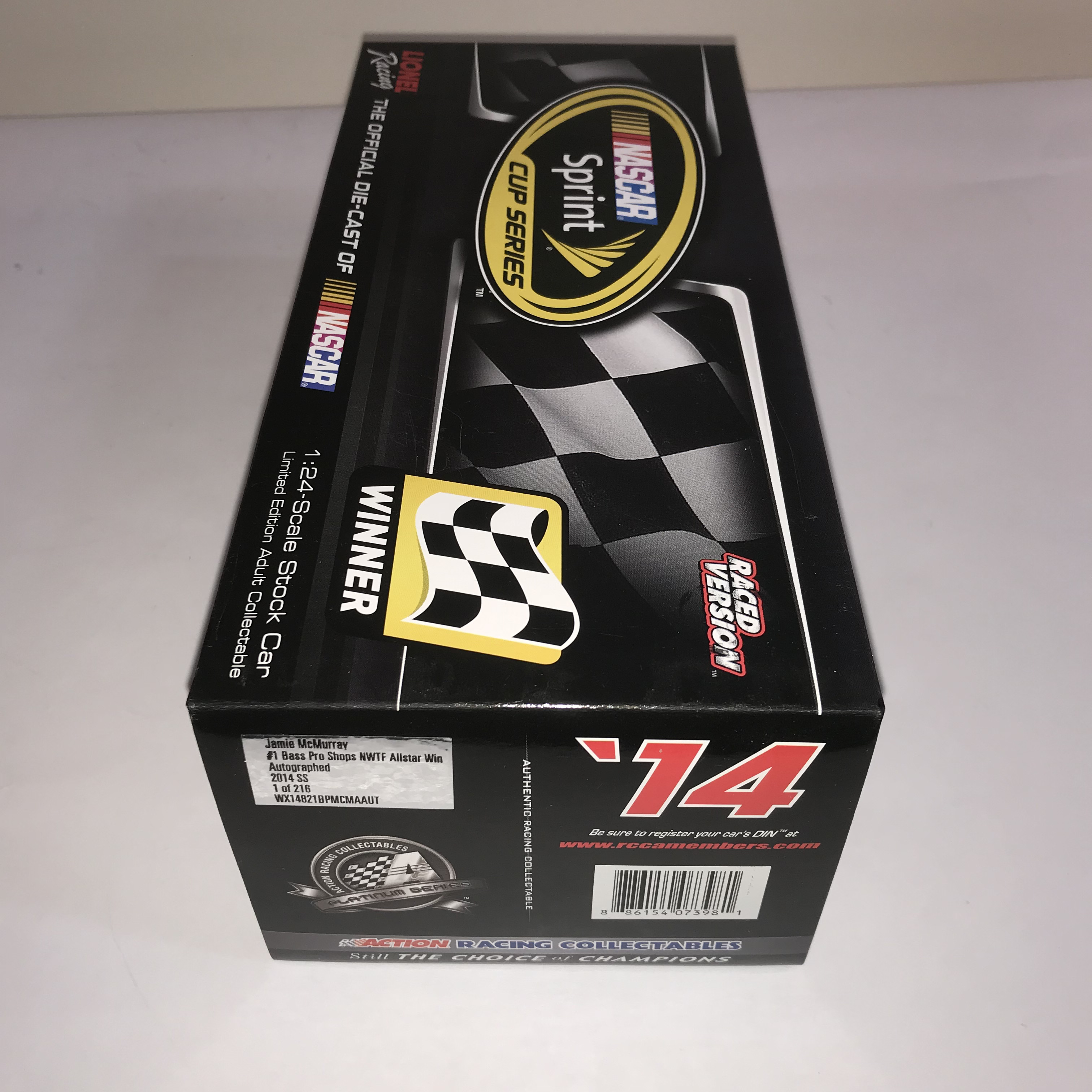 Lionel Racing Action Racing Collectables Platinum Series 1:24-scale stock car, 2014. This Raced Version Chevrolet SS replicates Jamie McMurray’s #1 Bass Pro Shops and NWTF car from the NASCAR Sprint All-Star Race. Constructed of die-cast metal with plastic components, the model features a limited edition autographed finish. Factory labels identify the piece as 1 of 216 produced