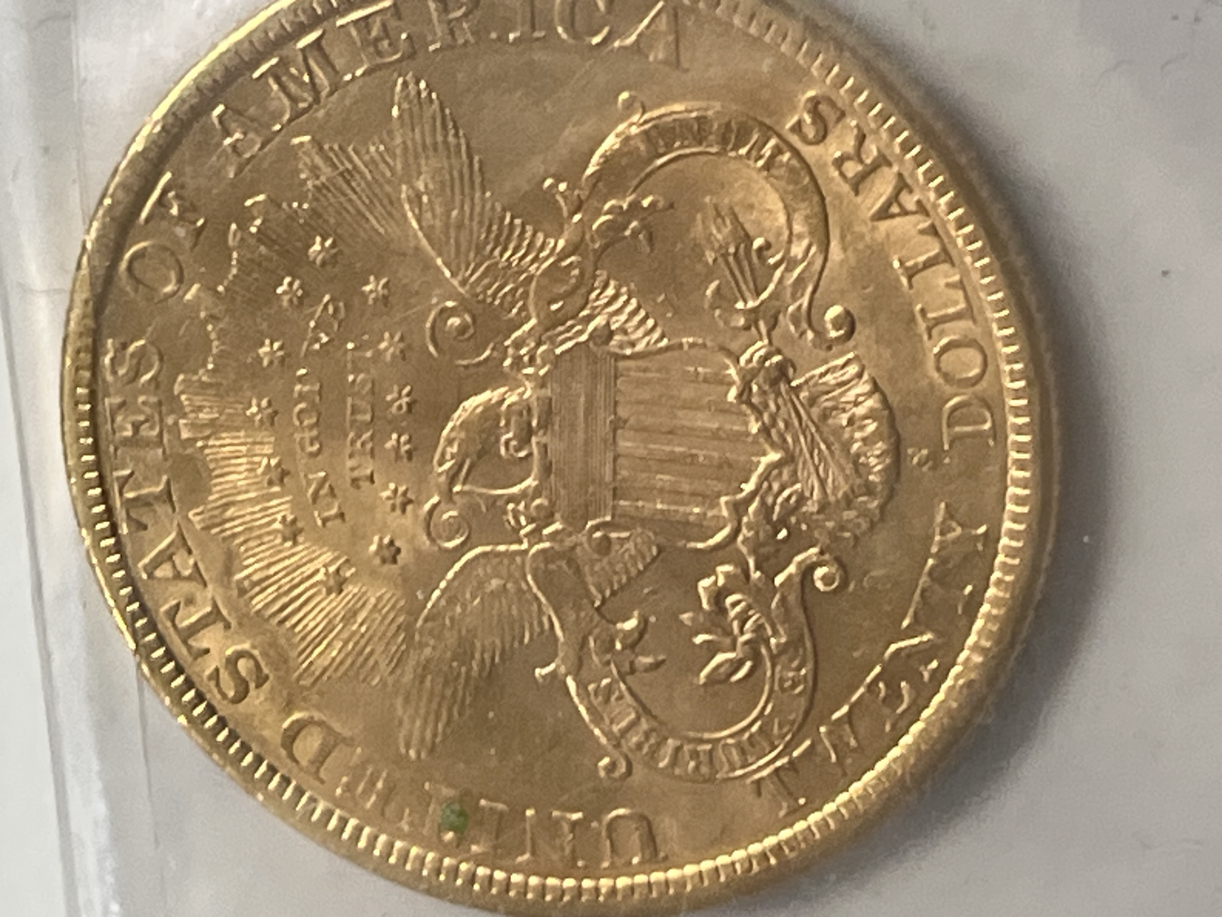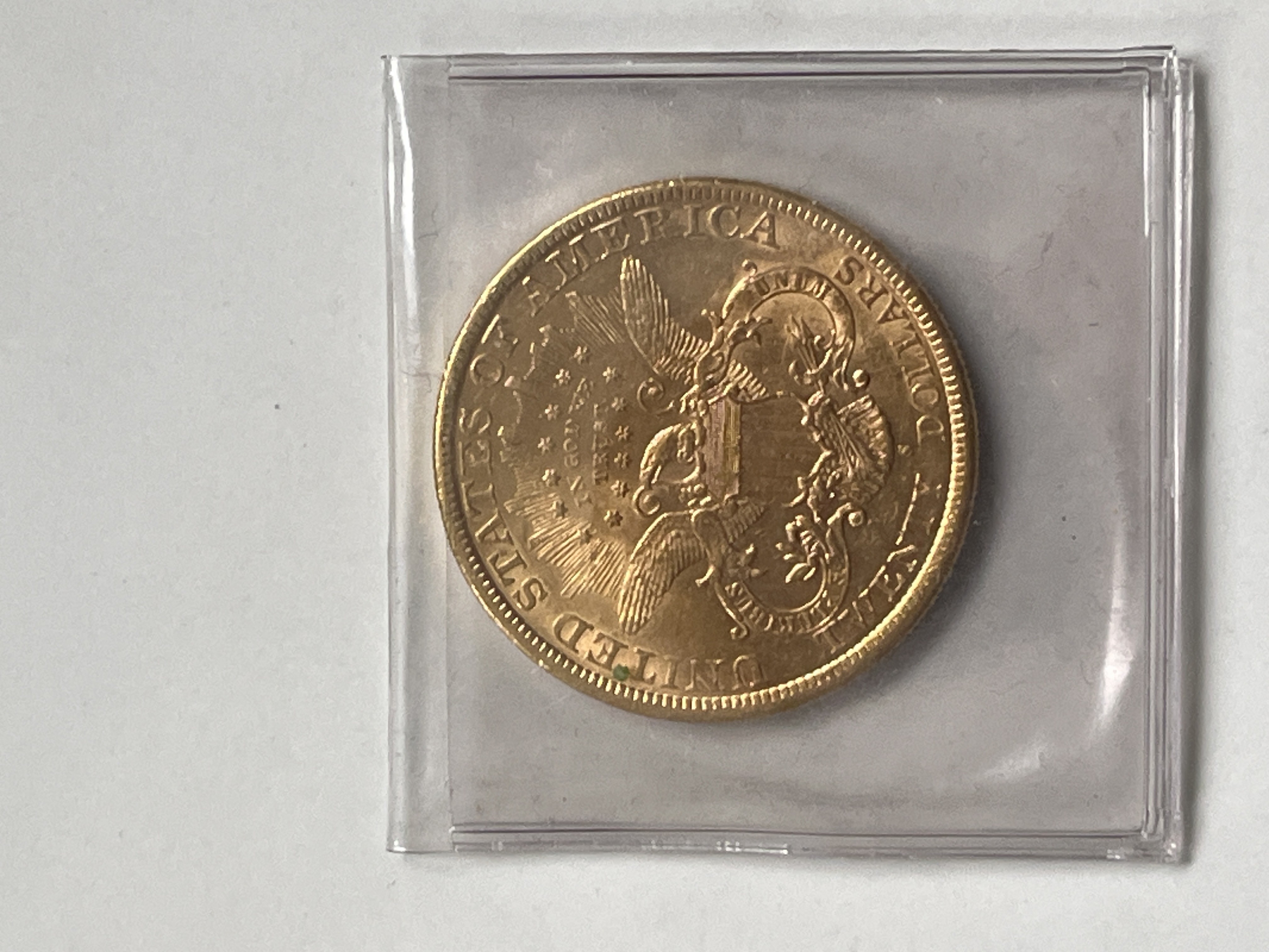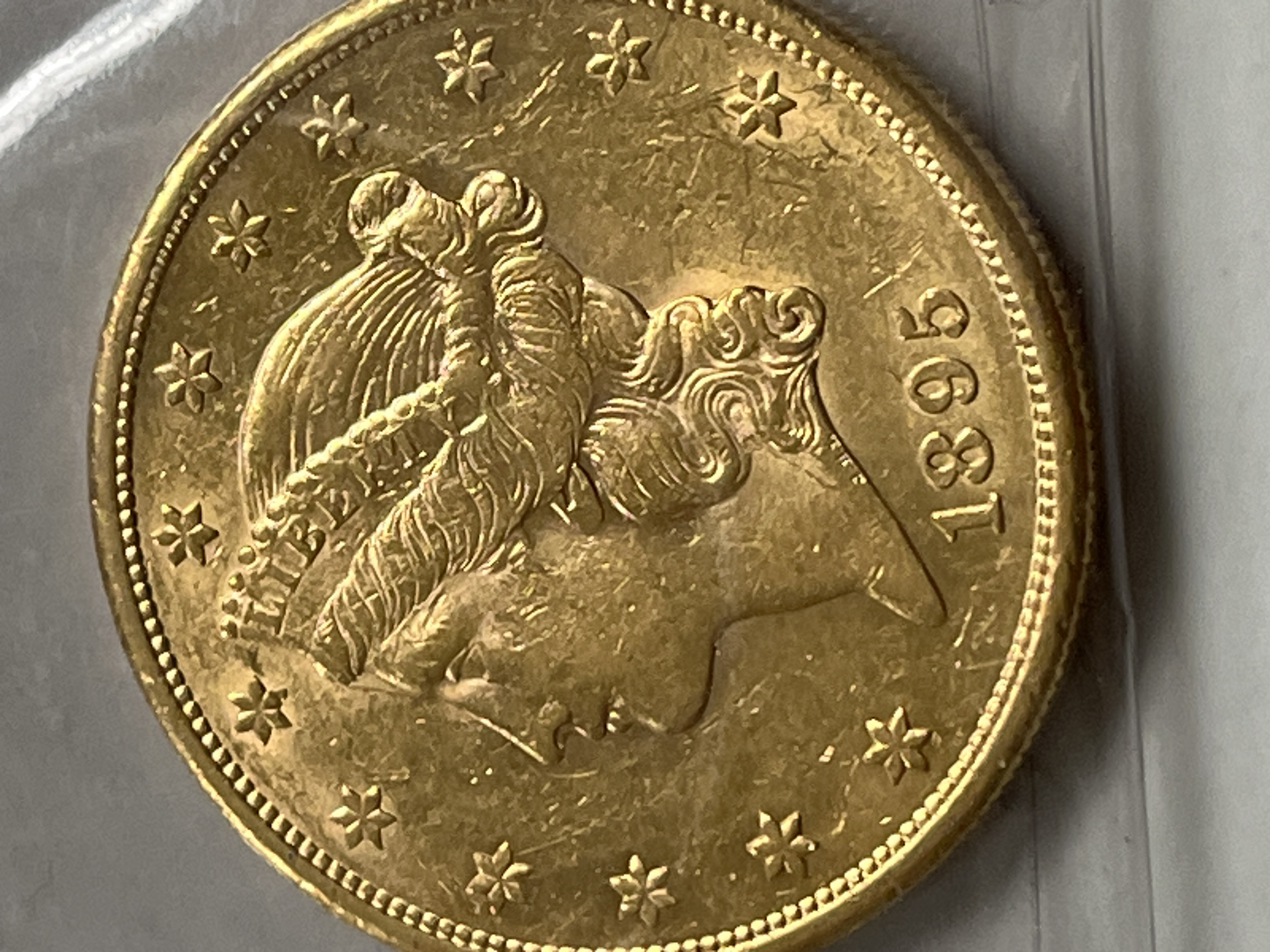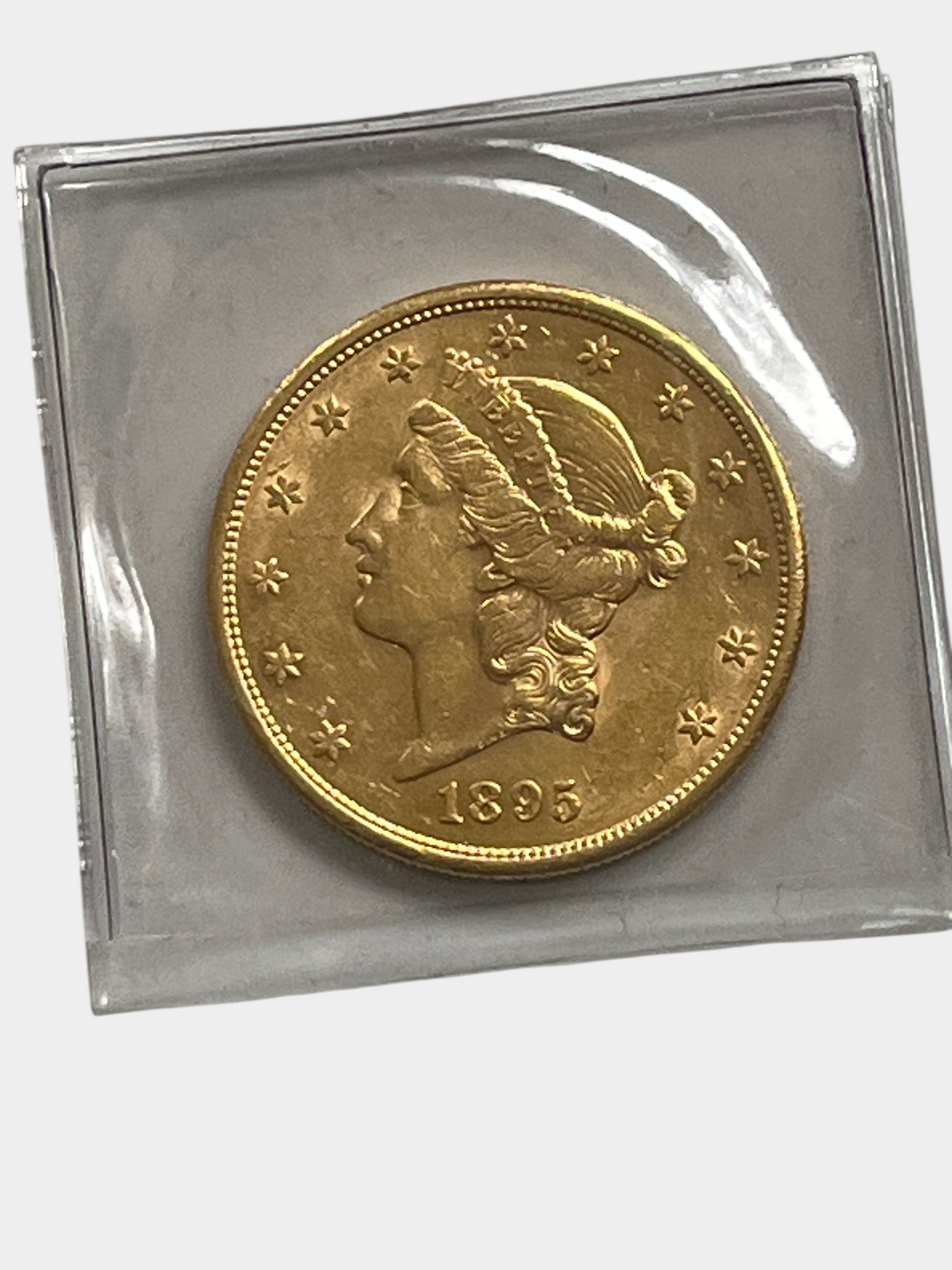 US 1895-S Liberty Head Double Eagle gold coin, struck at the San Francisco Mint. The obverse features the Coronet Head Liberty design with thirteen stars and the 1895 date, while the reverse displays a heraldic eagle with the S mint mark below the tail feathers. Struck in .900 fine gold with a reeded edge.