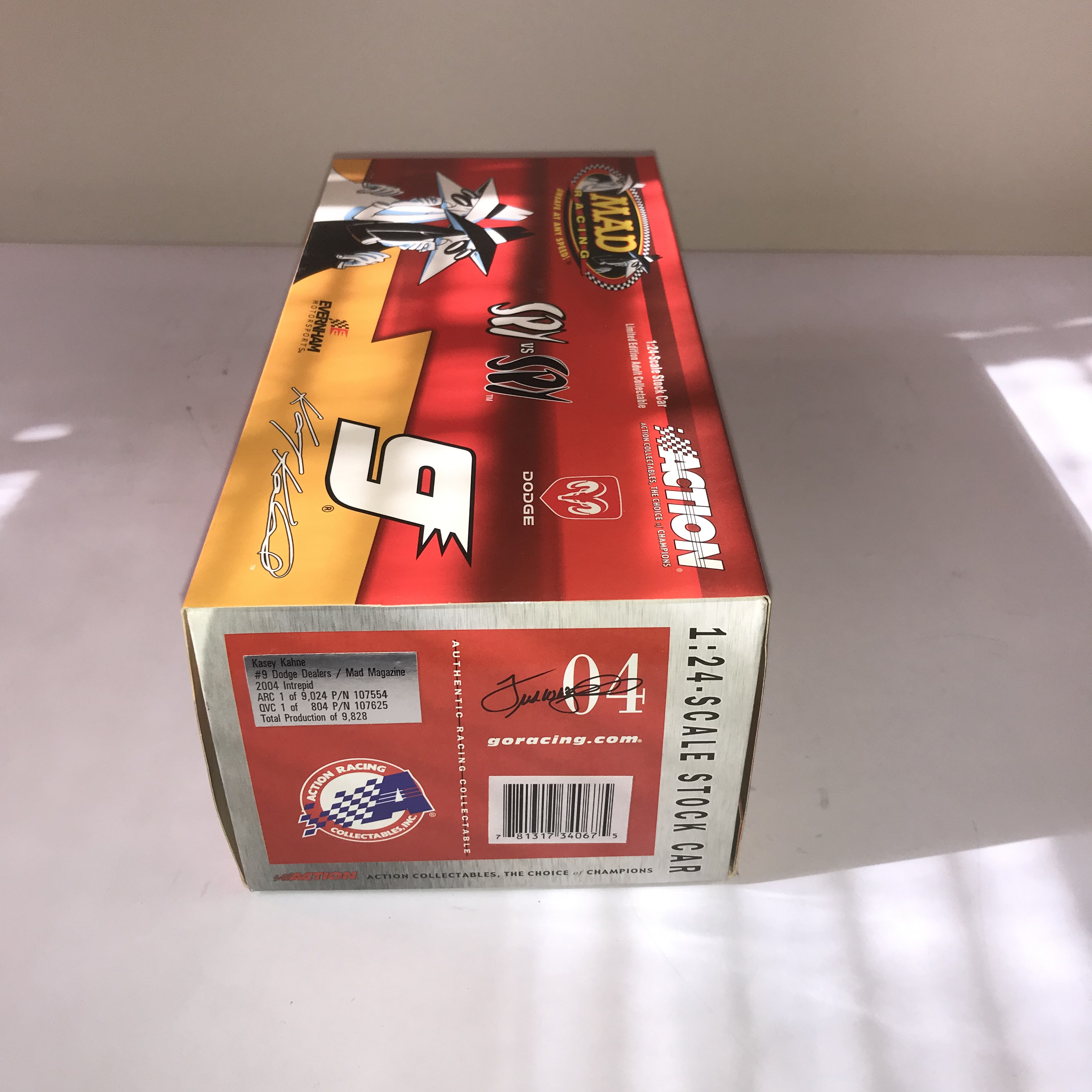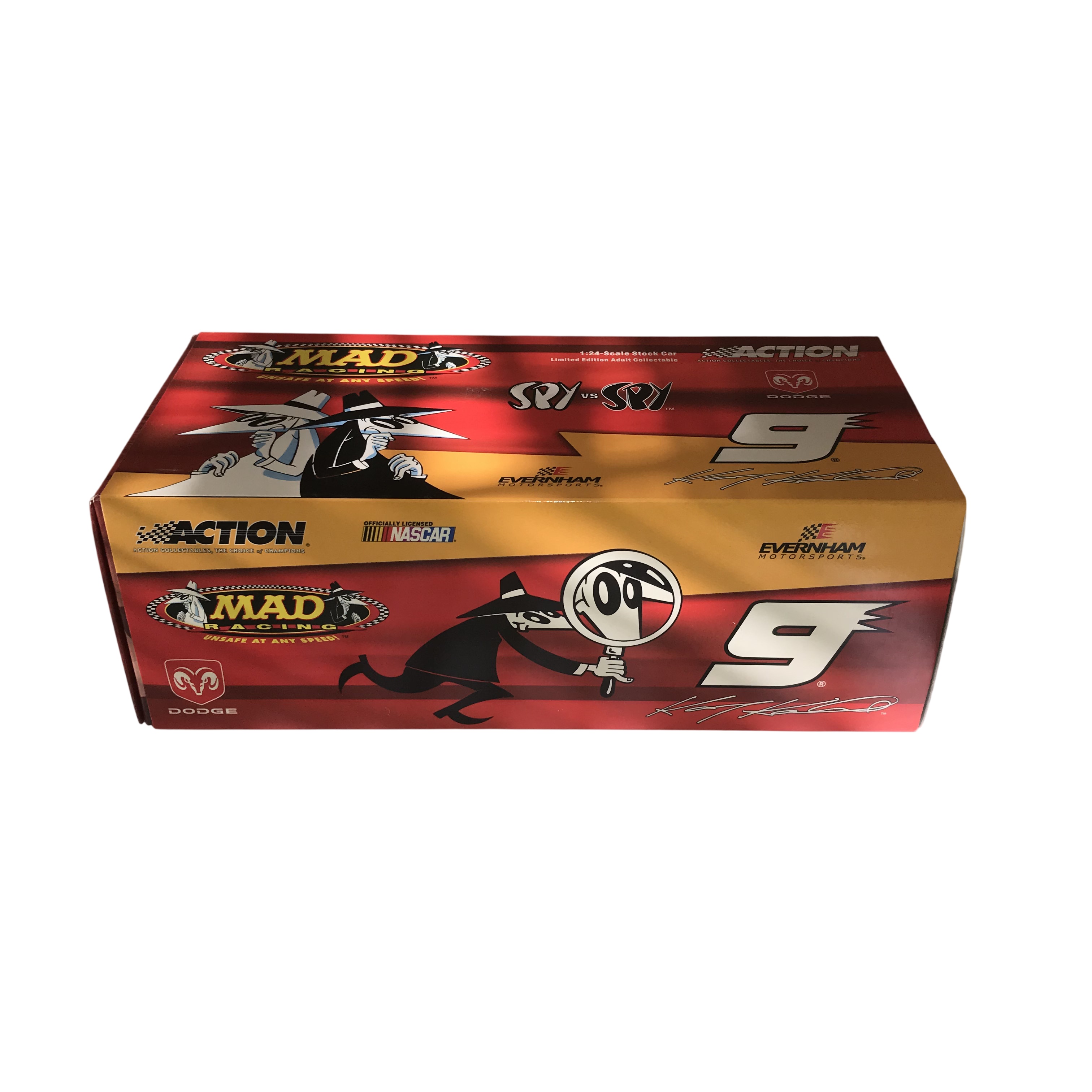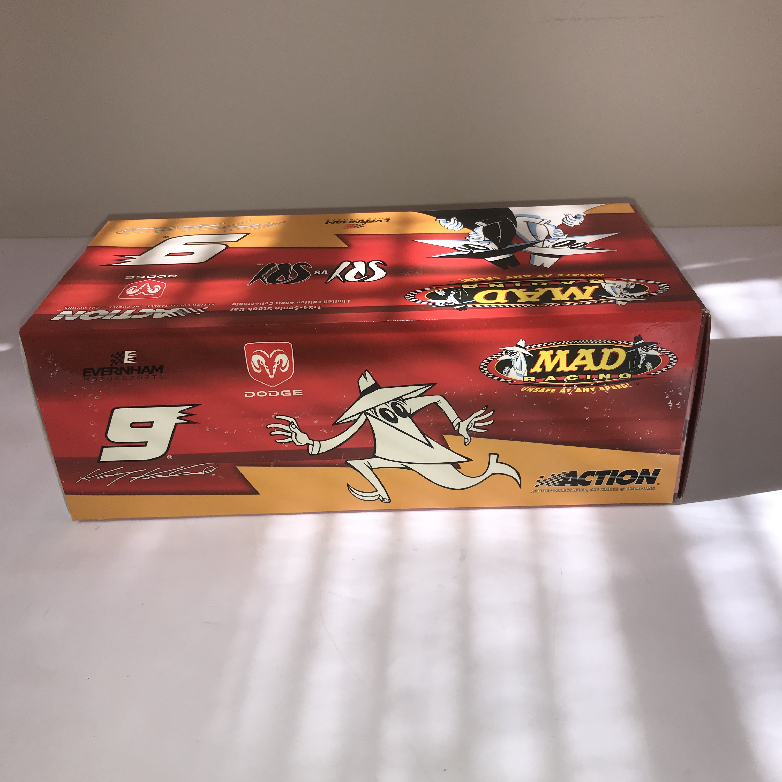 Action Racing Collectables 1:24 scale die-cast model of Kasey Kahne’s #9 Dodge Intrepid from the 2004 NASCAR season. This limited-edition adult collectible features a MAD Magazine Spy vs. Spy livery with Evernham Motorsports and Dodge branding. The model is constructed with a die-cast metal body and chassis and includes detailed engine and interior components. A production label on the box side identifies this as part of a total run of 9,828 units. There is a signature on the windshield