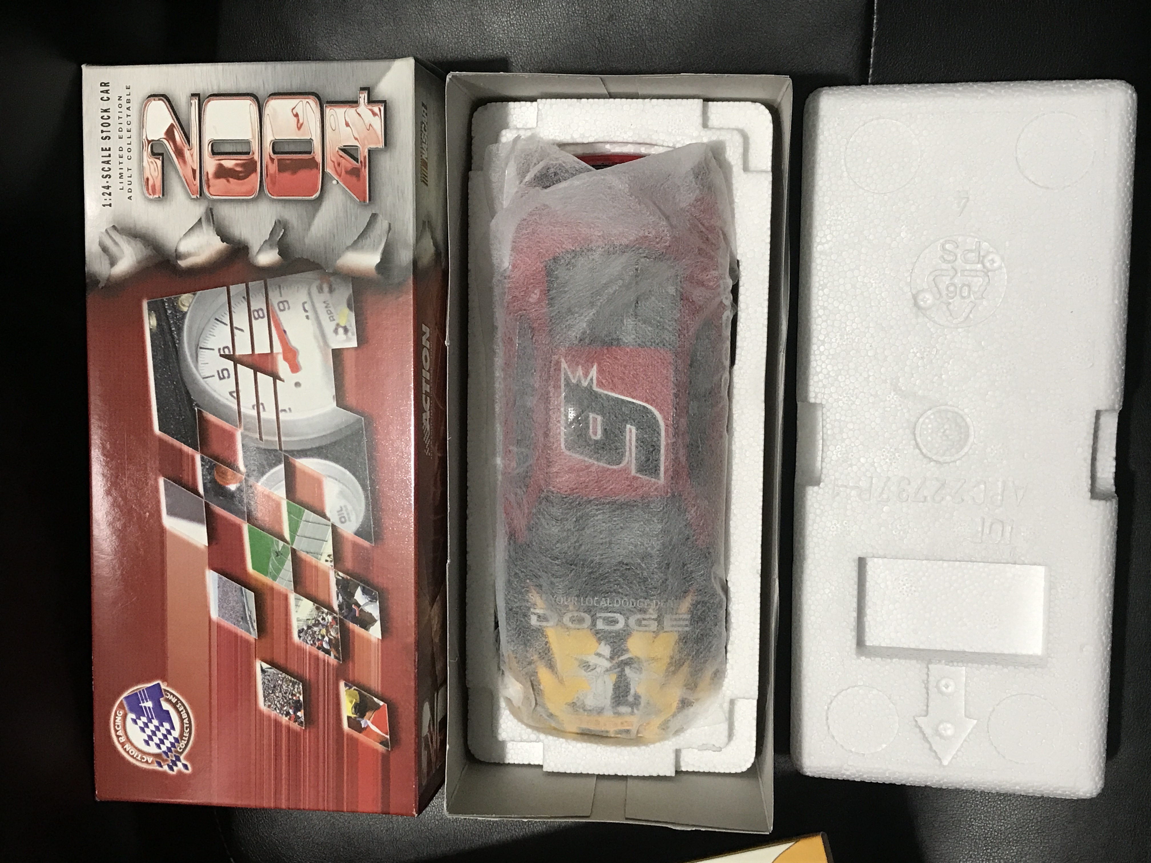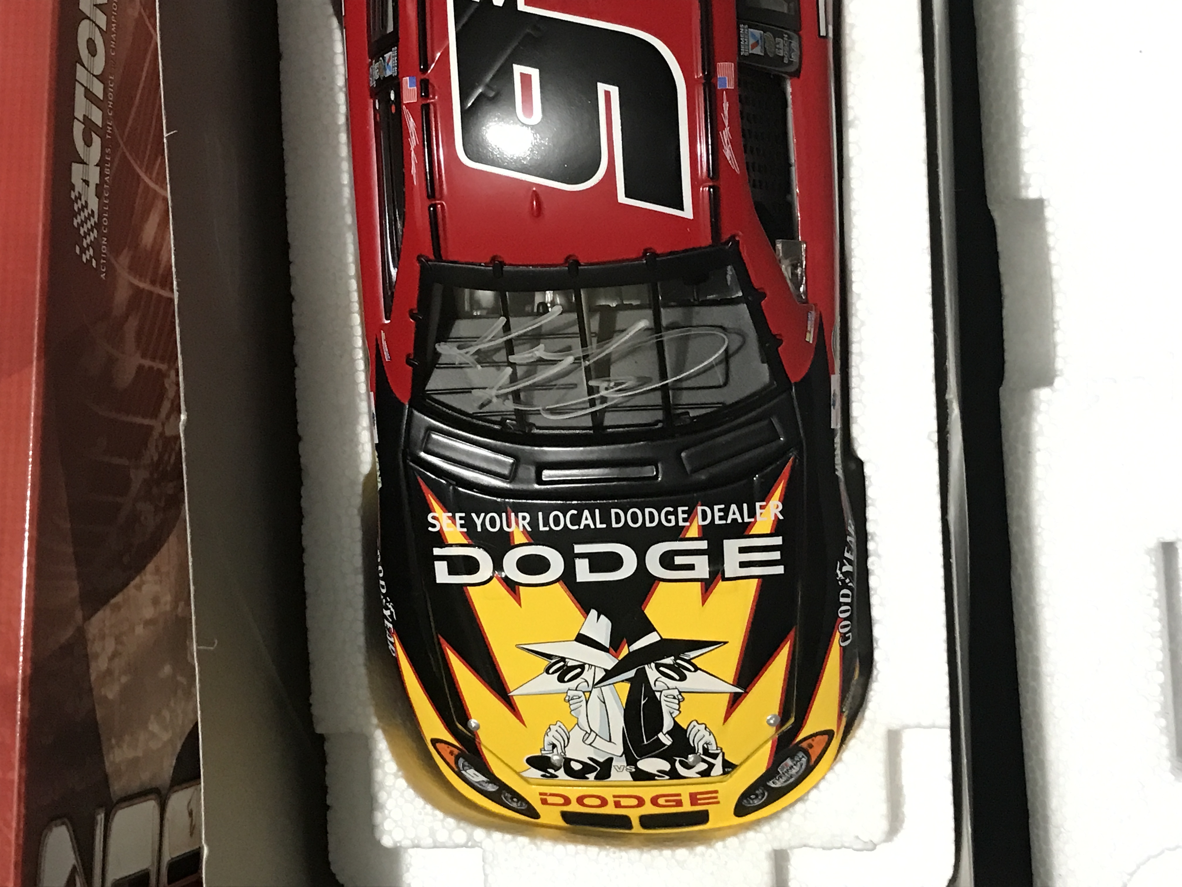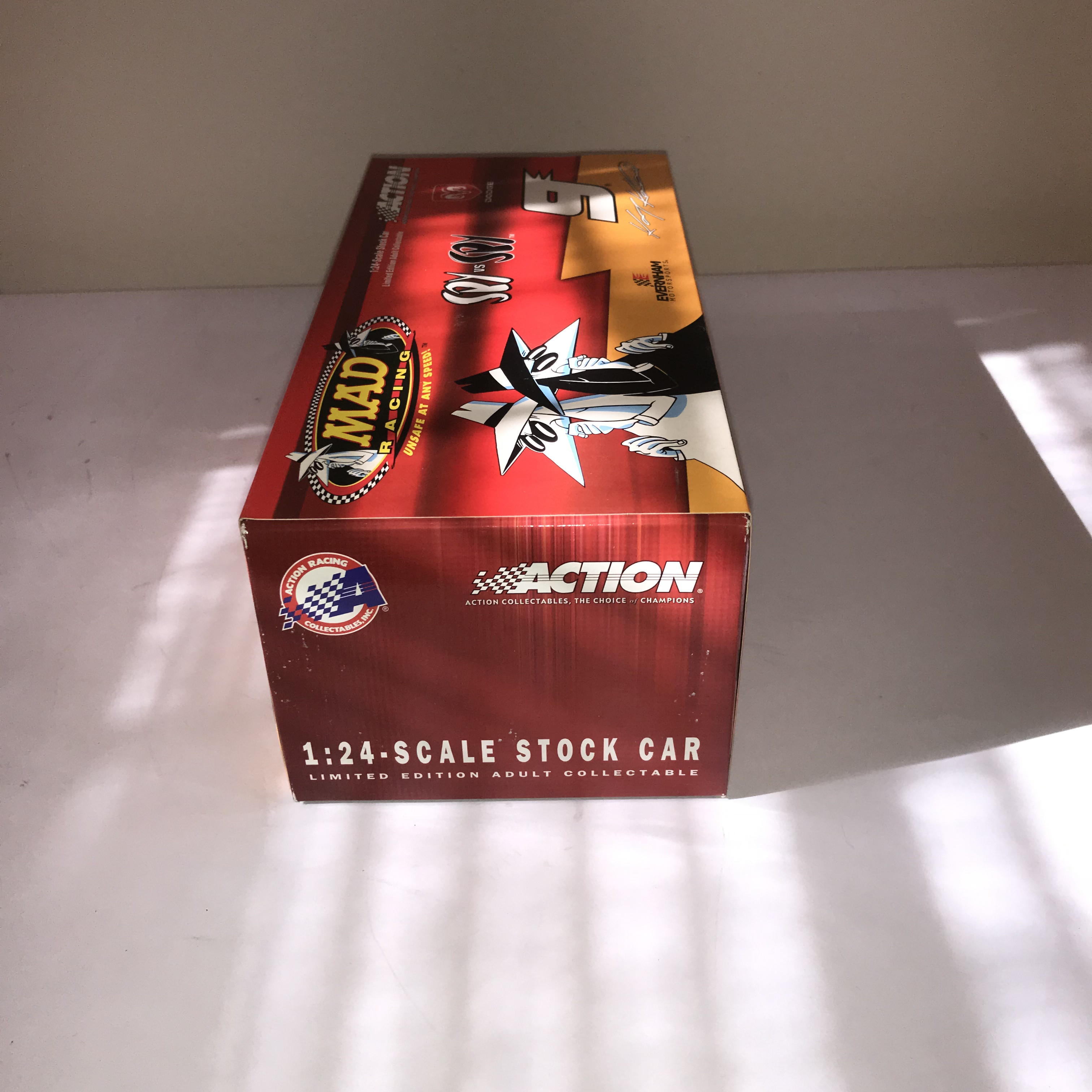 Action Racing Collectables 1:24 scale die-cast model of Kasey Kahne’s #9 Dodge Intrepid from the 2004 NASCAR season. This limited-edition adult collectible features a MAD Magazine Spy vs. Spy livery with Evernham Motorsports and Dodge branding. The model is constructed with a die-cast metal body and chassis and includes detailed engine and interior components. A production label on the box side identifies this as part of a total run of 9,828 units. There is a signature on the windshield