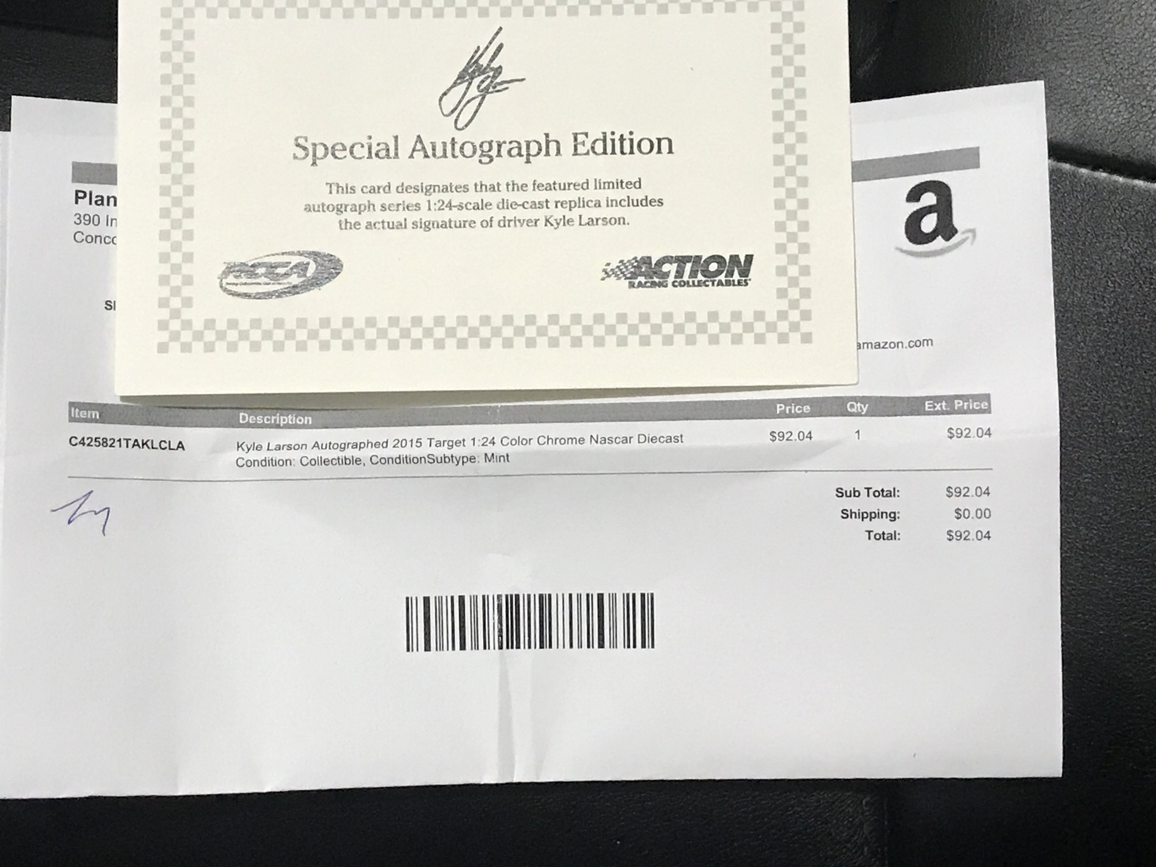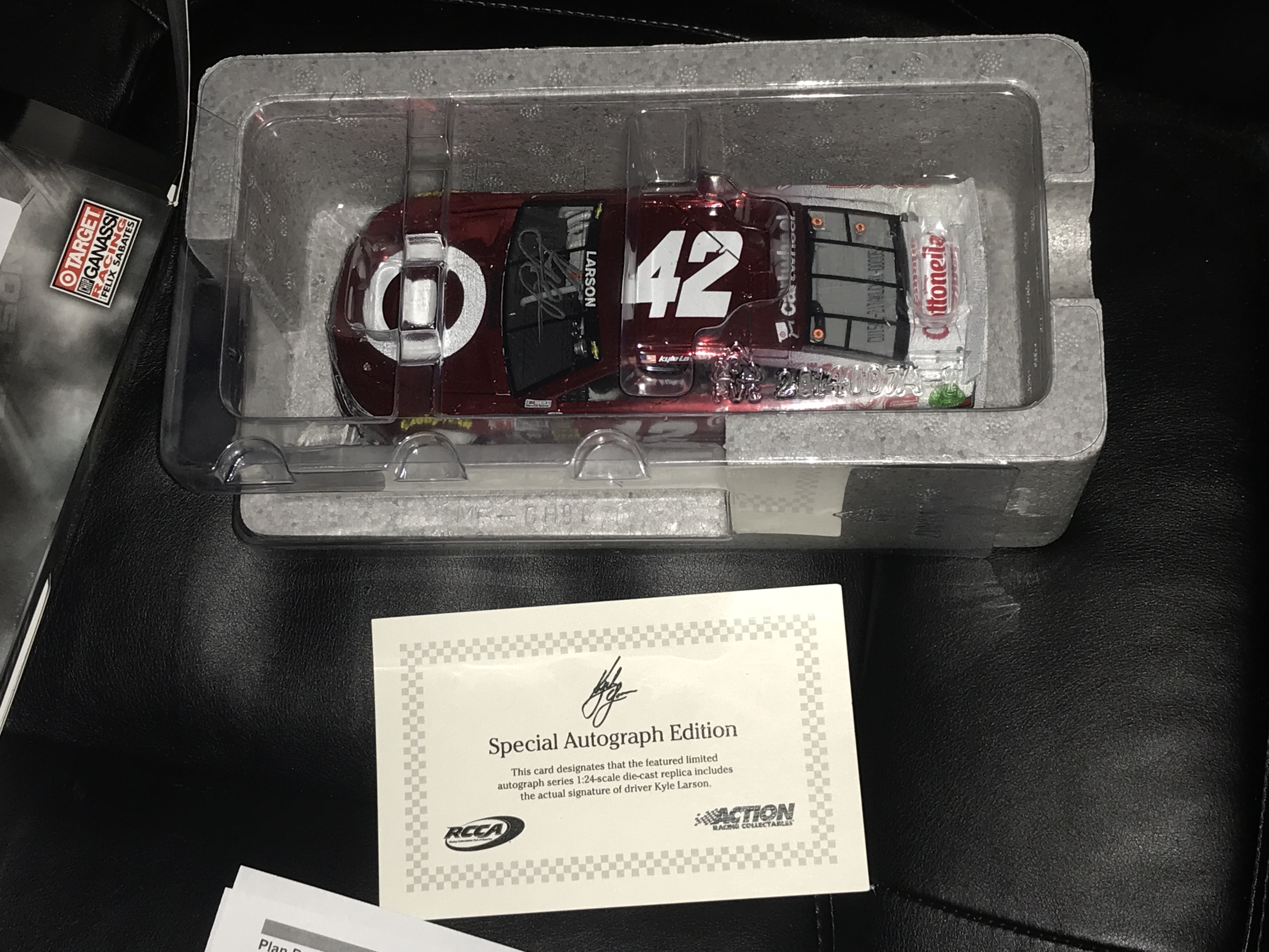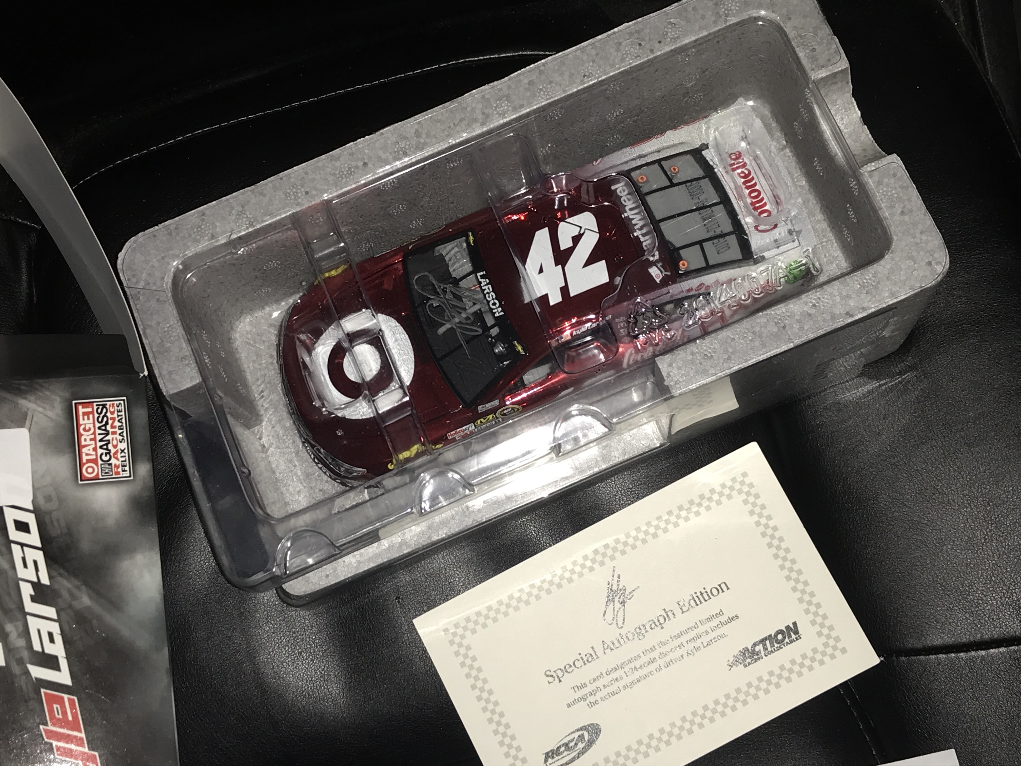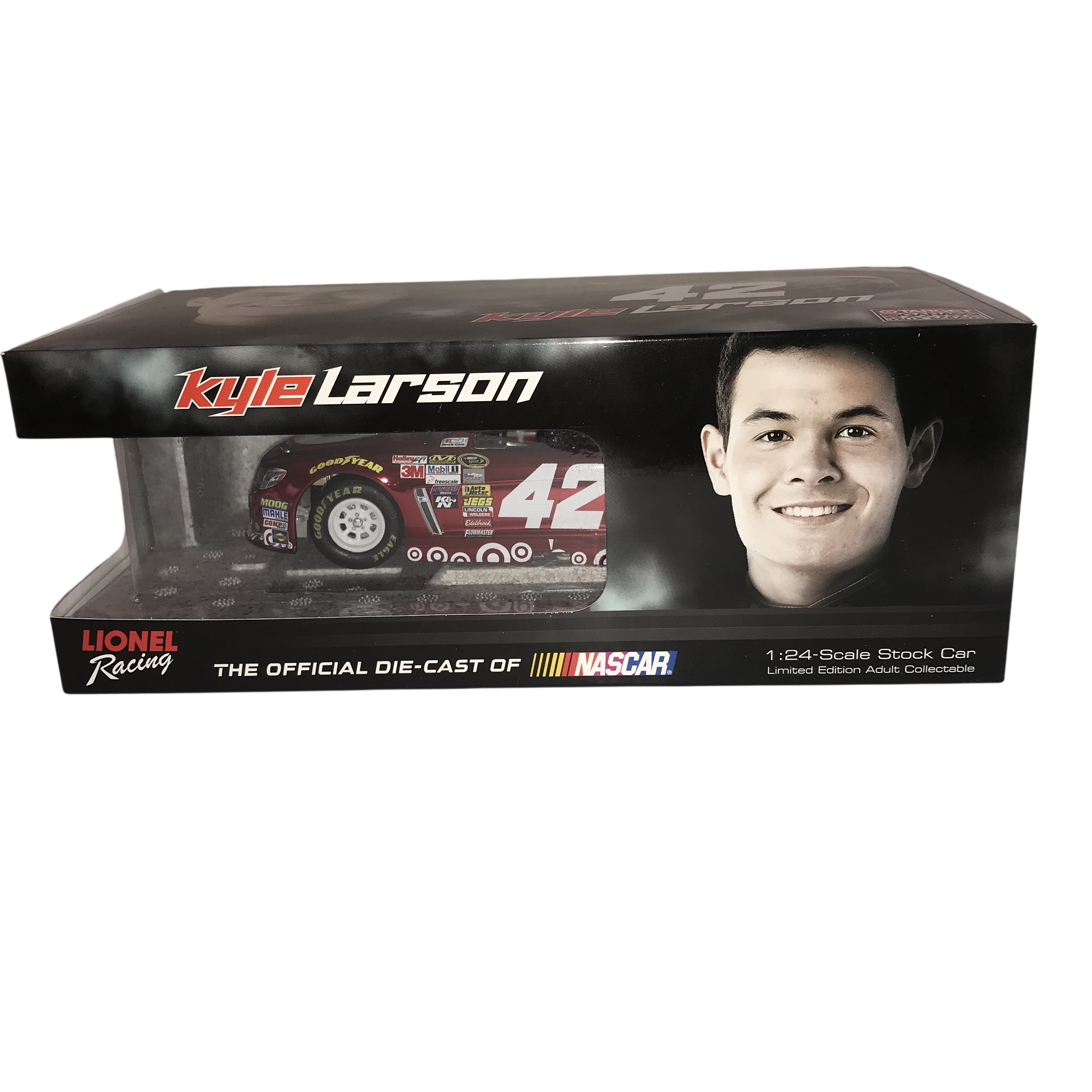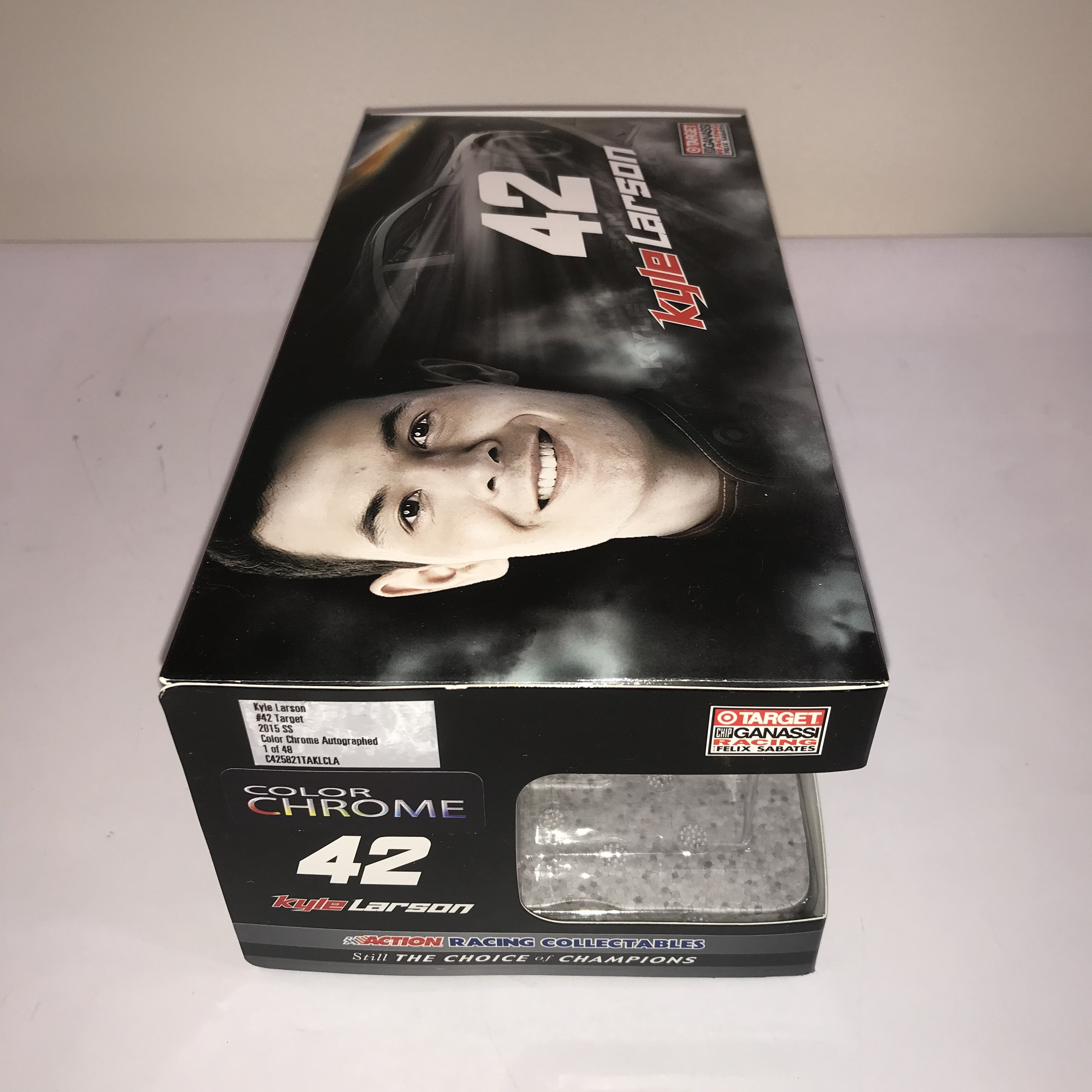 Lionel Racing Action Racing Collectables 1:24-scale die-cast model of Kyle Larson’s number 42 Target Chevrolet SS from the 2015 NASCAR season. This limited edition Color Chrome variant features a metallic dark red finish and is part of a production run of only 48 units. The vehicle is housed in its original window-box packaging and is designated as an autographed edition. A manufacturer label on the side identifies the model as C425821TAKCLA.