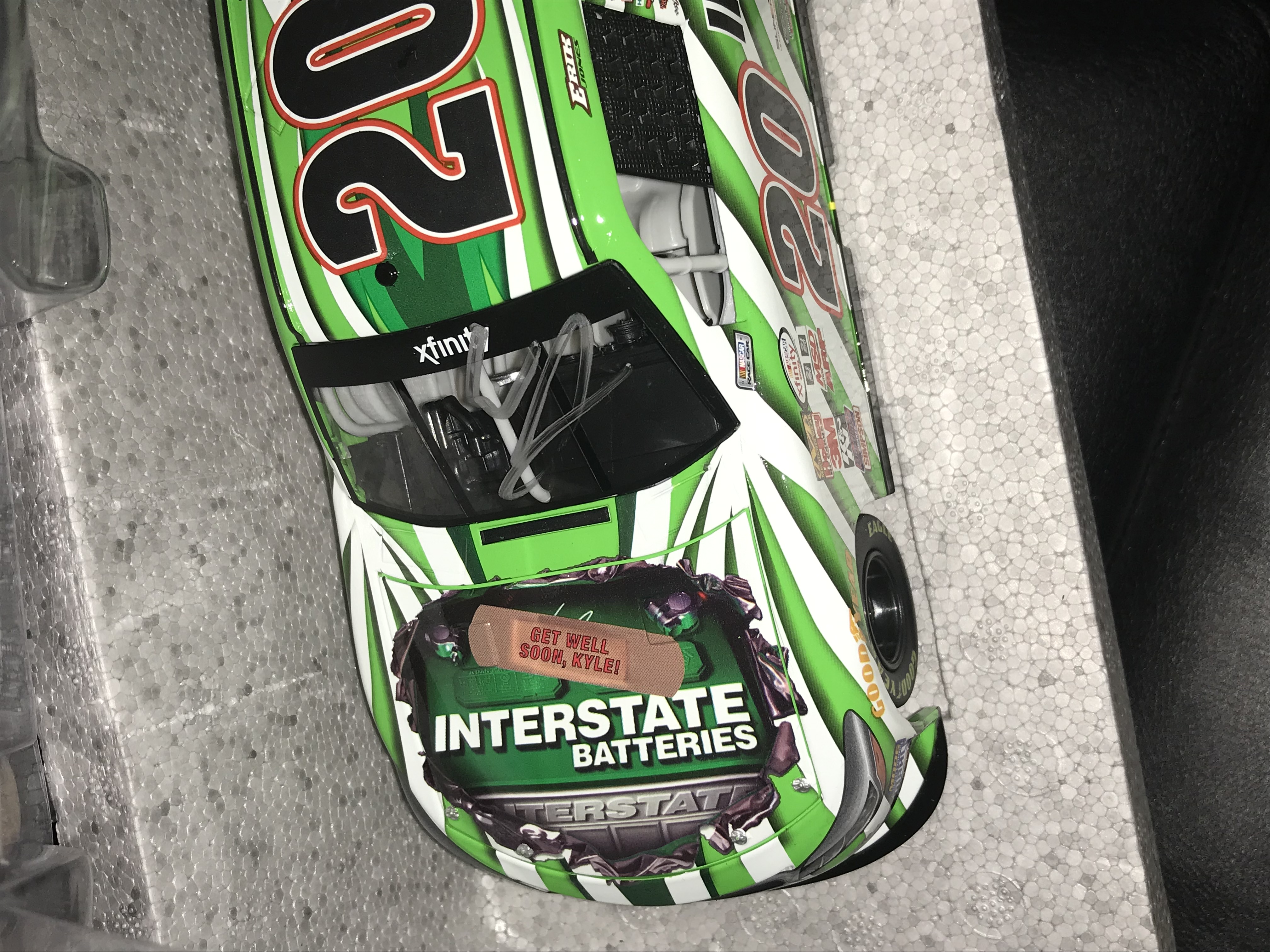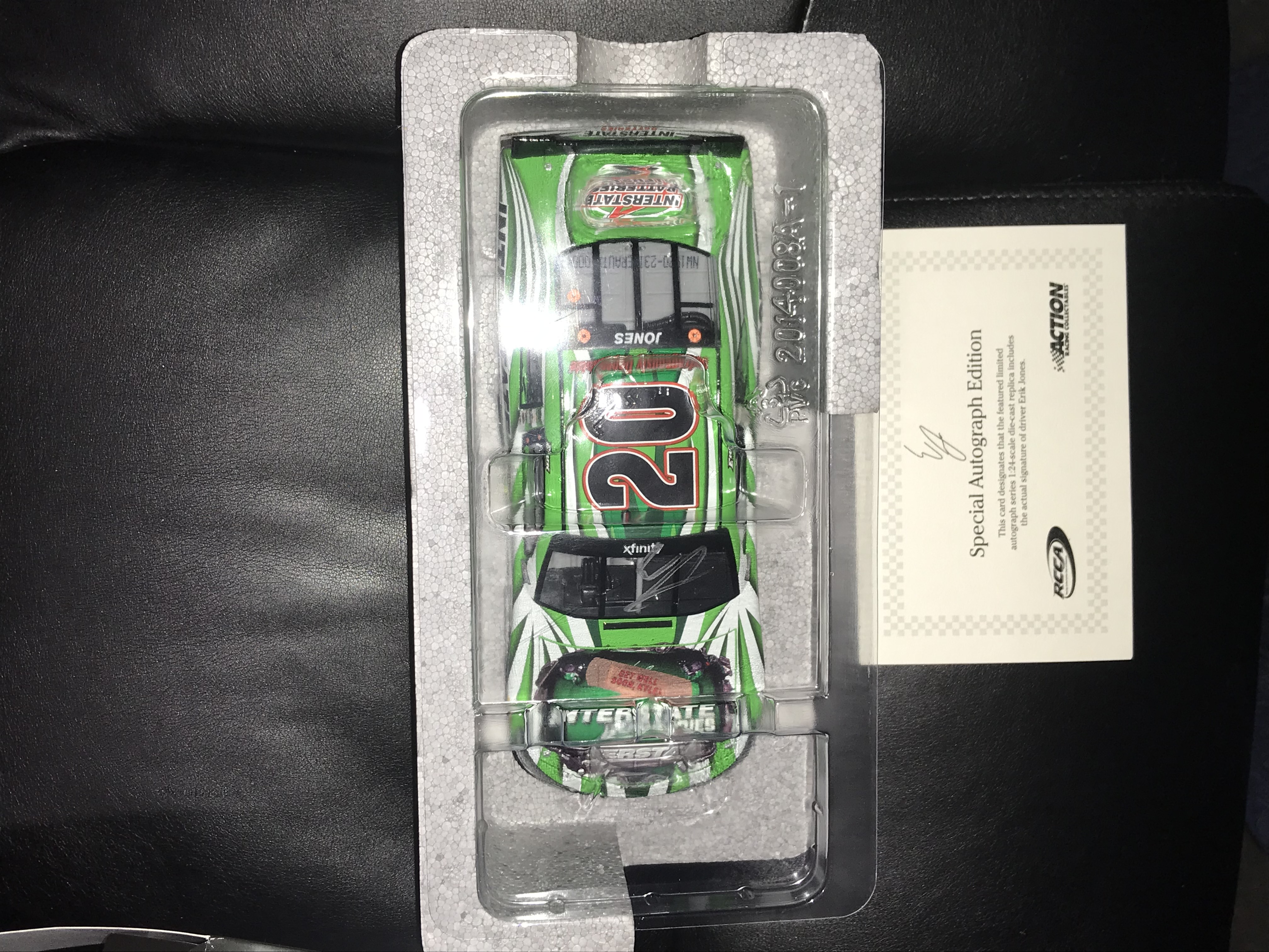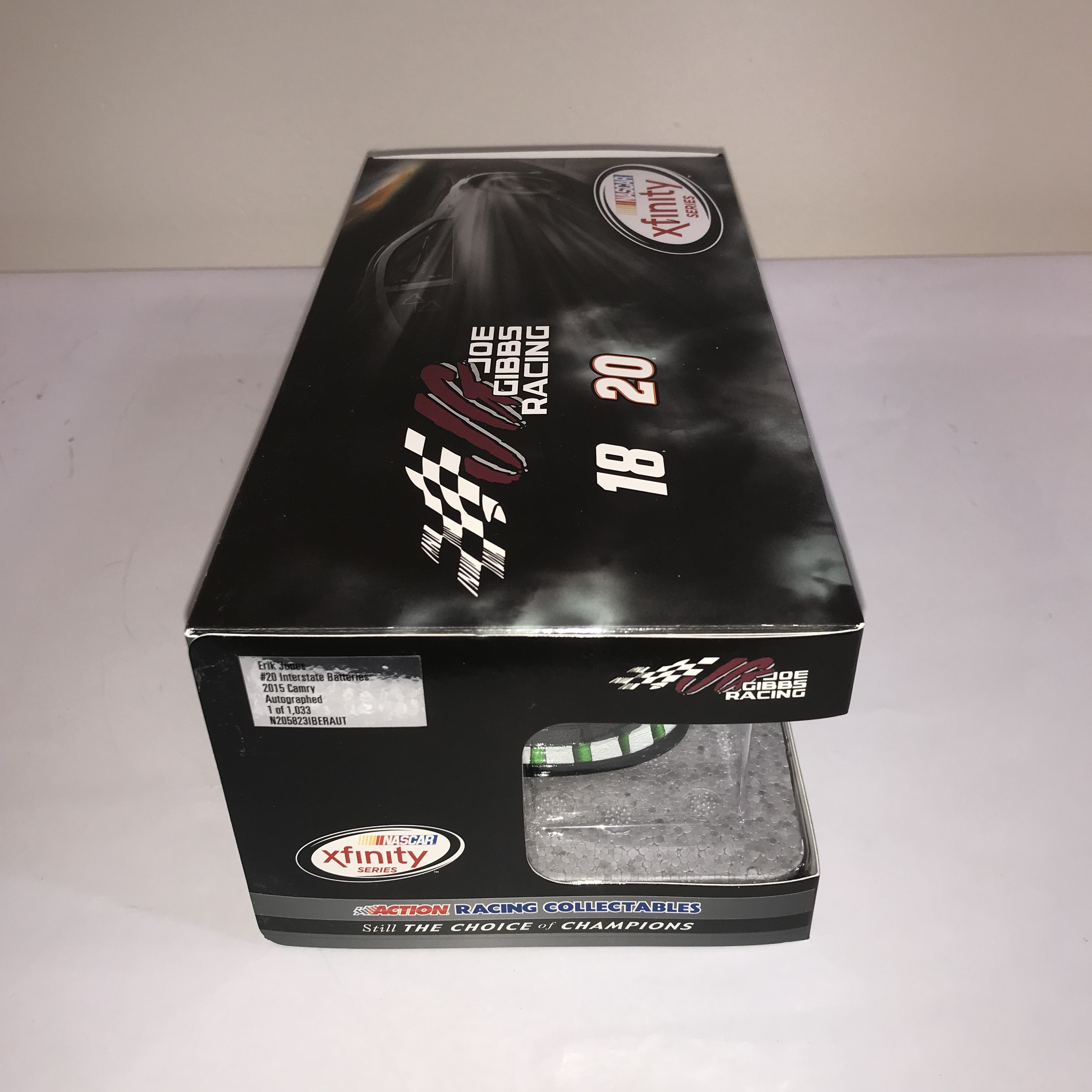 Lionel Racing Action Racing Collectables 1:24 scale die-cast model of the #20 Interstate Batteries Toyota Camry driven by Erik Jones for Joe Gibbs Racing during the 2015 NASCAR Xfinity Series. The car features a green and white Interstate Batteries livery with authentic sponsor decals and a driver-autographed windshield. This limited edition release is identified as 1 of 1,033
