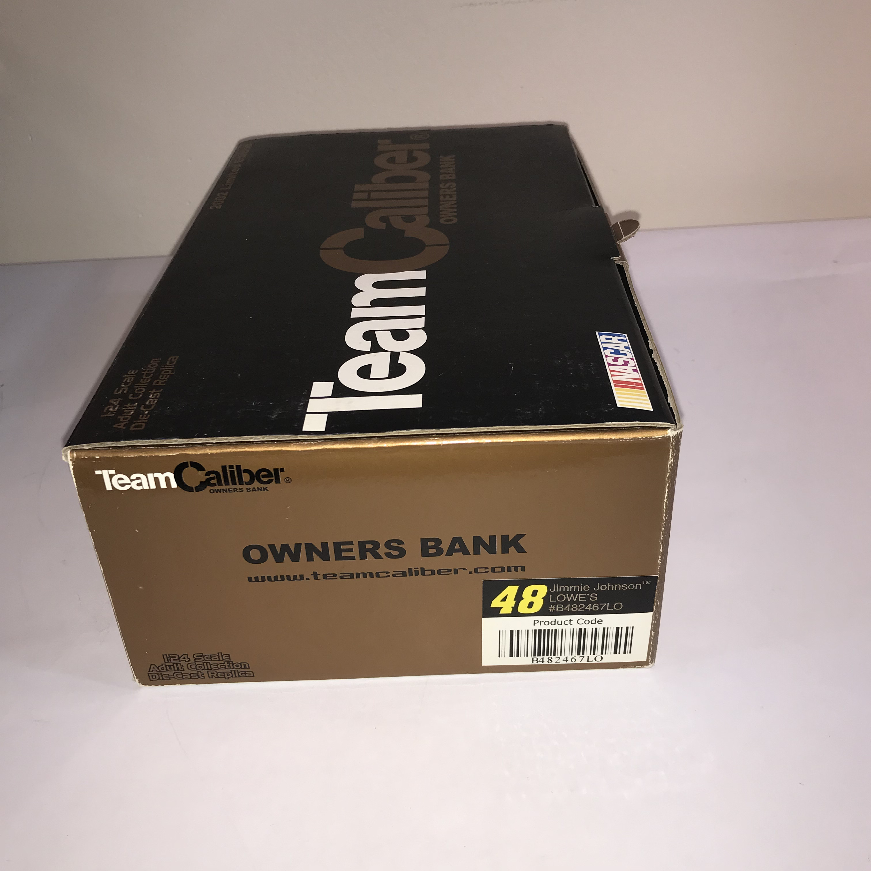 TeamCaliber Owners Bank 1:24 scale die-cast replica stock car bank, 2002 limited edition. This model represents the number 48 Lowe’s Chevrolet driven by Jimmie Johnson and features a die-cast body and chassis. The item is housed in its original box with a technical diagram on the interior lid and includes a gold-tone medallion numbered to 504 and a Certificate of Authenticity.
