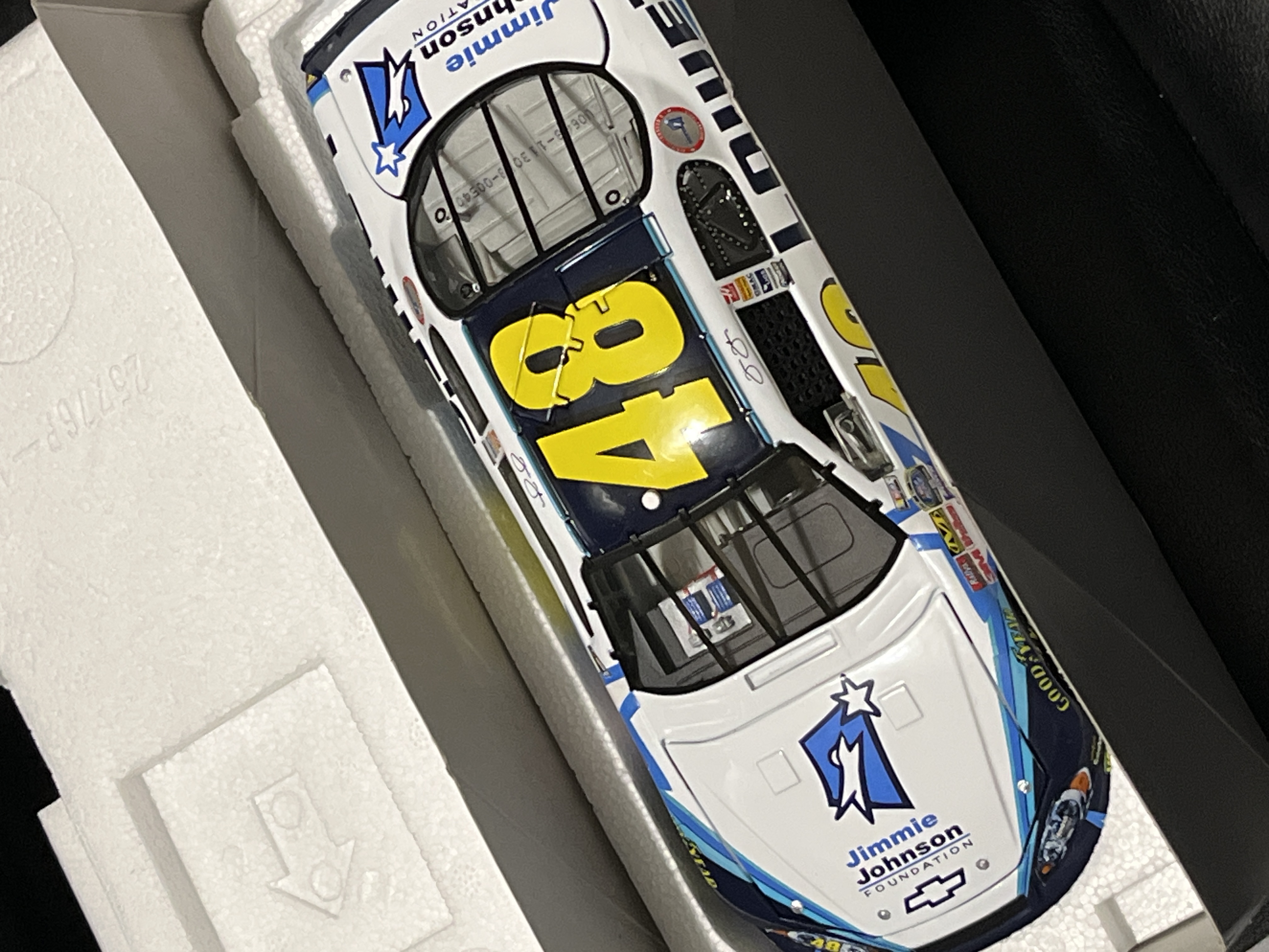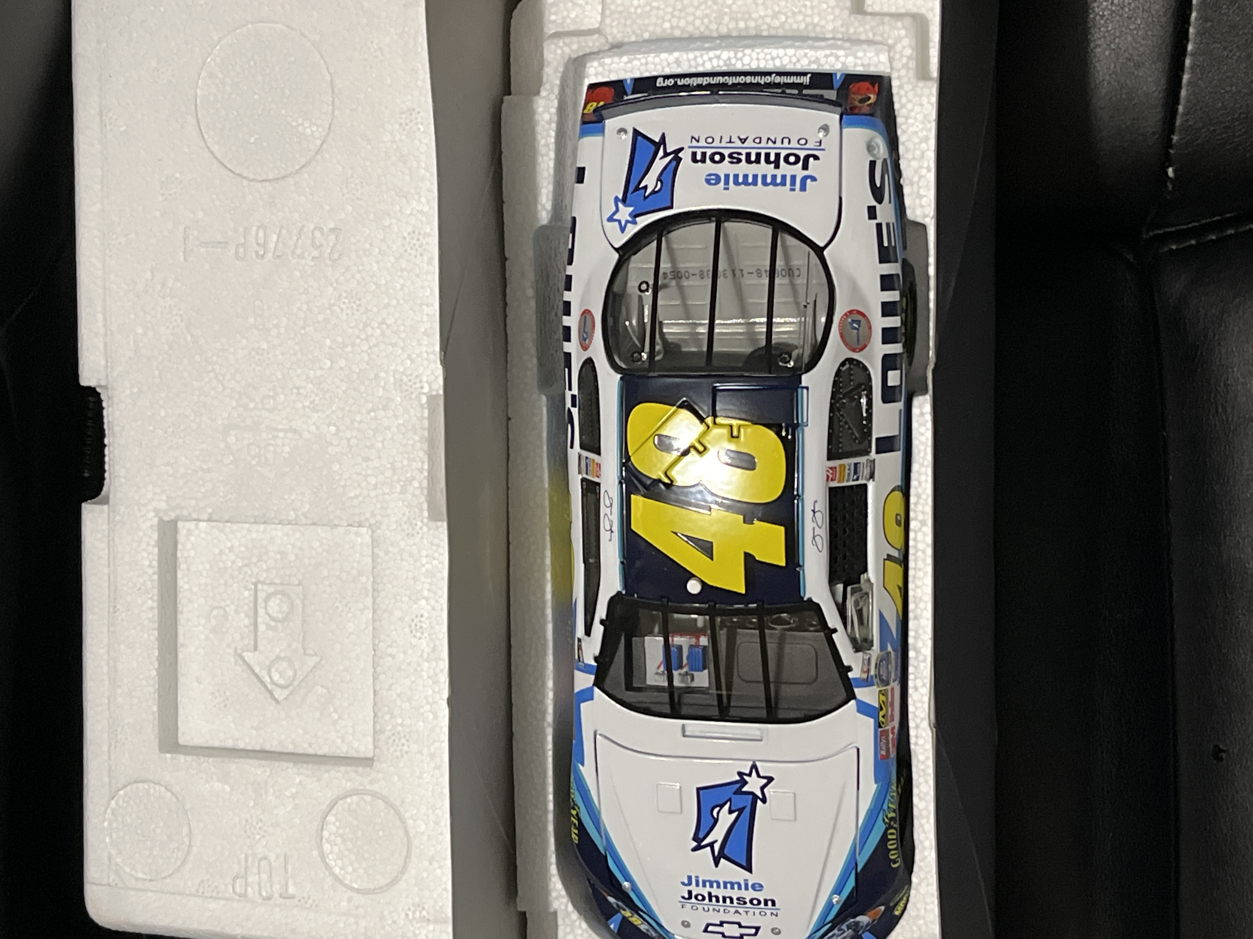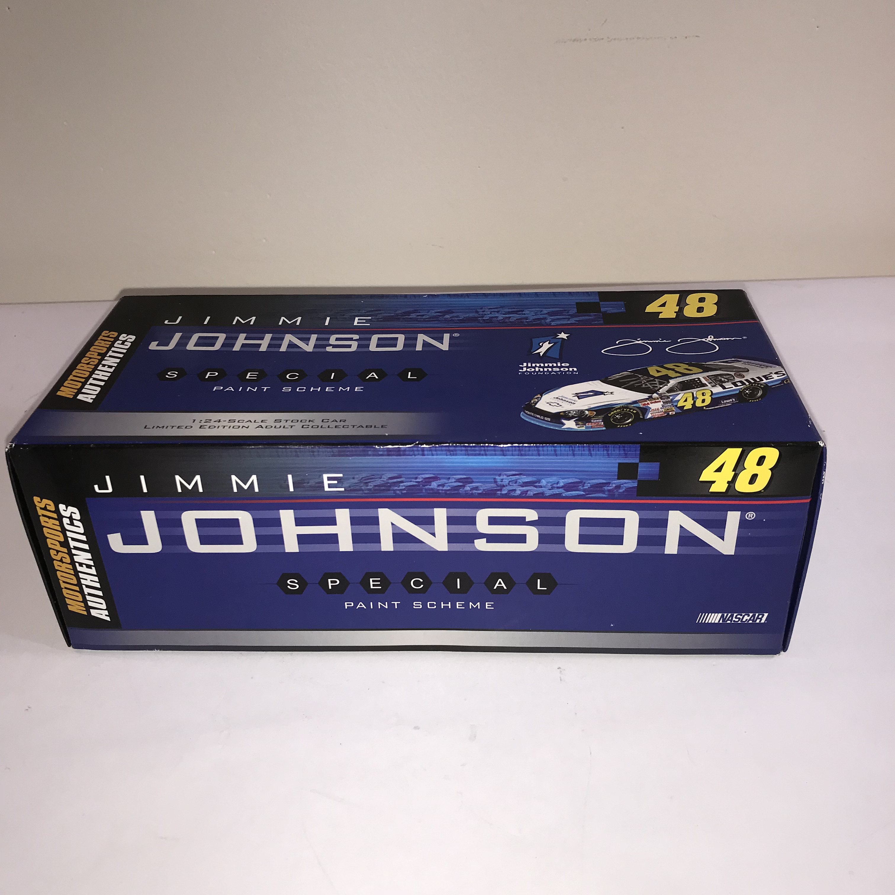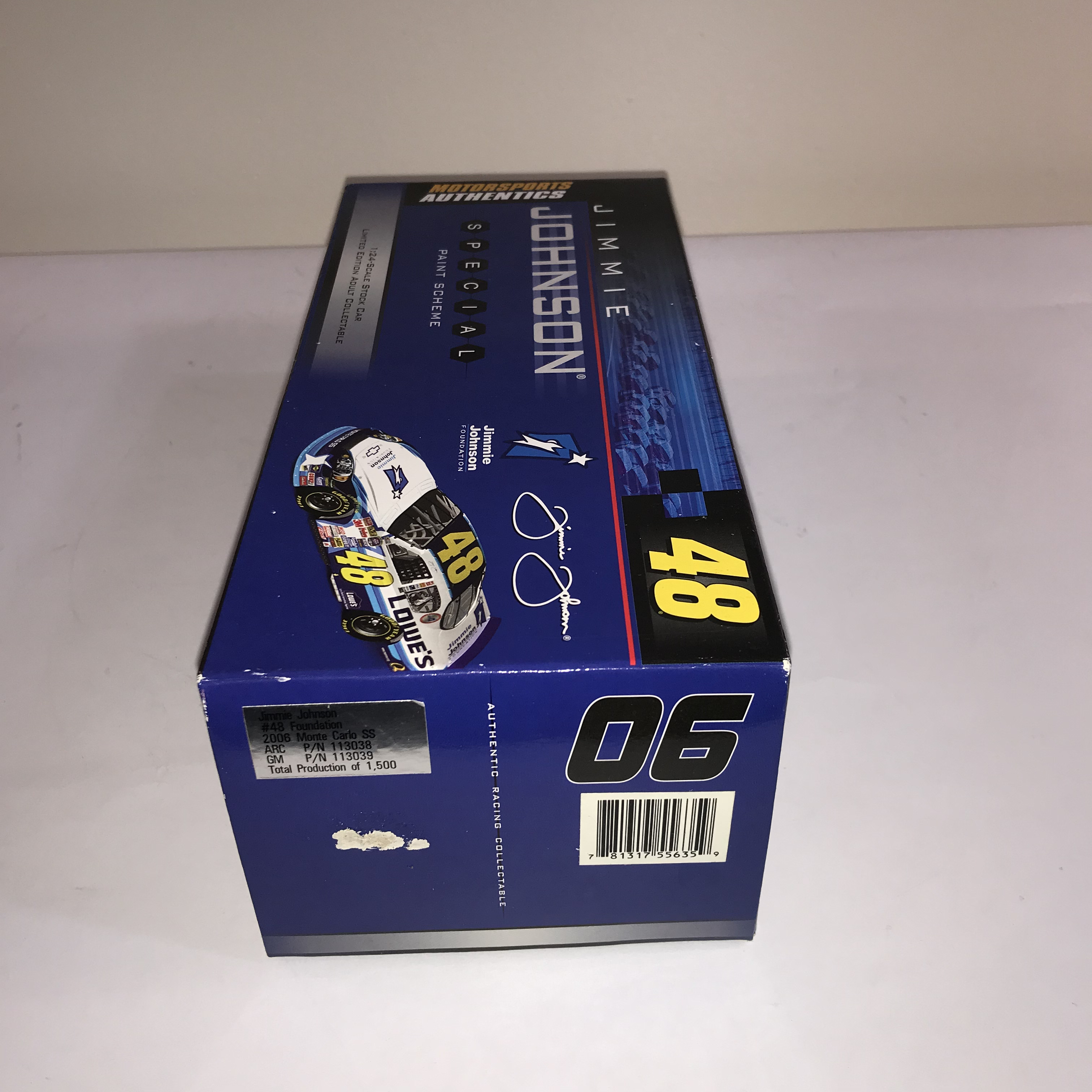 This is a 1:24 scale die-cast model of the Jimmie Johnson #48 NASCAR stock car, featuring a special paint scheme for the Jimmie Johnson Foundation. The model represents a 2006 Chevrolet Monte Carlo SS and is produced by Motorsports Authentics as part of their Authentic Racing Collectable line. The vehicle is constructed from die-cast metal with plastic components. It is housed in its original illustrated cardboard box, which features a blue and black design with images of the car, a facsimile signature of Jimmie Johnson, and logos for the Jimmie Johnson Foundation, NASCAR, and Motorsports Authentics. The end panel of the box displays a large 06 to signify the model year. A silver foil label affixed to the end of the box contains the following printed information: Jimmie Johnson, #48 Foundation, 2006 Monte Carlo SS, ARC P/N 113038, GM P/N 113039, and Total Production of 1,500.