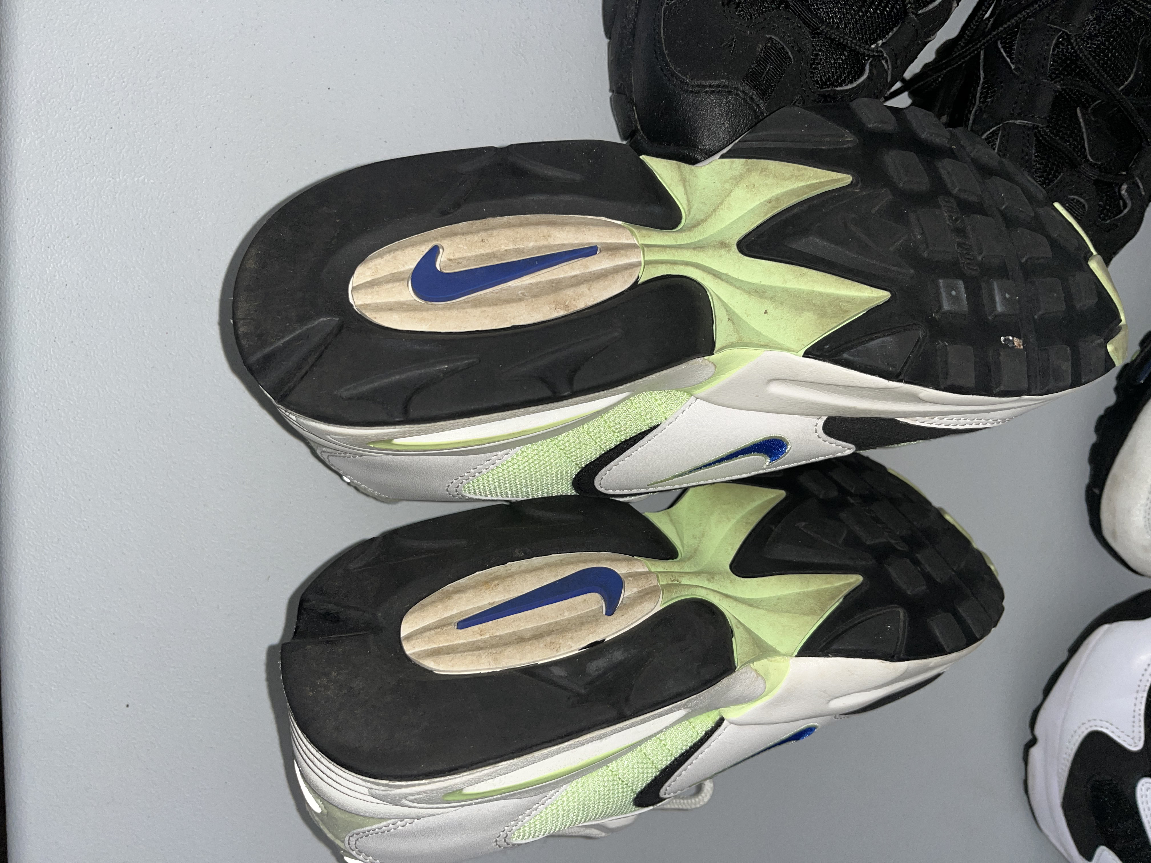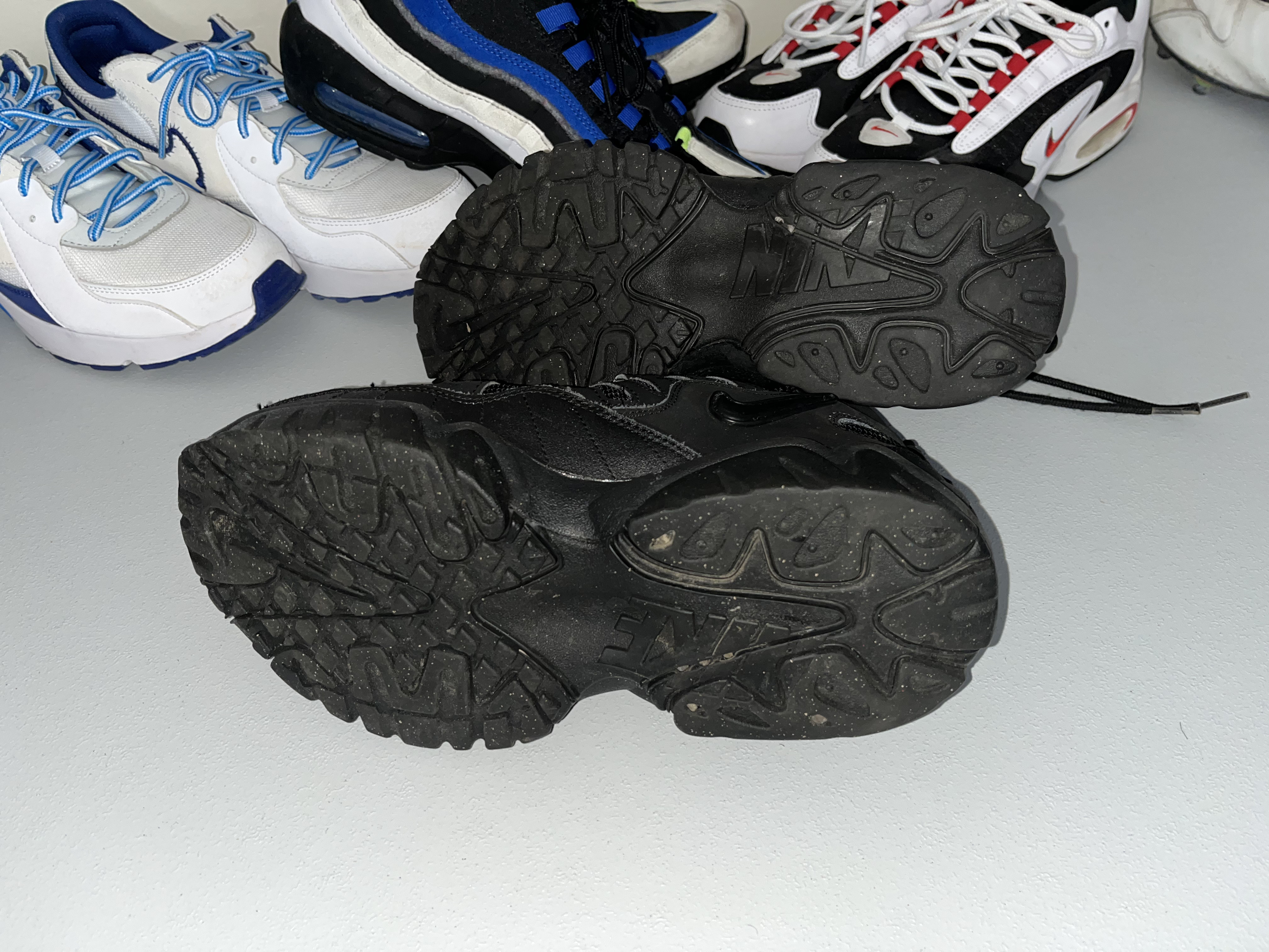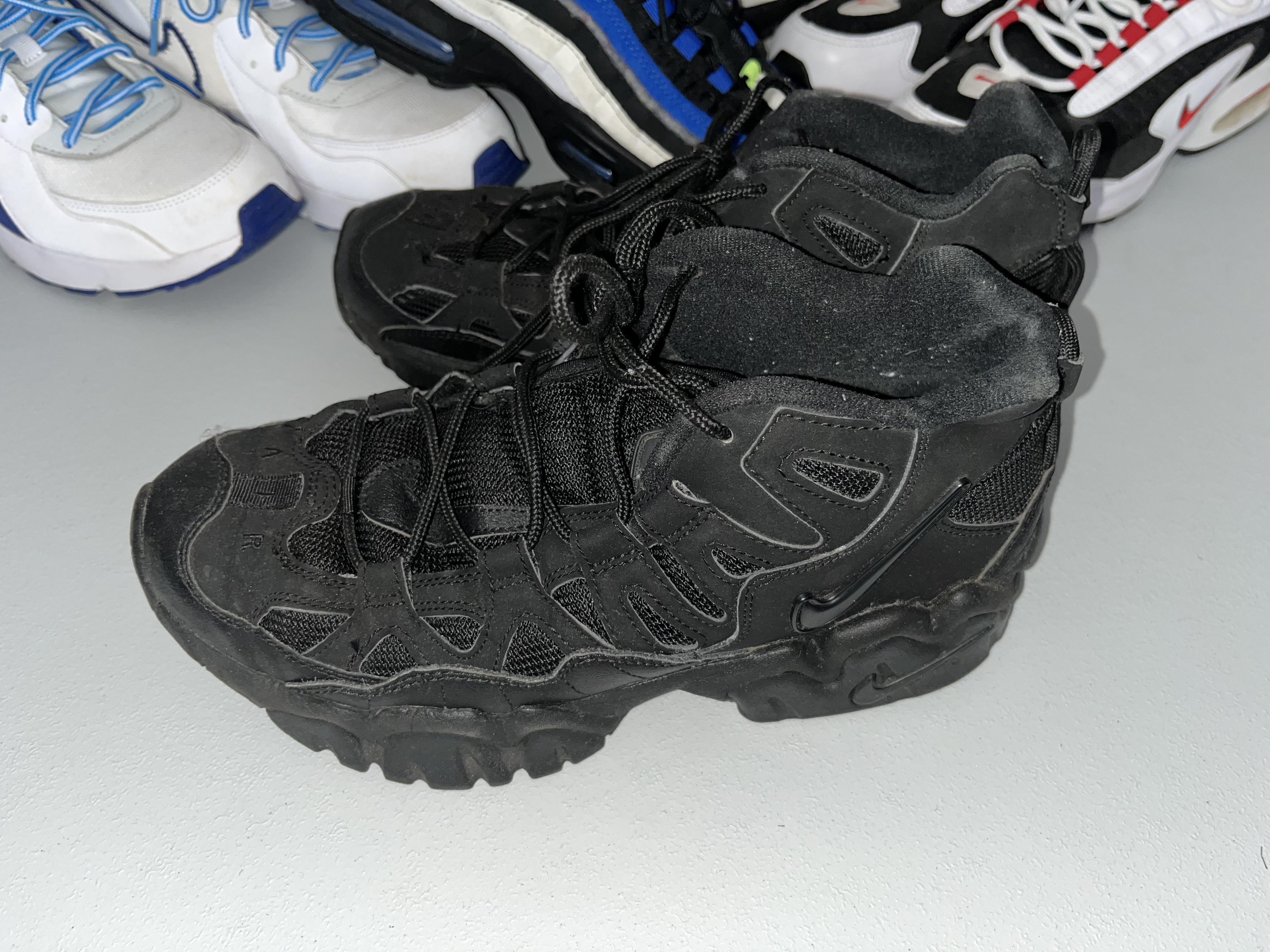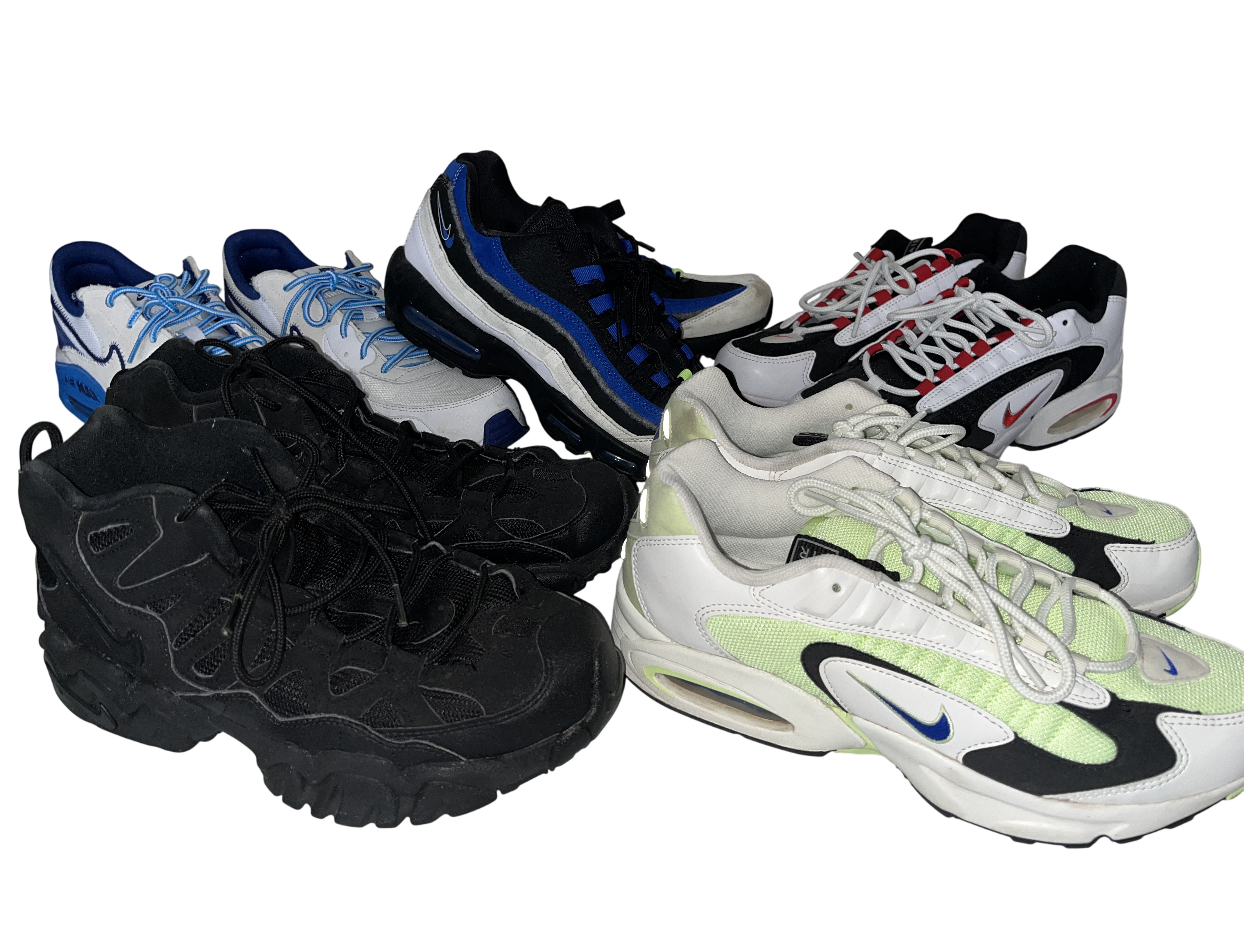 Gently worn, in very good condition. A collection of five pairs of Nike athletic sneakers featuring various iconic silhouettes.