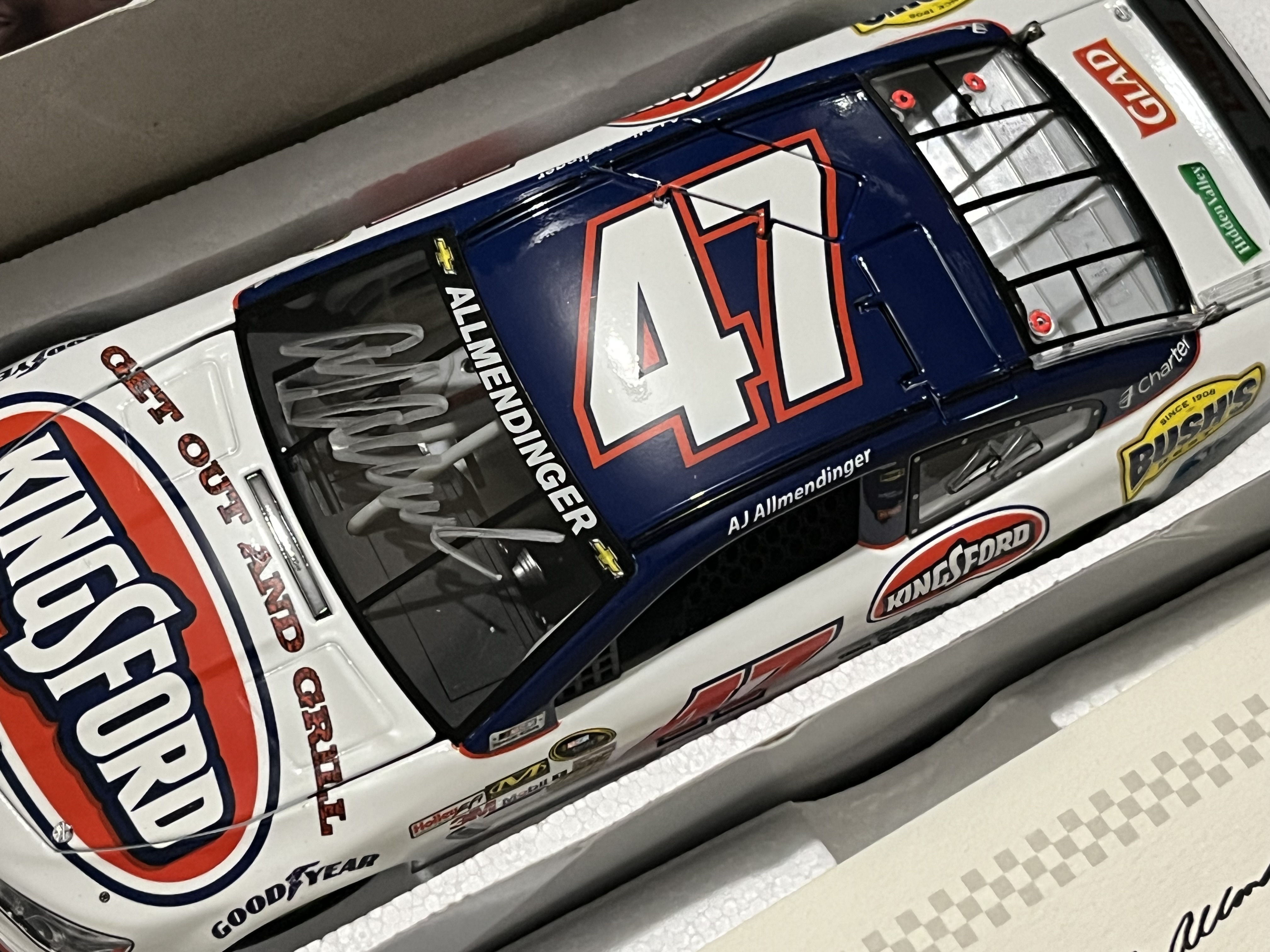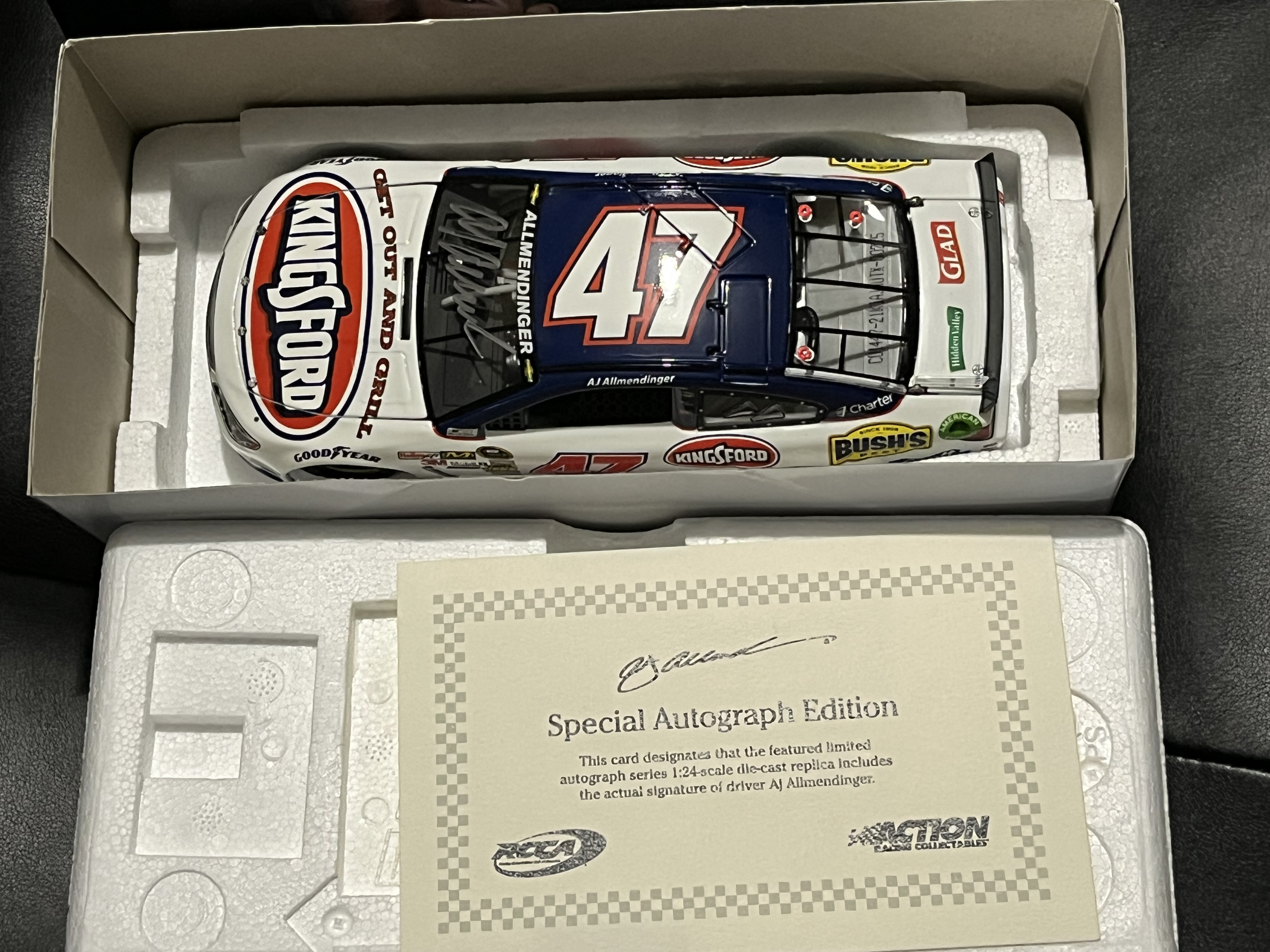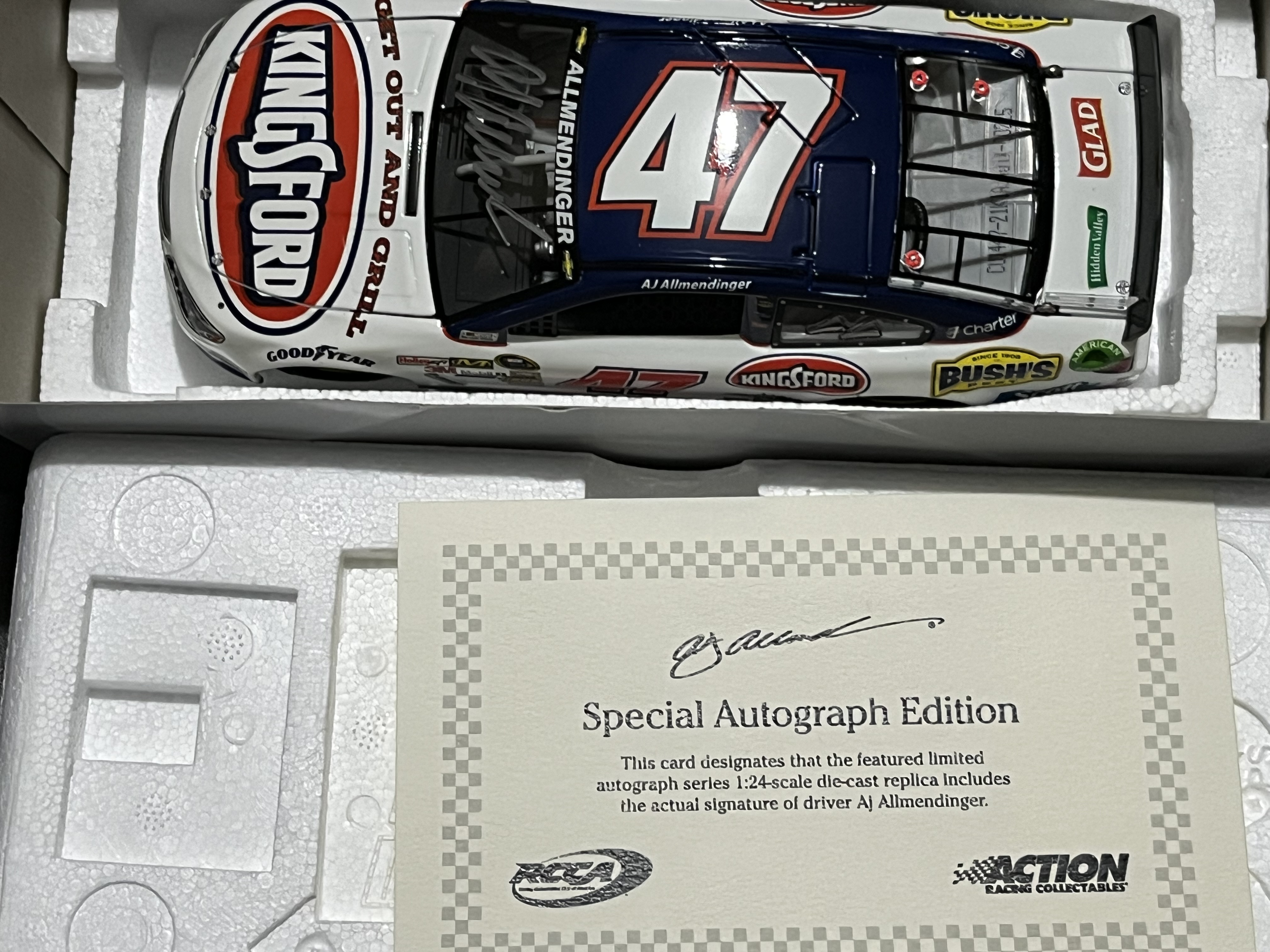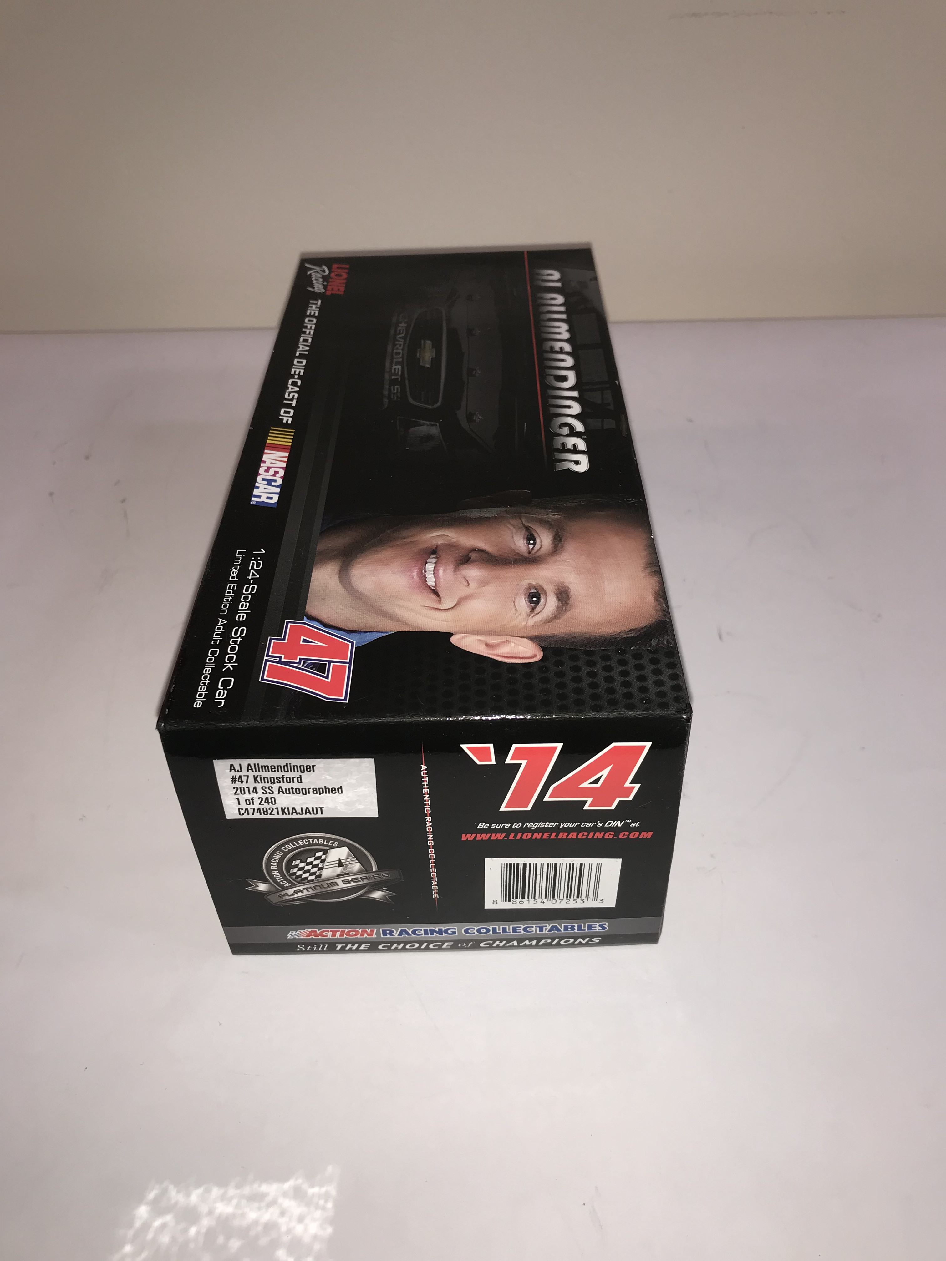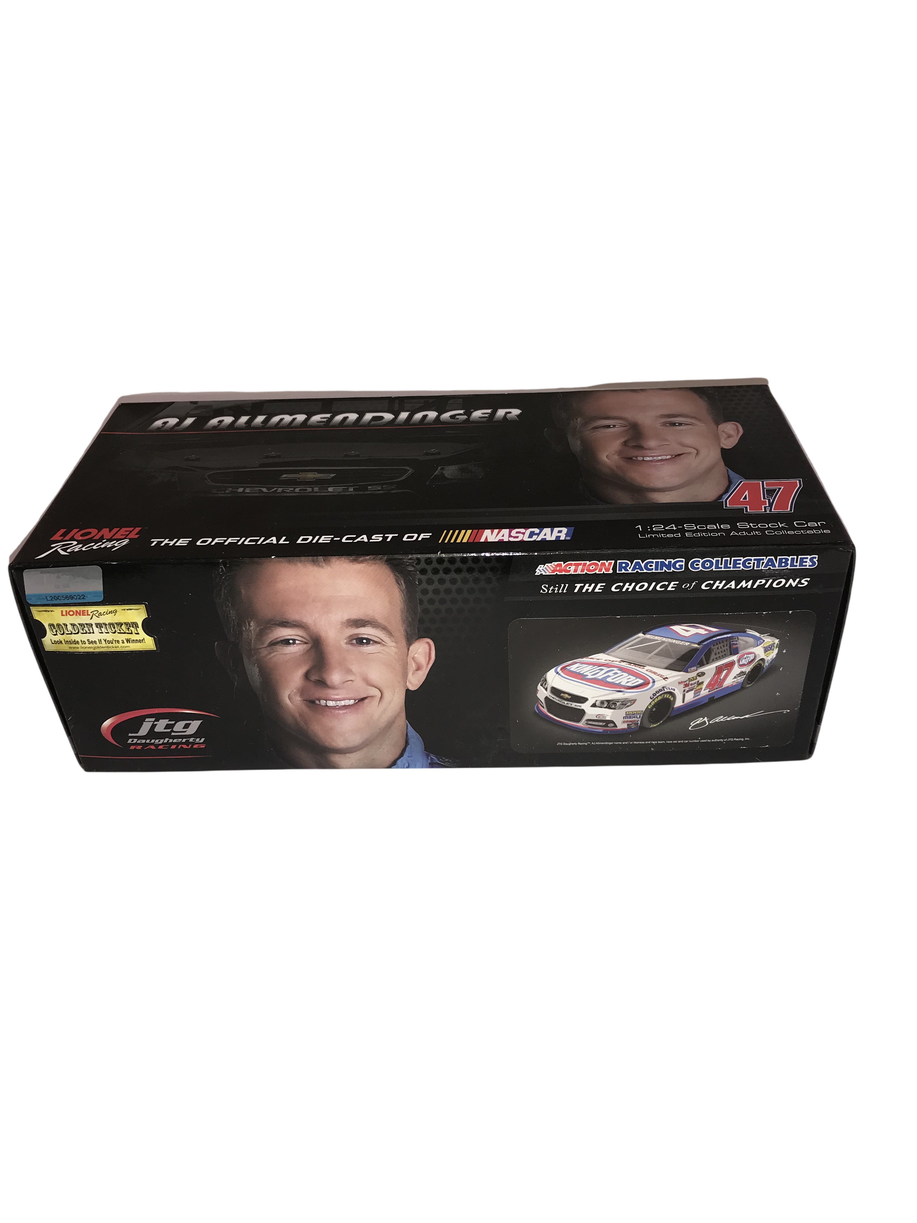 1:24 scale die-cast model of the #47 Kingsford-sponsored 2014 Chevrolet SS driven by AJ Allmendinger for JTG Daugherty Racing. The model was produced by Lionel Racing under the Action Racing Collectables Platinum Series. Limited Edition autographed release 1 of 240 produced. The box also features a Lionel Racing Golden Ticket promotional sticker.