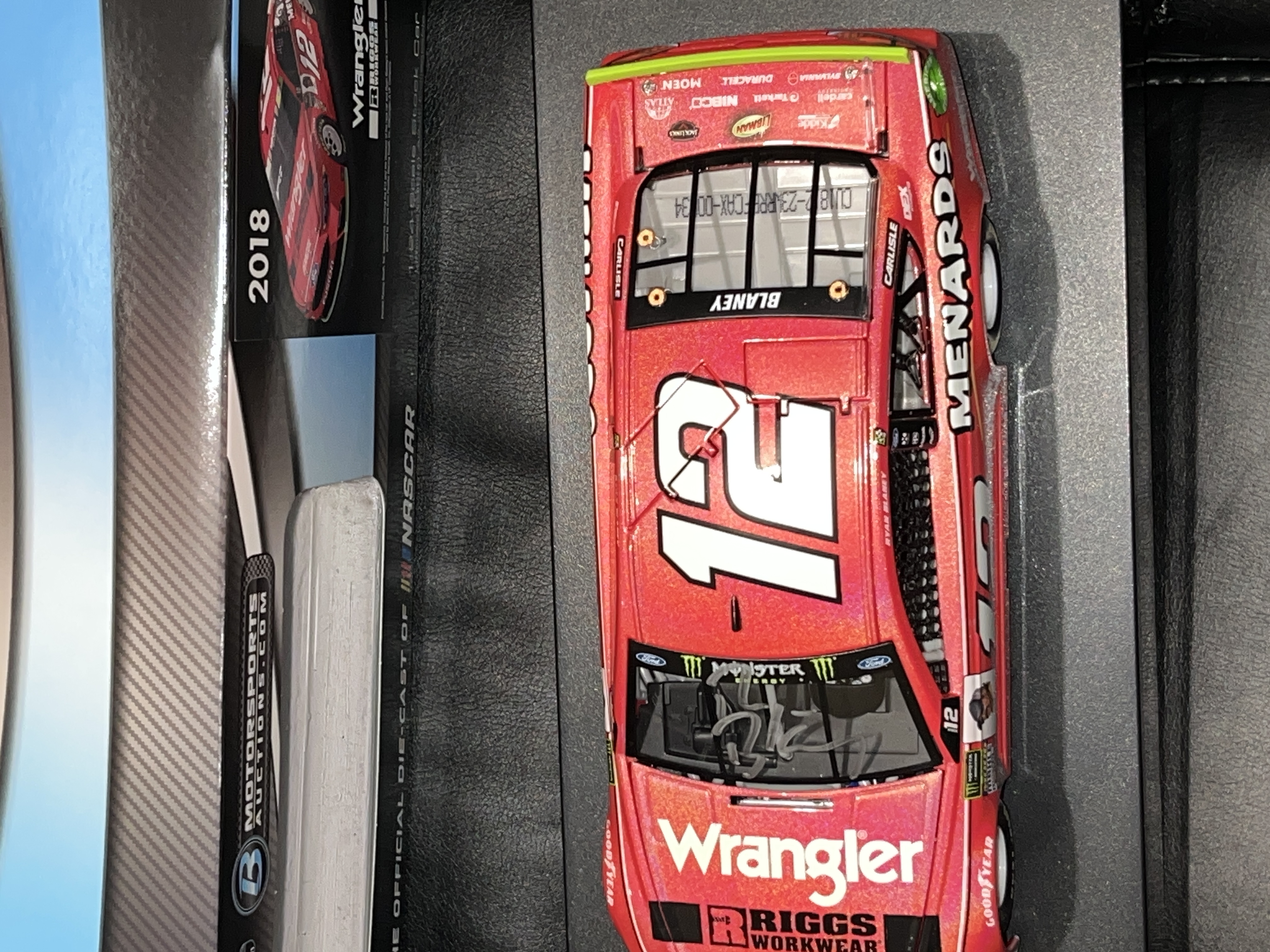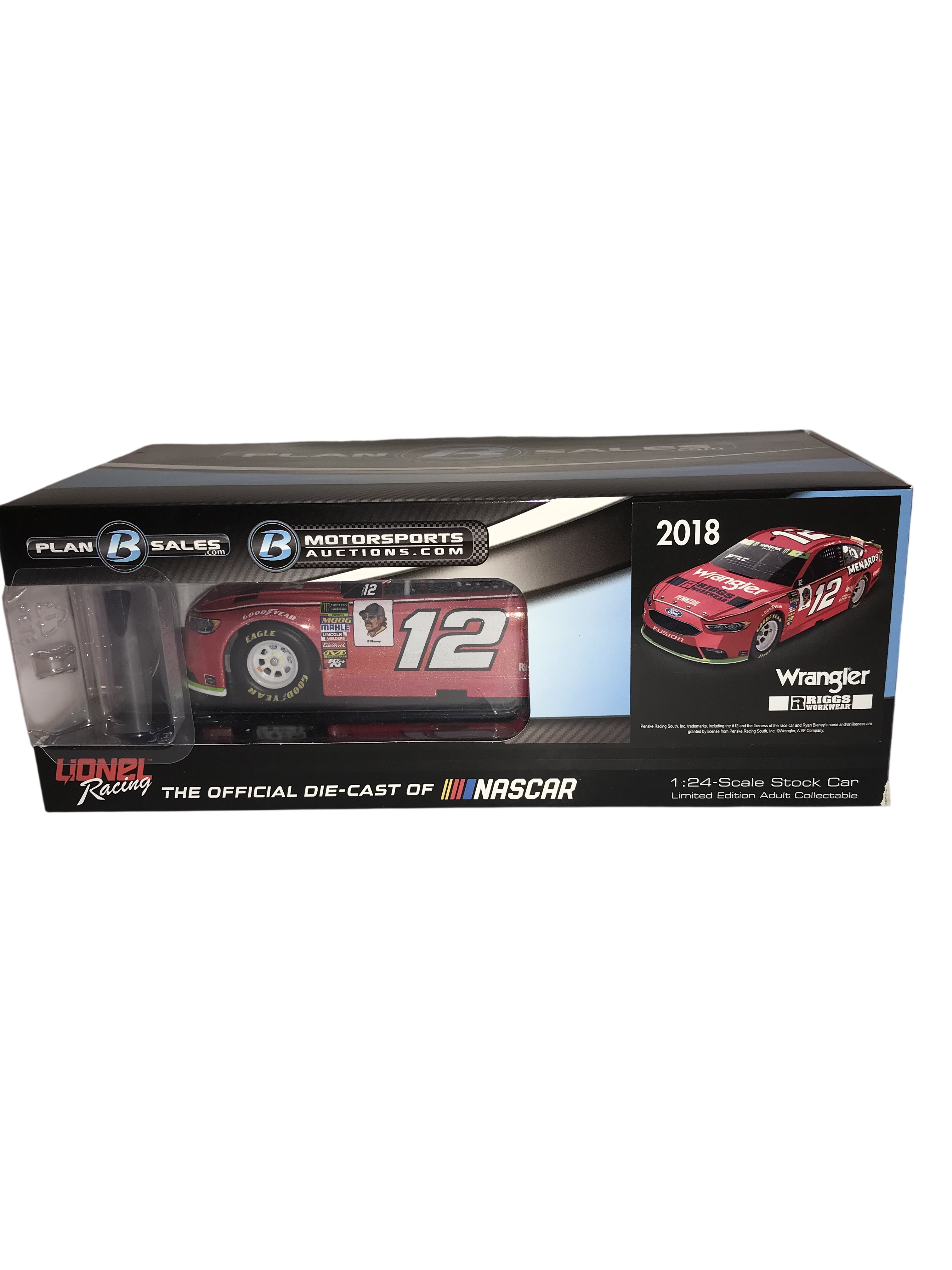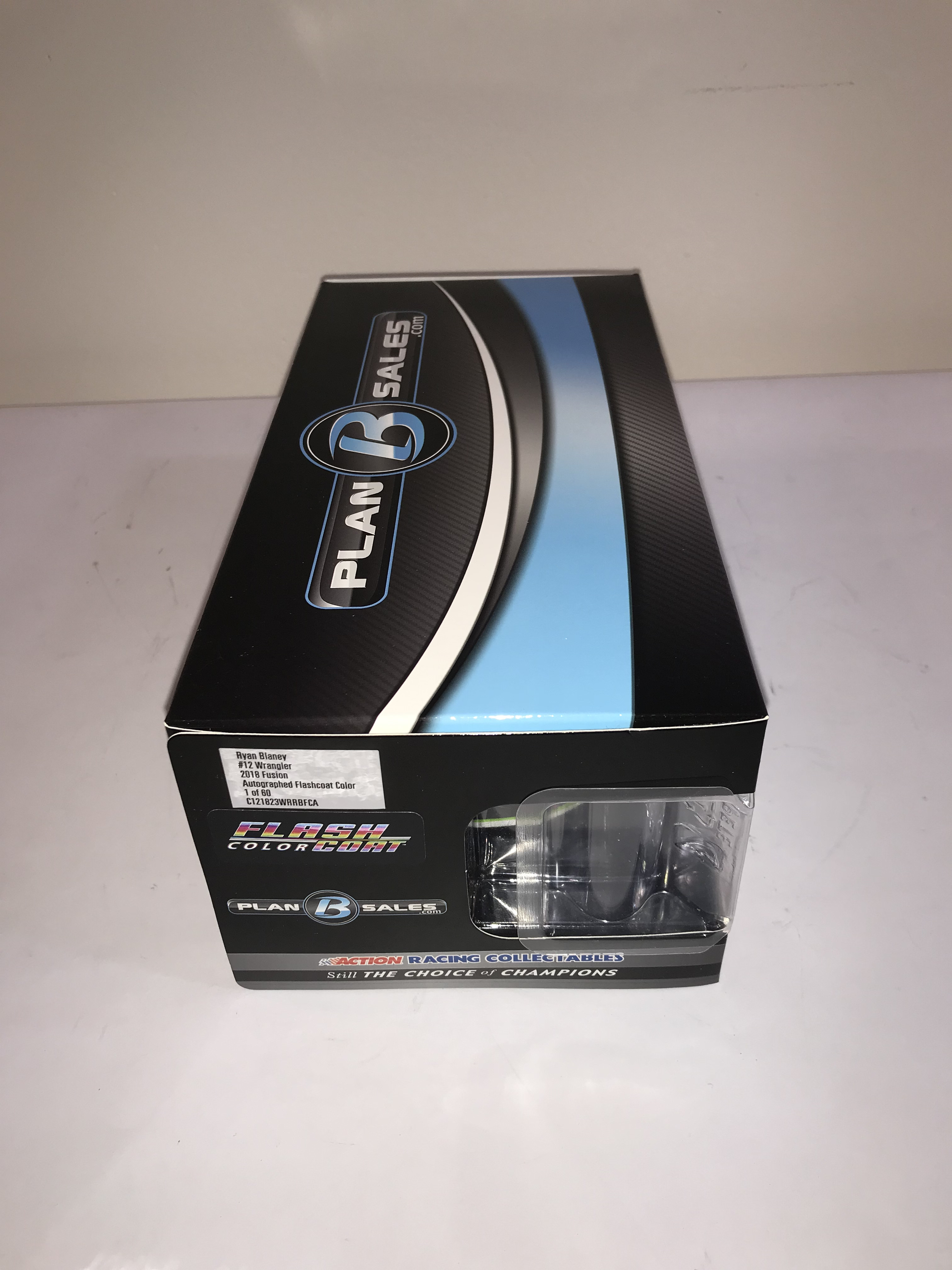 Limited Edition 1 of 60 Autographed, 1:24 scale die-cast stock car represents the 2018 Ford Fusion driven by Ryan Blaney for Team Penske. Manufactured by Lionel Racing as part of the Action Racing Collectables line, the vehicle features the Wrangler and Riggs Workwear sponsorship livery. This specific model is finished in a Flashcoat Color, which provides a metallic luster to the paint scheme. The item is contained within its original Plan B Sales branded packaging. A white adhesive label on the side of the box provides the following details: Ryan Blaney, #12 Wrangler, 2018 Fusion, Autographed Flashcoat Color