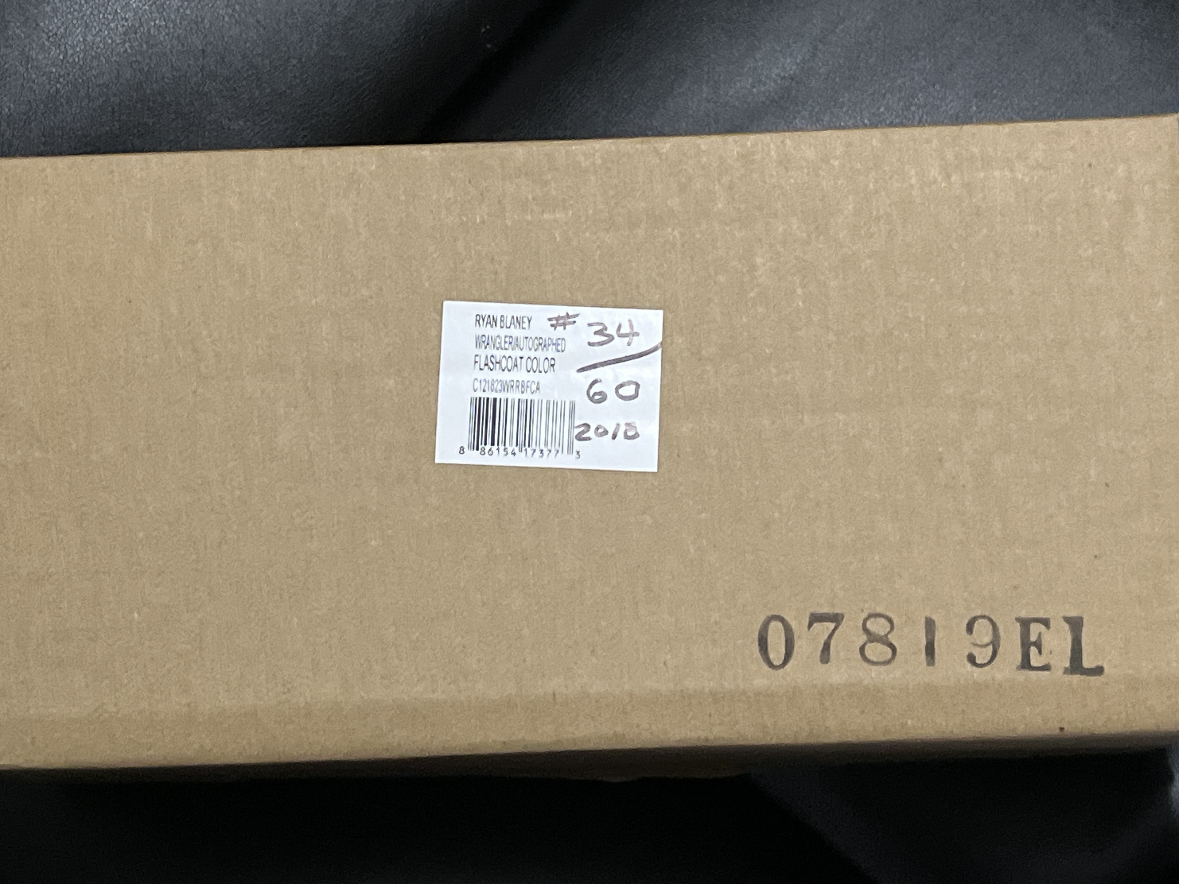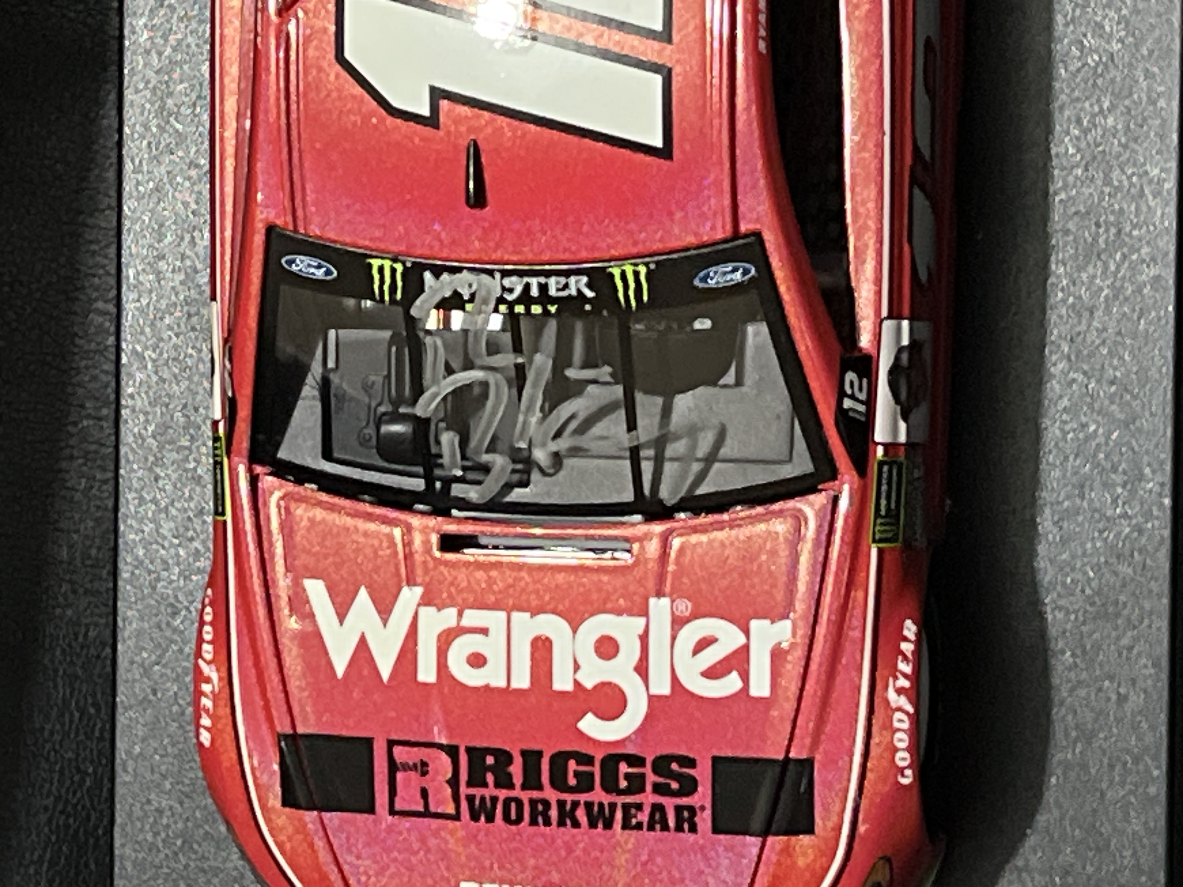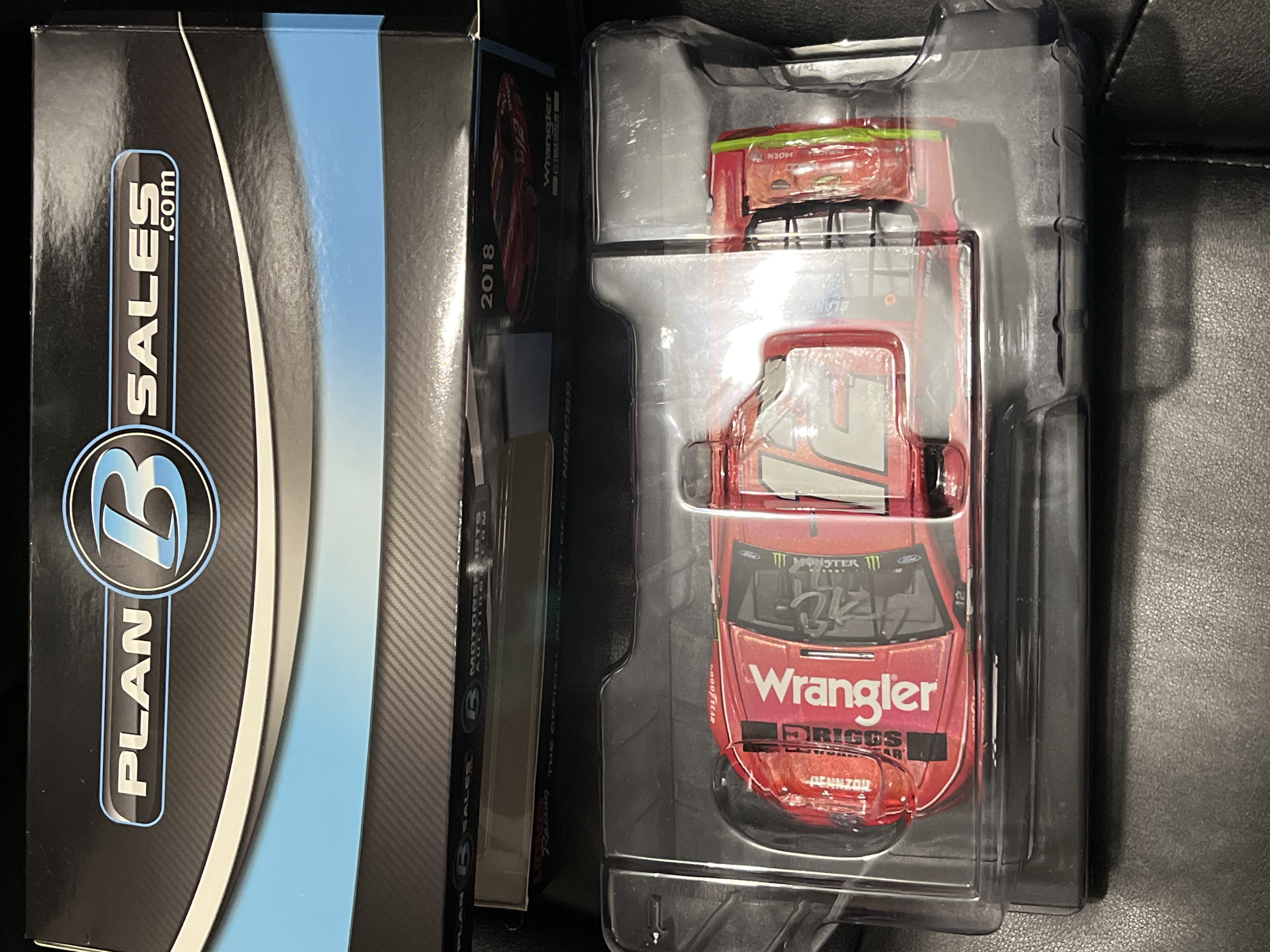 Limited Edition 1 of 60 Autographed, 1:24 scale die-cast stock car represents the 2018 Ford Fusion driven by Ryan Blaney for Team Penske. Manufactured by Lionel Racing as part of the Action Racing Collectables line, the vehicle features the Wrangler and Riggs Workwear sponsorship livery. This specific model is finished in a Flashcoat Color, which provides a metallic luster to the paint scheme. The item is contained within its original Plan B Sales branded packaging. A white adhesive label on the side of the box provides the following details: Ryan Blaney, #12 Wrangler, 2018 Fusion, Autographed Flashcoat Color