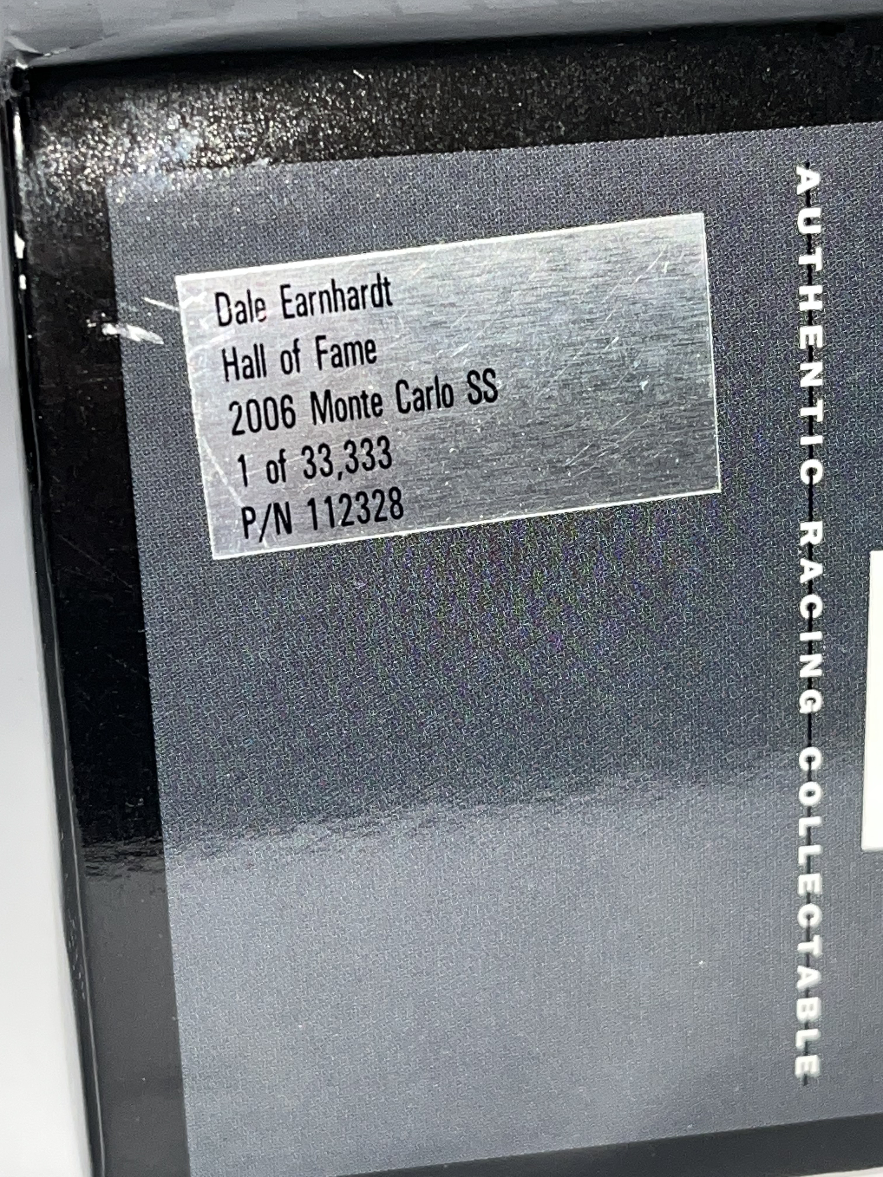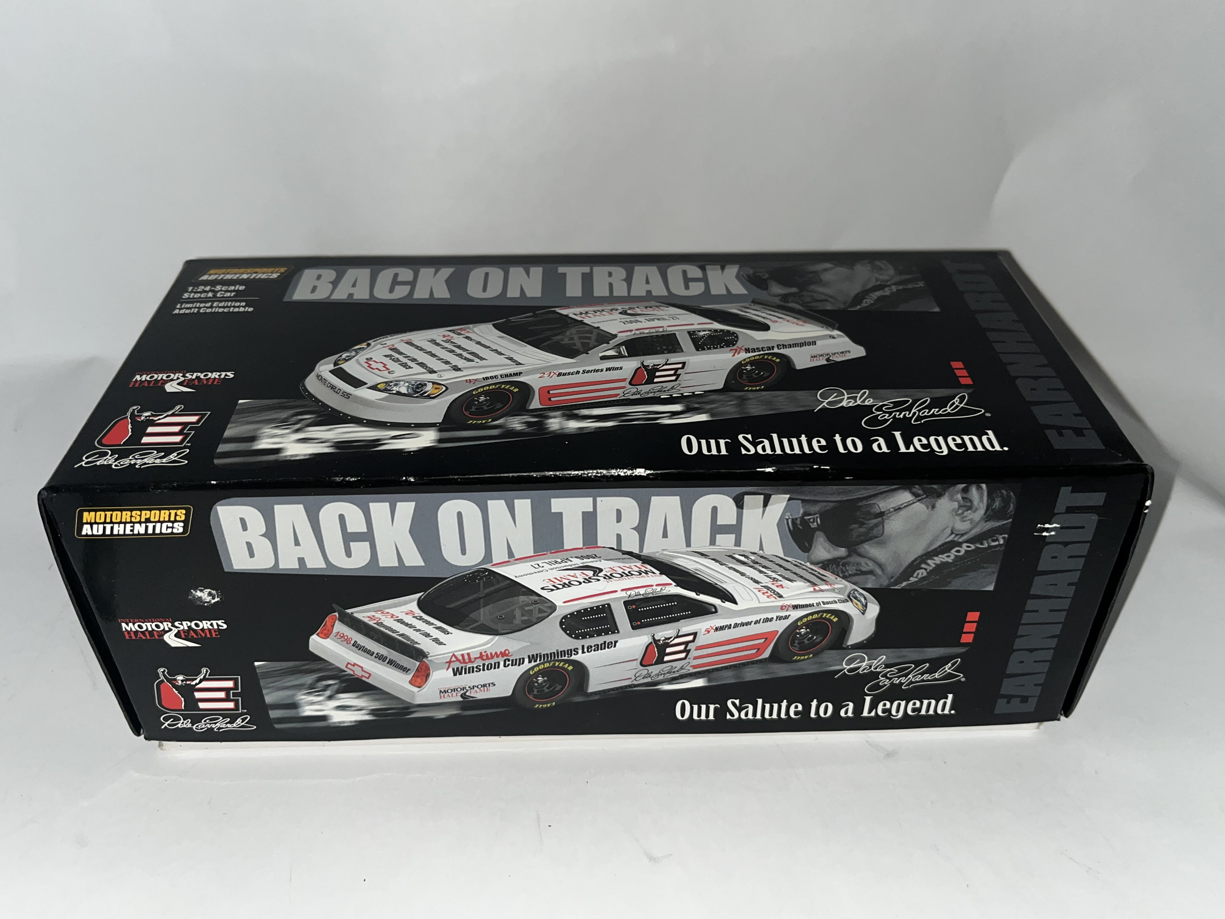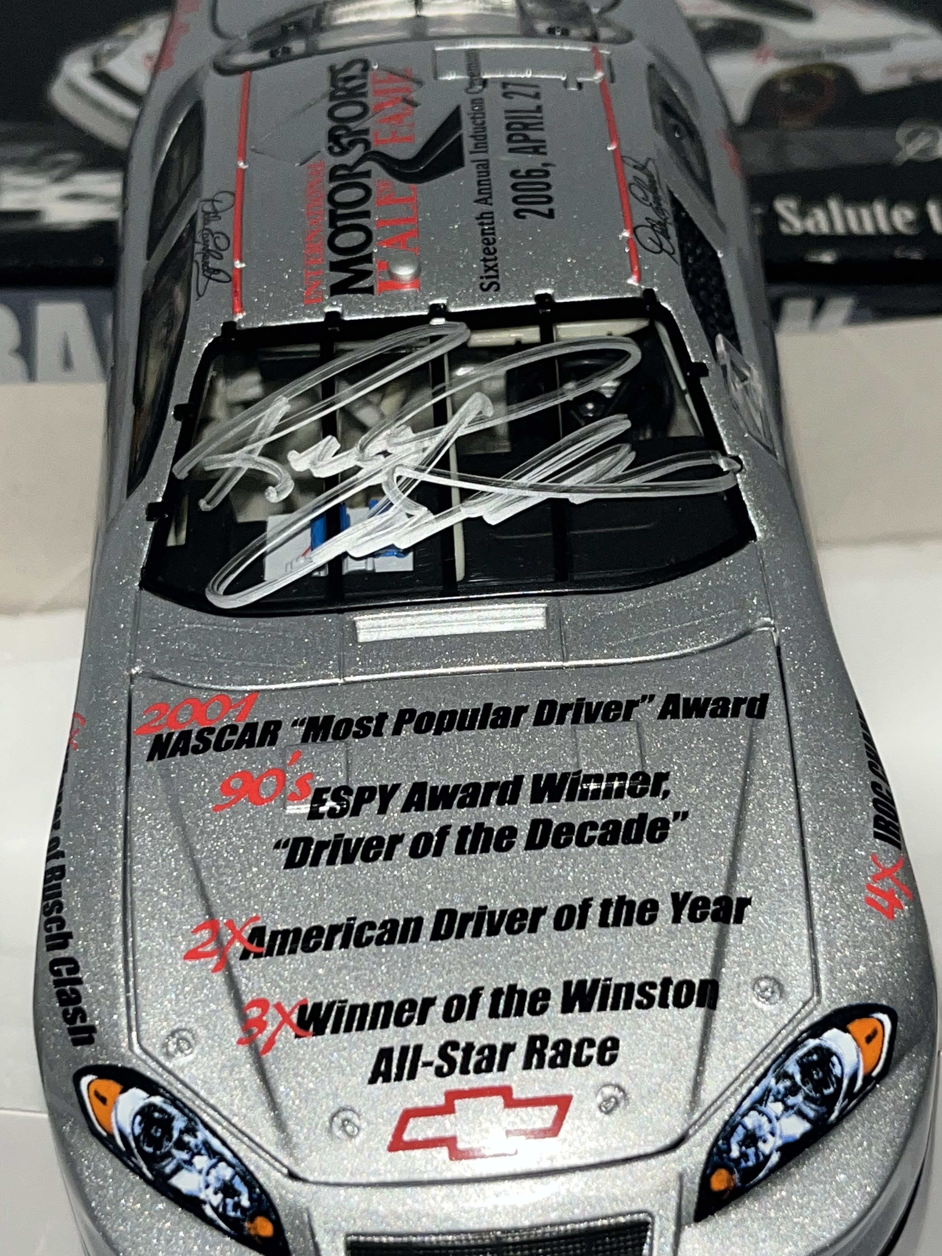 A 1:24 scale die-cast model of a Chevrolet Monte Carlo SS manufactured by Motorsports Authentics. This vehicle is part of the Back on Track series titled Our Salute to a Legend, produced to commemorate the induction of Dale Earnhardt Sr. into the International Motorsports Hall of Fame on April 27, 2006. The front windshield bears a hand-signed signature in silver paint pen attributed to Dale Earnhardt Jr.
