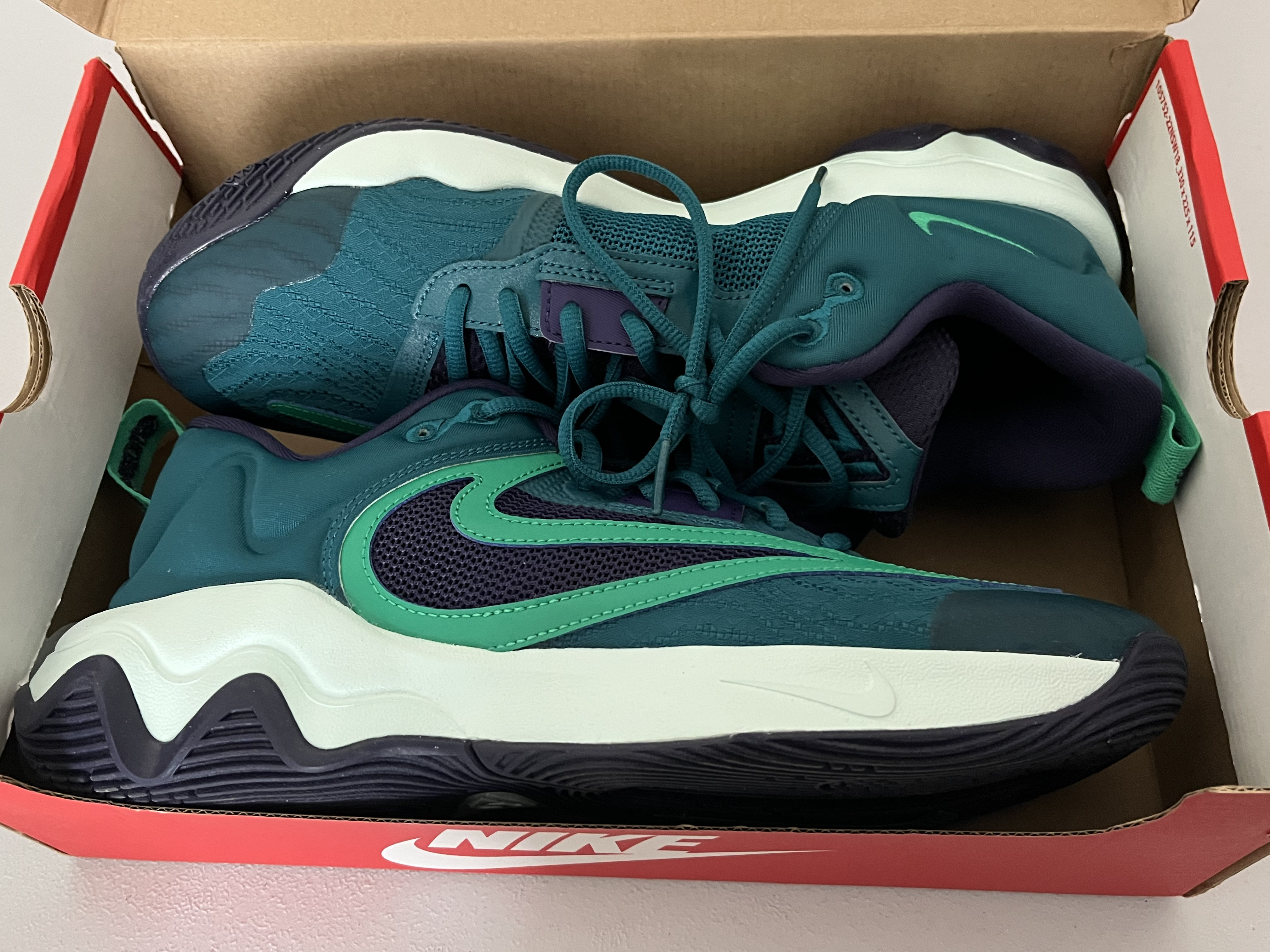 Nike, Giannis Immortality 3, synthetic mesh and textile, Geode Teal and Purple with light green accents. Size 10.5