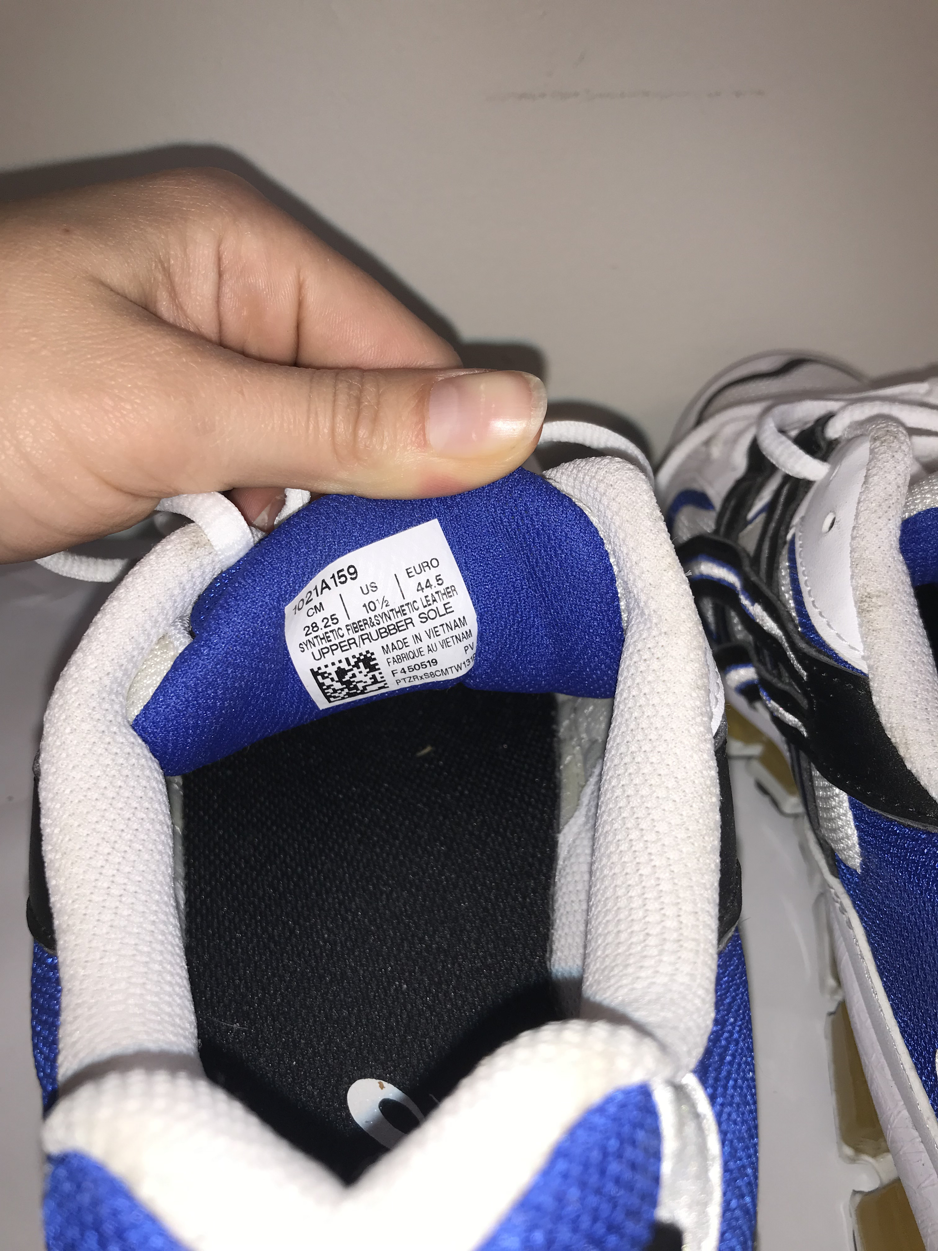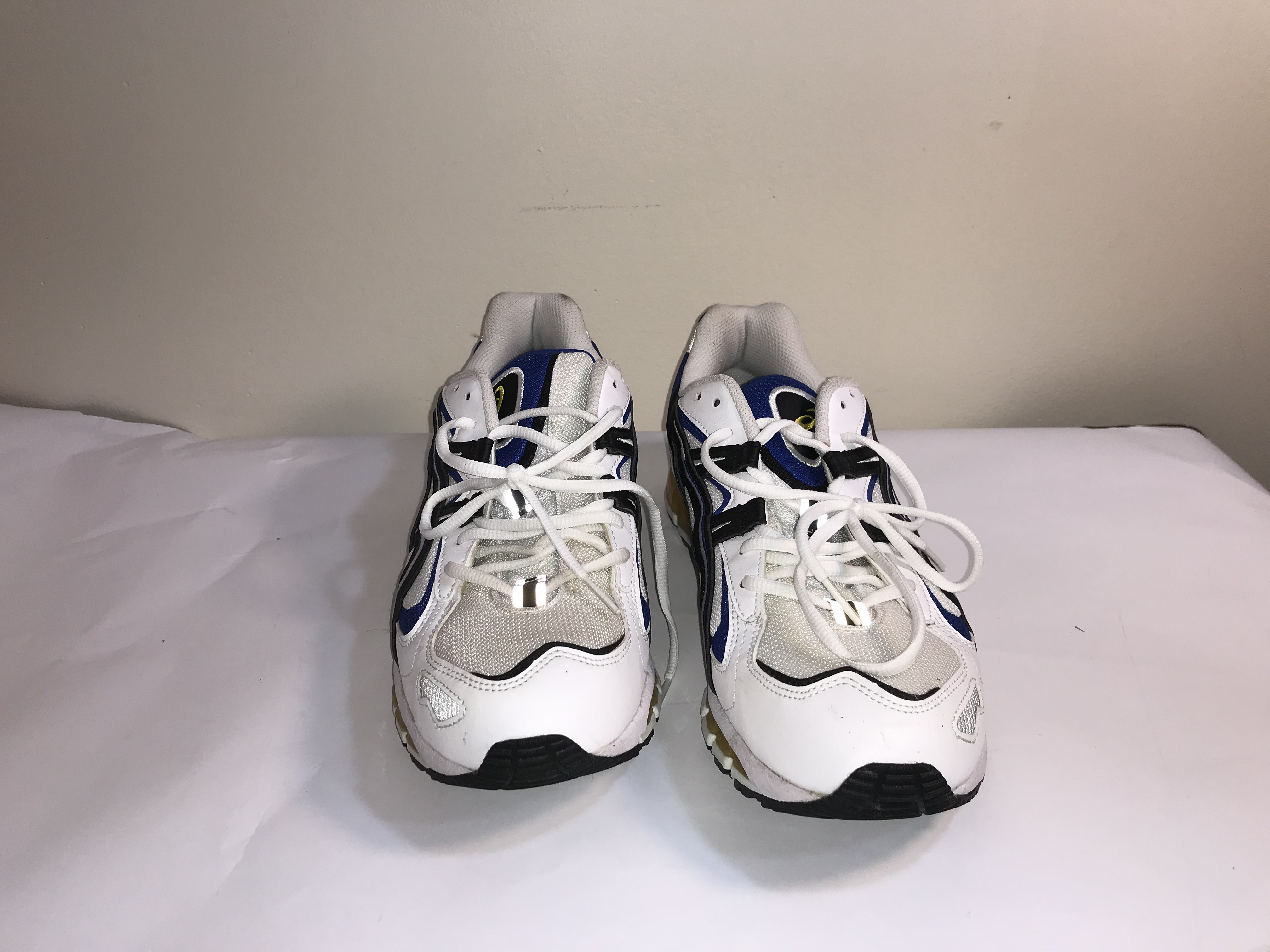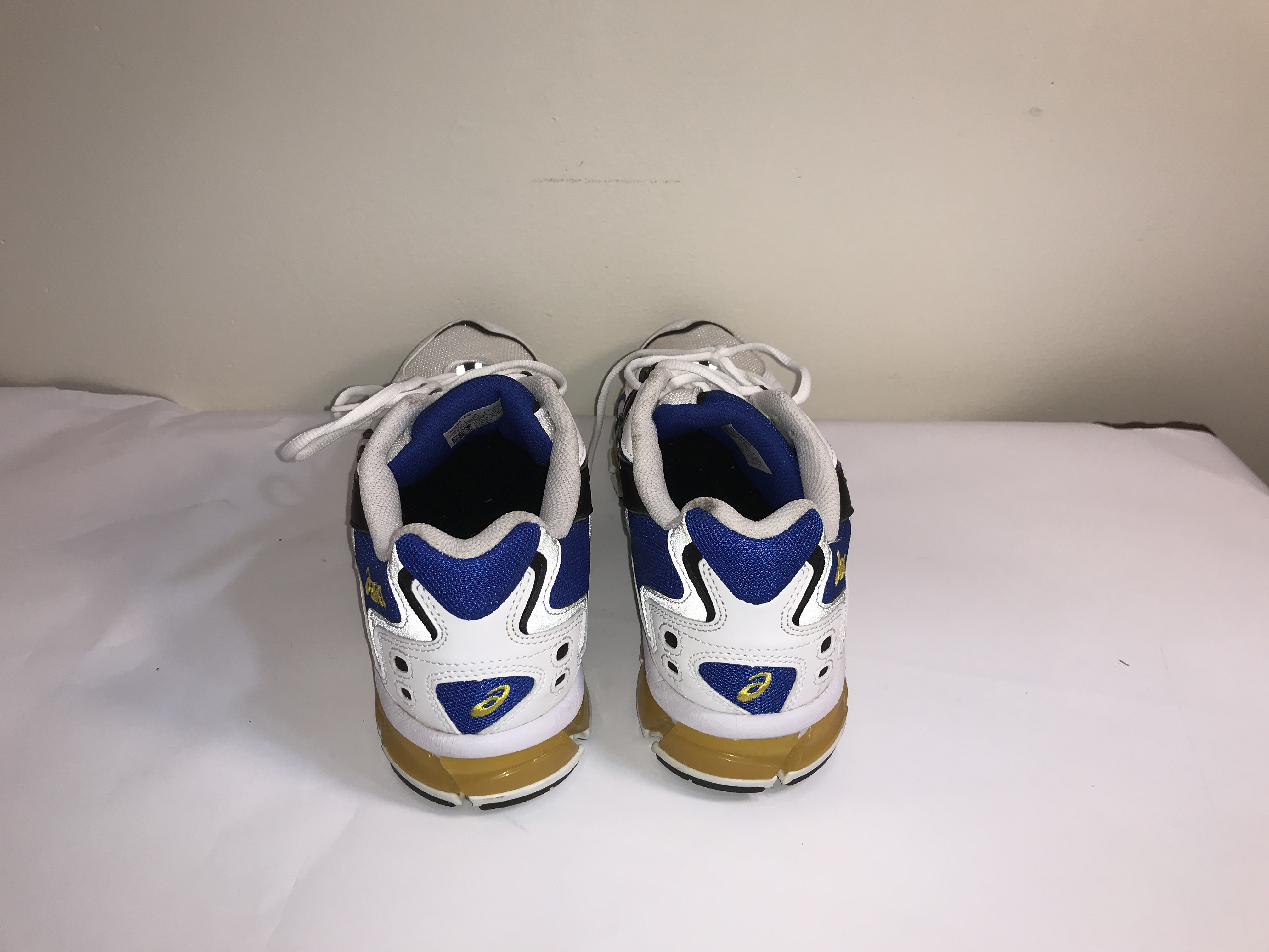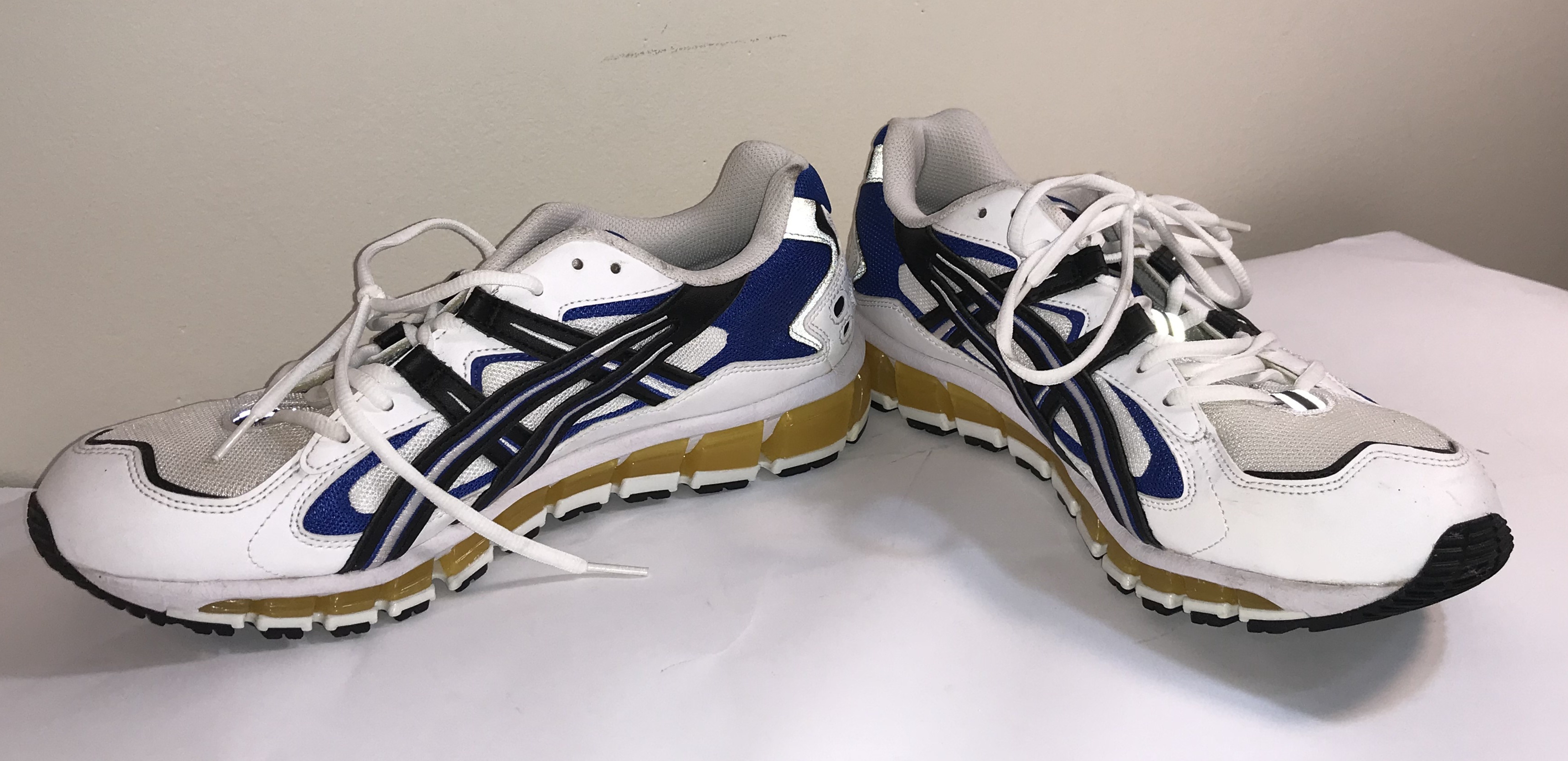 This lot features a pair of ASICS Gel-Kayano 5 360 running shoes, a hybrid model that blends the heritage aesthetic of the 1990s Gel-Kayano 5 upper with modern GEL-Quantum 360 sole technology. The colorway consists of a white mesh base with synthetic leather overlays in white, black, and royal blue. The midsole is characterized by 360 degrees of visible GEL technology cushioning in a metallic gold-yellow finish, designed for high-level shock absorption. The shoes feature the signature ASICS graphic logo on the lateral and medial sides and are finished with a black rubber outsole. These are standard retail athletic shoes and do not include any player signatures, team-specific markings, or evidence of professional game-worn use. No certificate of authenticity or provenance is provided.