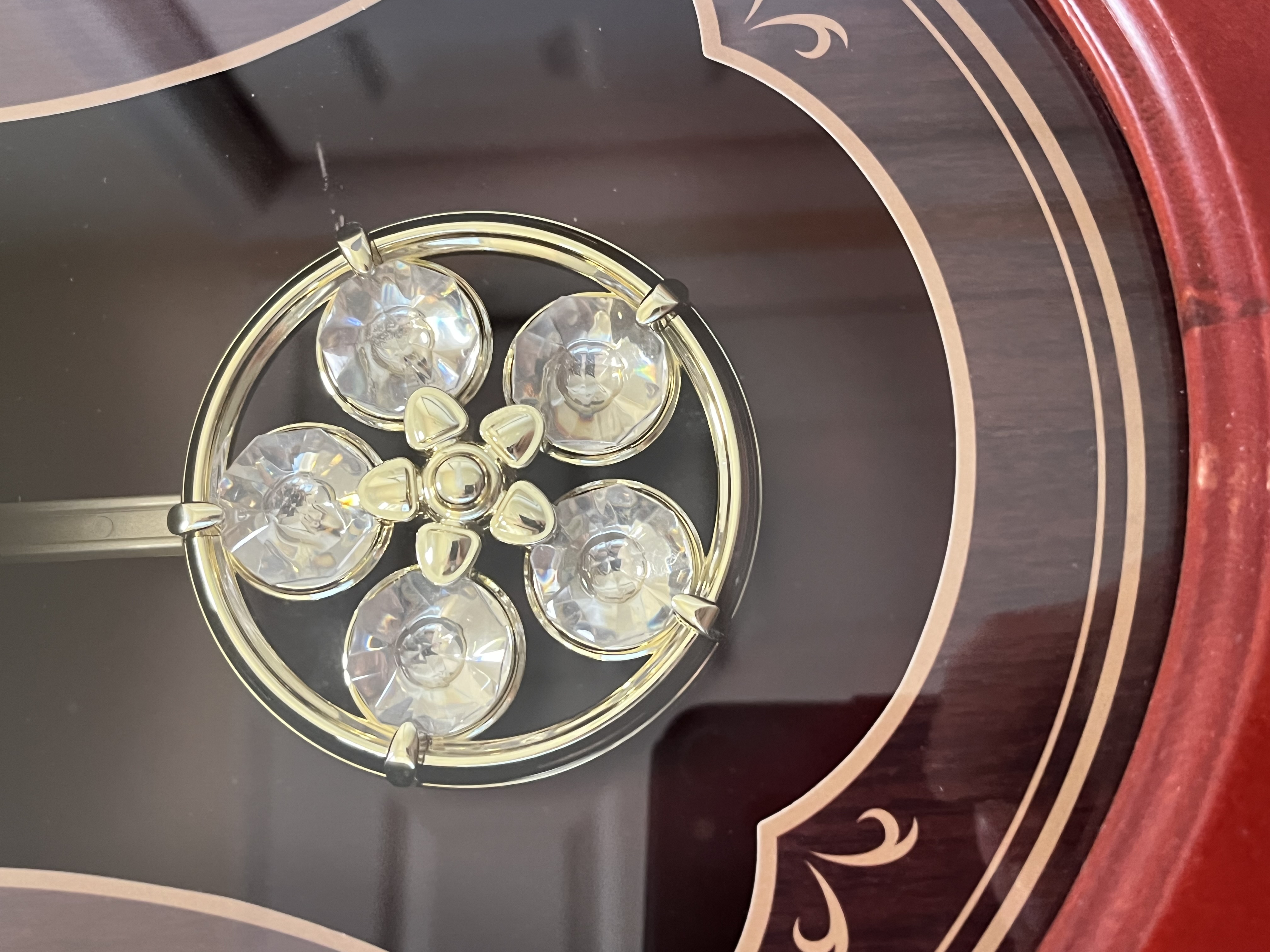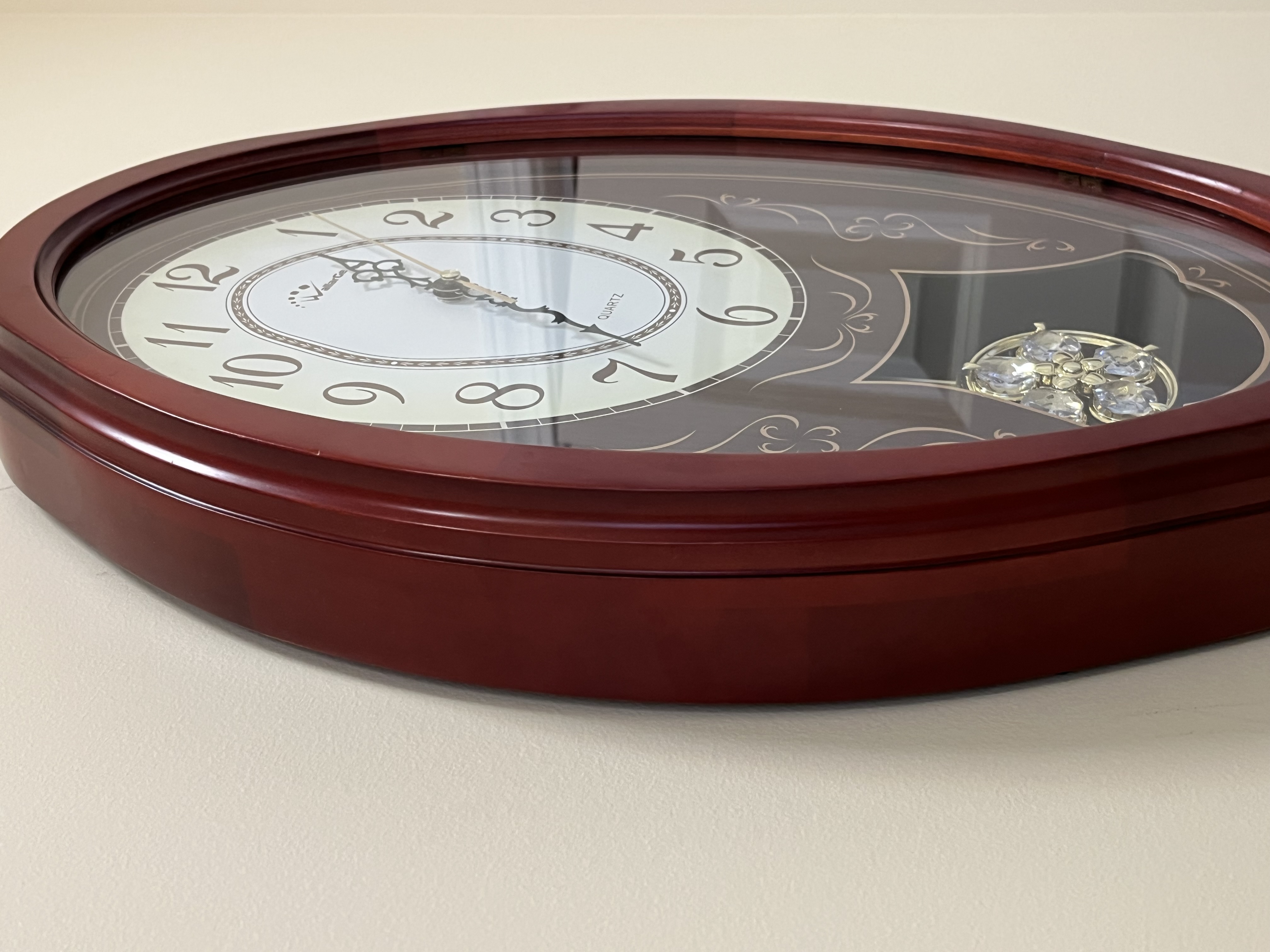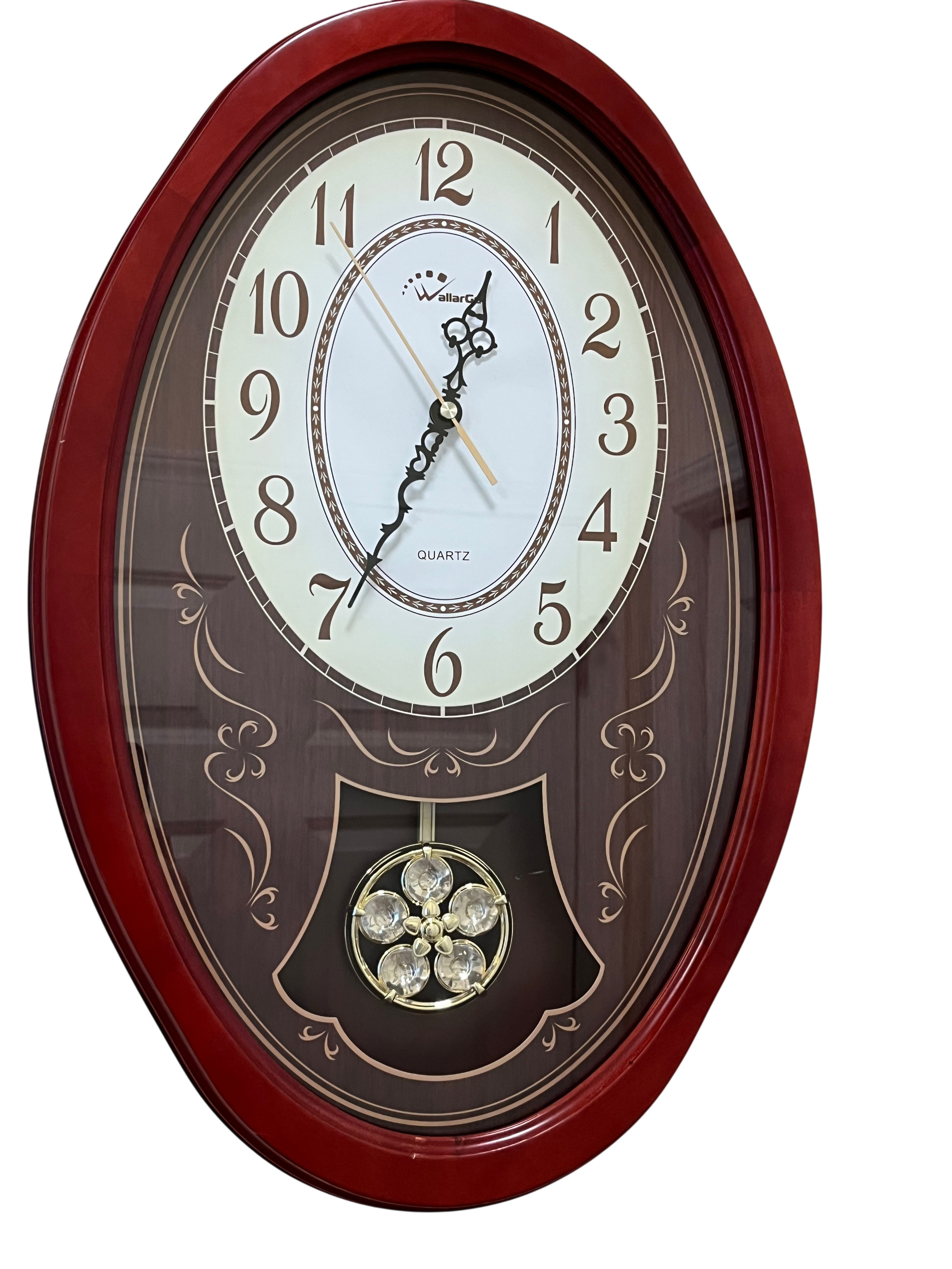 A contemporary oval-shaped quartz wall clock by WallarGe featuring a cherry-finish composite frame and a glass face. The dial displays a white oval center with stylized brown Arabic numerals, ornate black metal hour and minute hands, and a gold-tone sweep second hand. The dark brown decorative background is accented with gold-toned scrollwork and contains a visible swinging pendulum set with five clear faceted faux-crystals in a floral arrangement. Dimensions: Approximately 17.5 inches height by 13 inches width.