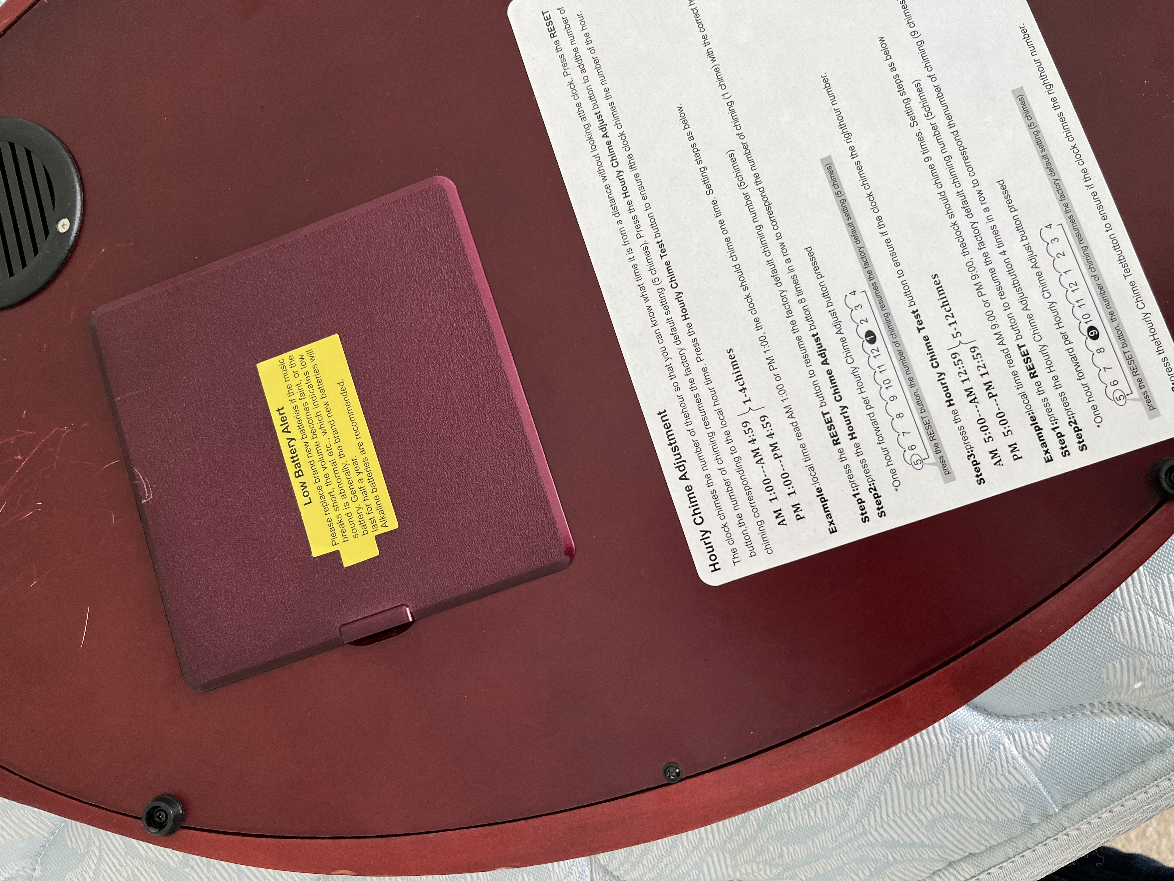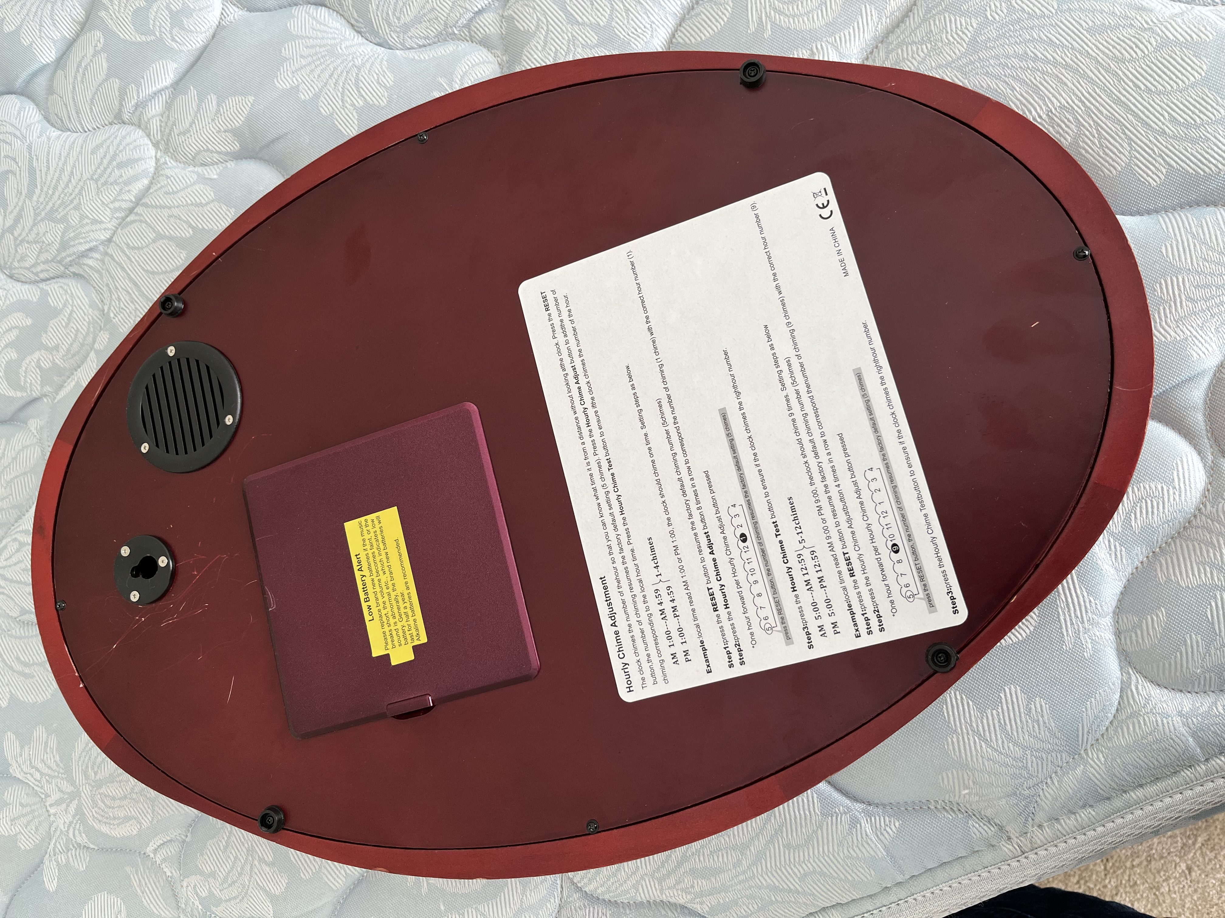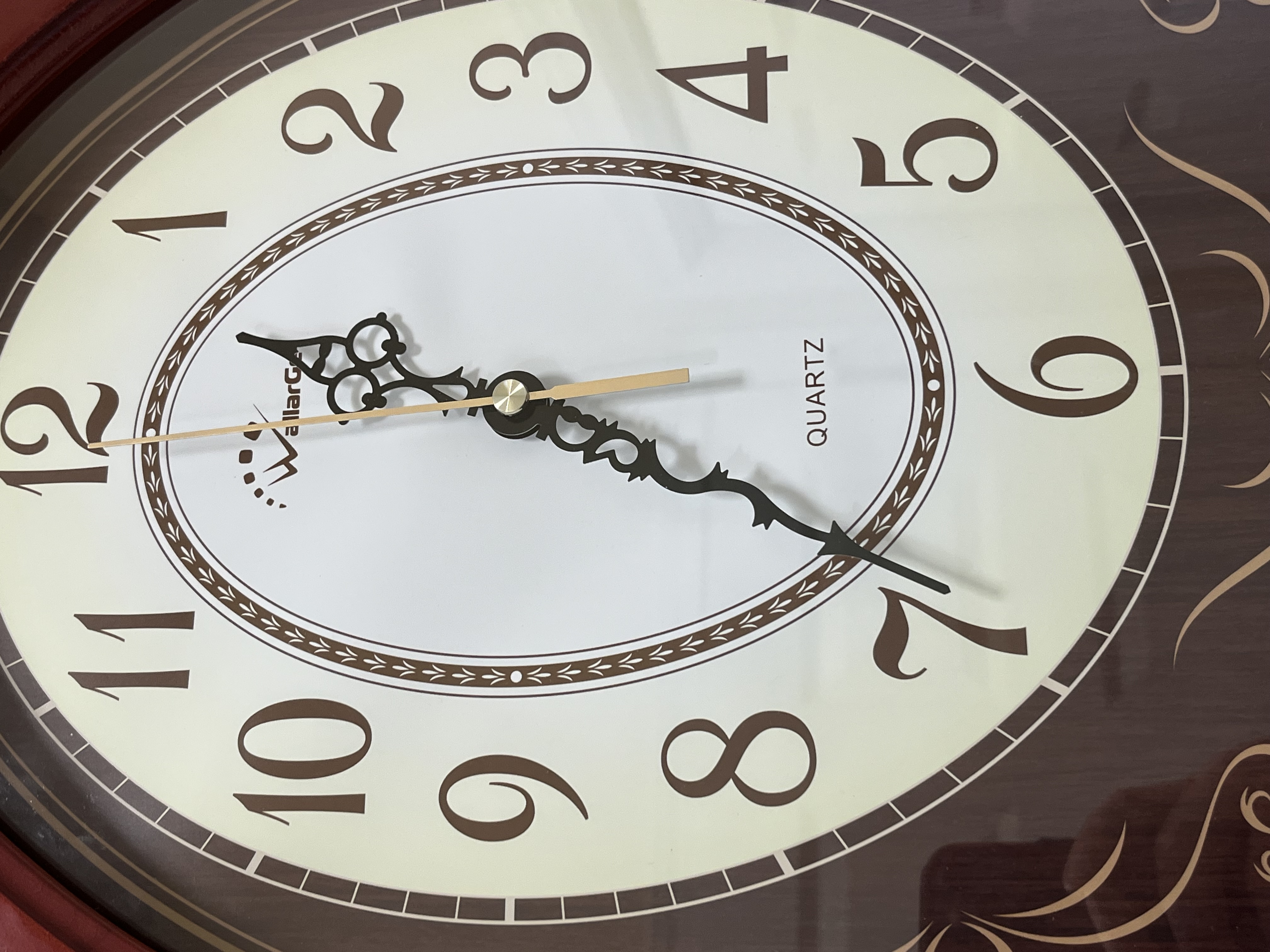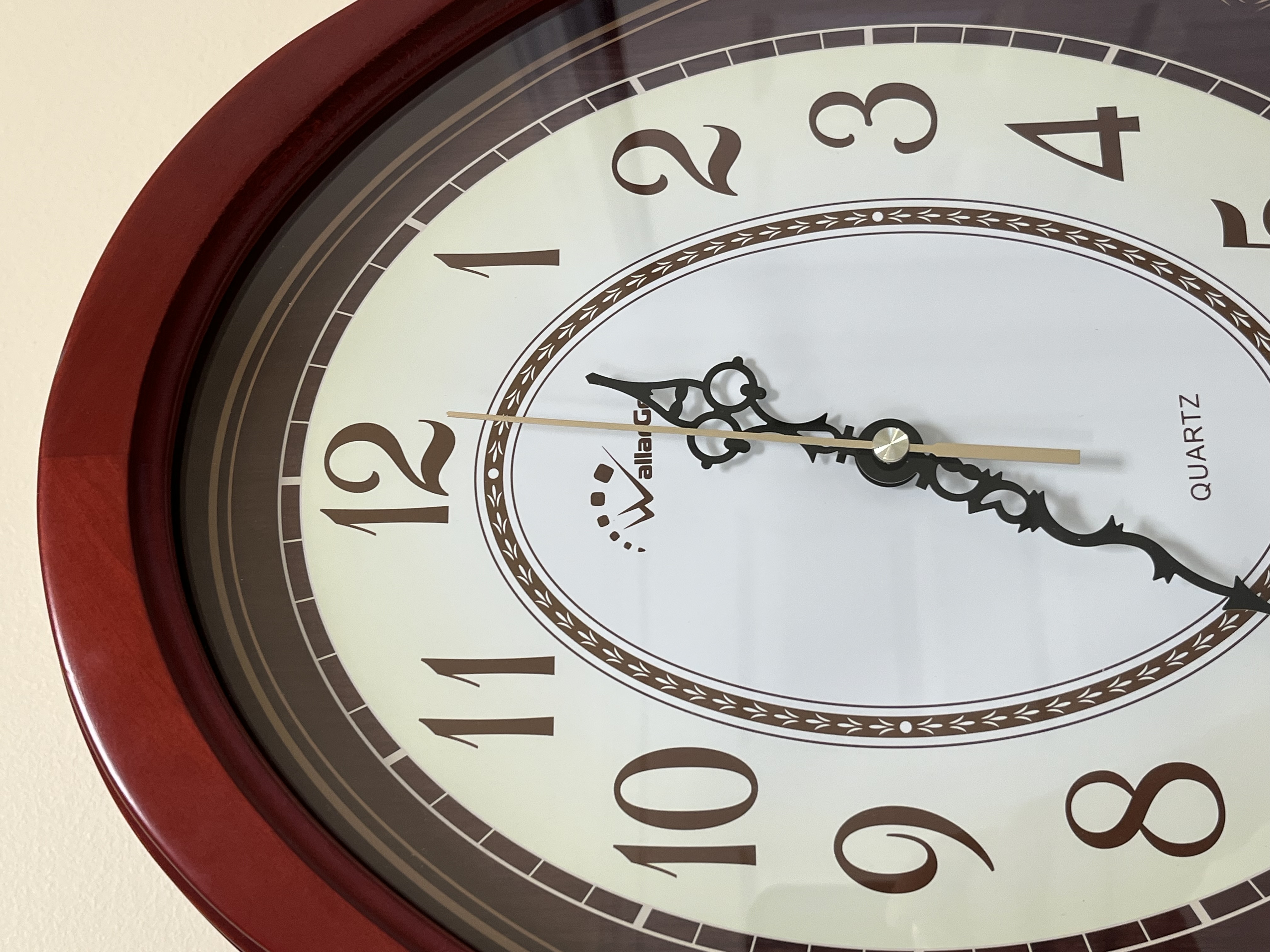 A contemporary oval-shaped quartz wall clock by WallarGe featuring a cherry-finish composite frame and a glass face. The dial displays a white oval center with stylized brown Arabic numerals, ornate black metal hour and minute hands, and a gold-tone sweep second hand. The dark brown decorative background is accented with gold-toned scrollwork and contains a visible swinging pendulum set with five clear faceted faux-crystals in a floral arrangement. Dimensions: Approximately 17.5 inches height by 13 inches width.