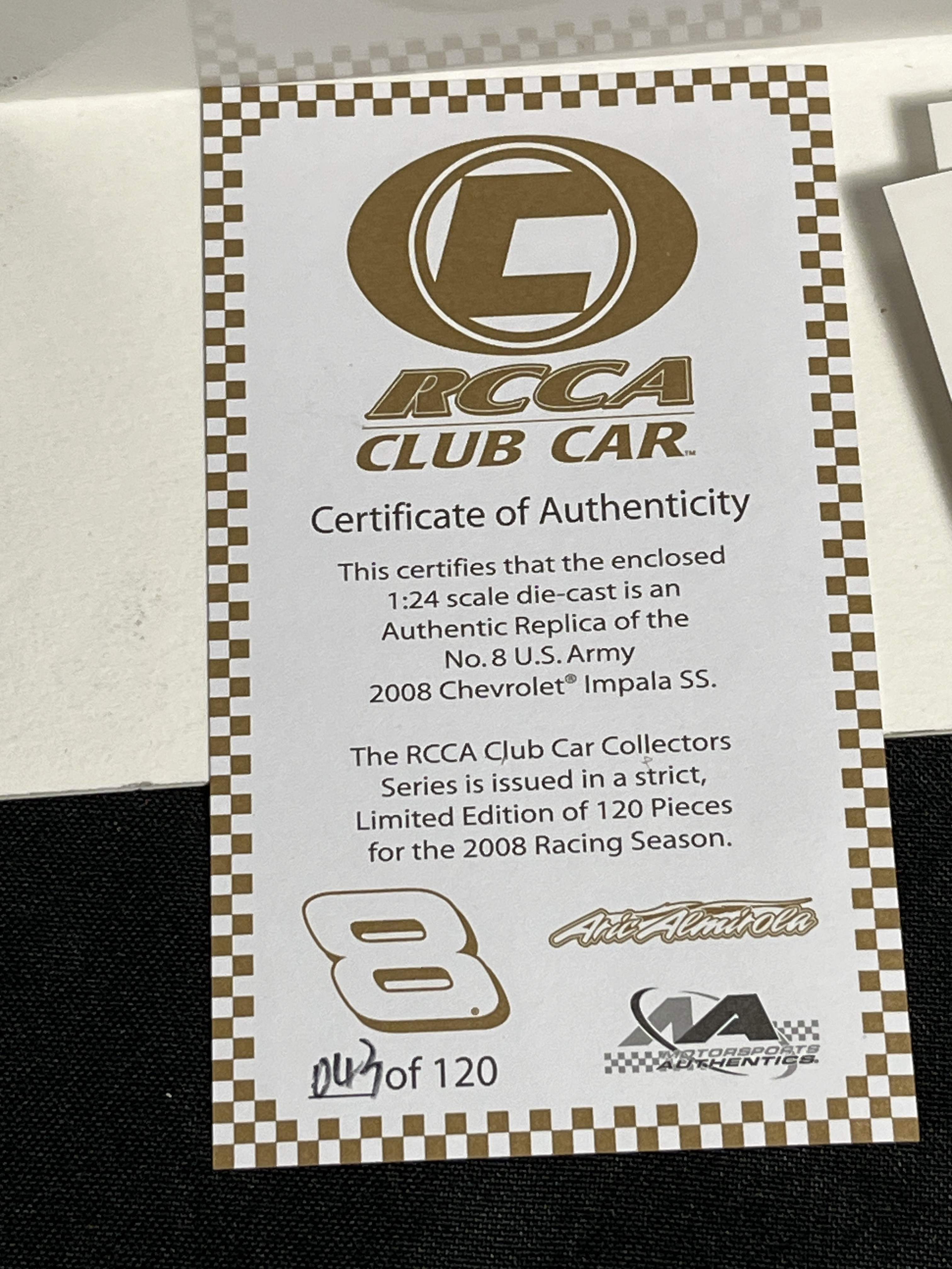 US Army Chevy Impala limited edition, with certificate of authenticity, Club Car, Aric Almirola 1:24 scale diecast in org box