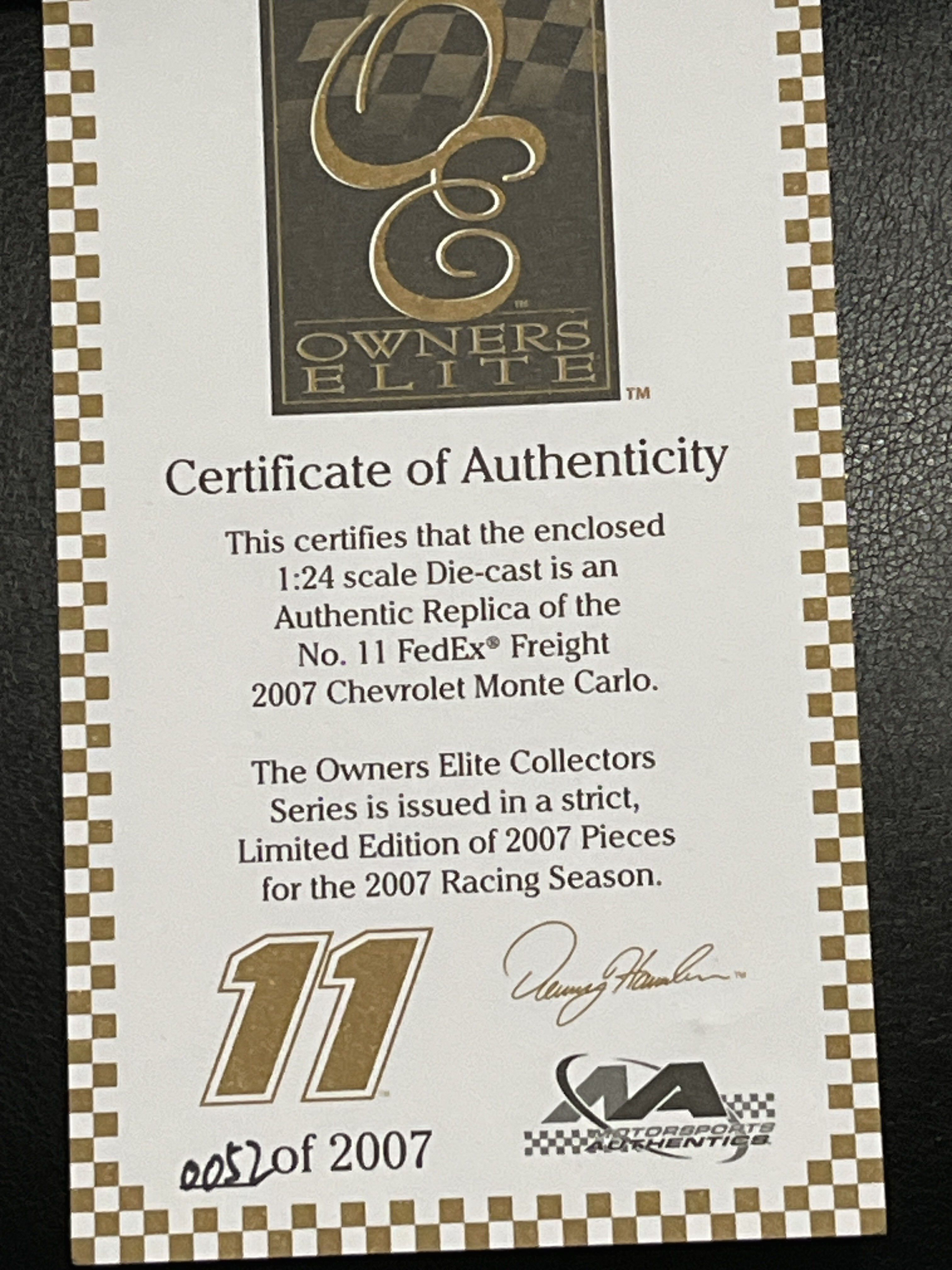 Limited Edition #11 FedEx freight, 1:24 scale die cast in org box, with certificate of authenticity, #0052 of 2007