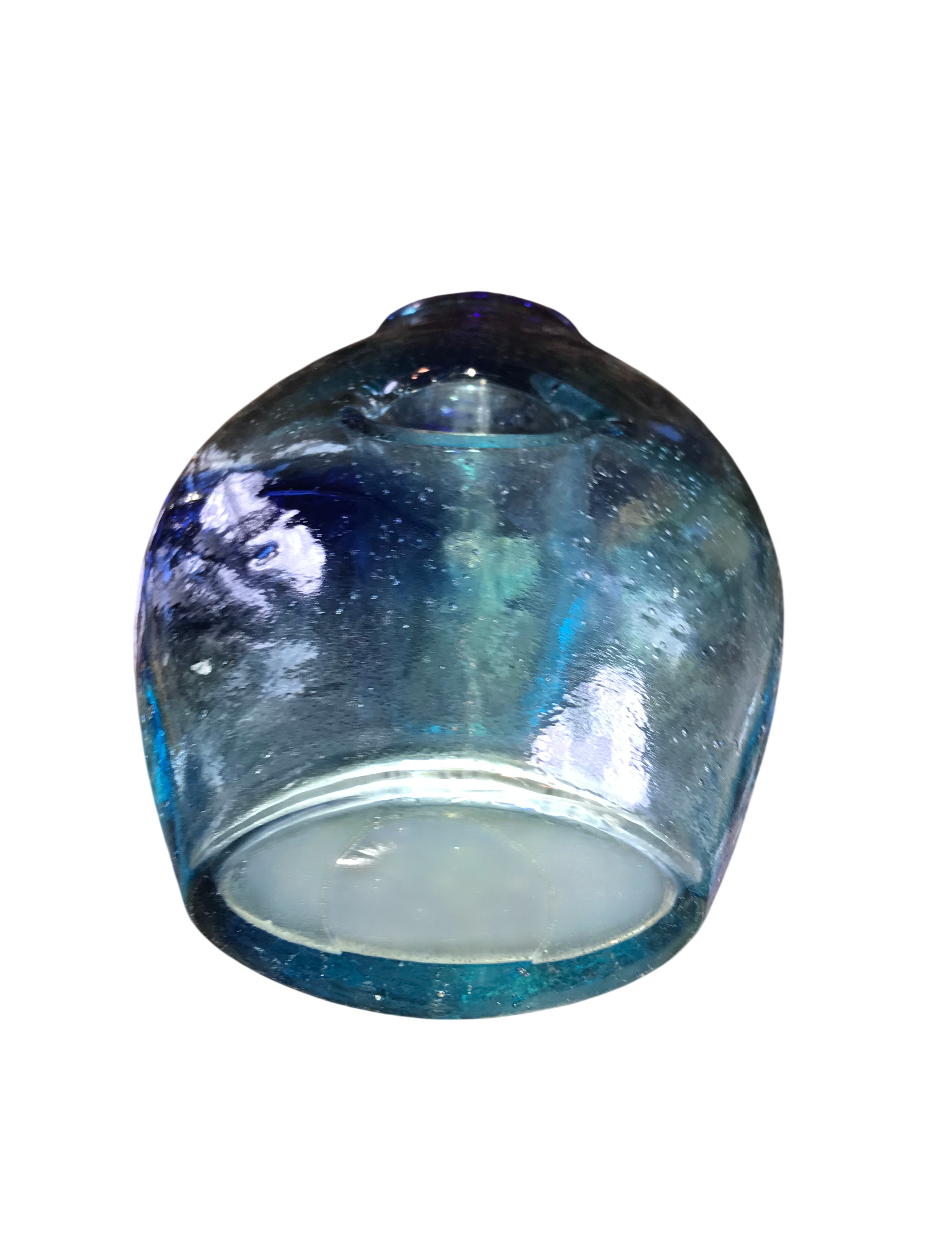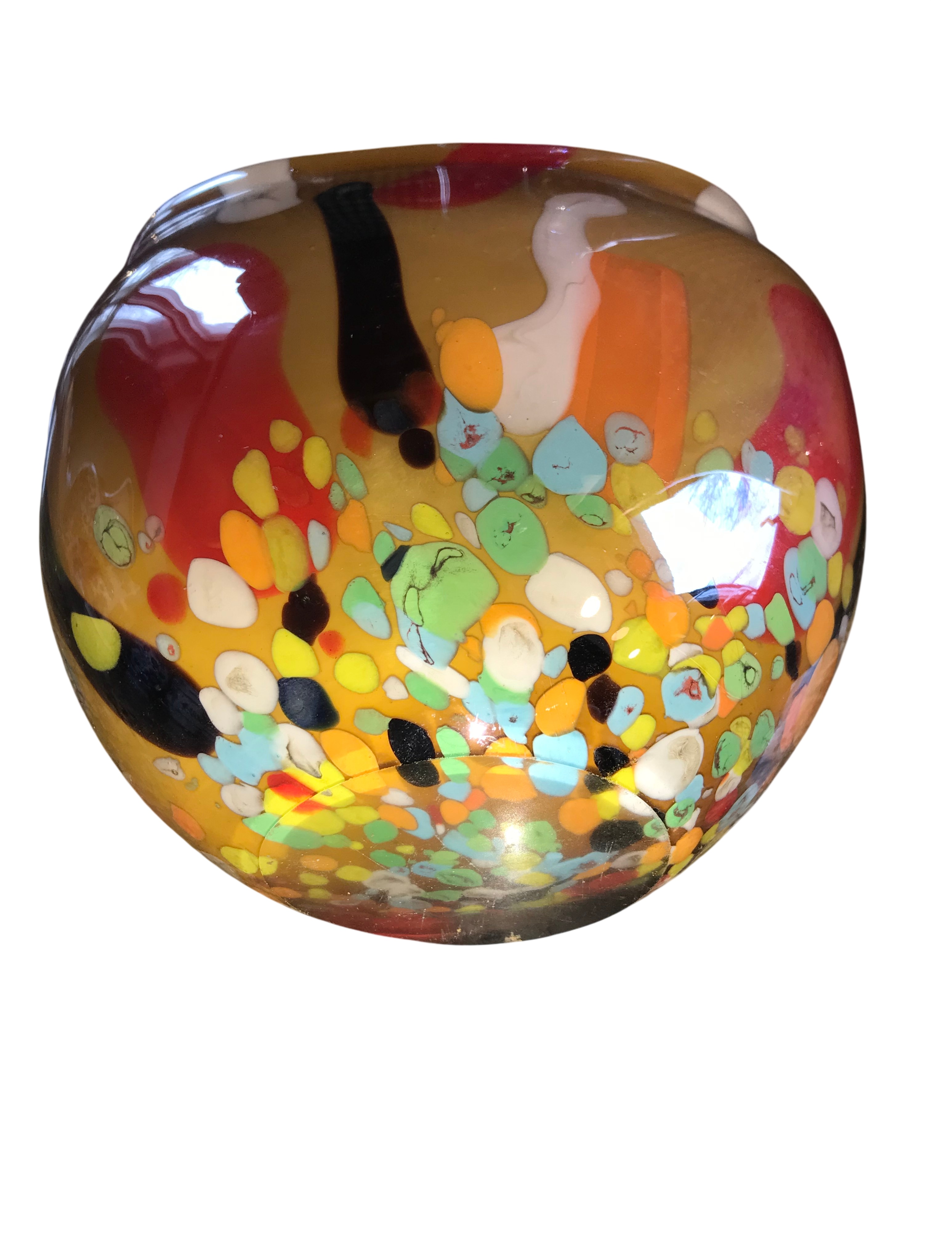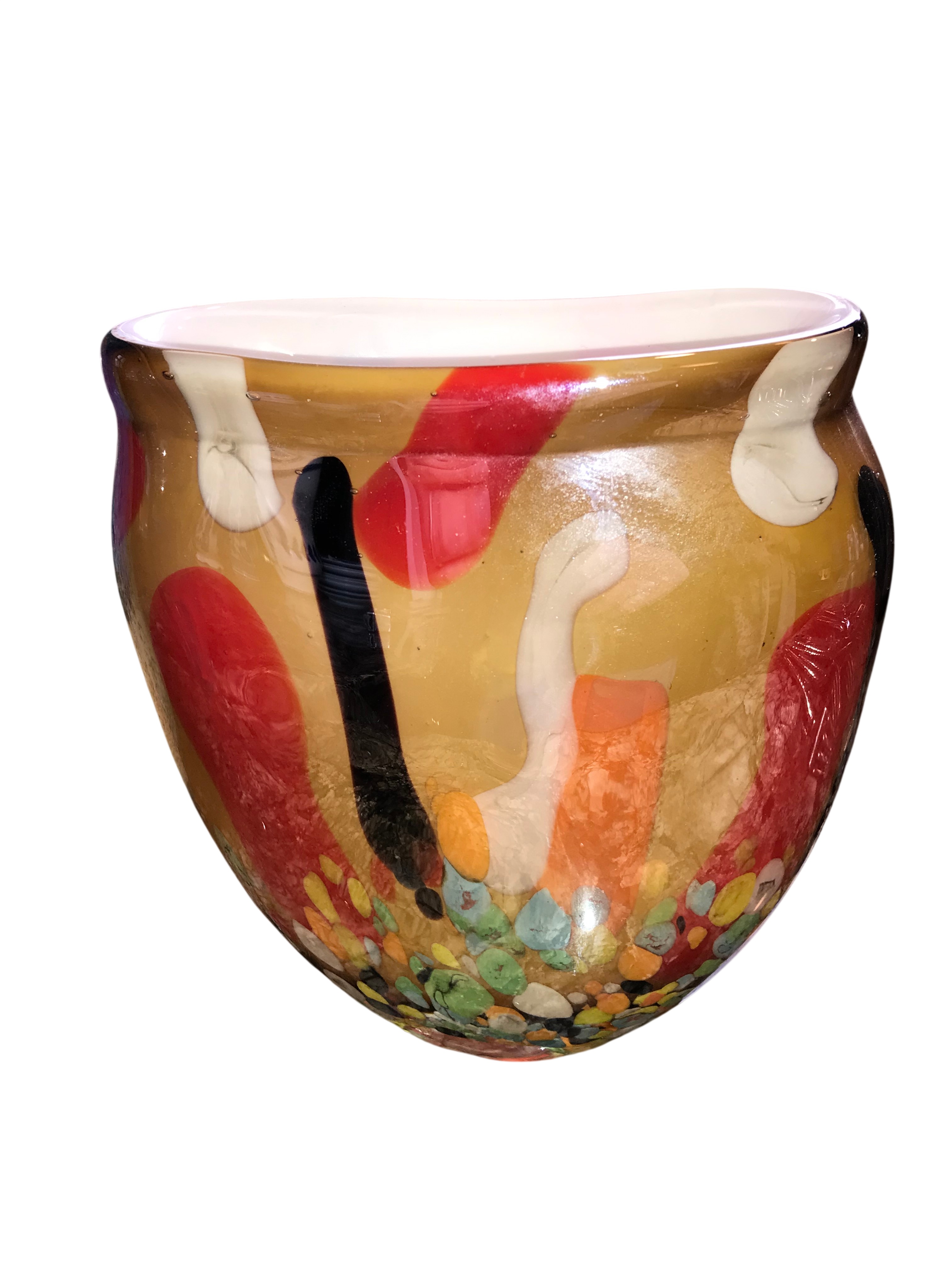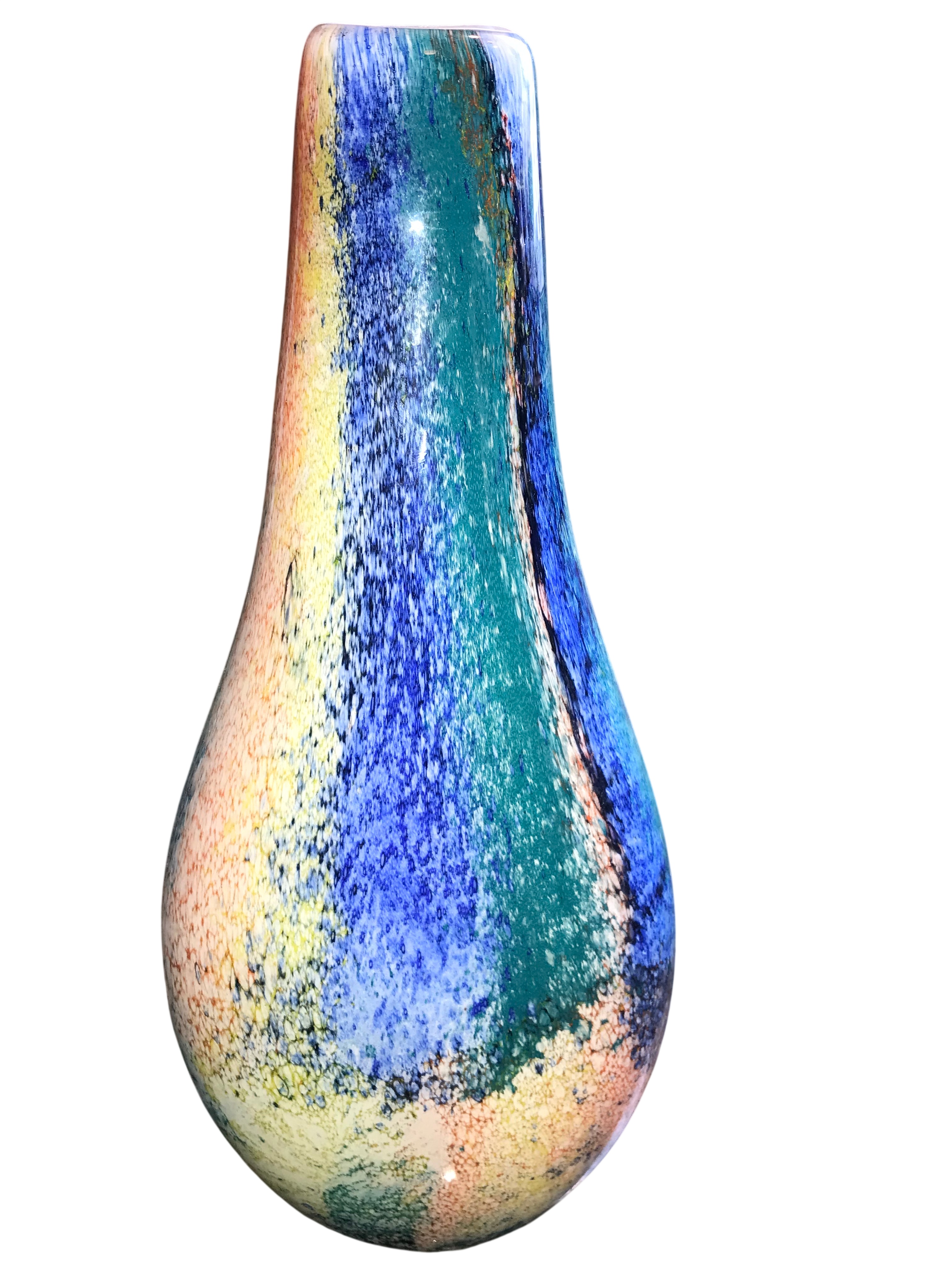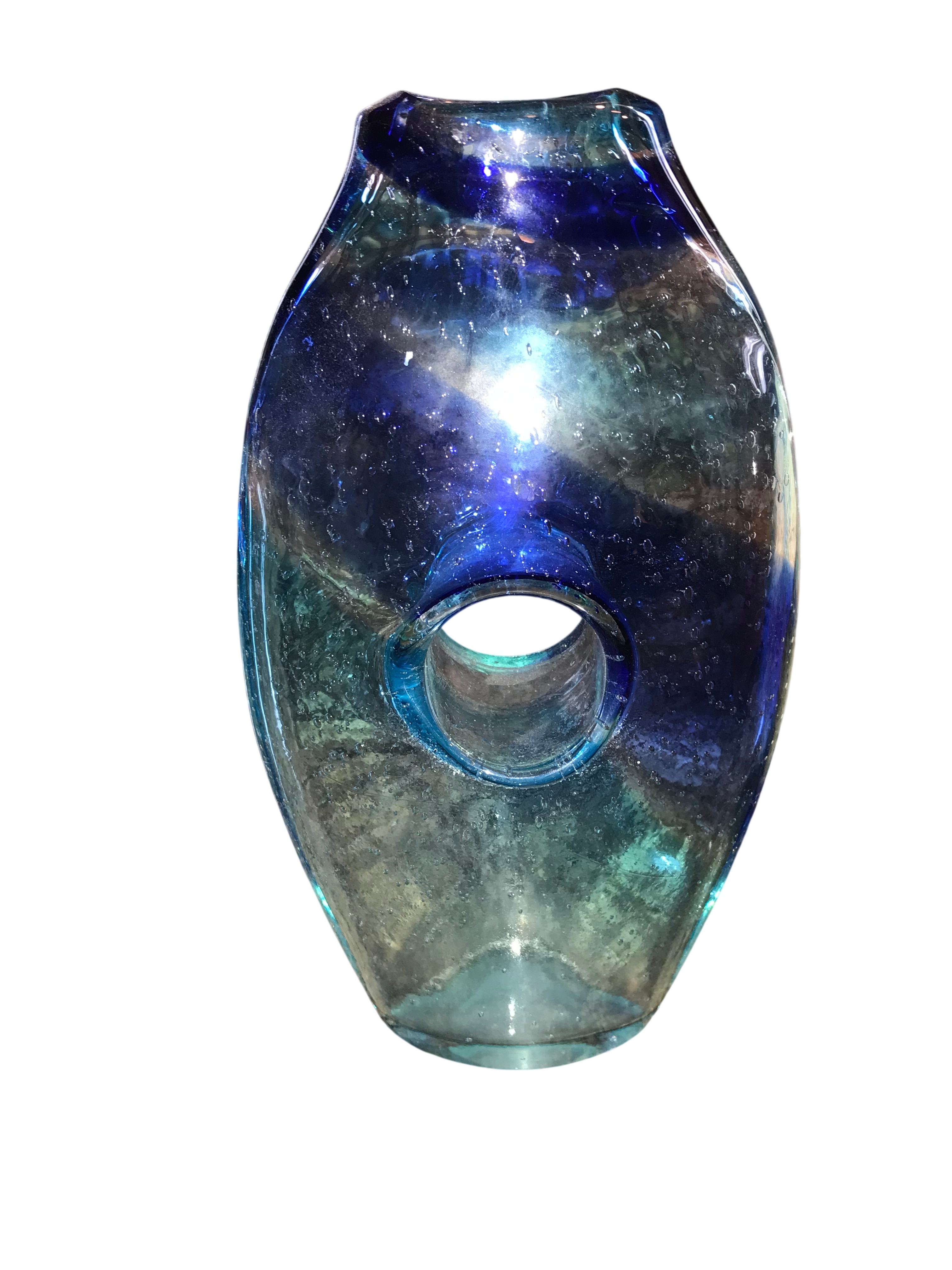 Collection features three pieces of contemporary hand-blown art glass. The first is a flattened teardrop-shaped vase in two-tone blue glass, featuring a prominent circular perforation through the center of the body. It is executed with a sommerso color graduation from cobalt blue to aqua and contains controlled internal air bubbles, a technique known as bullicante. The base is ground and frosted. The second is a tall, slender tapered club-form vase with a mottled macchia surface treatment. The pattern consists of dense multicolored glass frit in navy, turquoise, yellow, and orange against a light ground, resembling the Firestorm pattern. The third is a wide, rounded vessel of transparent amber-toned glass. It features abstract applications of opaque red, white, and black glass, with a lower register of multicolored mosaic chips in yellow, green, orange, blue, and white. Tallest measures 16 inches tall, Bluish vase measures 10 inches tall, and amber-toned measures 8 inches tall