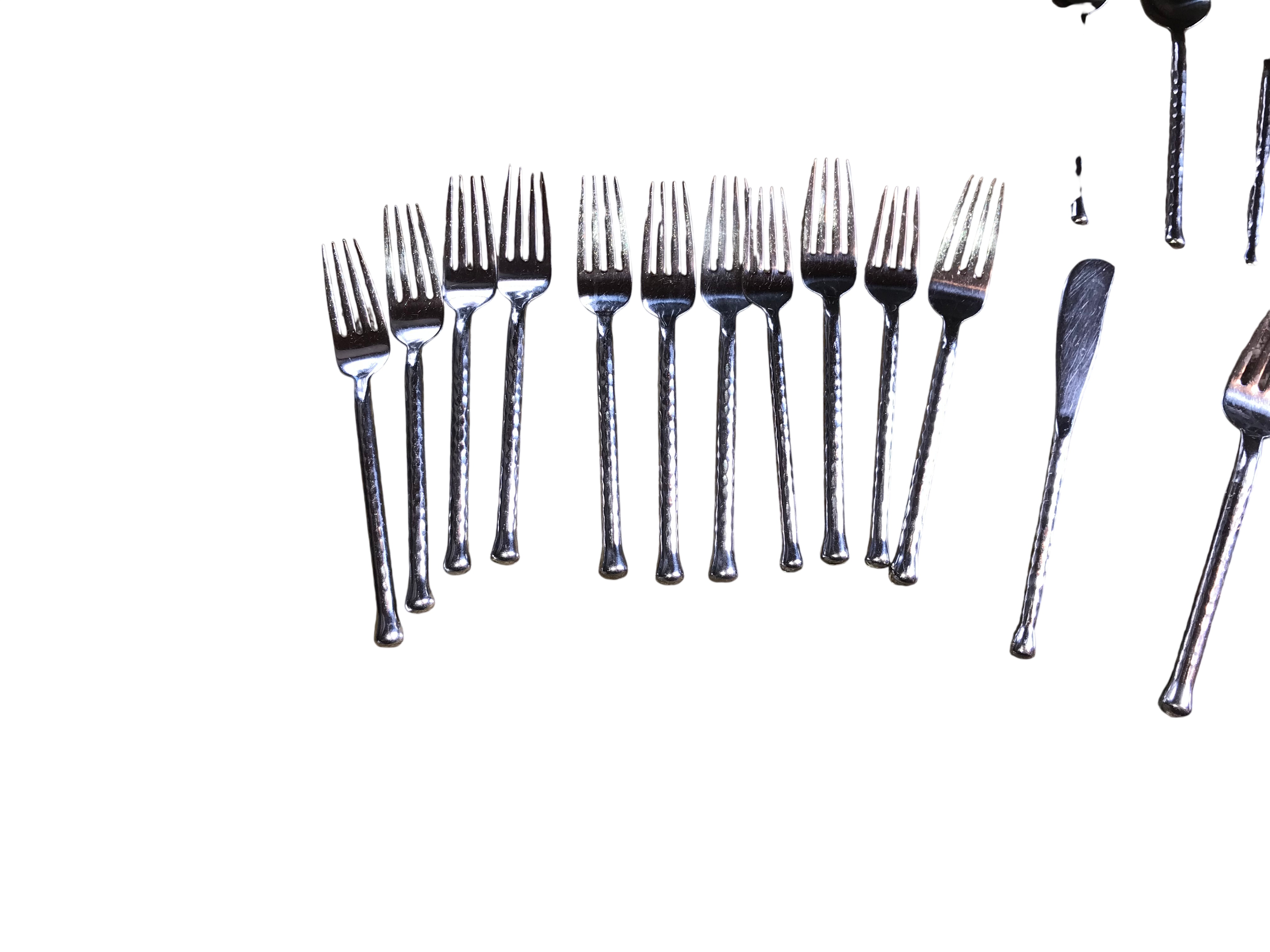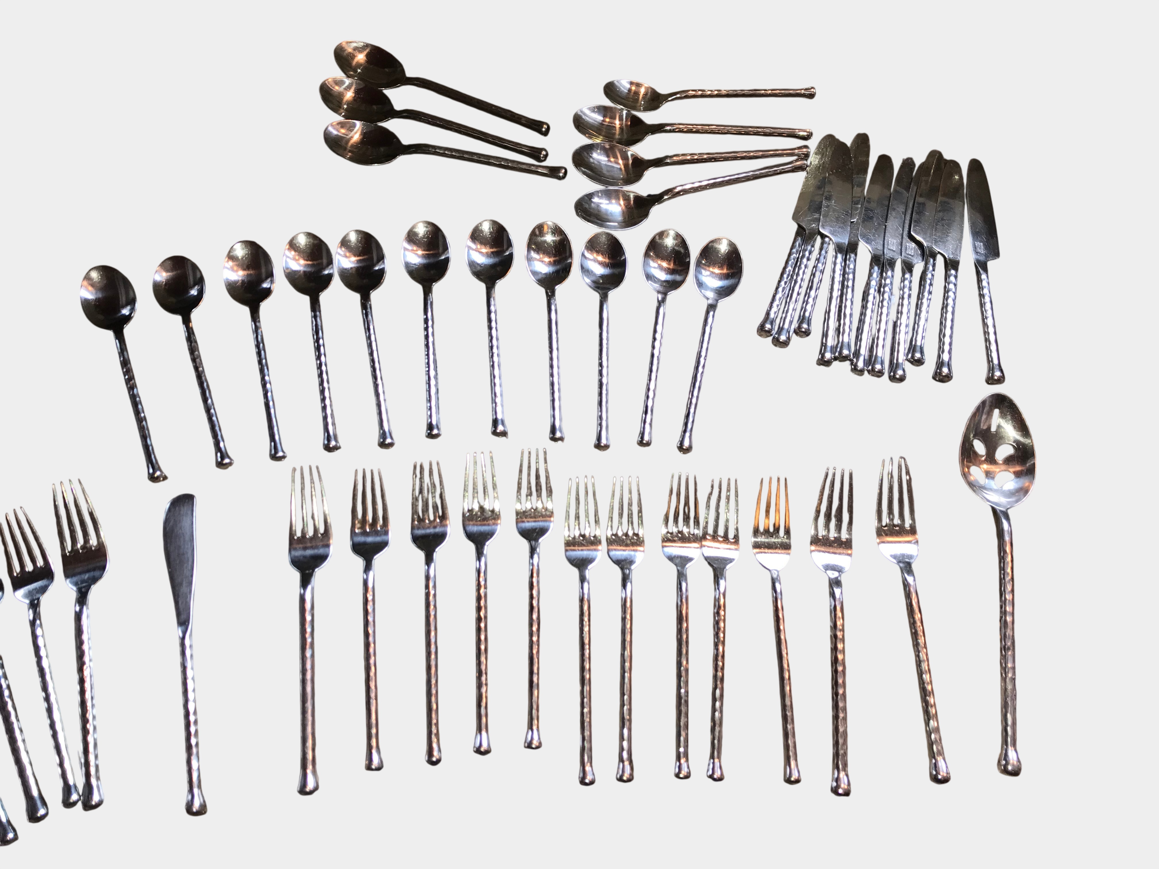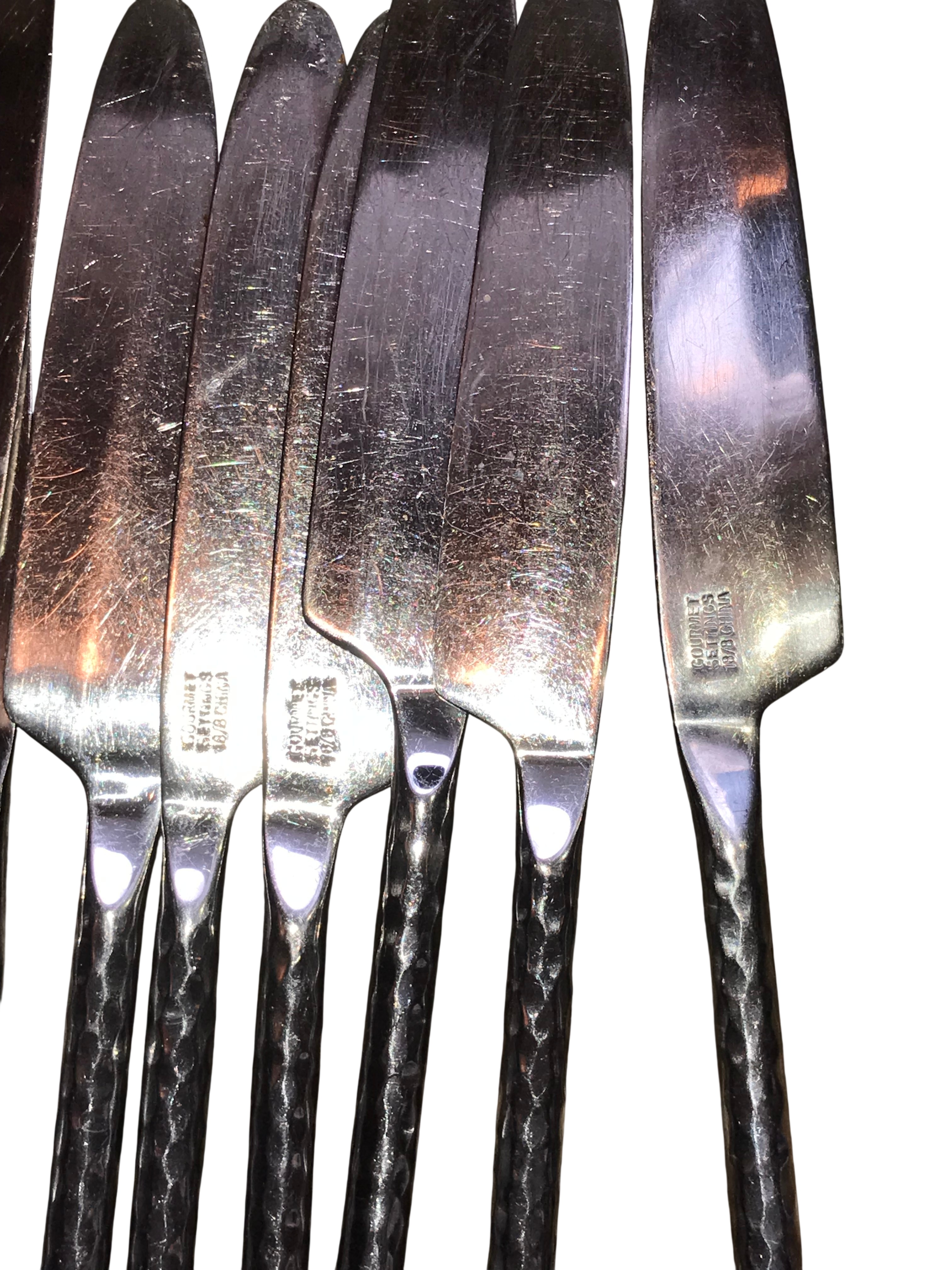 Contemporary flatware service manufactured by Gourmet Settings. The pieces are crafted from 18/8 stainless steel and feature a hammered texture throughout the handles. The design is characterized by slender, tapered handles ending in small, rounded terminals. The collection includes dinner knives, dinner forks, salad forks, soup spoons, teaspoons, a butter spreader, and a pierced serving spoon.