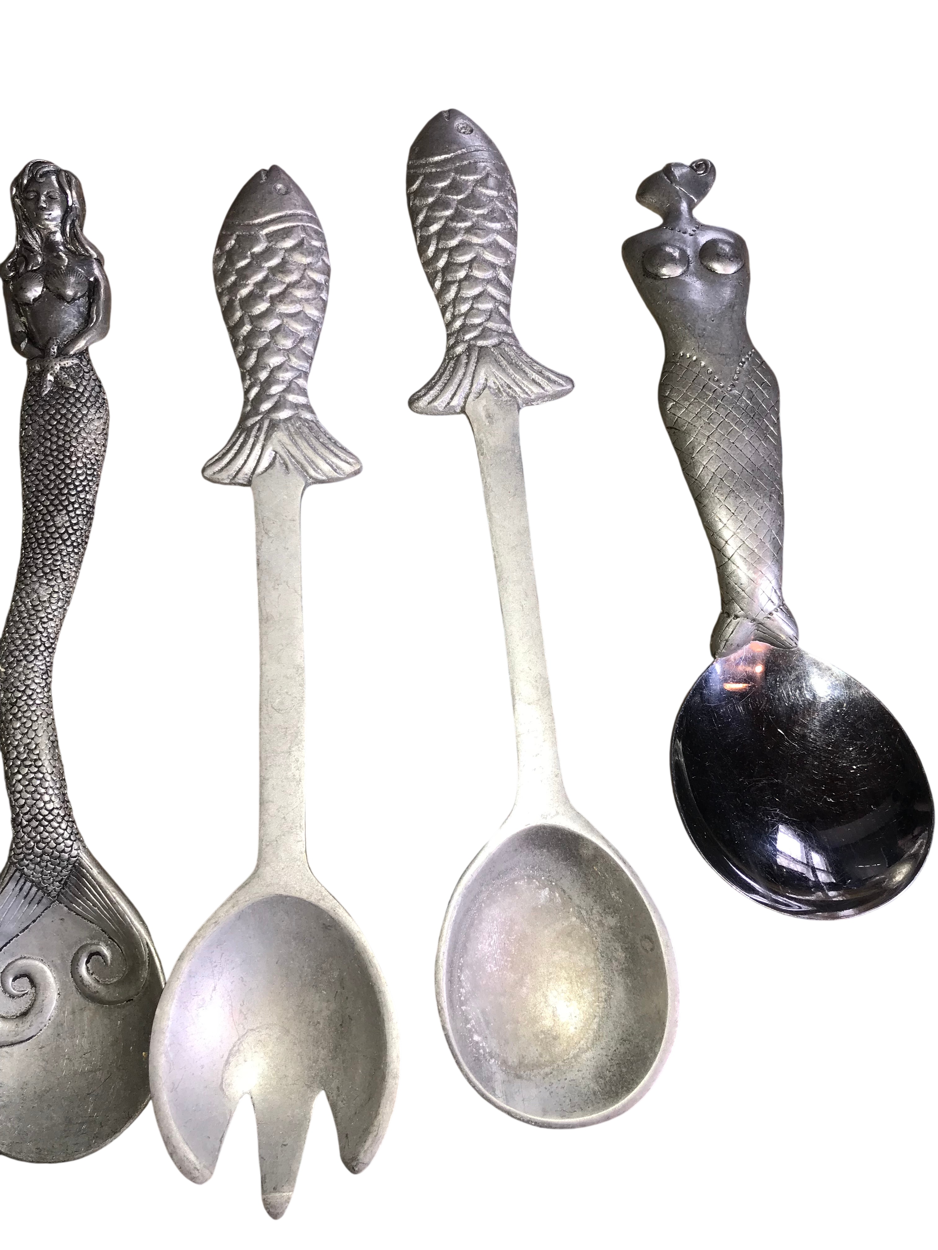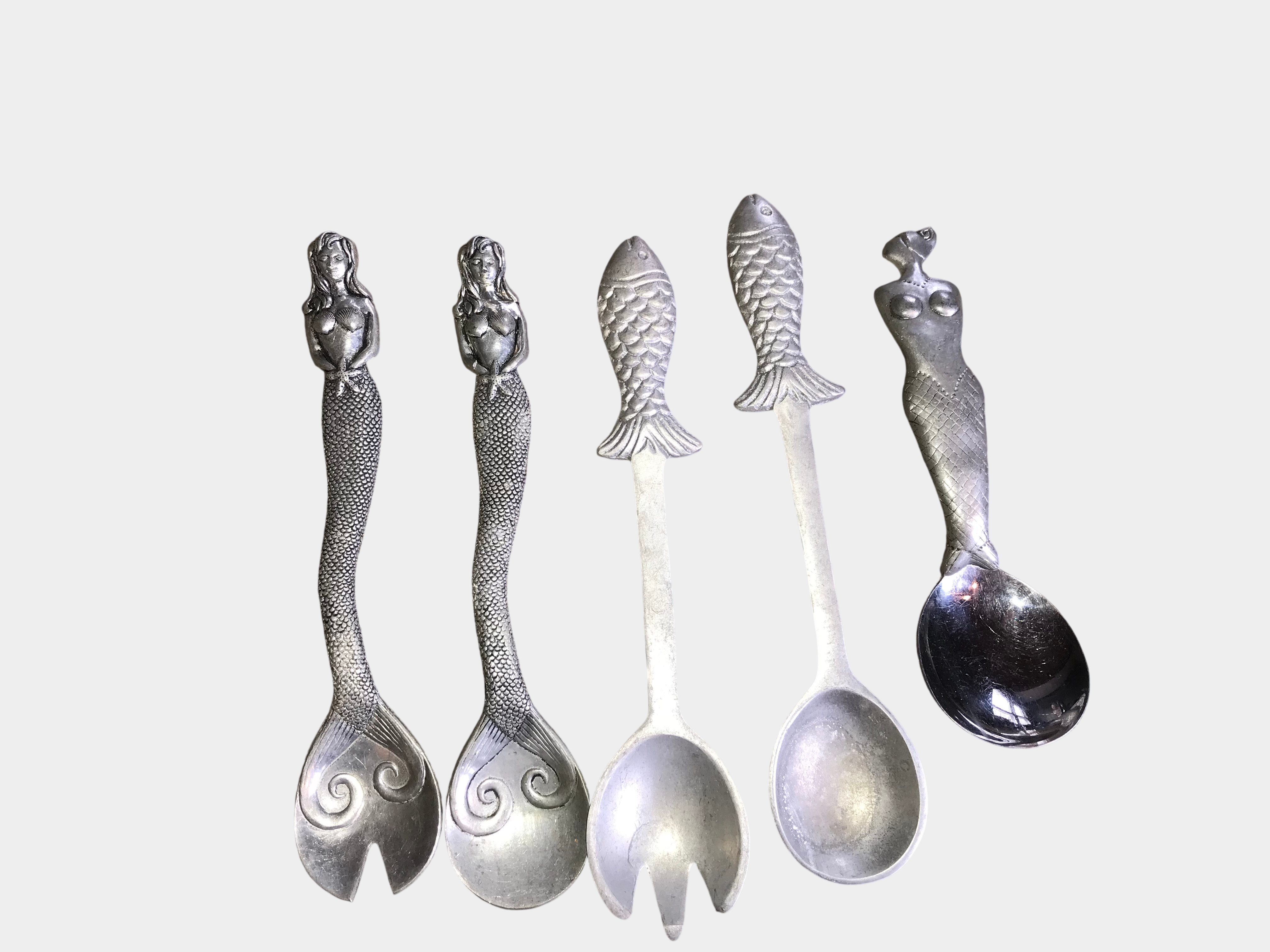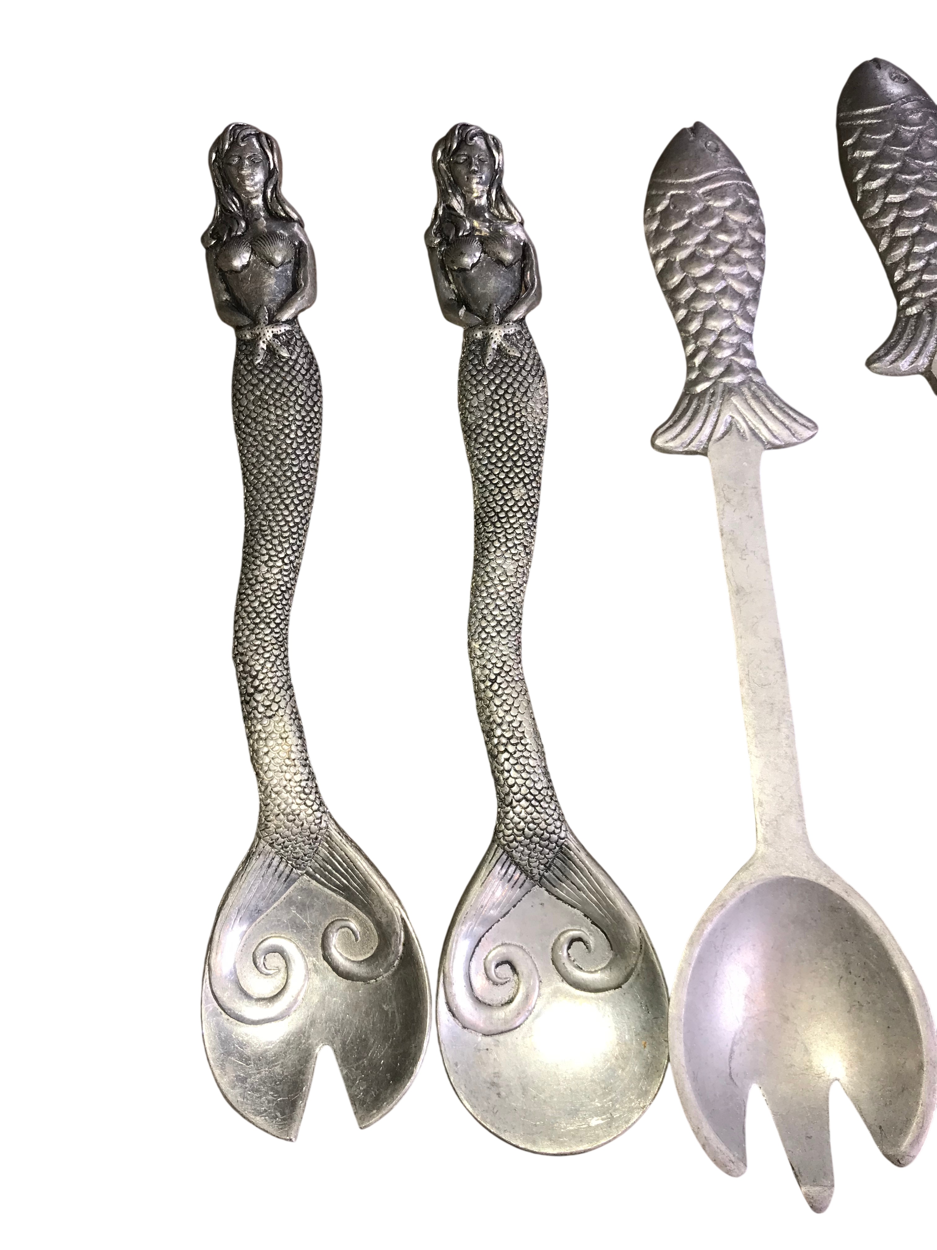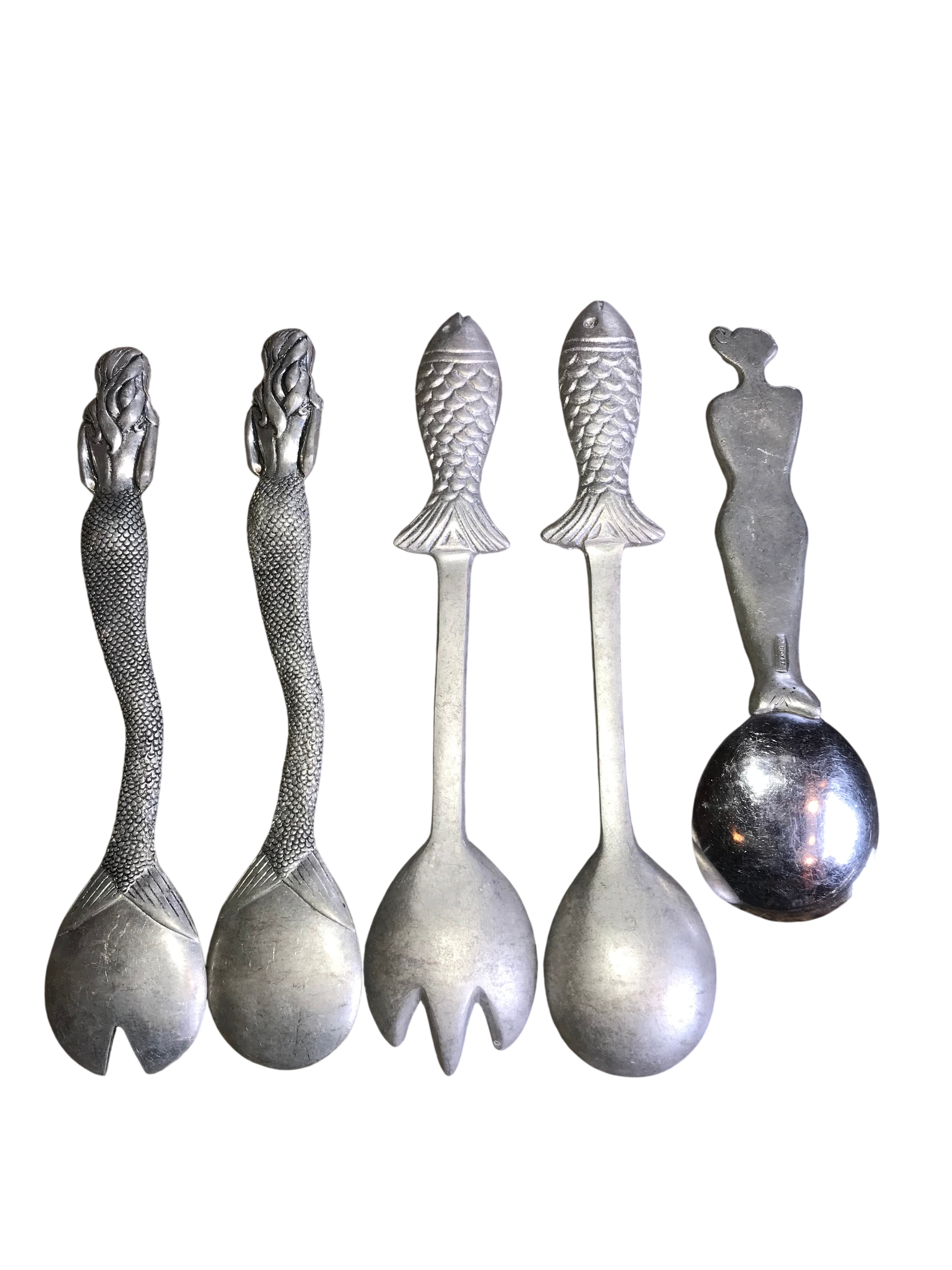 This collection includes five decorative serving utensils crafted from sand-cast aluminum. The assortment features a pair of mermaid-themed utensils consisting of one spoon and one three-tined fork. The handles are modeled as mermaids with flowing hair and crossed arms, with tails that transition into bowls or tines decorated with raised scrollwork. A second pair of utensils depicts fish with detailed scales and fins on straight shafts, including one spoon and one three-tined fork. The fifth item is a single spoon with a stylized female figure handle and a high-polish finish on the bowl. This specific spoon is marked on the reverse with an incised rectangular stamp for Mariposa. The remaining four pieces are unmarked but share the same material and maritime aesthetic.