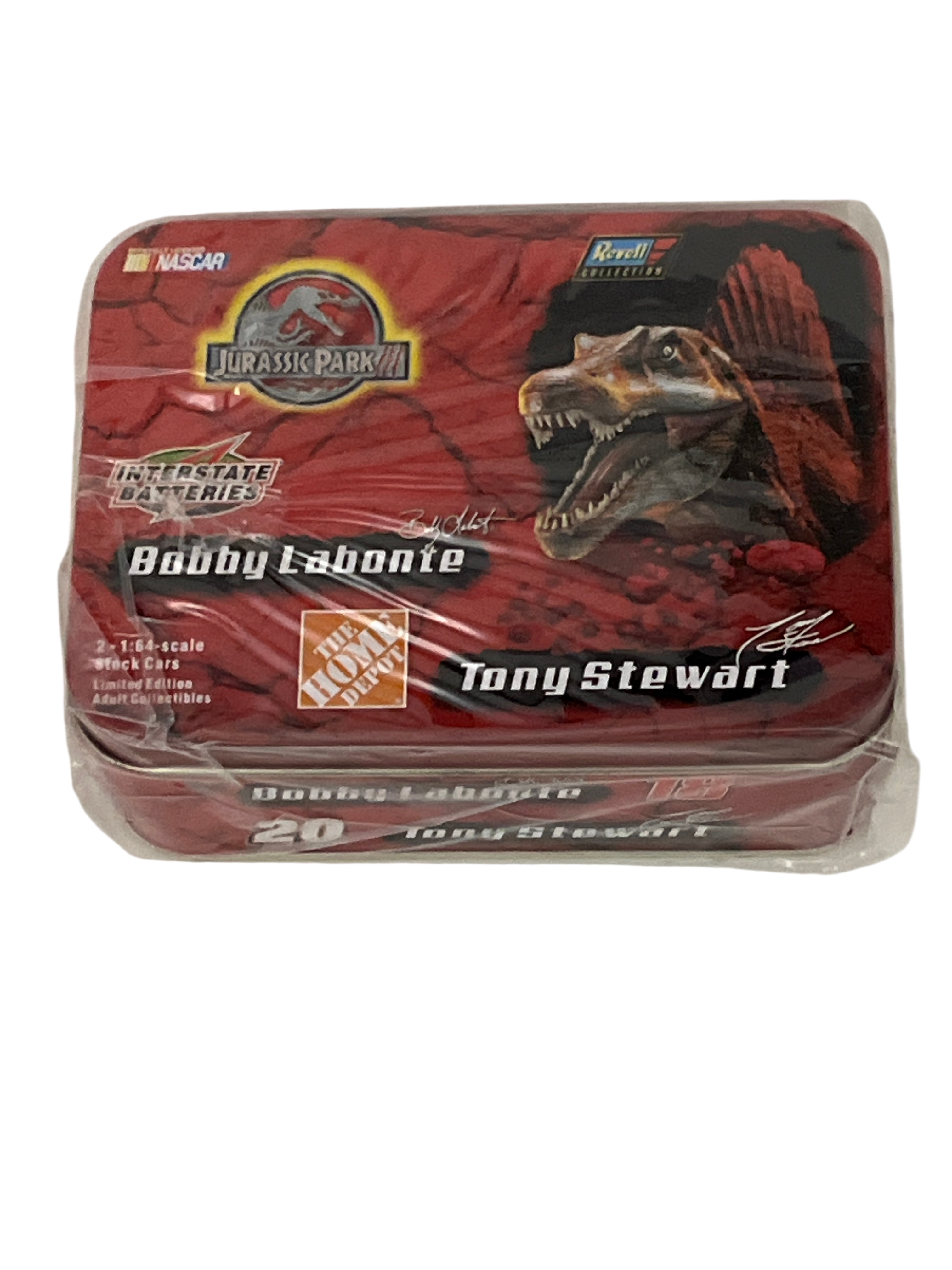 A Revell Collection NASCAR Limited Edition Adult Collectibles die-cast car set produced circa 2001 as a promotional tie-in for the film Jurassic Park III. The set is housed in a red lithographed metal tin featuring a Spinosaurus graphic and the film logo. The exterior displays the names and facsimile signatures of drivers Bobby Labonte and Tony Stewart, along with logos for NASCAR, Interstate Batteries, and The Home Depot. The set contains two 1:64-scale stock cars representing the drivers’ respective racing teams. Dimensions not recorded.