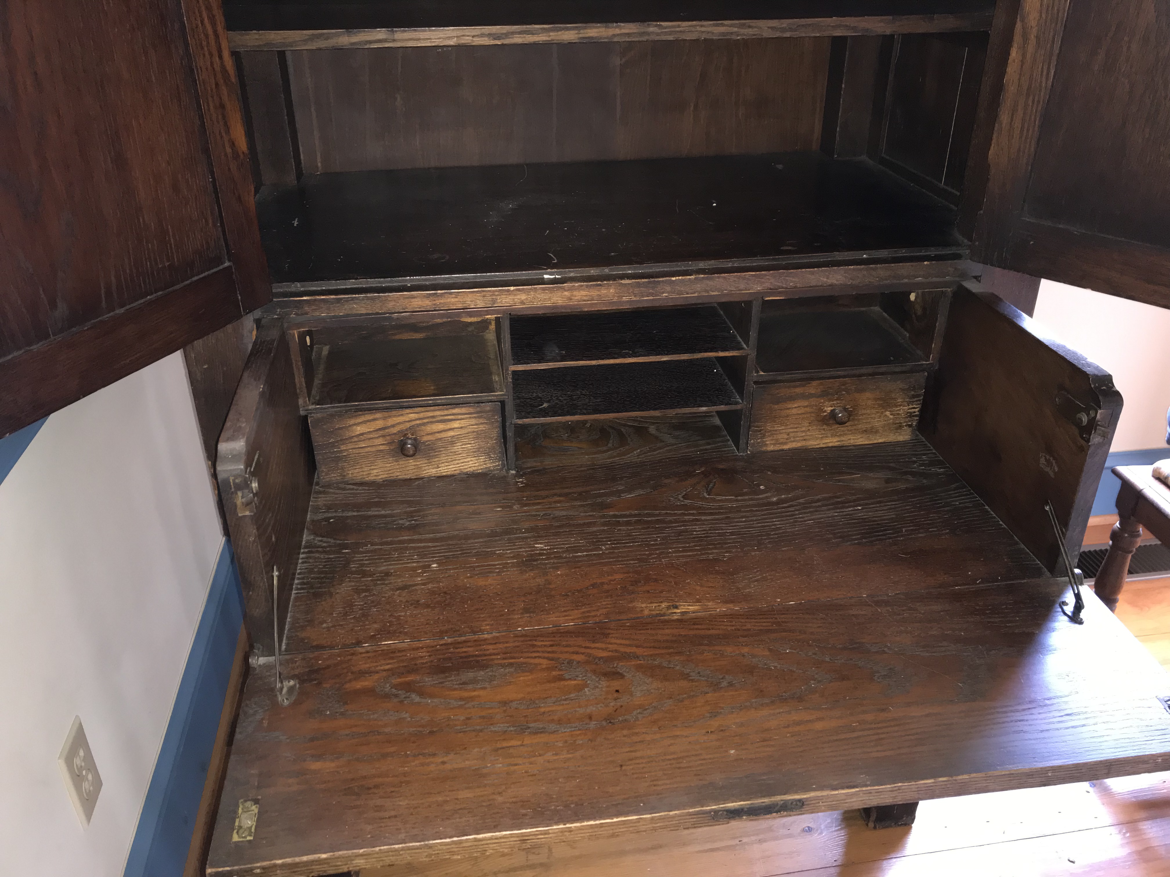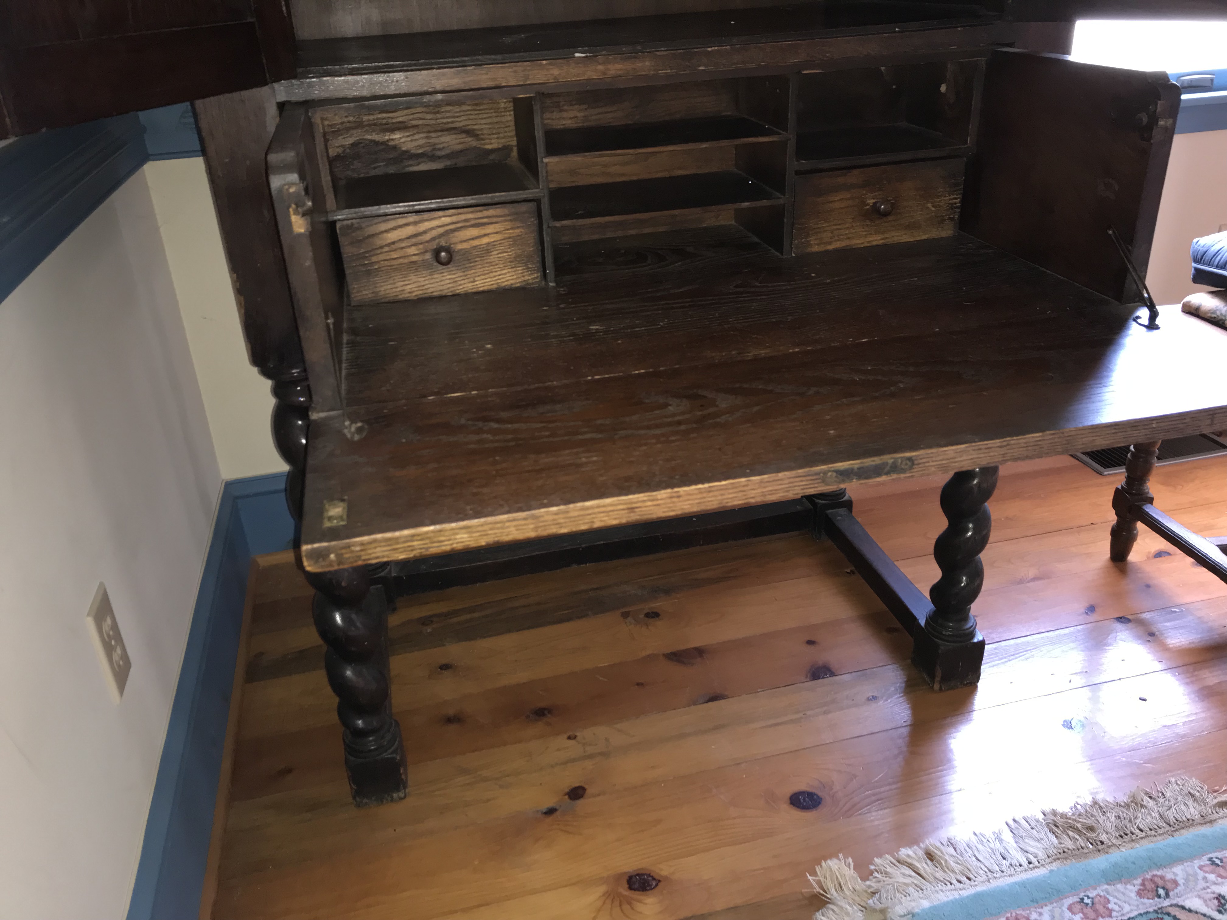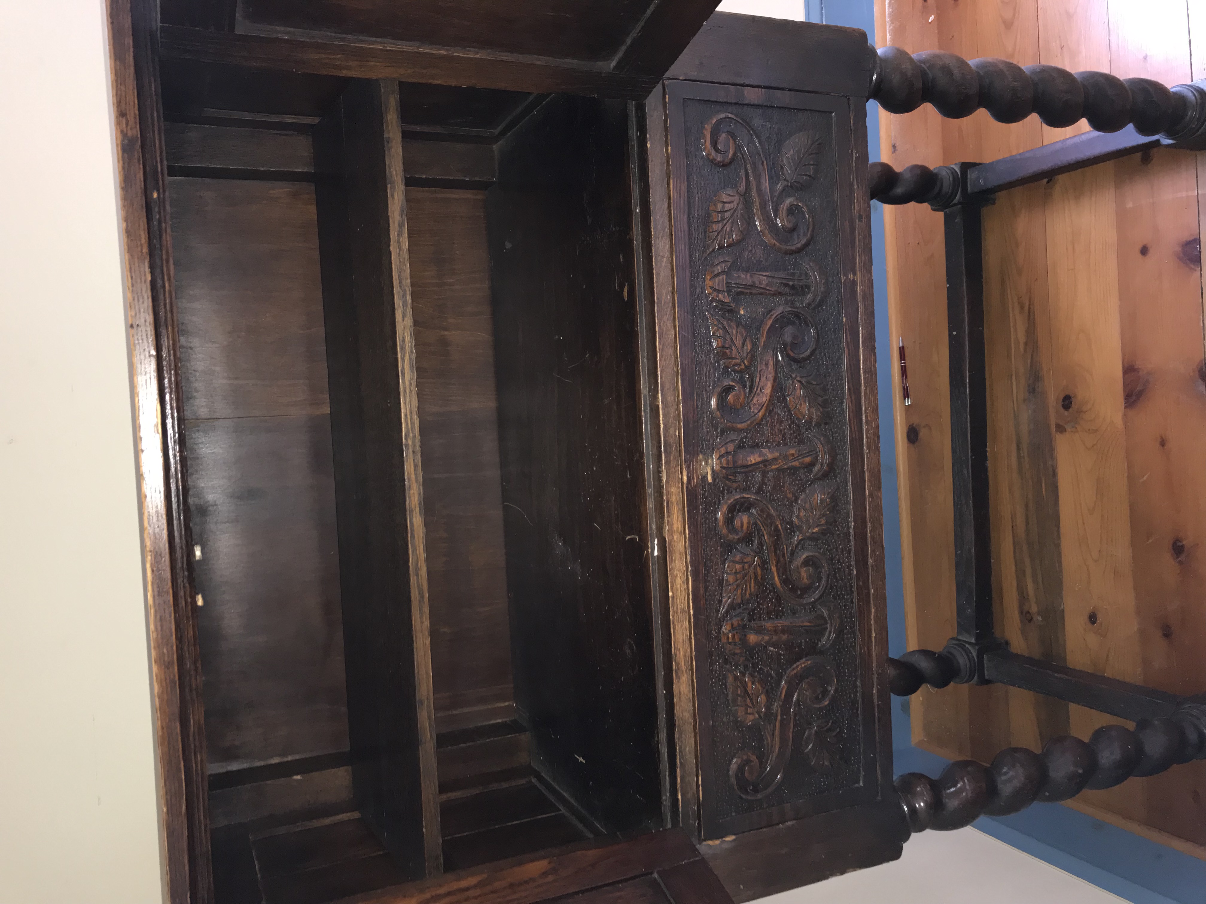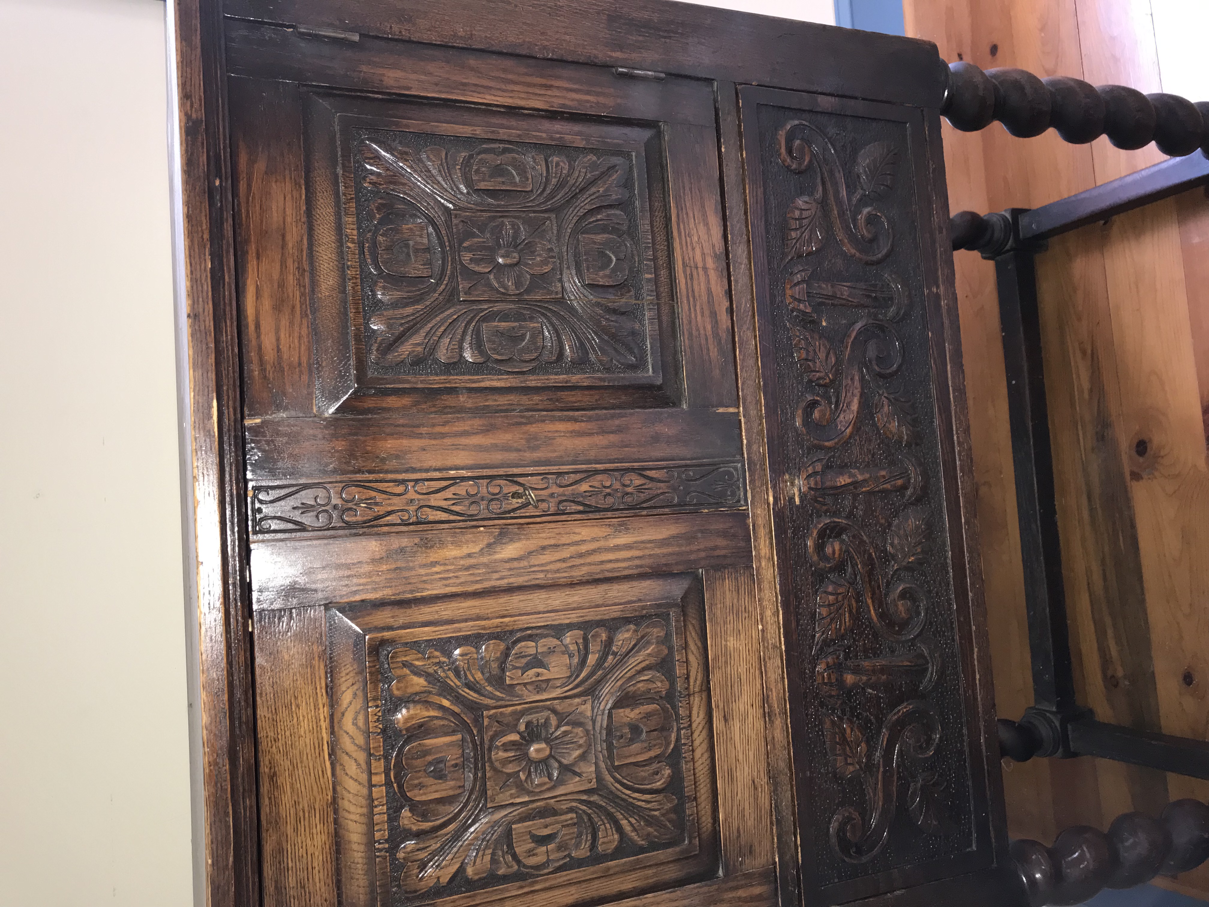 This Jacobean Revival secretary cabinet is constructed of oak with a dark brown stained finish. The piece is a two-piece construction, consisting of a combined upper cabinet and drop-front desk unit that sits upon a separate four-legged stand. The exterior features heavy relief carving, including two upper door panels with geometric and floral motifs and a vertical side panel with foliate scrollwork. A horizontal carved band separates the upper and lower sections of the cabinet face. The upper cabinet portion opens to an interior with a single shelf. The lower portion features a drop-front desk that opens to reveal a fitted interior with central open pigeonholes, horizontal document slots, and two small drawers equipped with turned wooden knobs. The unit is supported by a stand featuring four robust barley-twist legs joined by a low-profile H-stretcher and terminating in block feet. Hardware includes metal butt hinges and metal stay rods to support the desk surface when open. No maker marks, labels, or stamps are visible on the interior or exterior of the piece.