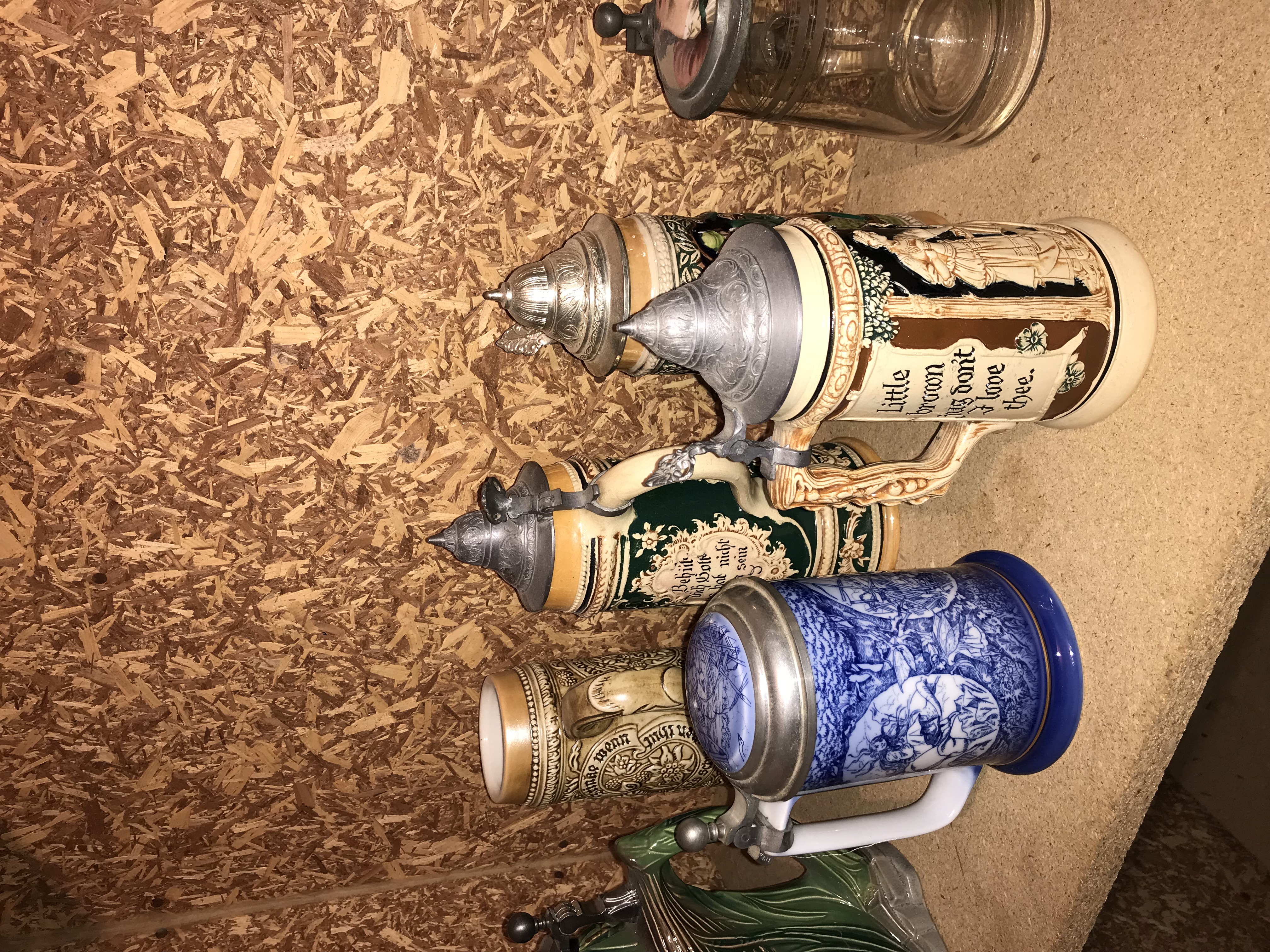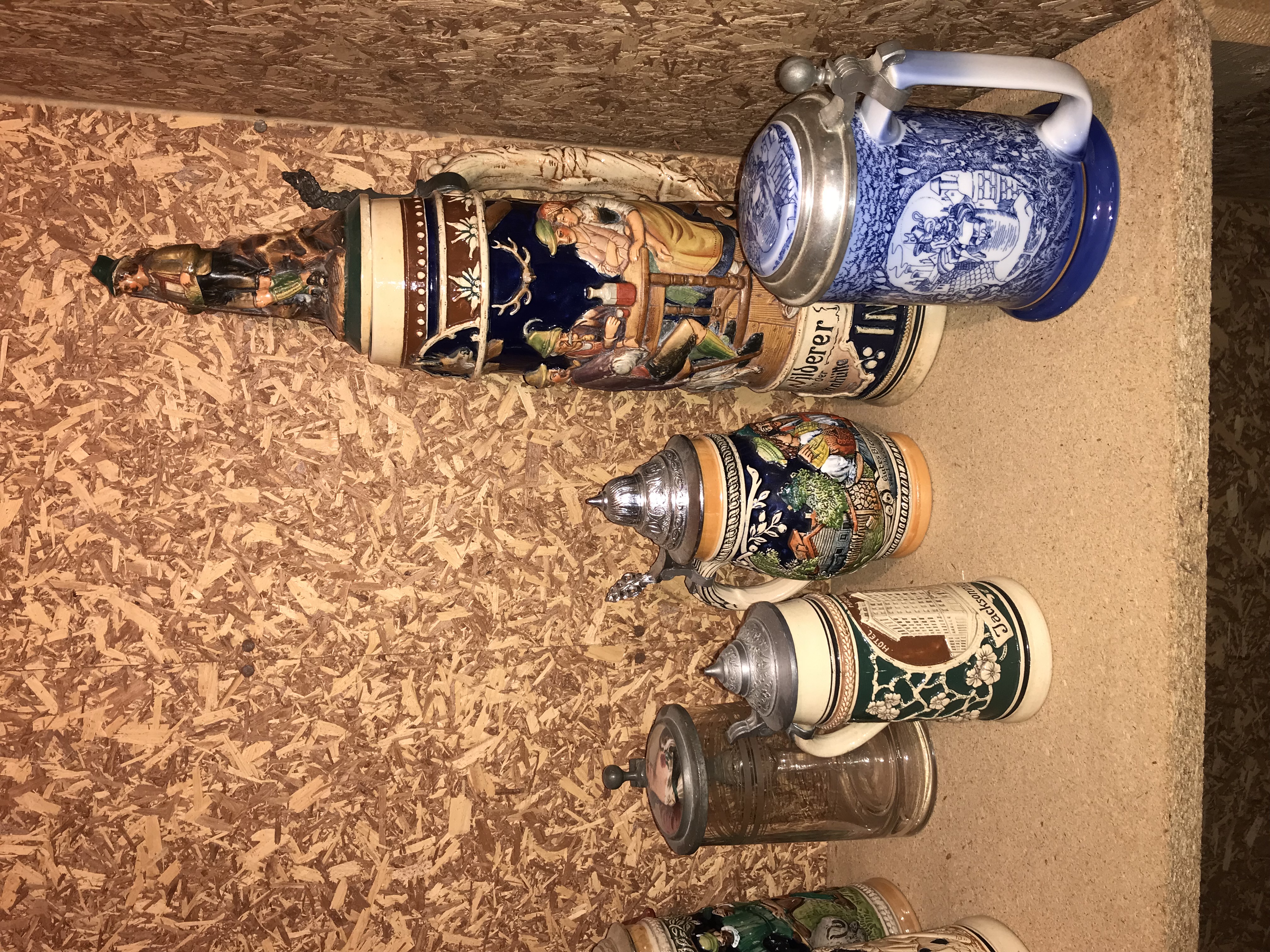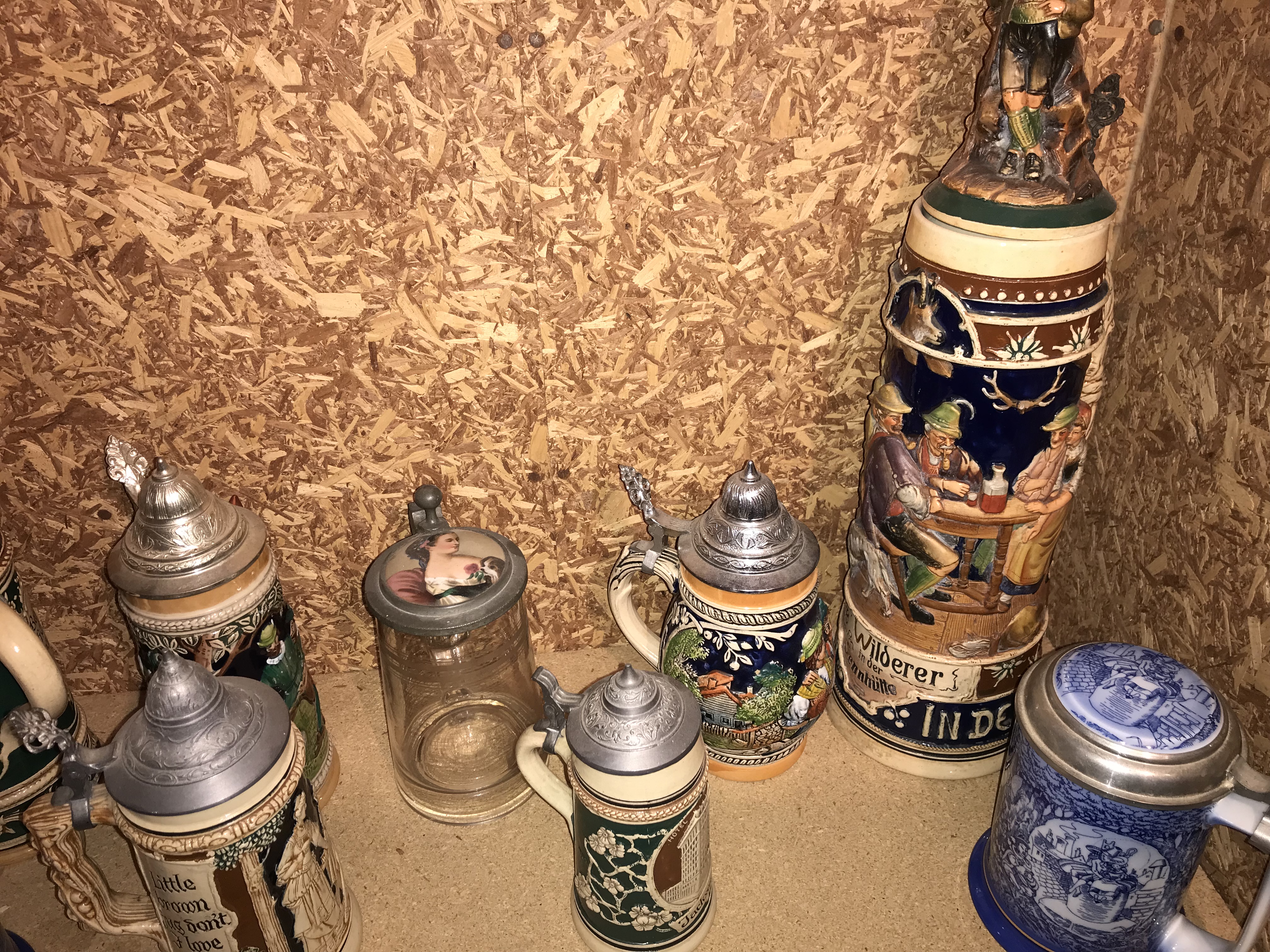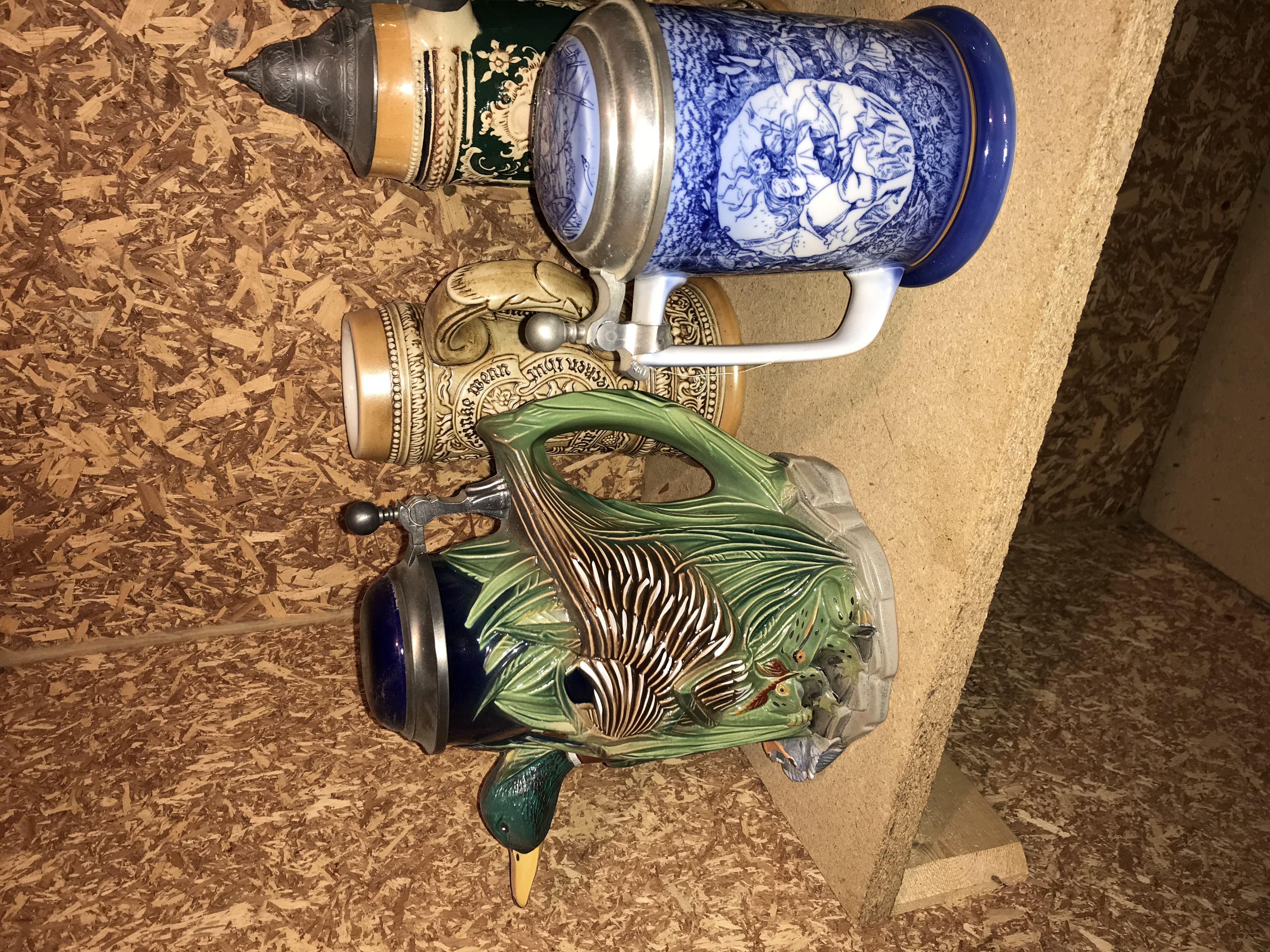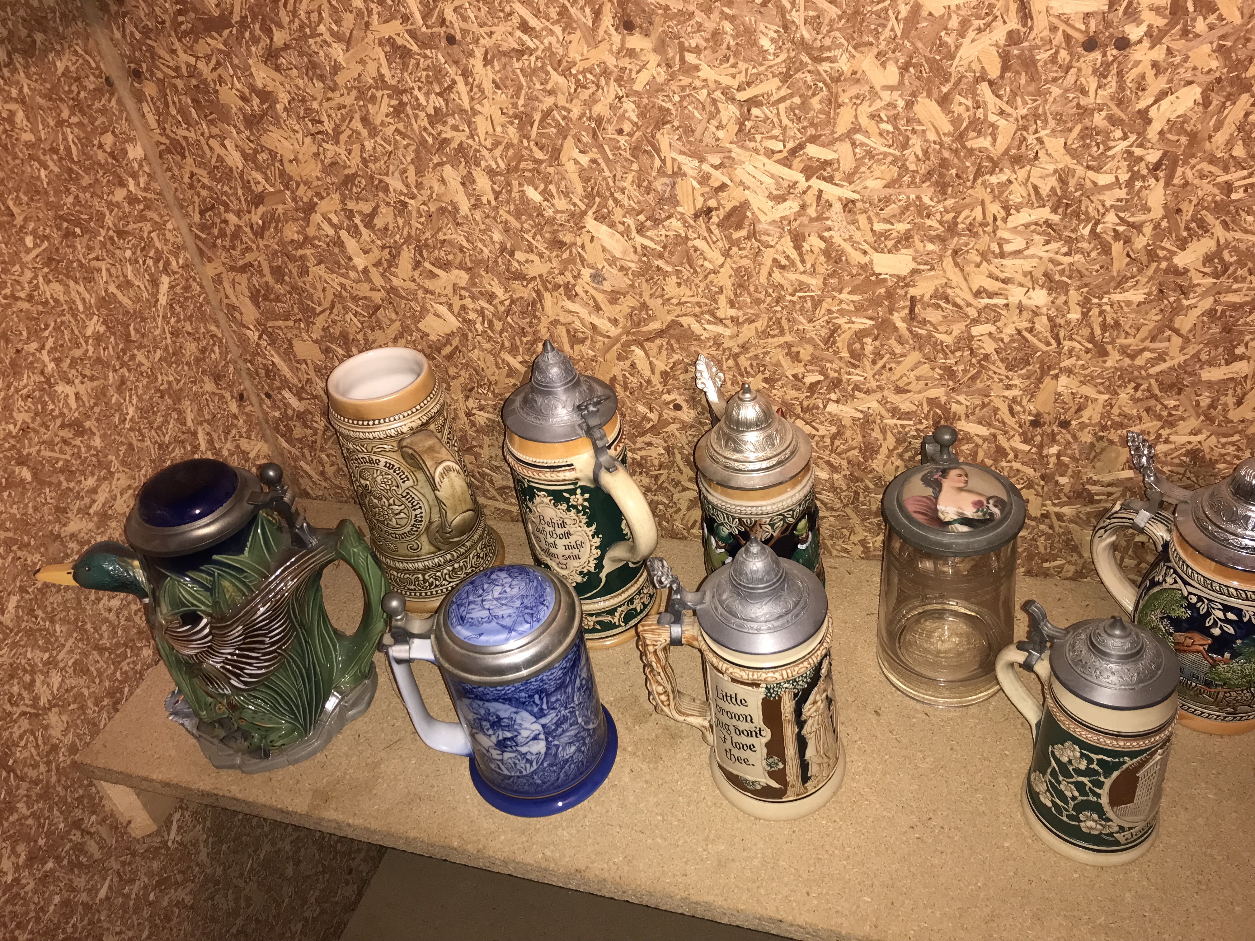 This lot consists of twelve pieces of breweriana, comprising eleven beer steins and one figural pitcher. The collection features a variety of materials including glazed ceramic, salt-glazed stoneware, and molded glass, with most pieces featuring pewter lids and thumb lifts. A primary piece in the group is a large ceramic figural pitcher molded in the form of a mallard duck with a textured feather handle and a domed pewter lid. The collection includes an oversized master stein in stoneware with high-relief tavern scenes, inscribed Wilderer in der Almhütte, featuring a ceramic figurine finial on the lid. Other items include a cream-colored stoneware stein with relief scrollwork and the English text Little brown jug don’t I love thee, a dark green stoneware motto stein inscribed Behüt dich Gott es hat nicht sollen sein, and a small souvenir stein featuring the text HOTEL Jackson. Also present are two ceramic steins with blue transfer-printed scenes and pewter lids containing porcelain inserts, and a faceted clear glass stein with a pewter lid featuring an inset printed image of a woman in 19th-century dress. The remaining four small steins include one with German architectural relief and the text Gutes Bier, a lidless salt-glazed stoneware stein, and two with traditional floral and tavern motifs. Construction methods include relief molding, transfer printing, and salt-glazing.