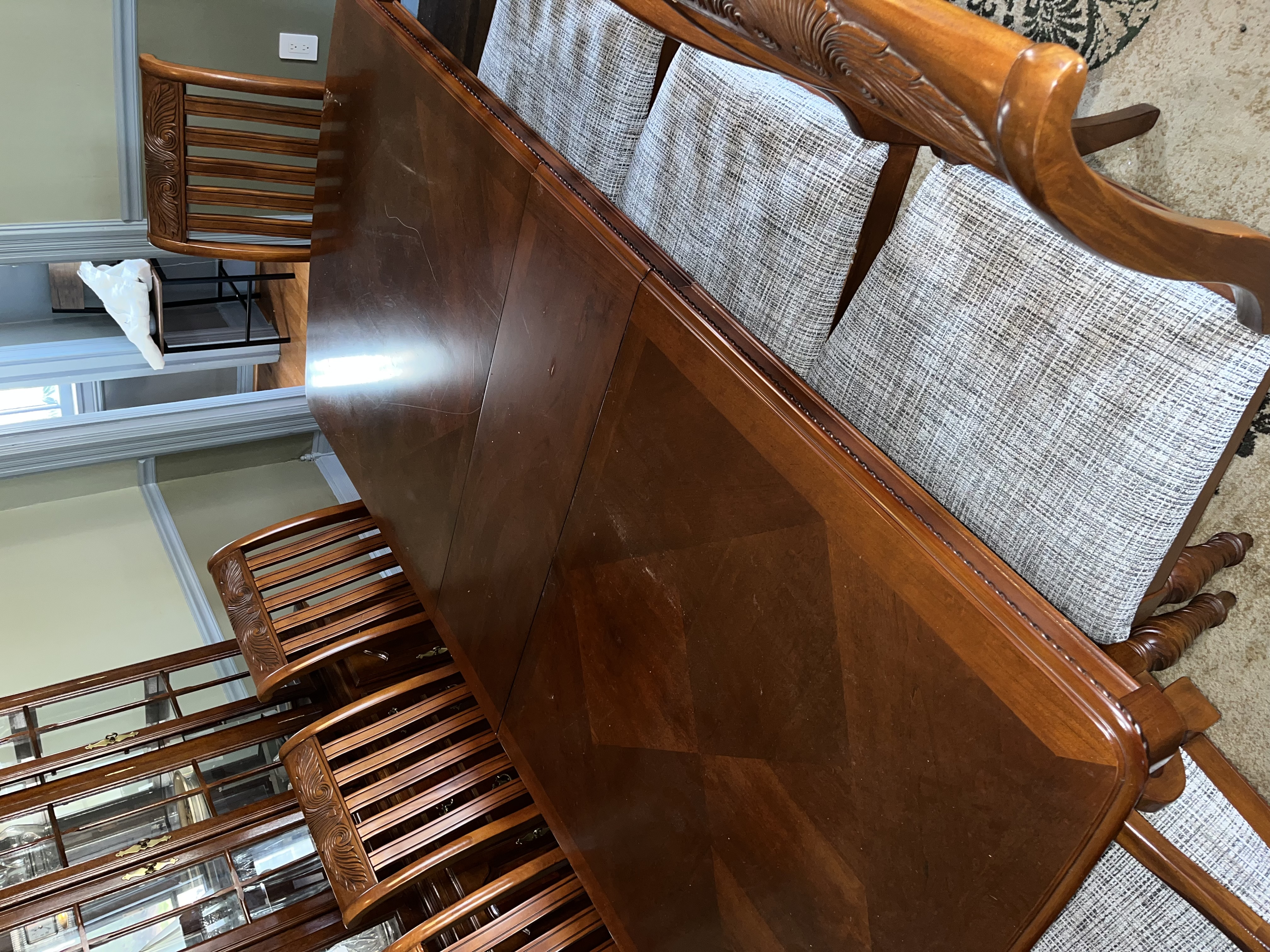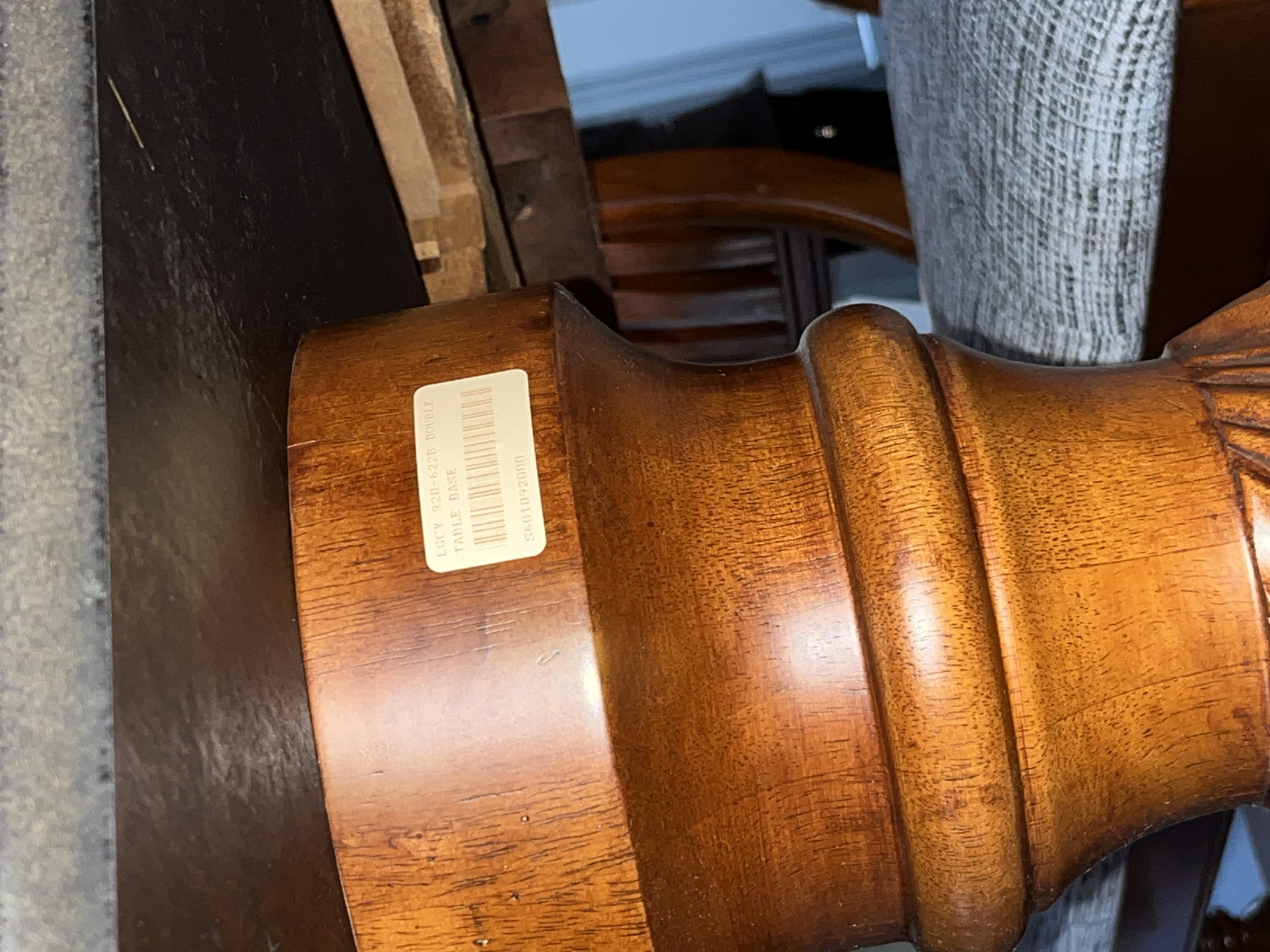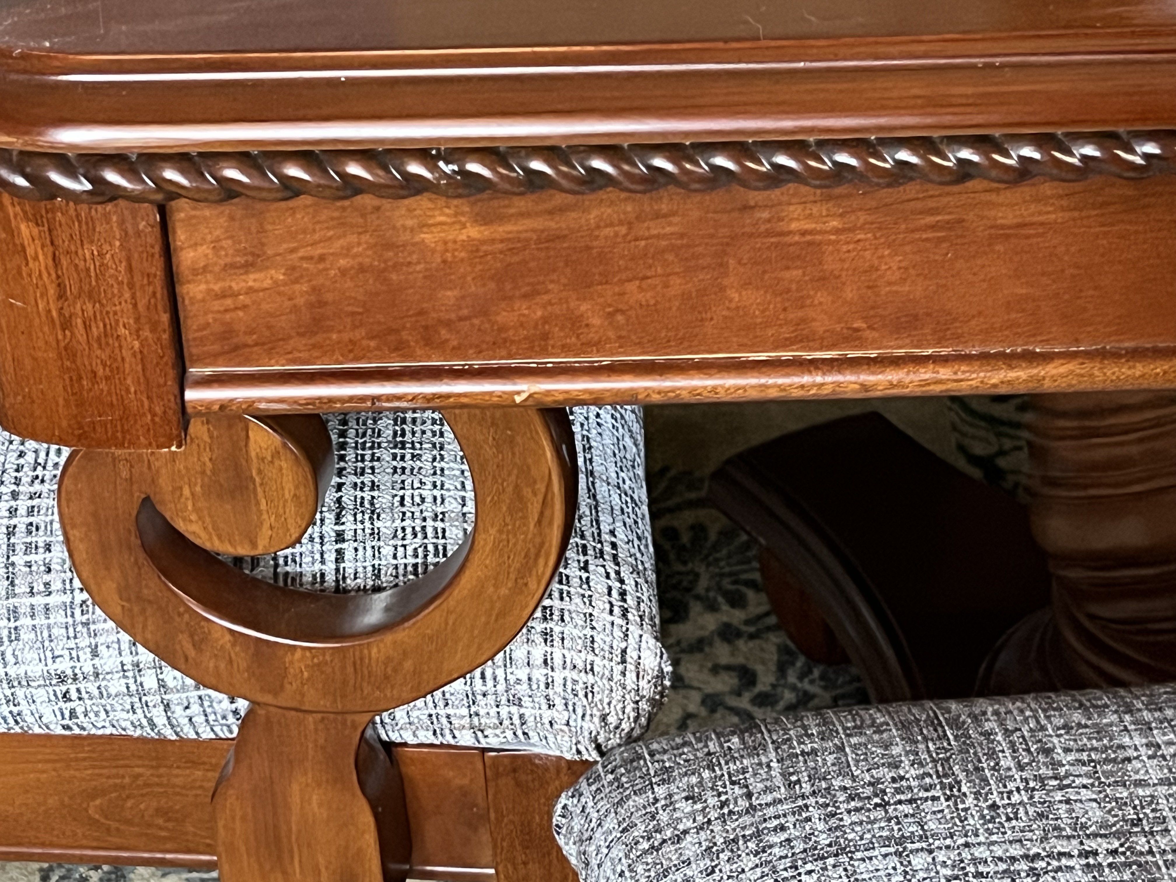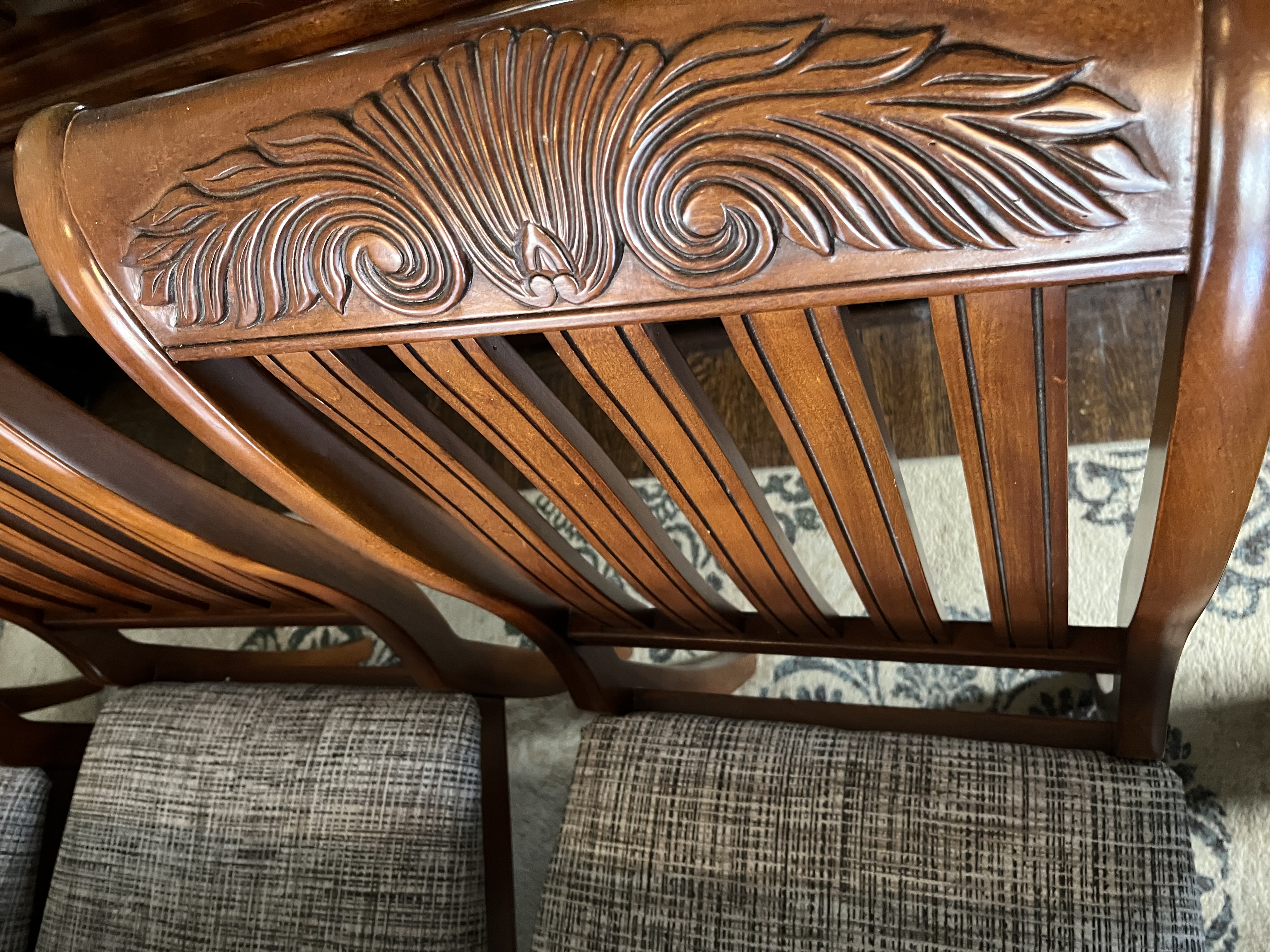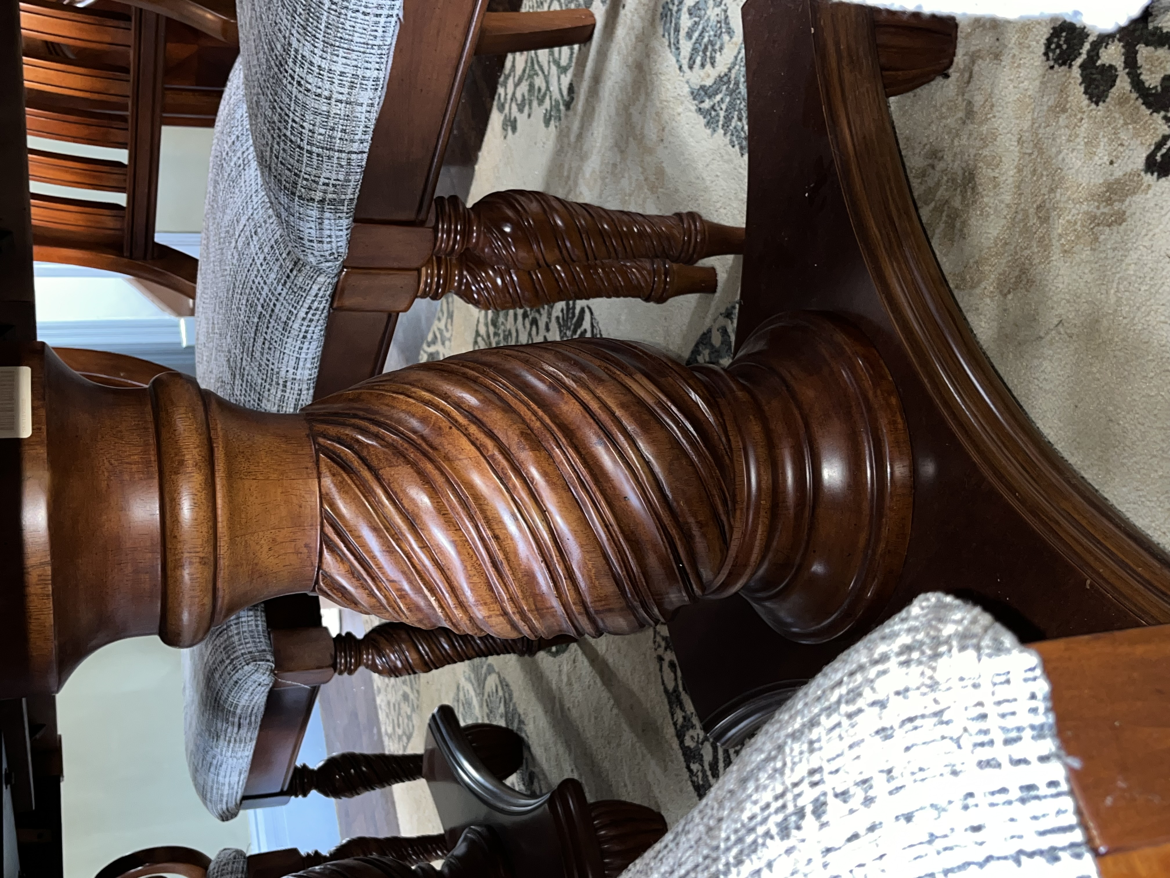Dining set is manufactured by Legacy Classic Furniture designed in a contemporary traditional revival style with a twin pedestal base, with each pedestal consisting of a spirally carved central column on a shaped platform with out-swept legs. The table includes two removable leafs. The matching chairs feature high backs with vertical slats and a carved top rail depicting a stylized shell and acanthus leaf motif. The front legs of the chairs are spirally carved to coordinate with the table pedestals. The seats are upholstered in a gray and white textured fabric. Table measures 30 inches tall by 80 inches long by 42 inches wide. Must be picked up directly from a home in North Buffalo before April 20