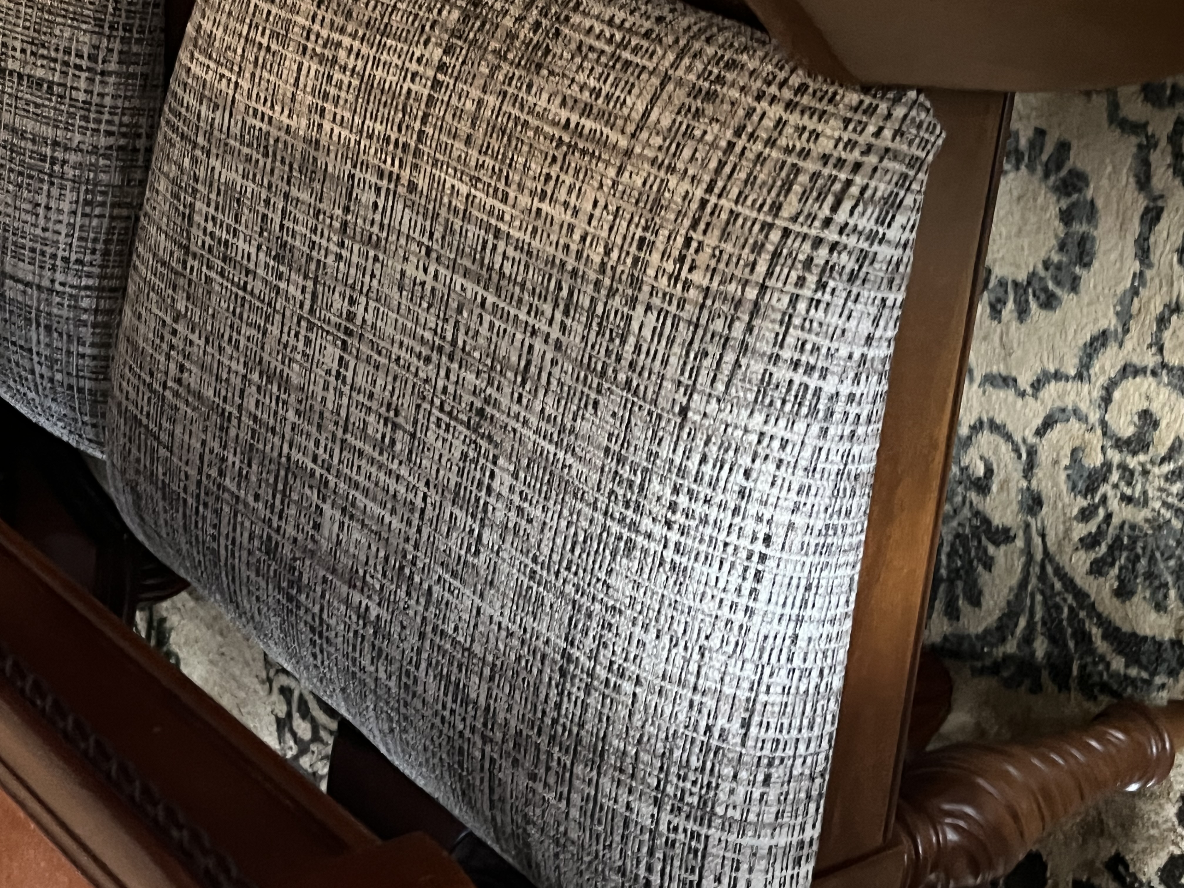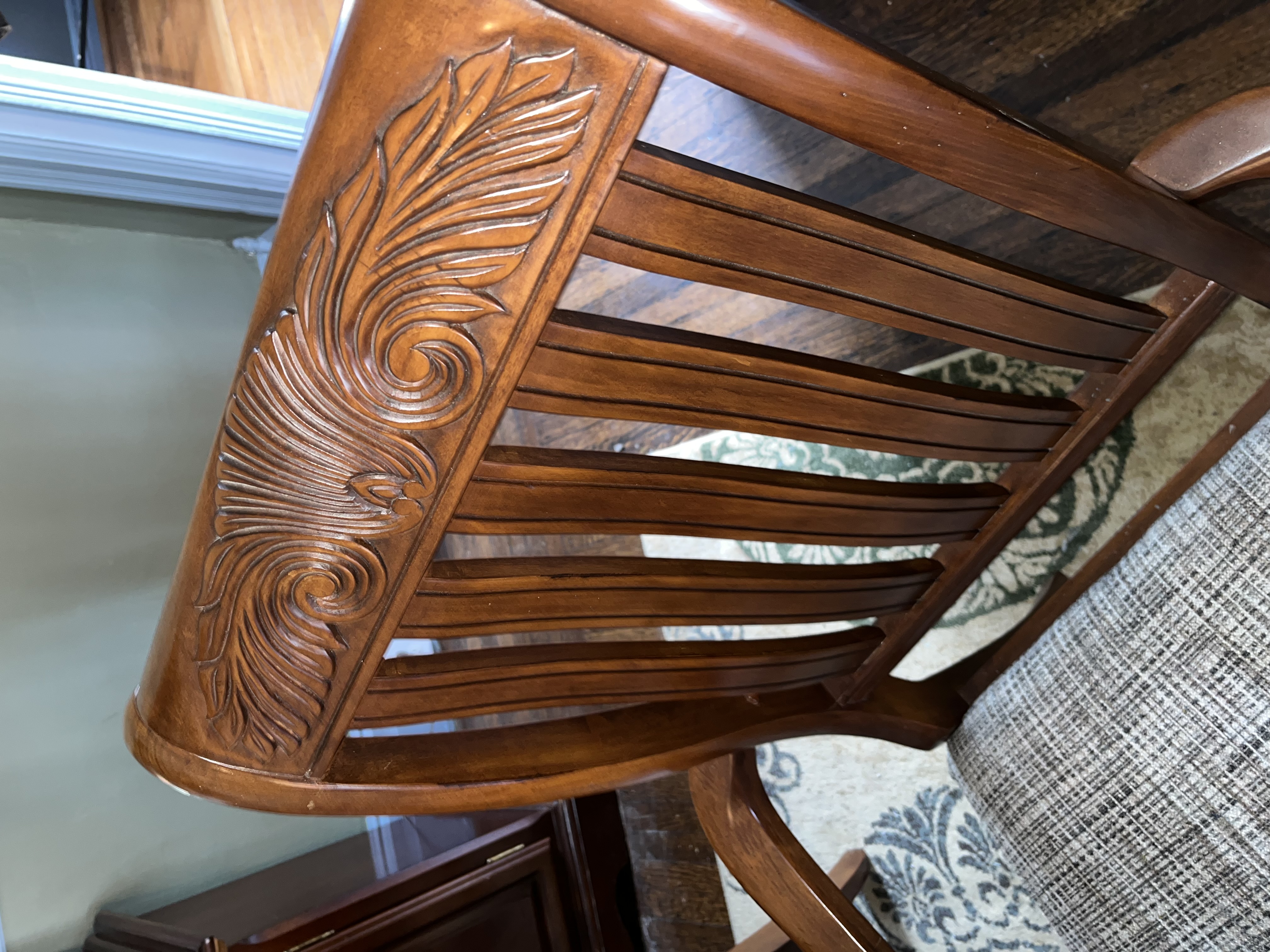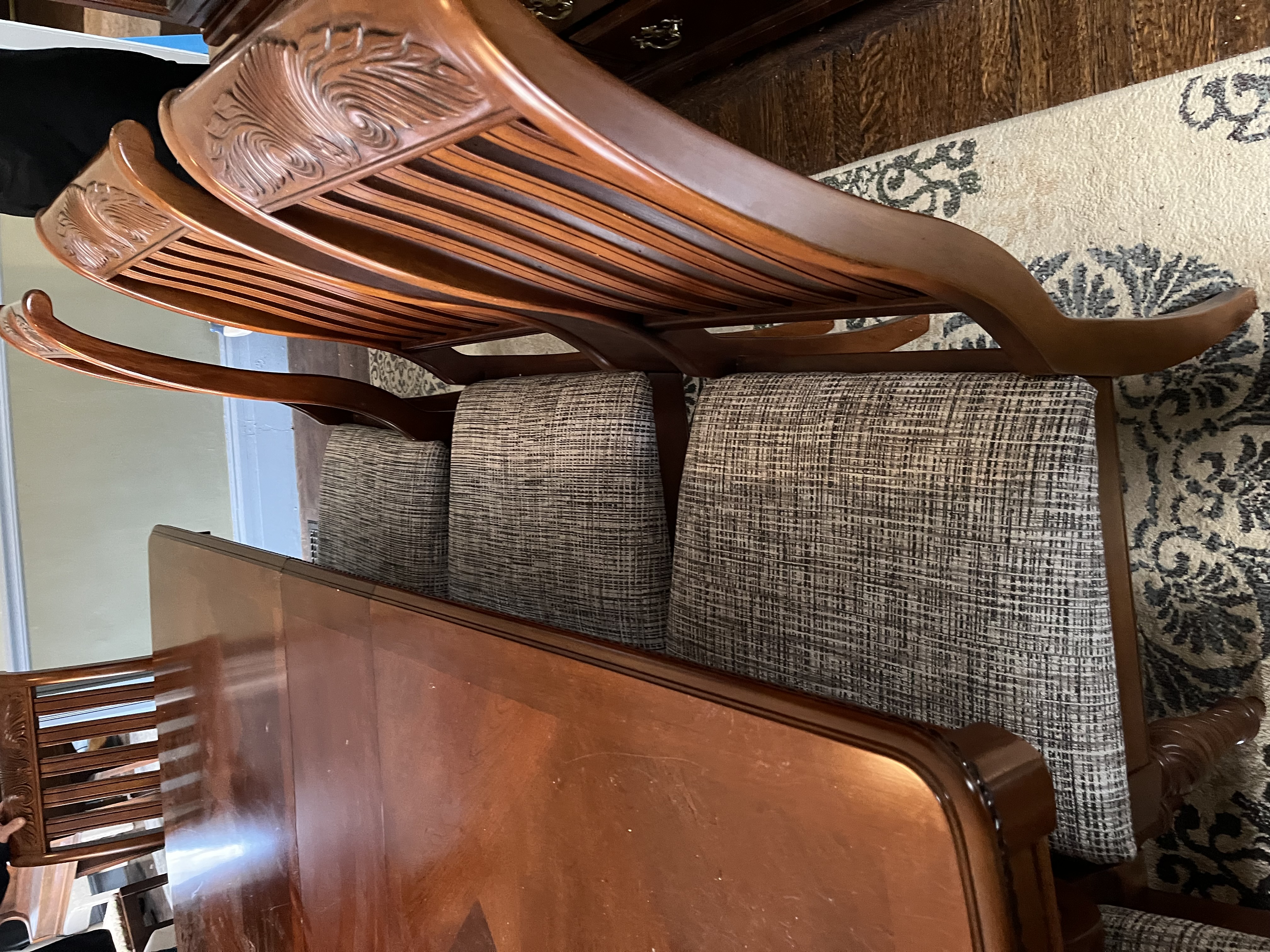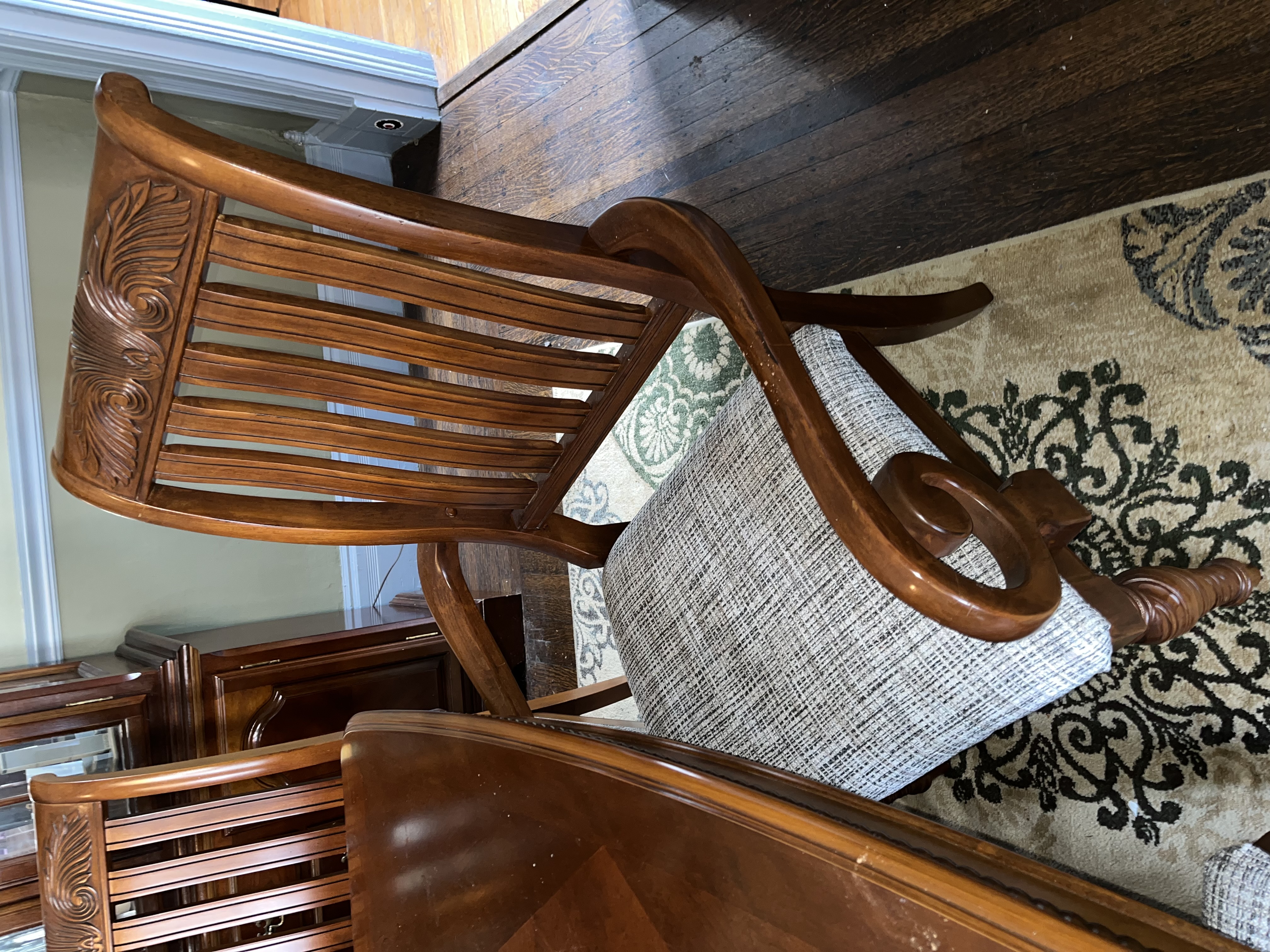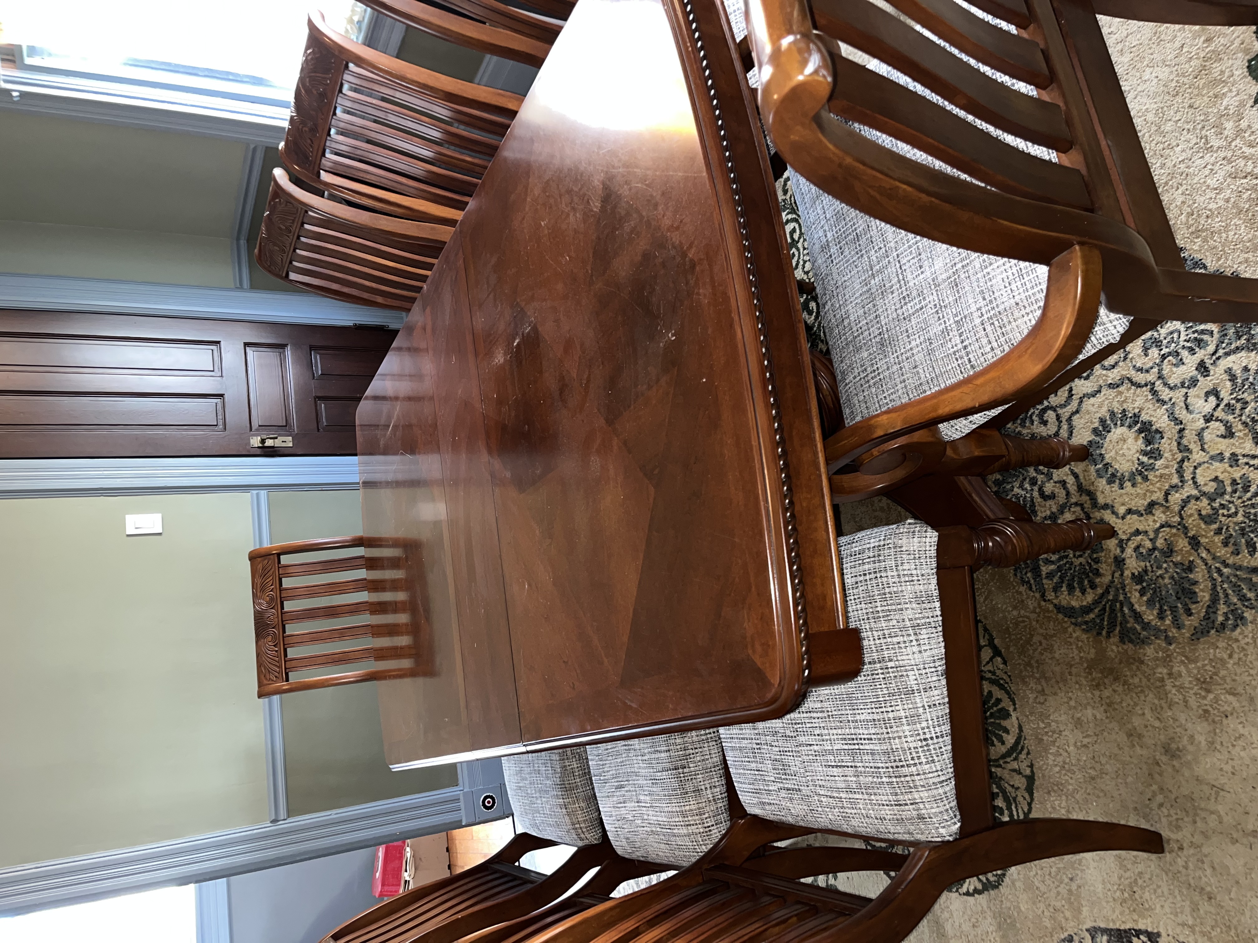 Dining set is manufactured by Legacy Classic Furniture designed in a contemporary traditional revival style with a twin pedestal base, with each pedestal consisting of a spirally carved central column on a shaped platform with out-swept legs. The table includes two removable leafs. The matching chairs feature high backs with vertical slats and a carved top rail depicting a stylized shell and acanthus leaf motif. The front legs of the chairs are spirally carved to coordinate with the table pedestals. The seats are upholstered in a gray and white textured fabric. Table measures 30 inches tall by 80 inches long by 42 inches wide. Must be picked up directly from a home in North Buffalo before April 20