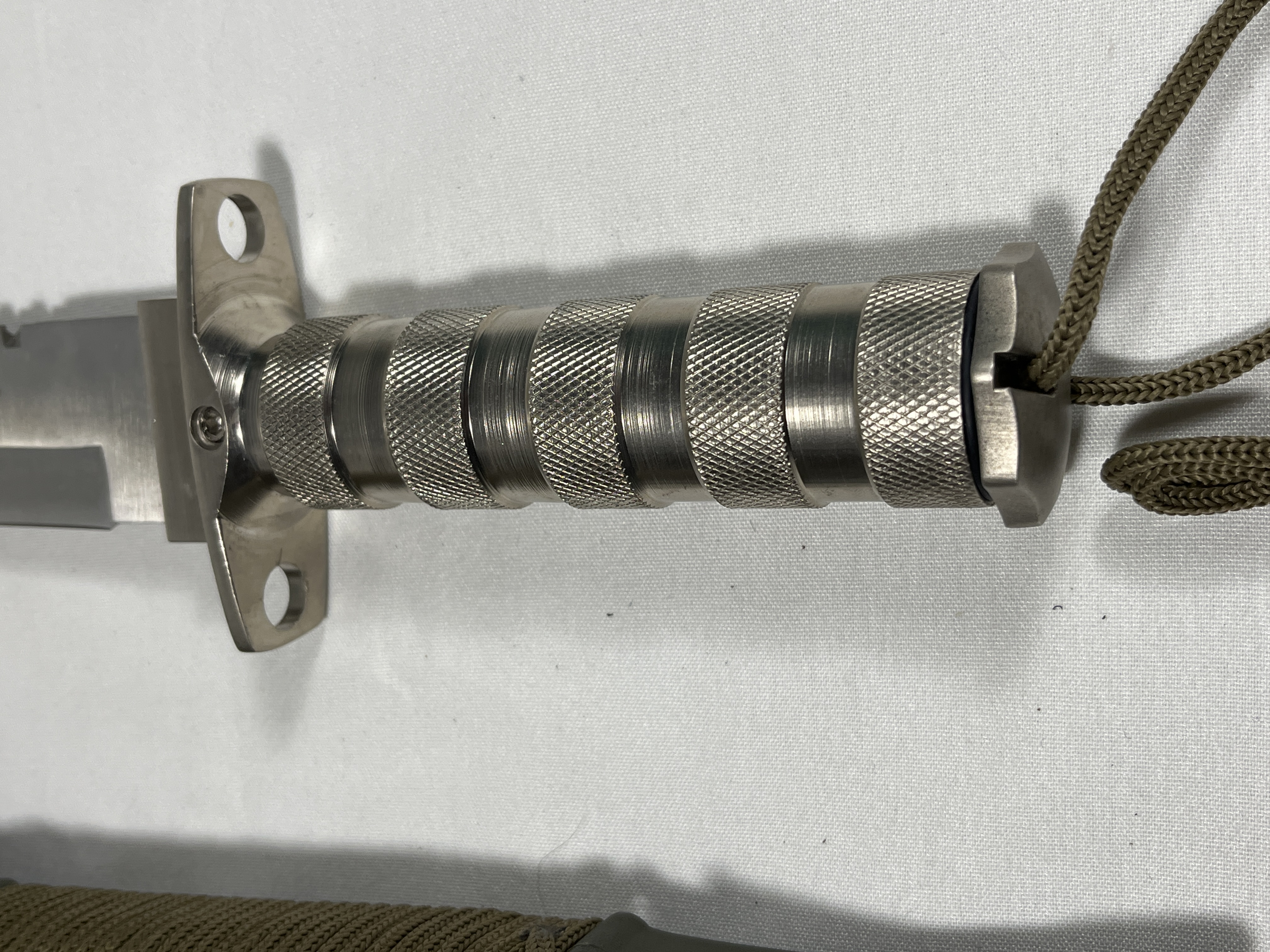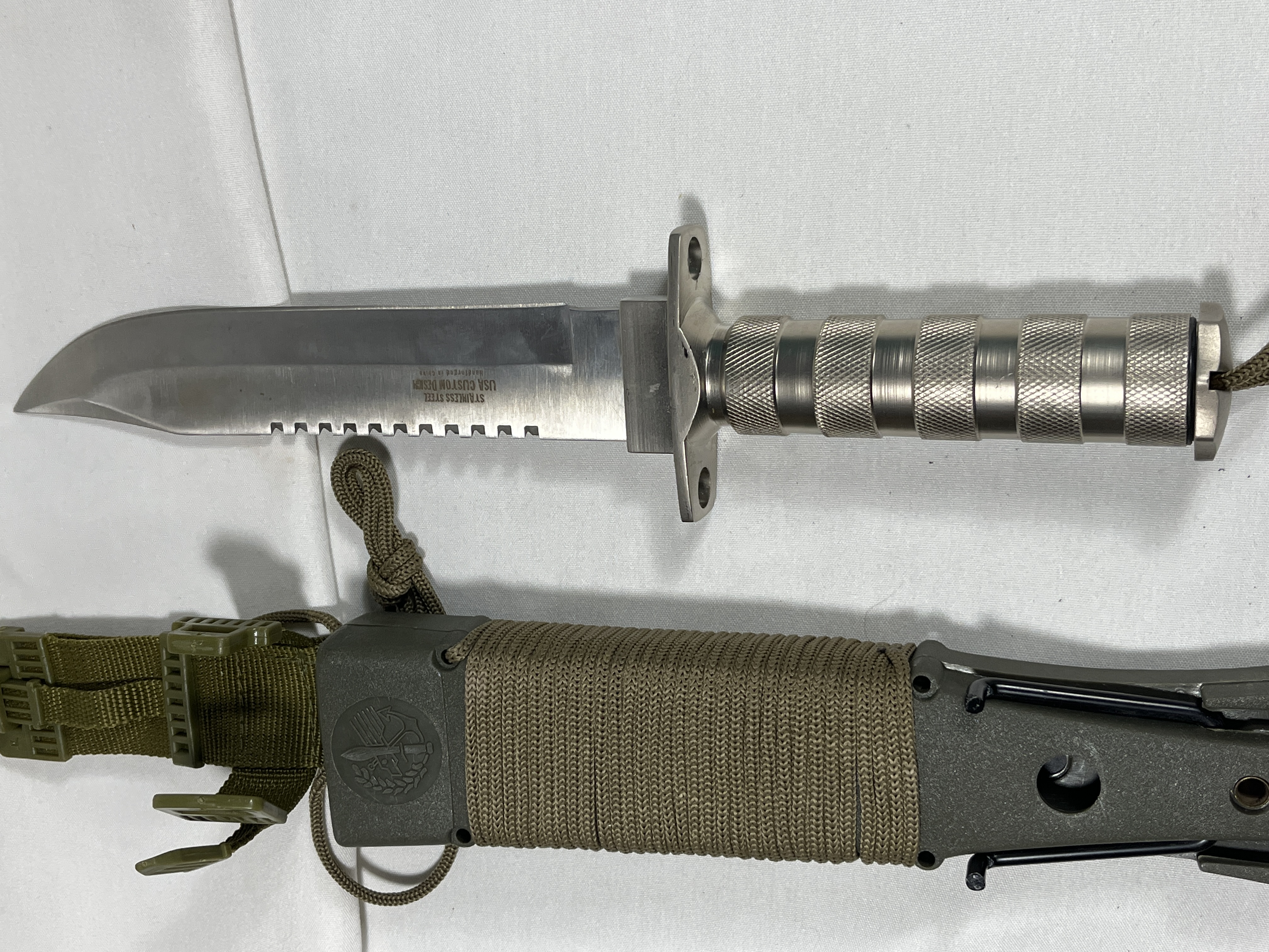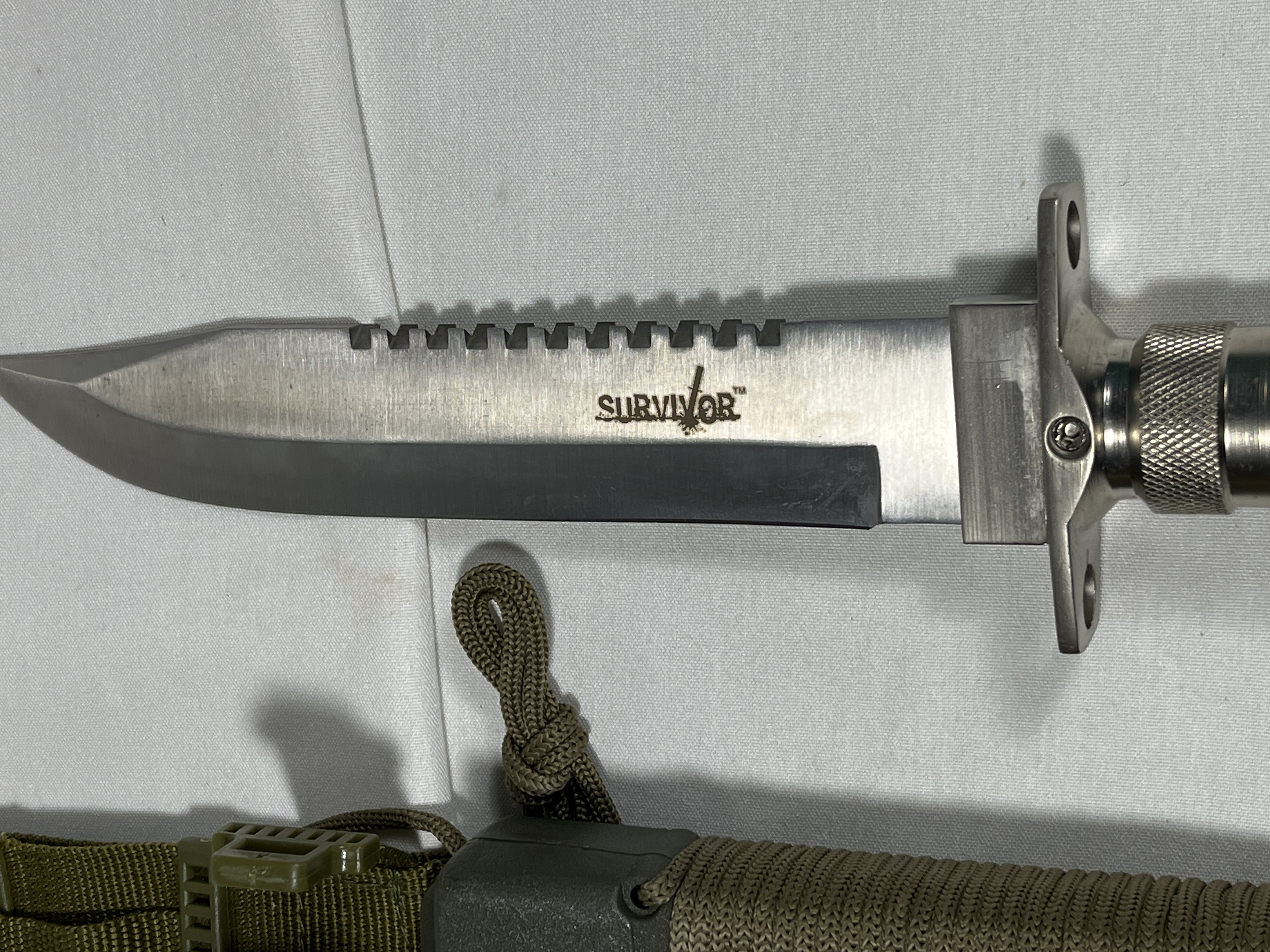 Survivor brand fixed blade survival knife and matching sheath, contemporary. Blade measures 8 inches