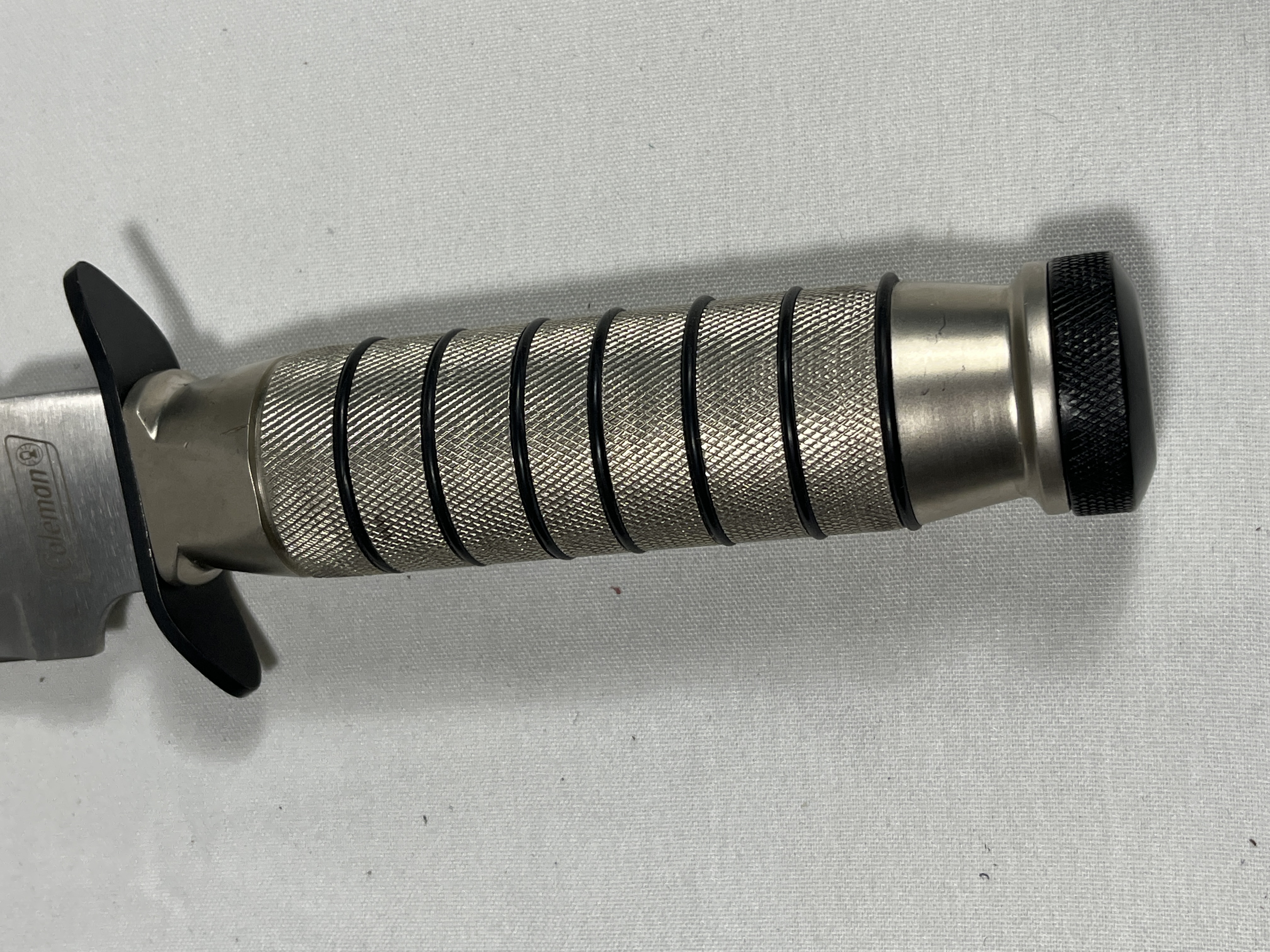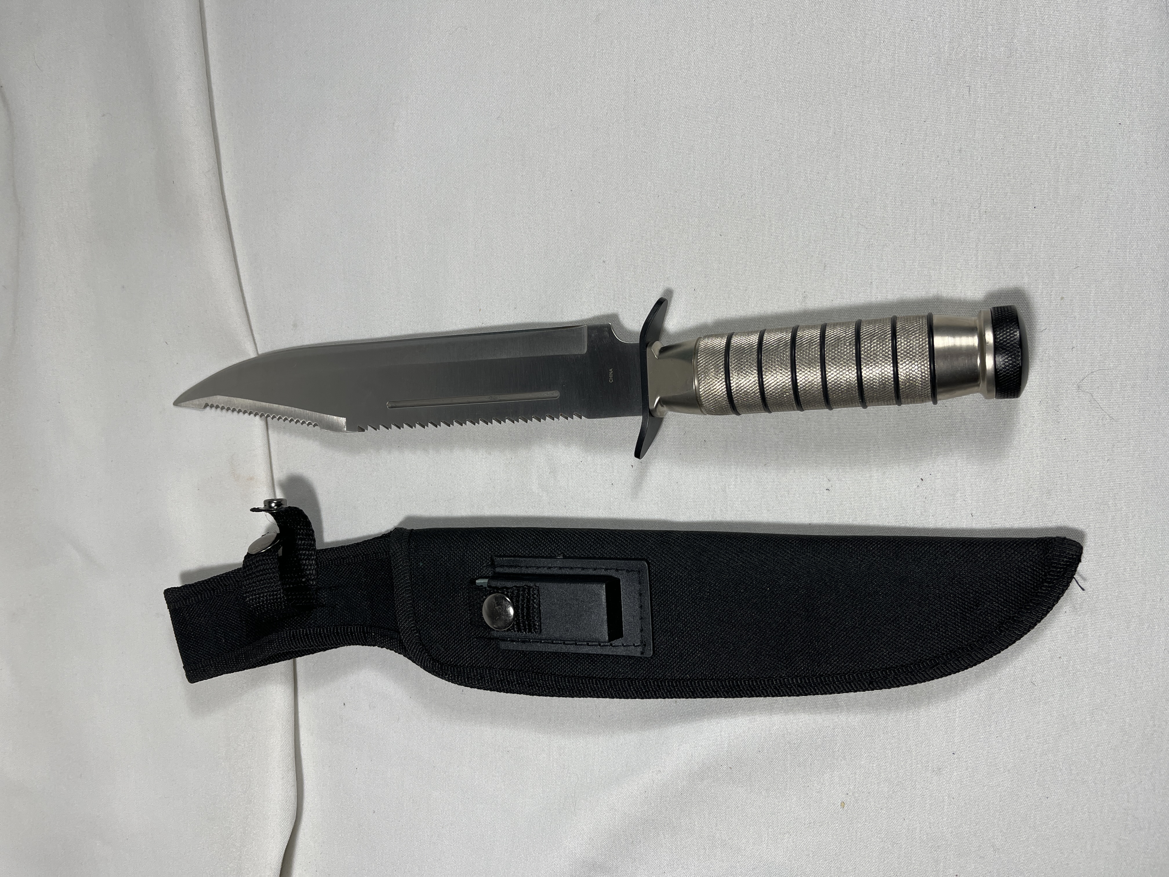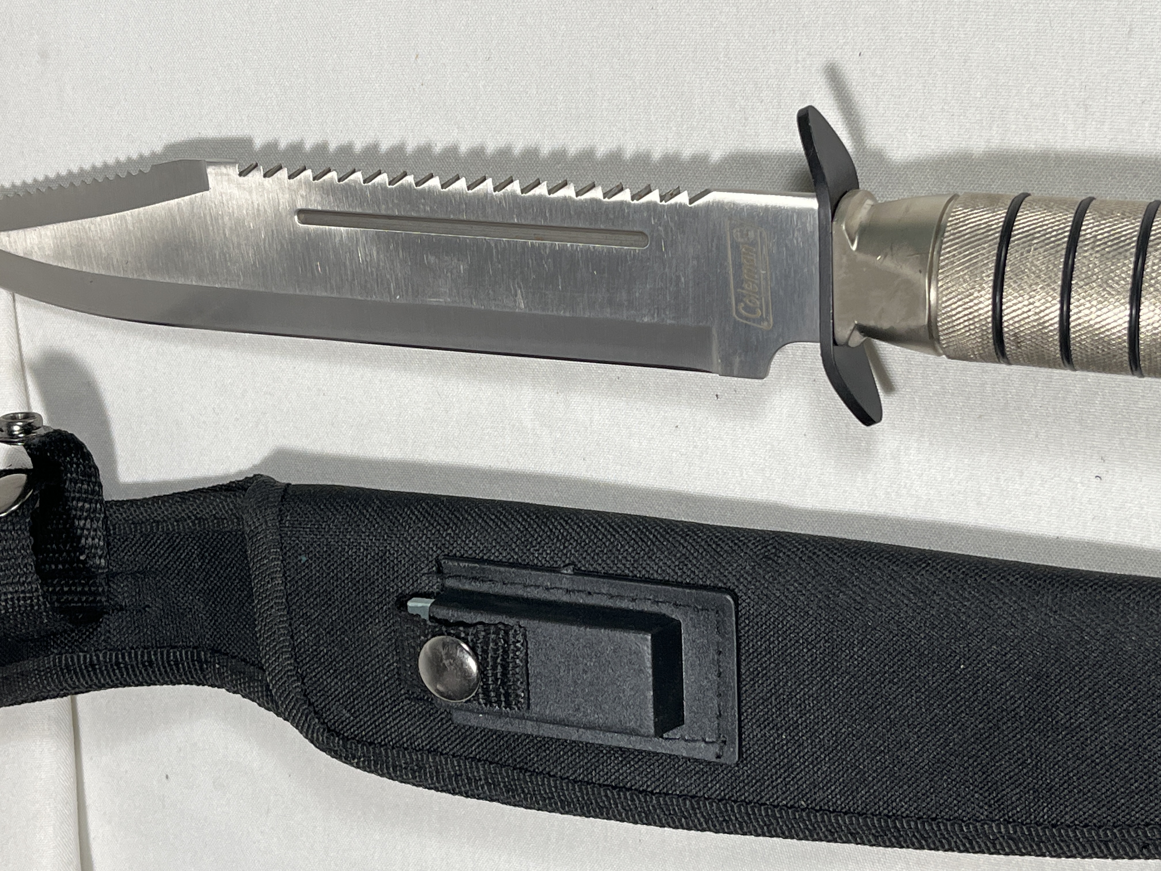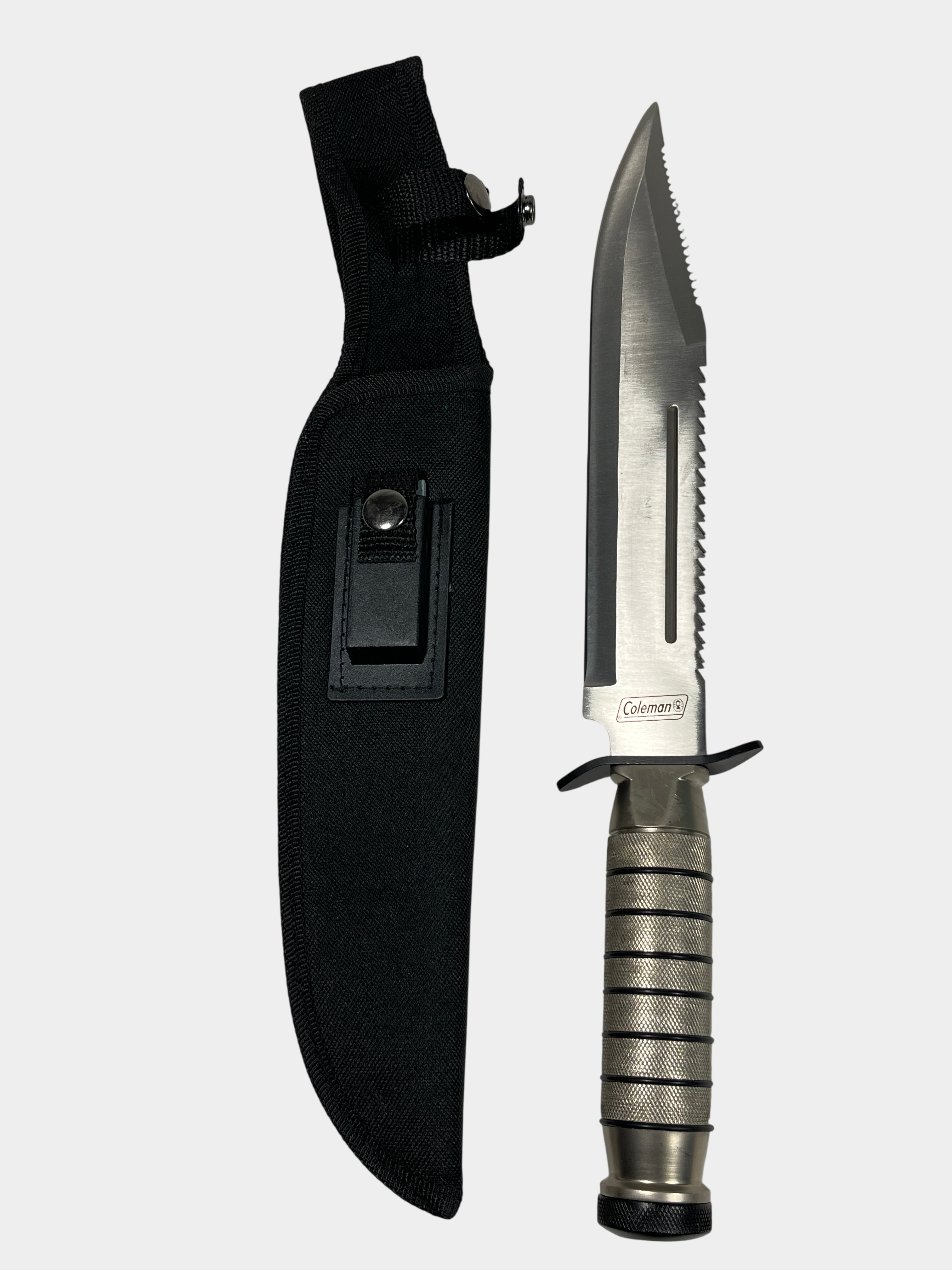 Coleman fixed blade survival knife manufactured in China. Features a stainless steel clip-point blade with a sawback spine, fuller, and knurled metal handle with a screw-on pommel. Blade is 9 inches long