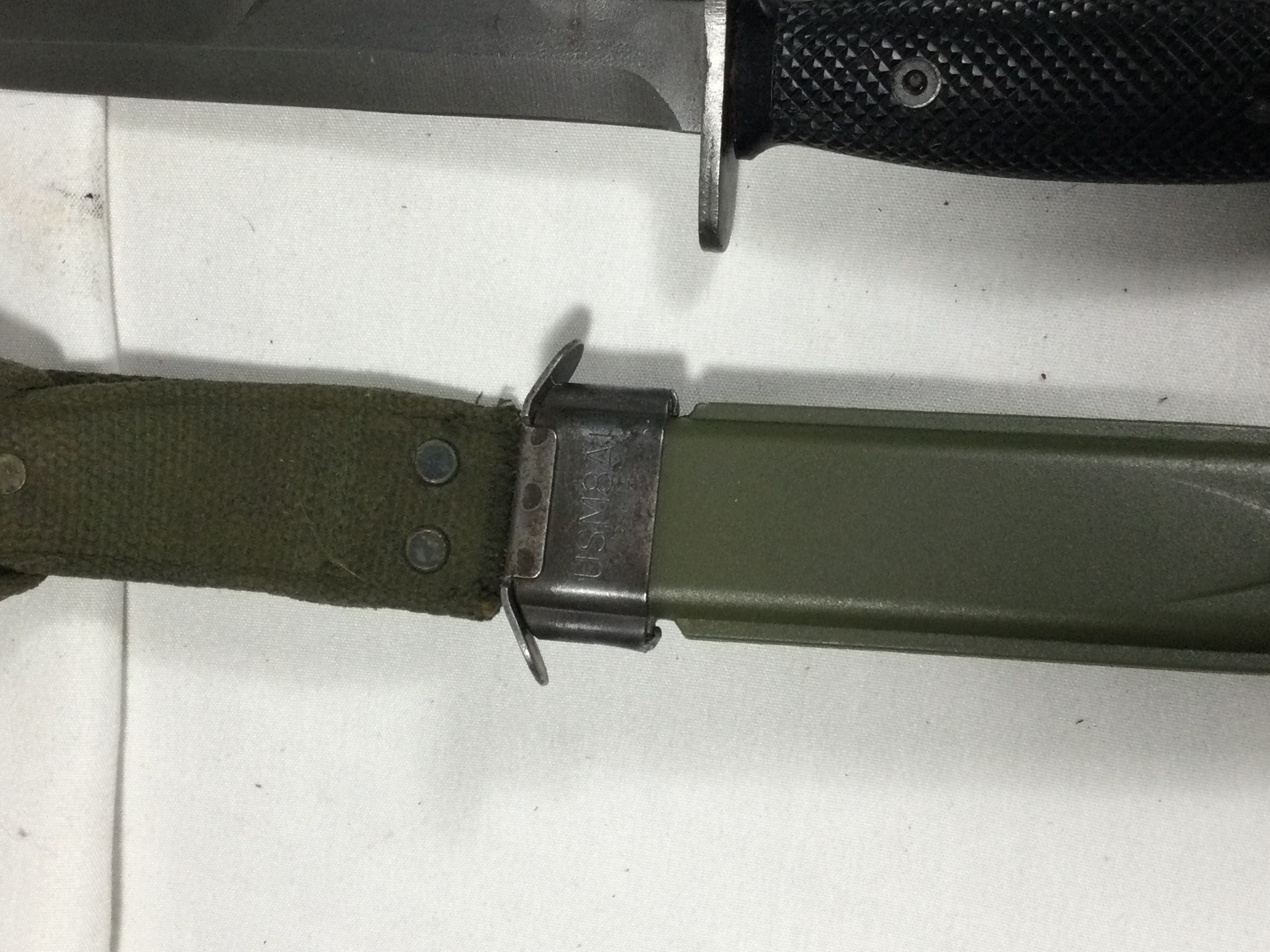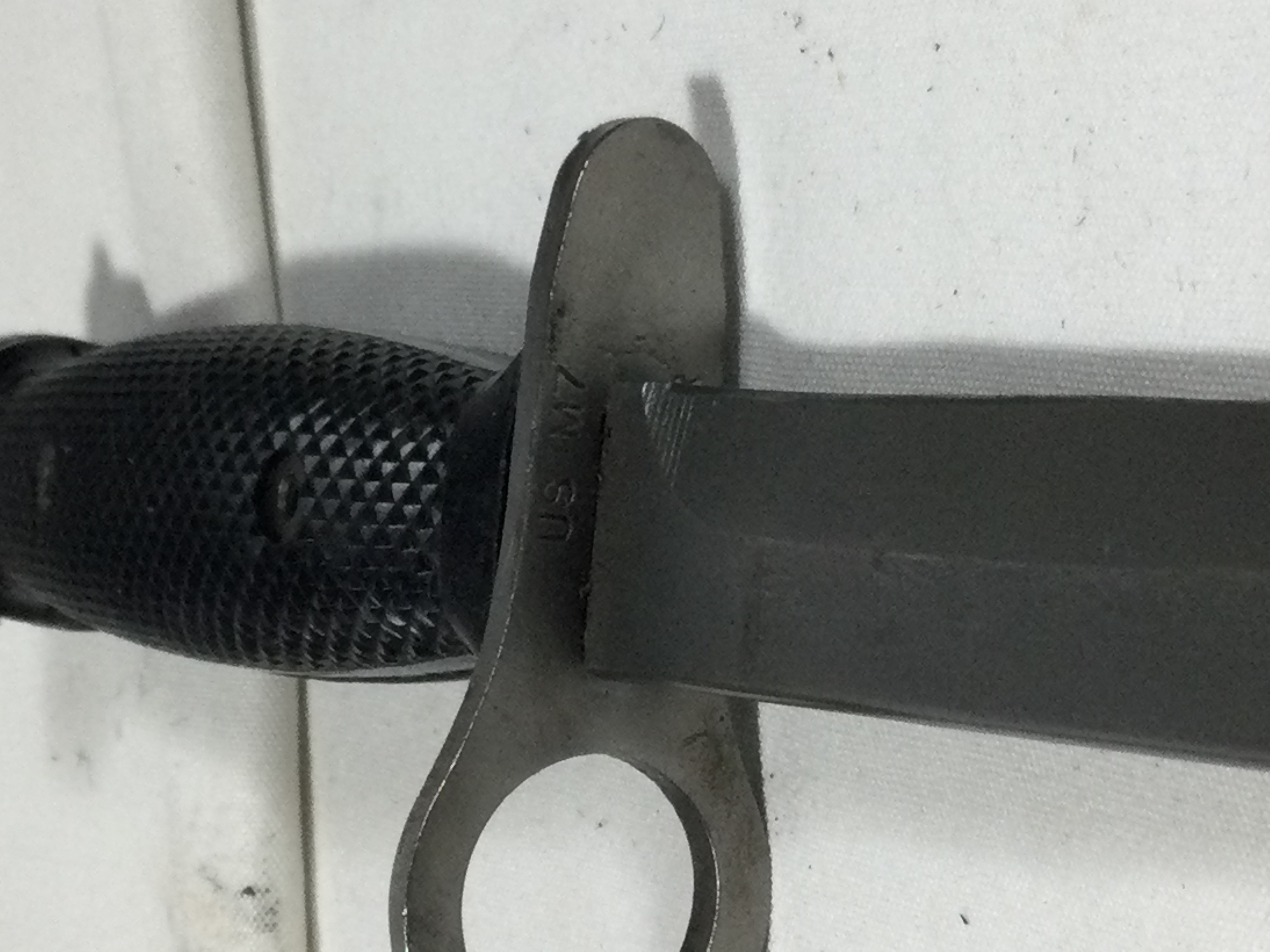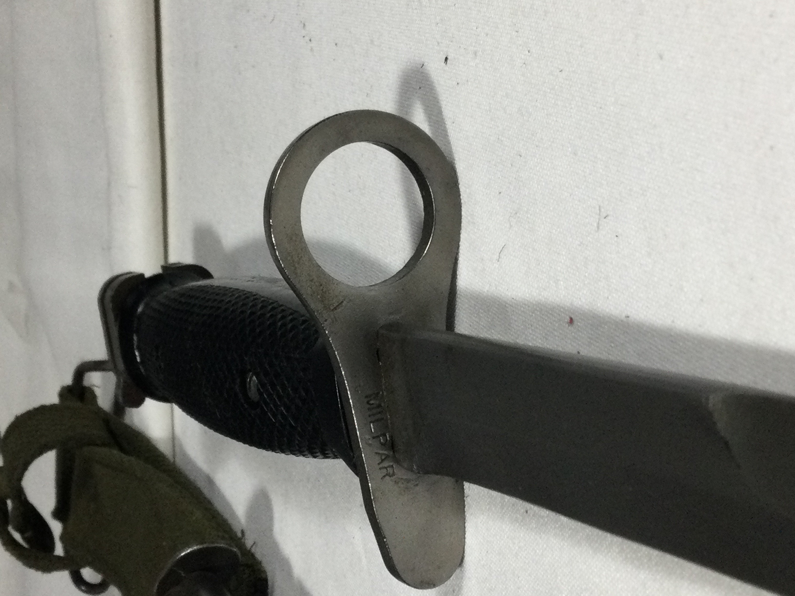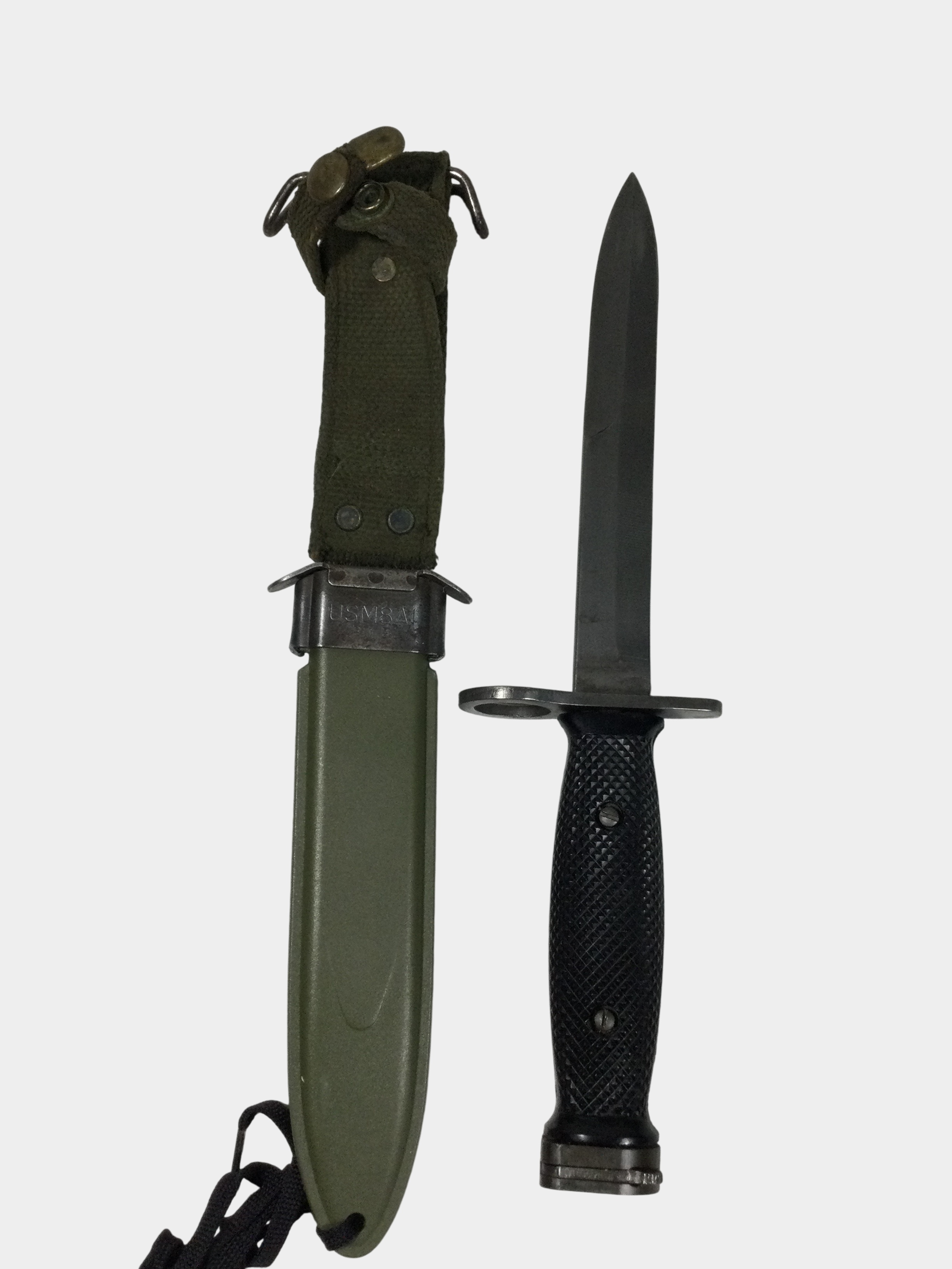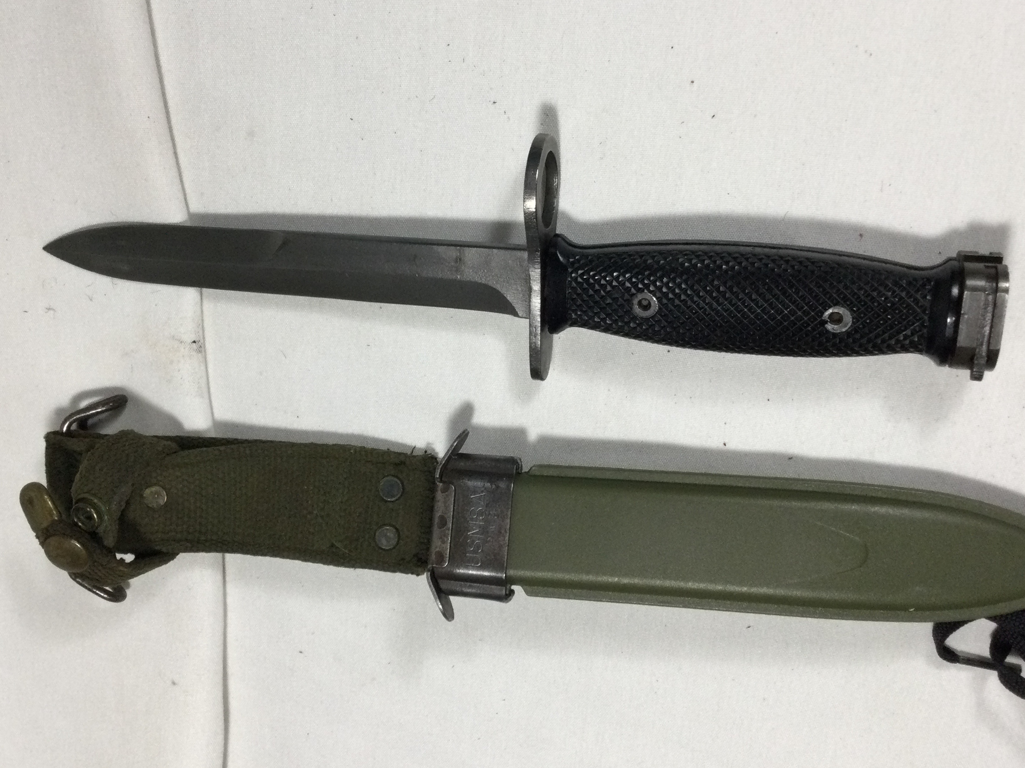 This lot consists of a US Model M7 bayonet and a US Model M8A1 scabbard. The M7 bayonet features a spear-point blade with a parkerized matte finish. The hilt is composed of a steel crossguard with an integrated muzzle ring and two-piece black checkered plastic grips secured by two slotted screws. The pommel is fitted with a spring-loaded dual-lever latching mechanism for attachment to a rifle bayonet lug. Blade measures 7 inches