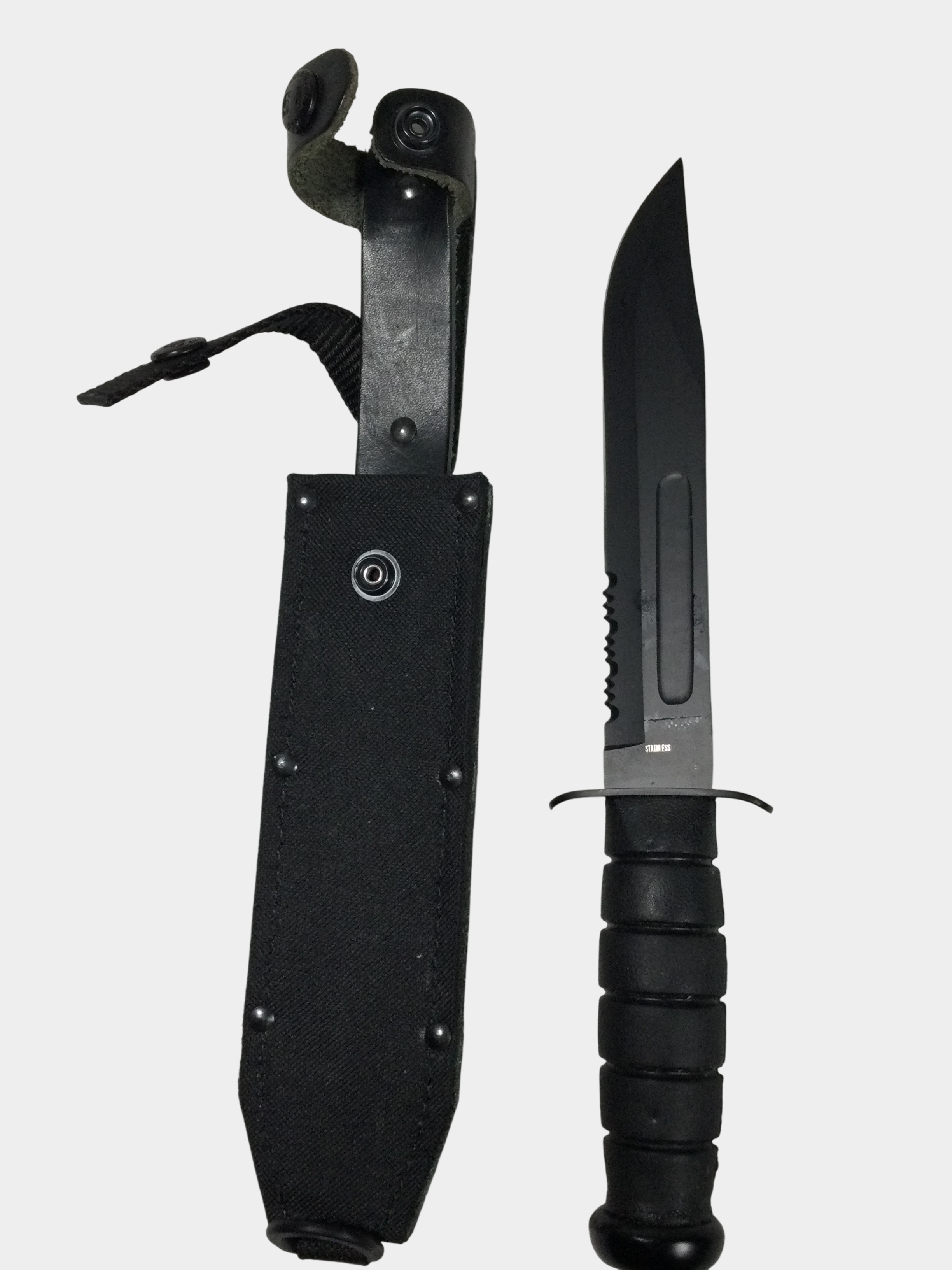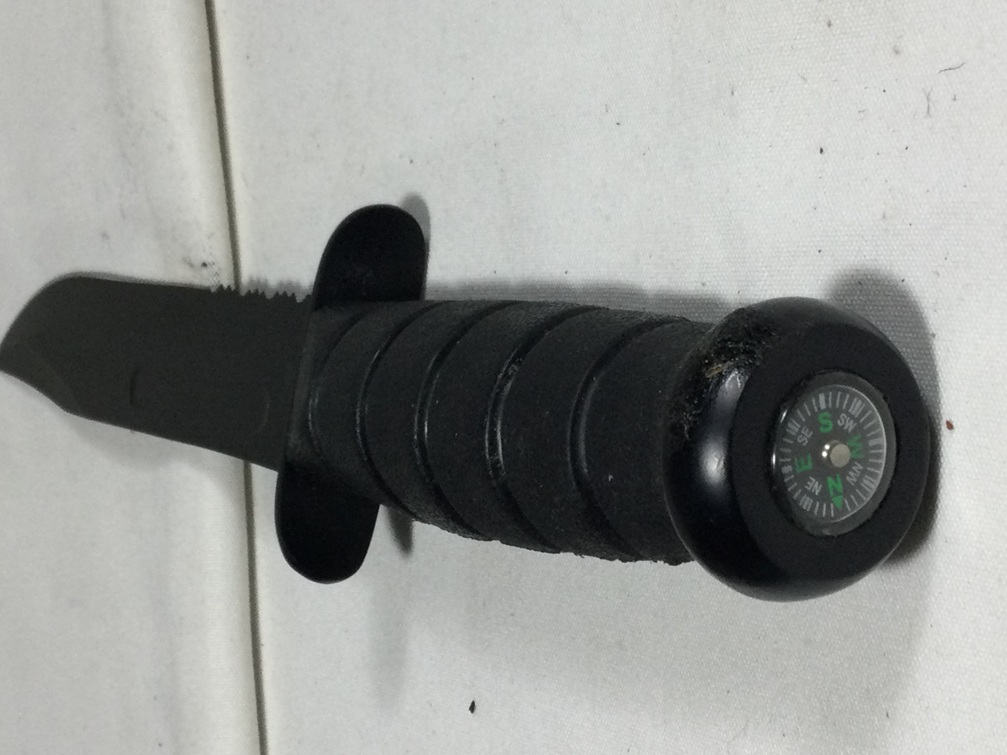 This is a fixed blade tactical survival knife featuring a clip-point blade with a black coating. The blade design includes a fuller and a serrated section along the spine. The handle is constructed from a black ribbed synthetic material, likely rubberized plastic, designed for a secure grip. It features a black double-quillon crossguard and a rounded pommel. A small liquid-filled directional compass is inset into the pommel. The ricasso is stamped vertically with STAINLESS on one side and an illegible five-character mark on the reverse. The knife is paired with a black nylon and synthetic leather sheath that includes a snap-closure retention strap and a belt loop.