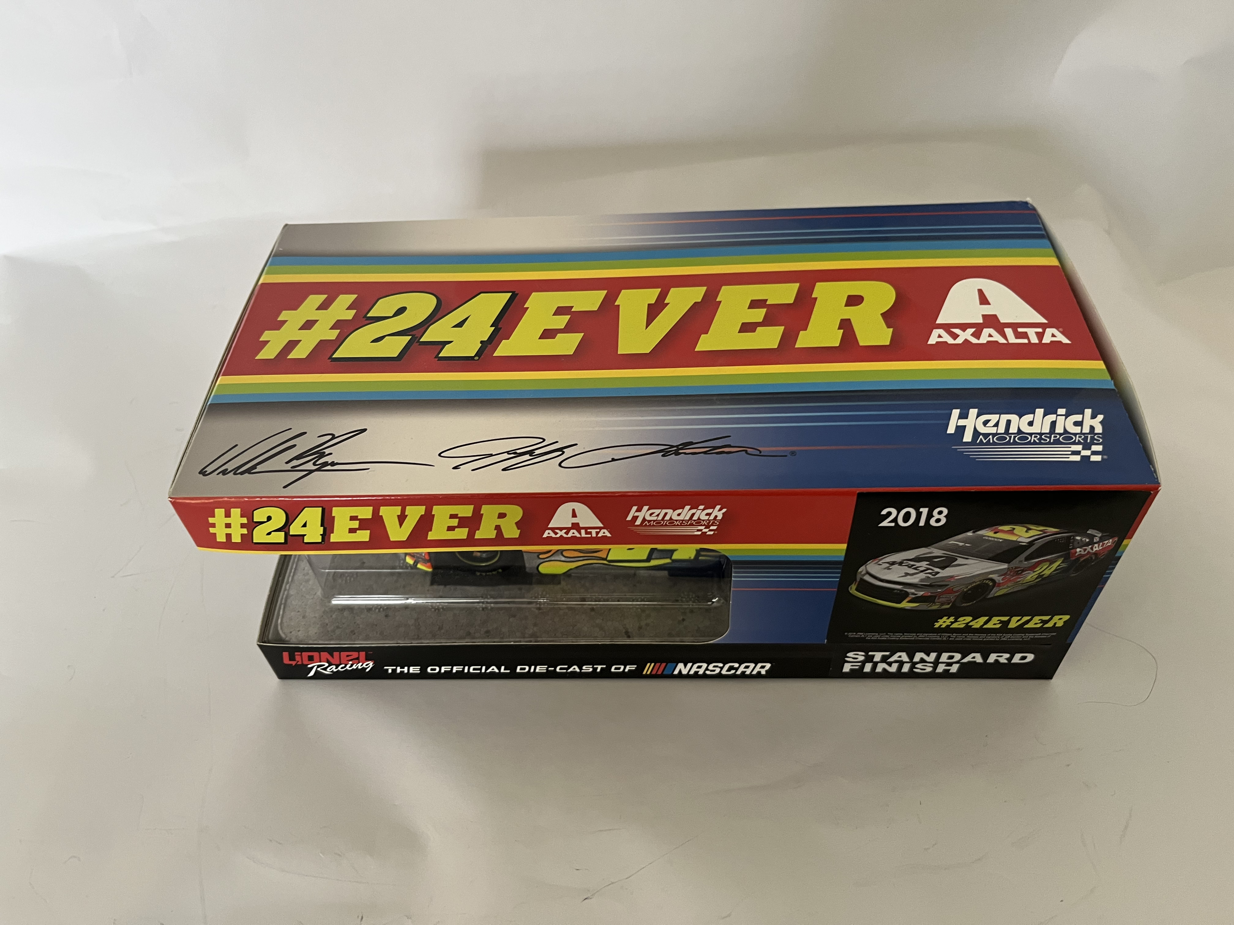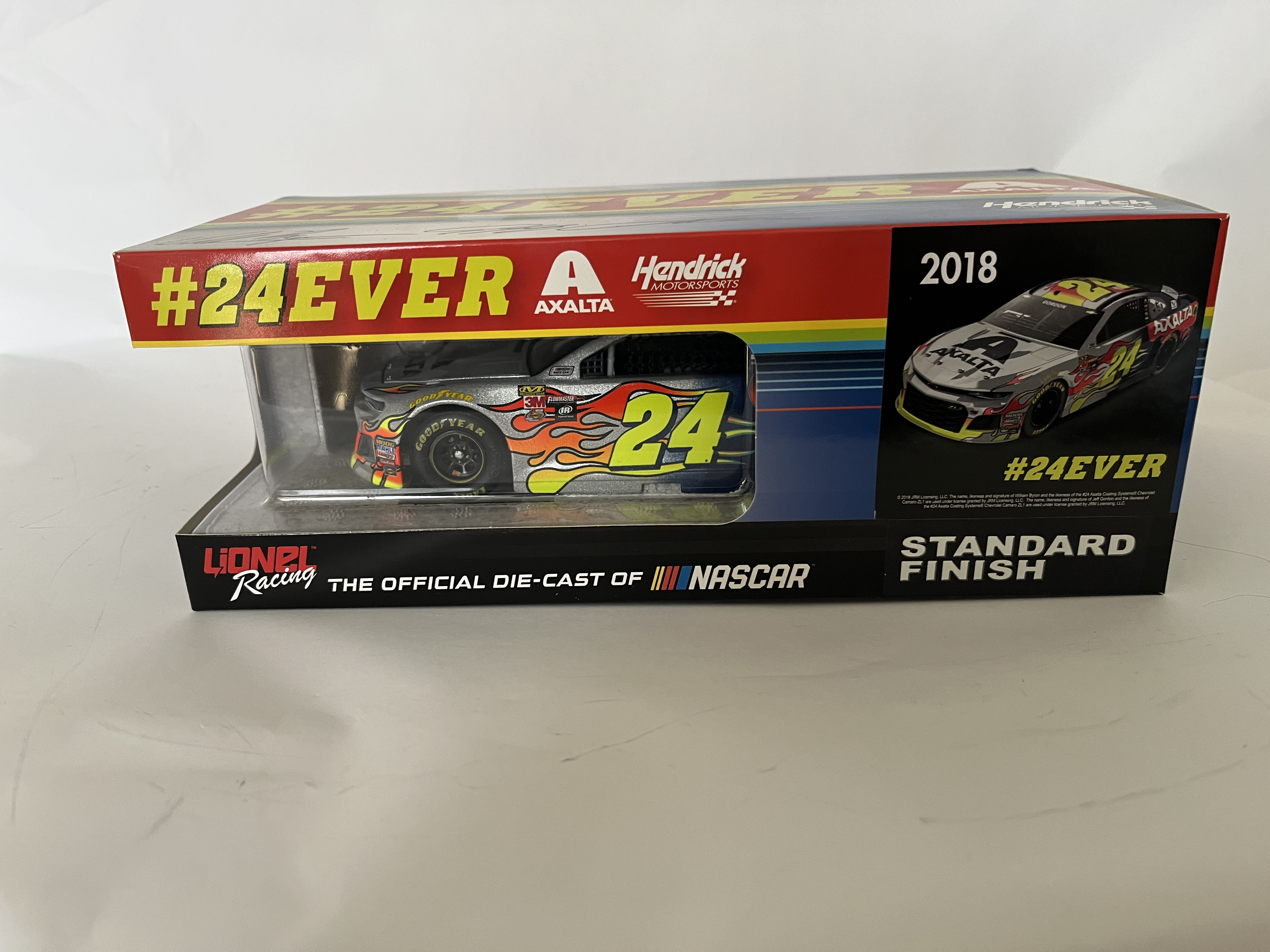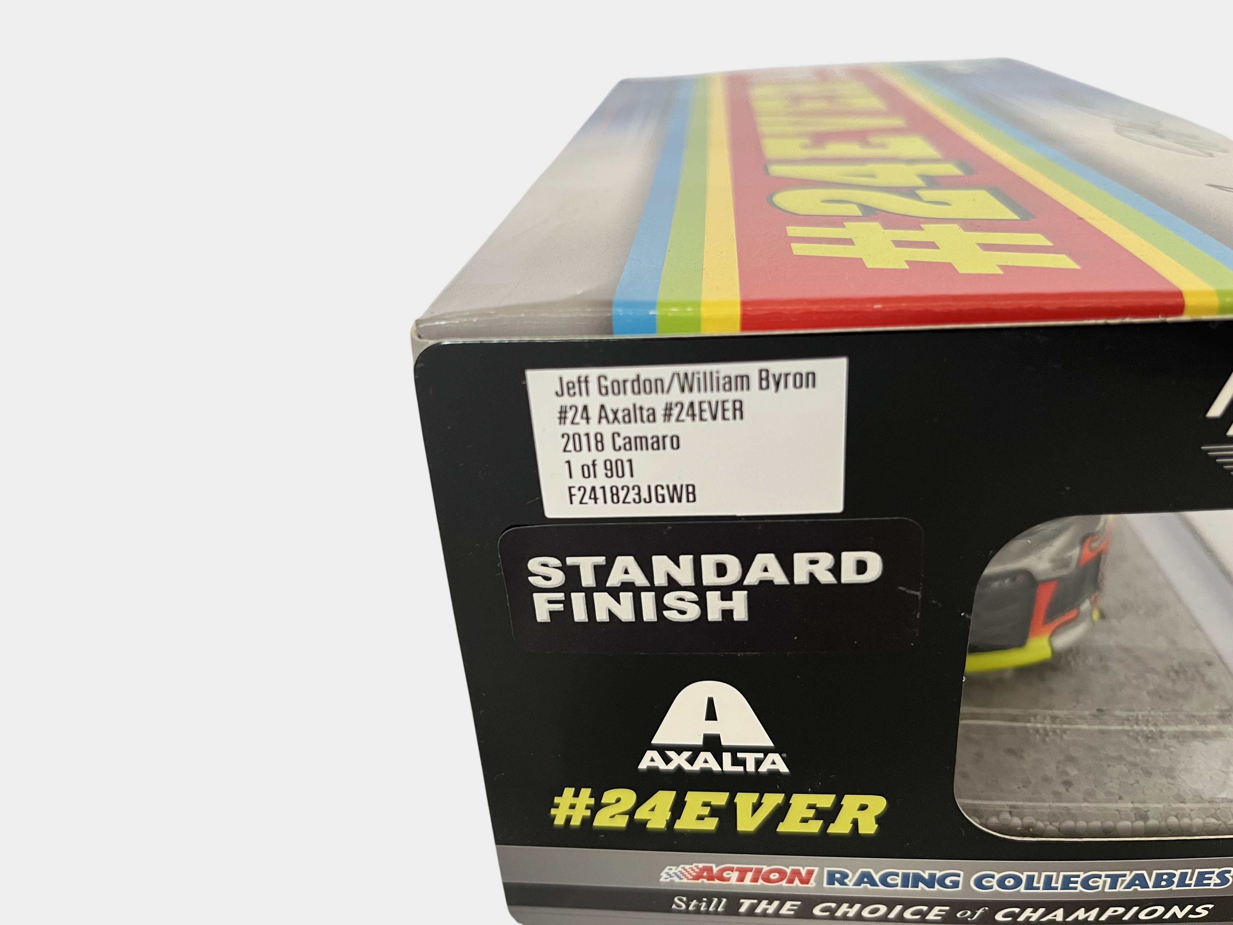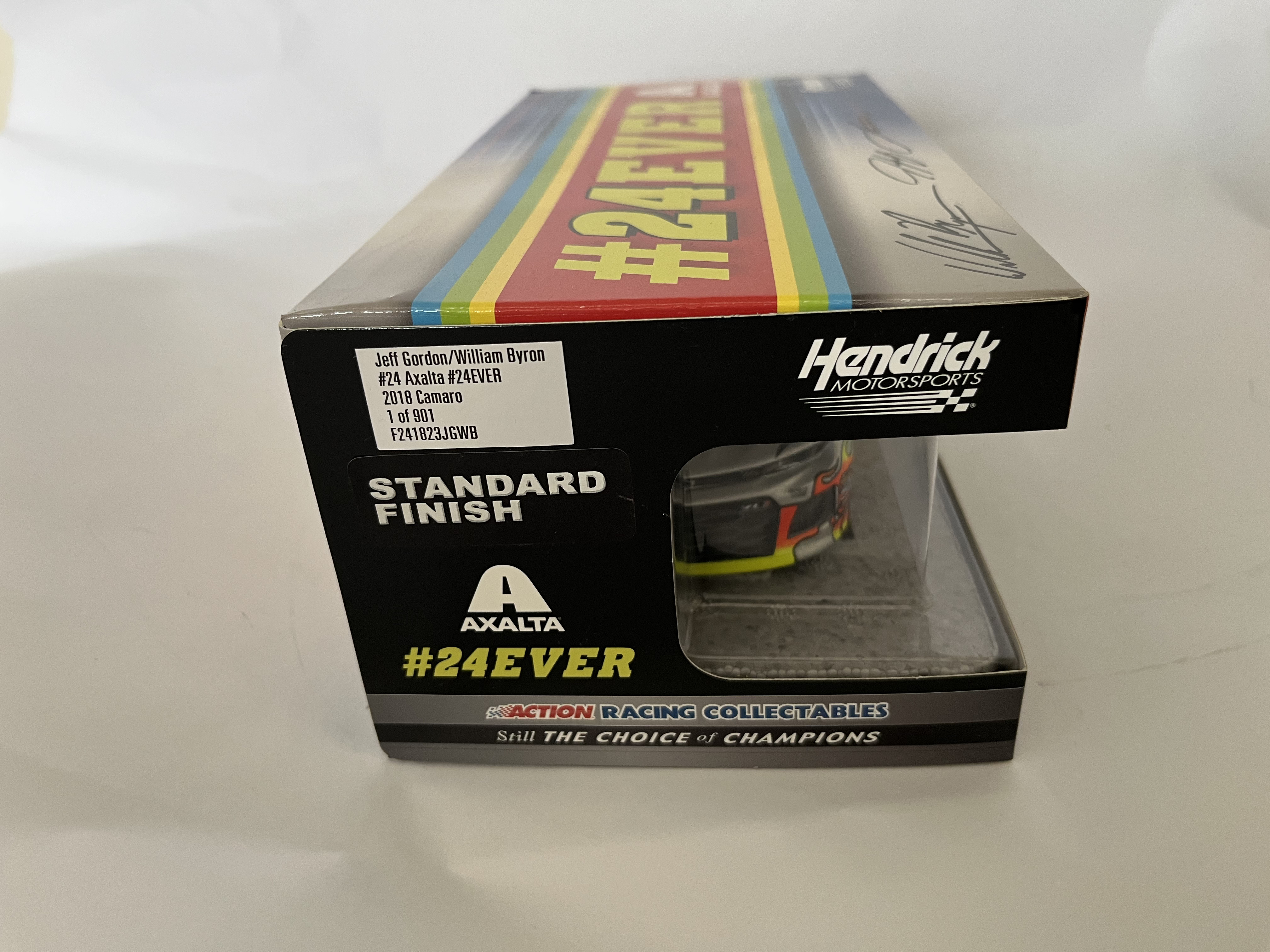 This is a 1:24 scale die-cast model of a 2018 Chevrolet Camaro ZL1 produced by Lionel Racing under the Action Racing Collectables brand. The car features the number 24 and the Axalta #24EVER commemorative paint scheme, which celebrates the legacy of the number 24 car driven by Jeff Gordon and William Byron for Hendrick Motorsports. The vehicle has a silver standard finish adorned with yellow and orange flame graphics. The original window box displays various logos including Axalta, Hendrick Motorsports, and Lionel Racing. A production label on the side of the box identifies the item as part of a limited edition run, numbered 1 of 901, with the part number F241823JGWB. The top of the packaging features two signatures attributed to William Byron and Jeff Gordon. No Certificate of Authenticity or third-party authentication is present to verify these signatures as hand-signed versus factory-applied facsimiles.