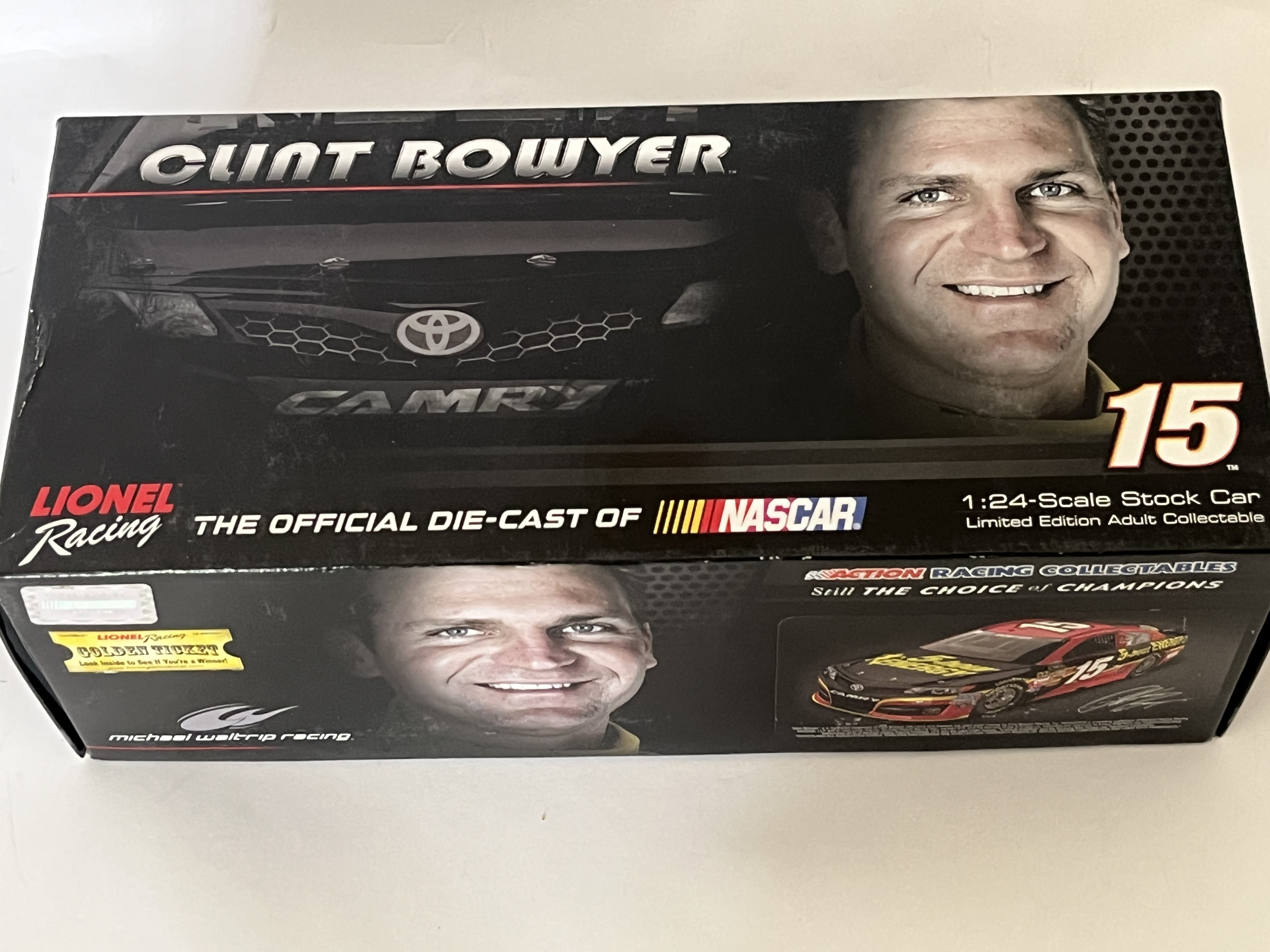 This is a 1:24 scale die-cast stock car of the number 15 Toyota Camry driven by Clint Bowyer for Michael Waltrip Racing during the 2014 NASCAR season. The collectible was produced by Lionel Racing under the Action Racing Collectables brand. The car features the signature black and red livery associated with primary sponsor 5-hour ENERGY. The front windshield bears a hand-signed signature in silver-tone marker by Clint Bowyer. The model is constructed with a die-cast metal body and features a detailed interior, opening hood and trunk, Goodyear branded tires, and authentic sponsor decals. The item is housed in its original manufacturer packaging, which includes a decorative outer box featuring driver imagery and a Michael Waltrip Racing logo, along with a protective two-piece styrofoam insert. A Lionel Racing Golden Ticket promotional sticker is affixed to the side of the box.