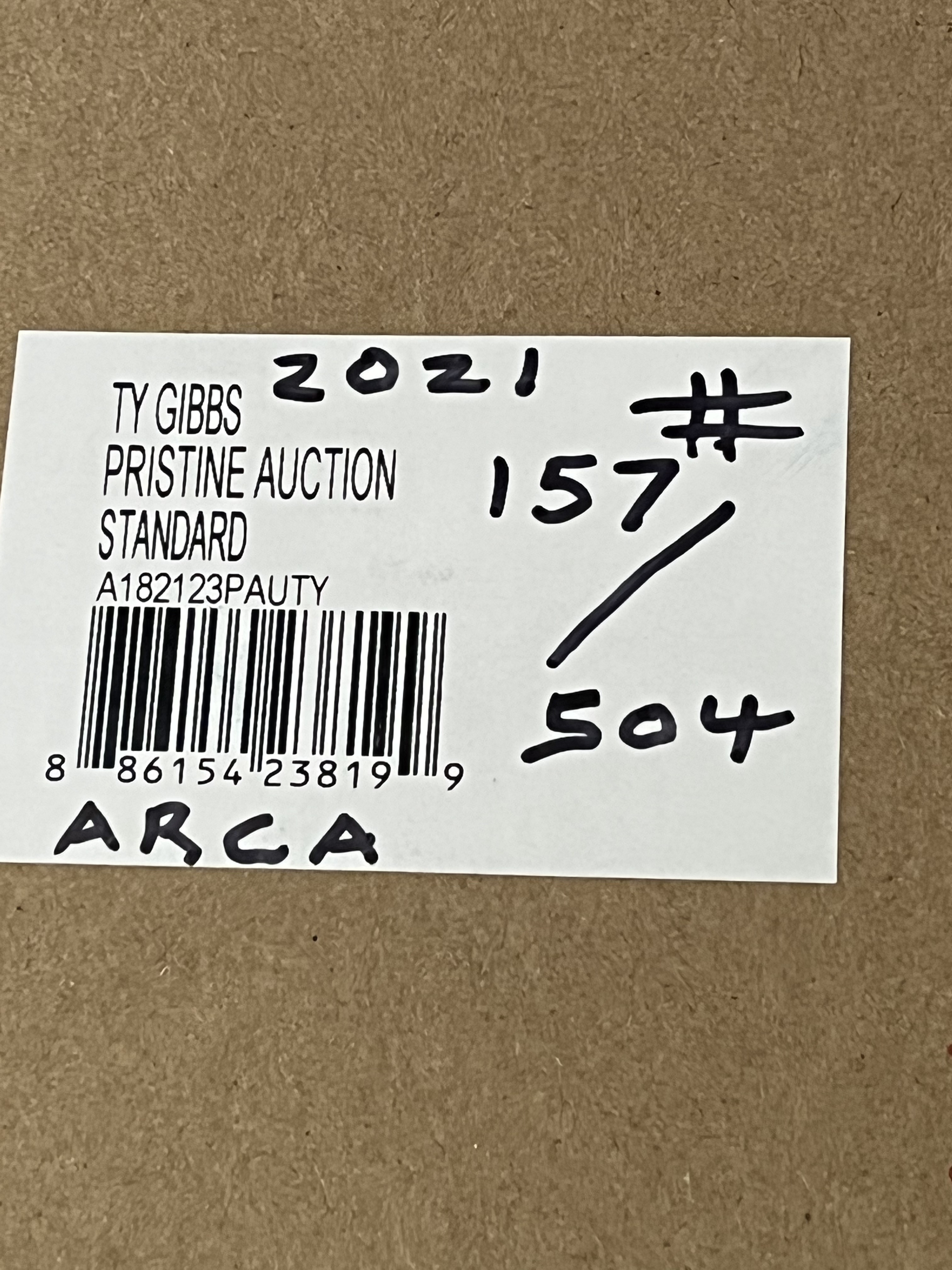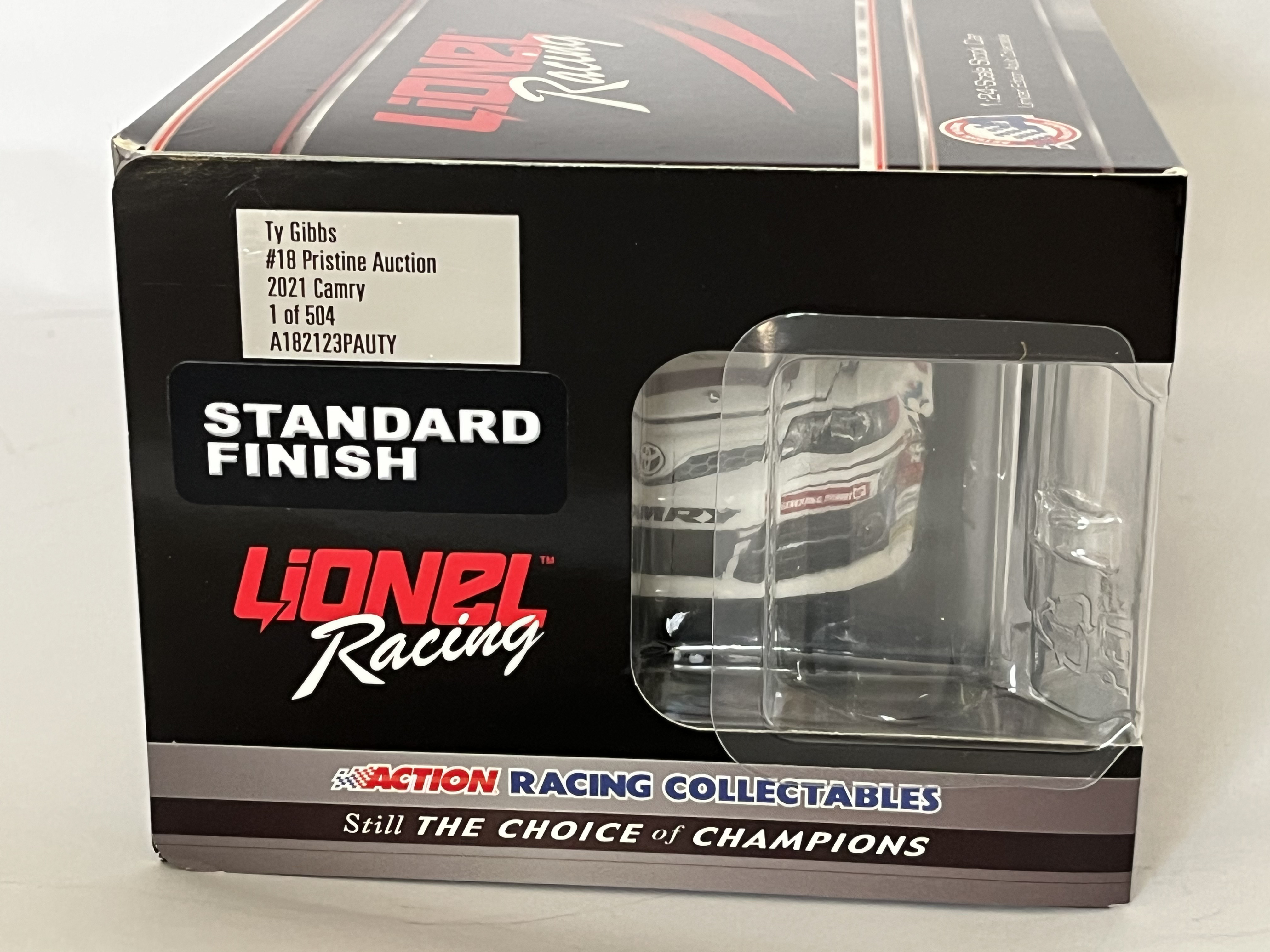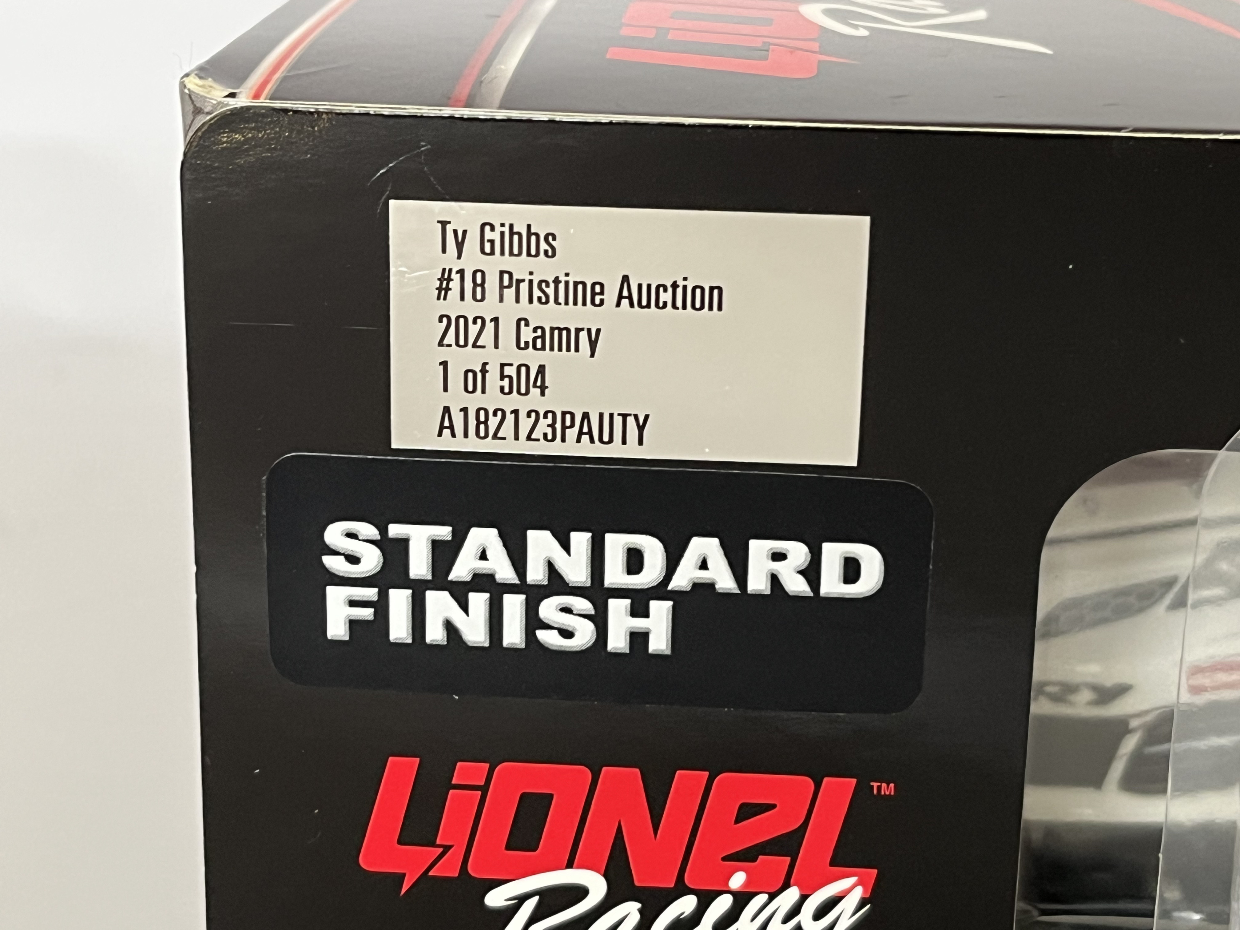# 157/504, Lionel Racing Action Racing Collectables 1:24 scale die-cast model of the Ty Gibbs #18 Pristine Auction 2021 Toyota Camry. The vehicle is constructed from die-cast metal with plastic components and features a standard finish. The car is decorated in a white and maroon livery with primary sponsorship from Pristine Auction and additional decals for Menards, ARCA, and General Tire. An adhesive label on the box end identifies the item as Ty Gibbs, #18 Pristine Auction, 2021 Camry, and specifies it is part of a limited edition of 504 units with the part number A182123PAUTY. The packaging includes a holographic NASCAR authentication sticker with the code BB21036648 VTJ. The model is housed in its original Lionel Racing branded window box.