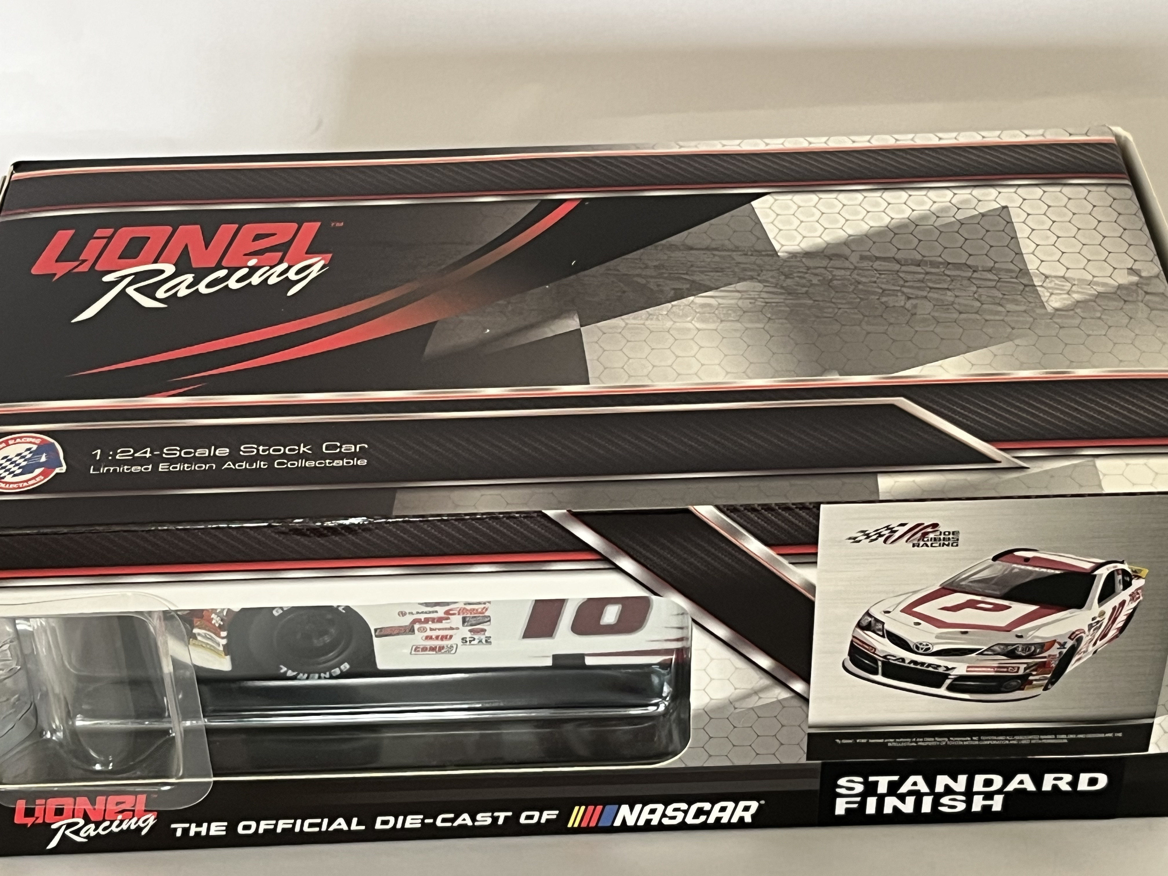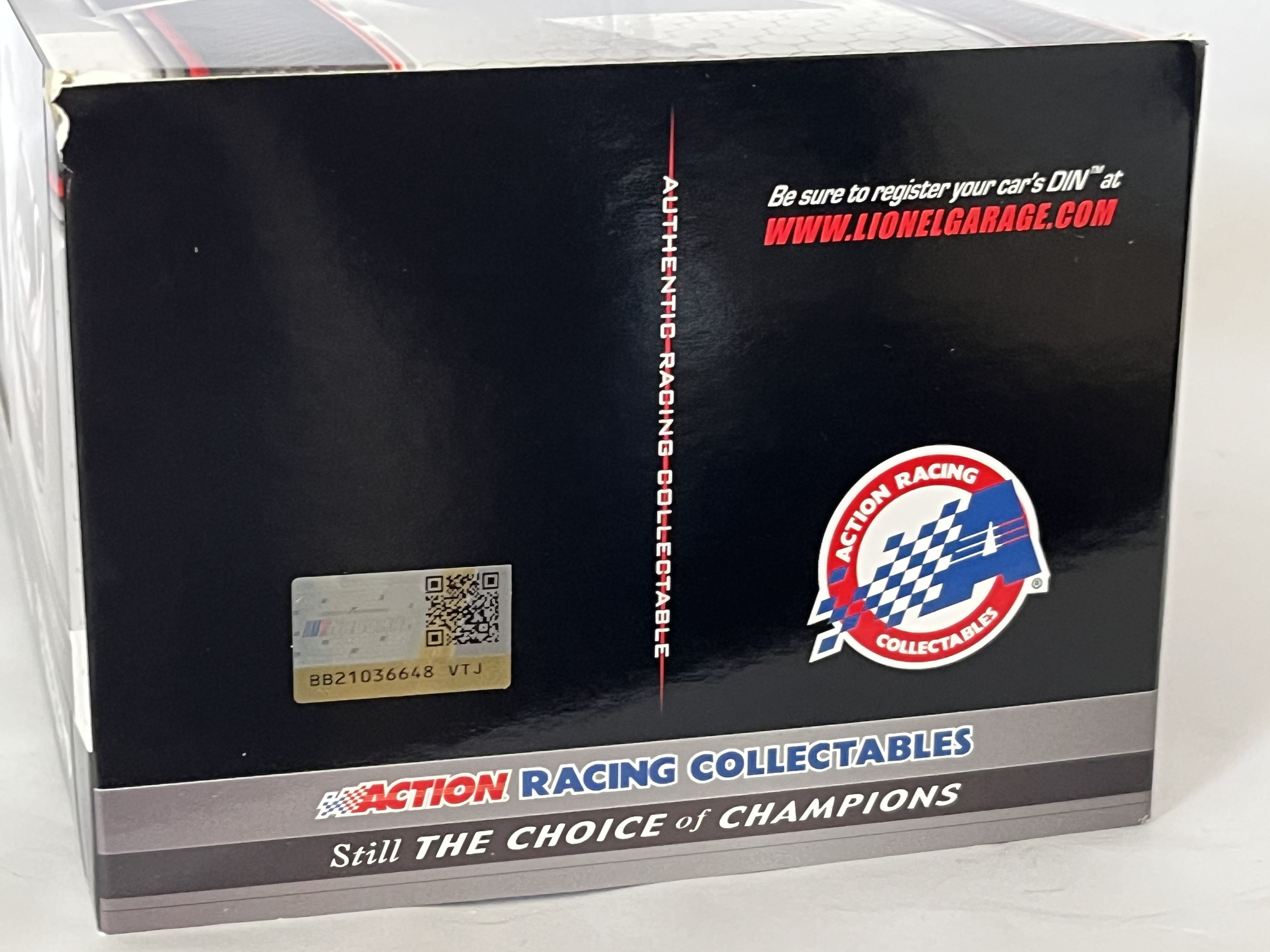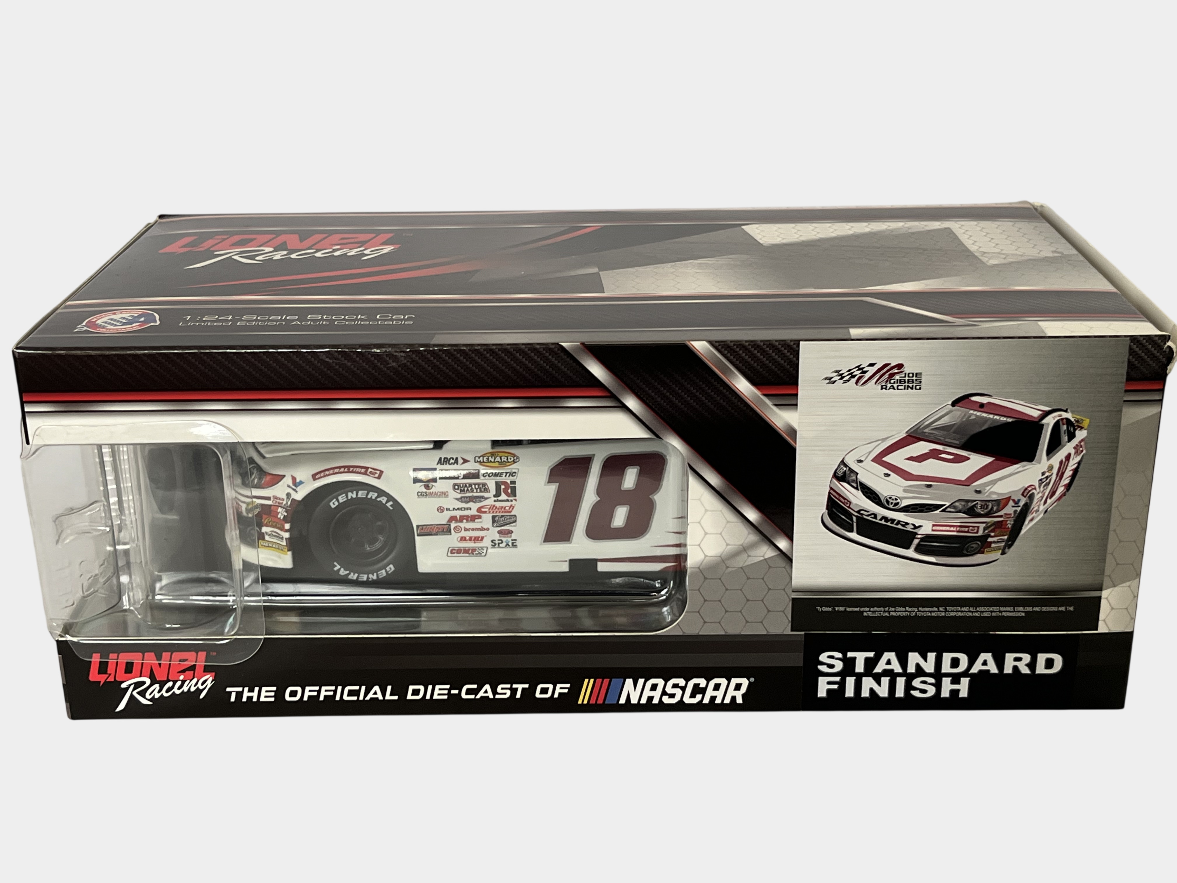 # 157/504, Lionel Racing Action Racing Collectables 1:24 scale die-cast model of the Ty Gibbs #18 Pristine Auction 2021 Toyota Camry. The vehicle is constructed from die-cast metal with plastic components and features a standard finish. The car is decorated in a white and maroon livery with primary sponsorship from Pristine Auction and additional decals for Menards, ARCA, and General Tire. An adhesive label on the box end identifies the item as Ty Gibbs, #18 Pristine Auction, 2021 Camry, and specifies it is part of a limited edition of 504 units with the part number A182123PAUTY. The packaging includes a holographic NASCAR authentication sticker with the code BB21036648 VTJ. The model is housed in its original Lionel Racing branded window box.