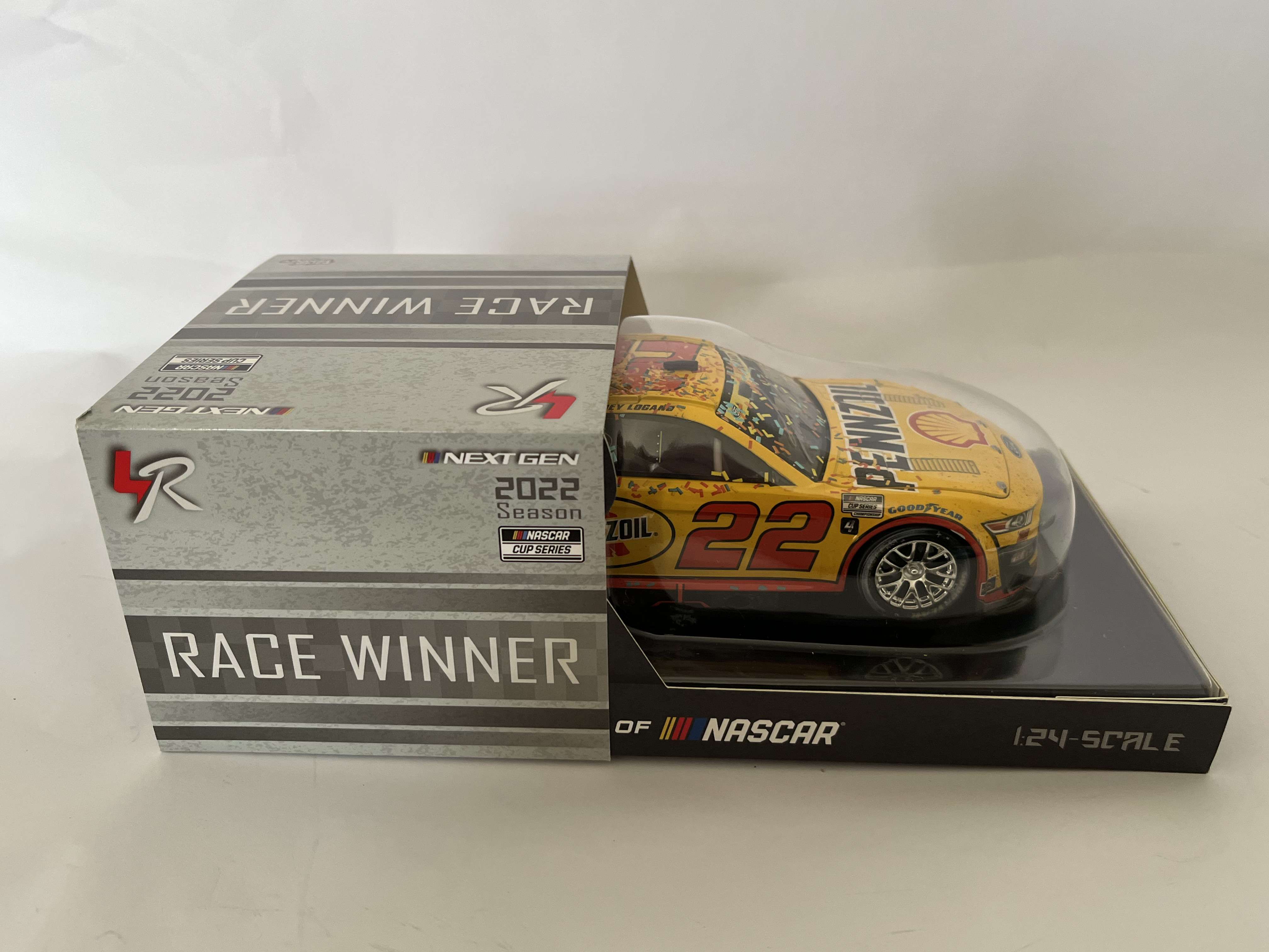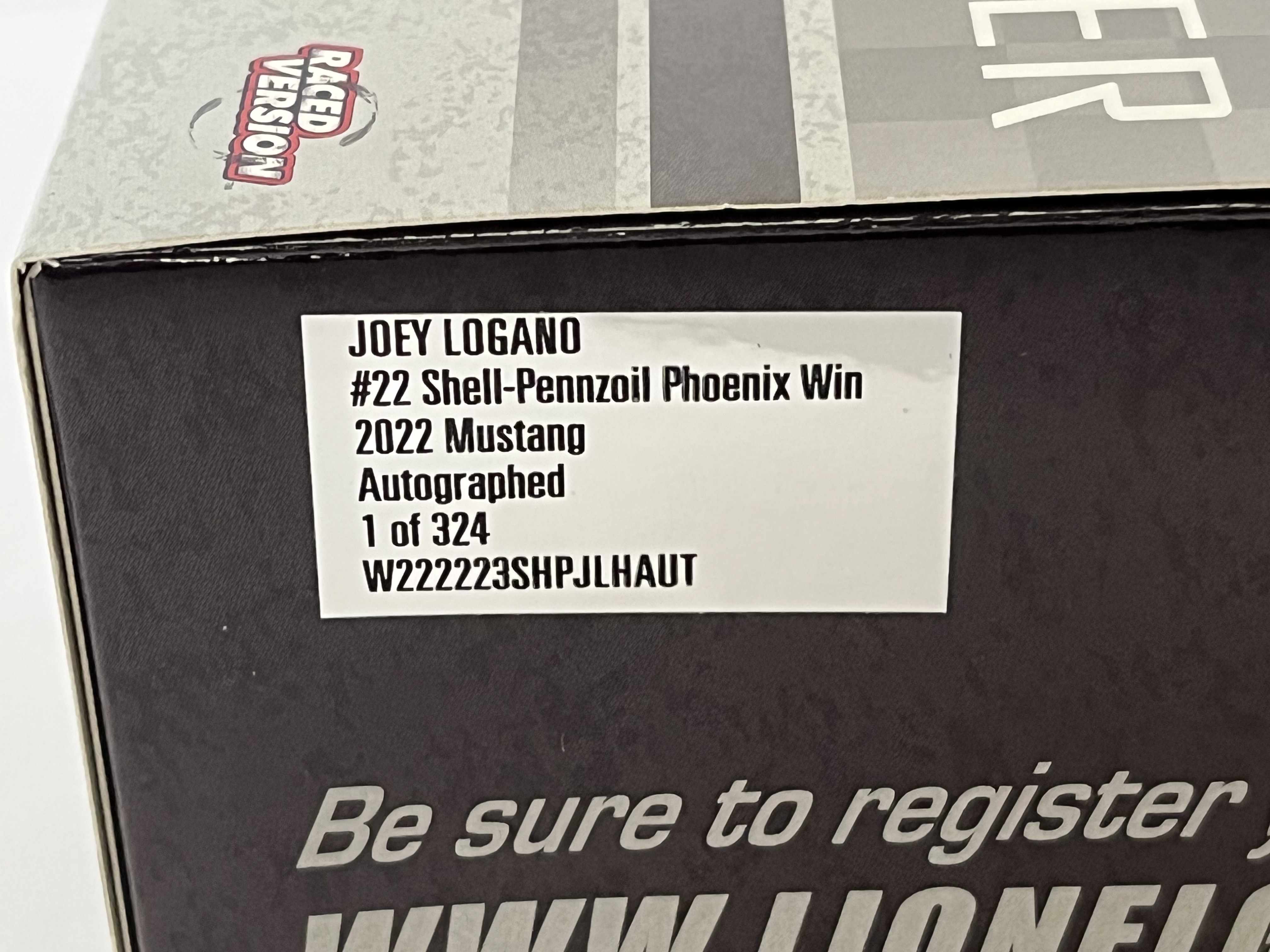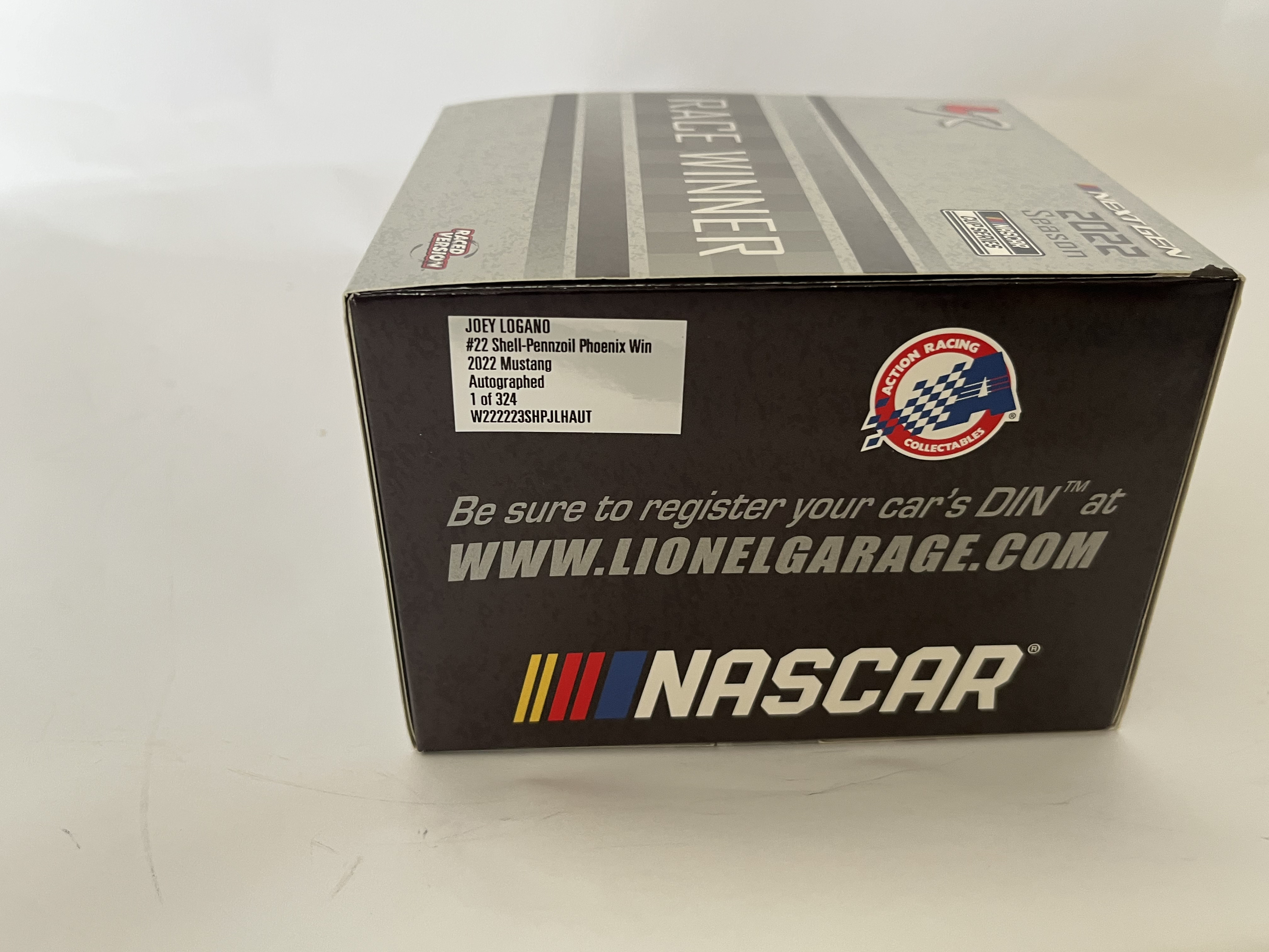 Manufactured by Lionel Racing under the Action Racing Collectables brand, this is a 1:24 scale die-cast model of Joey Logano’s number 22 Shell-Pennzoil Ford Mustang. This specific model is a Raced Version representing the car as it appeared following Logano’s victory at Phoenix during the 2022 NASCAR Cup Series season. The exterior features a specialized paint application designed to simulate track grime, rubber markings, and multi-colored victory lane confetti. The windshield is autographed by the driver in silver-toned ink. The model is mounted on its original black plastic display base which is marked 1:24-SCALE and LIONEL Racing THE OFFICIAL DIECAST OF NASCAR. It is accompanied by its original gray and black Race Winner themed outer box and a clear plastic display cover. The factory label on the box end identifies the item as JOEY LOGANO #22 Shell-Pennzoil Phoenix Win 2022 Mustang Autographed 1 of 324.