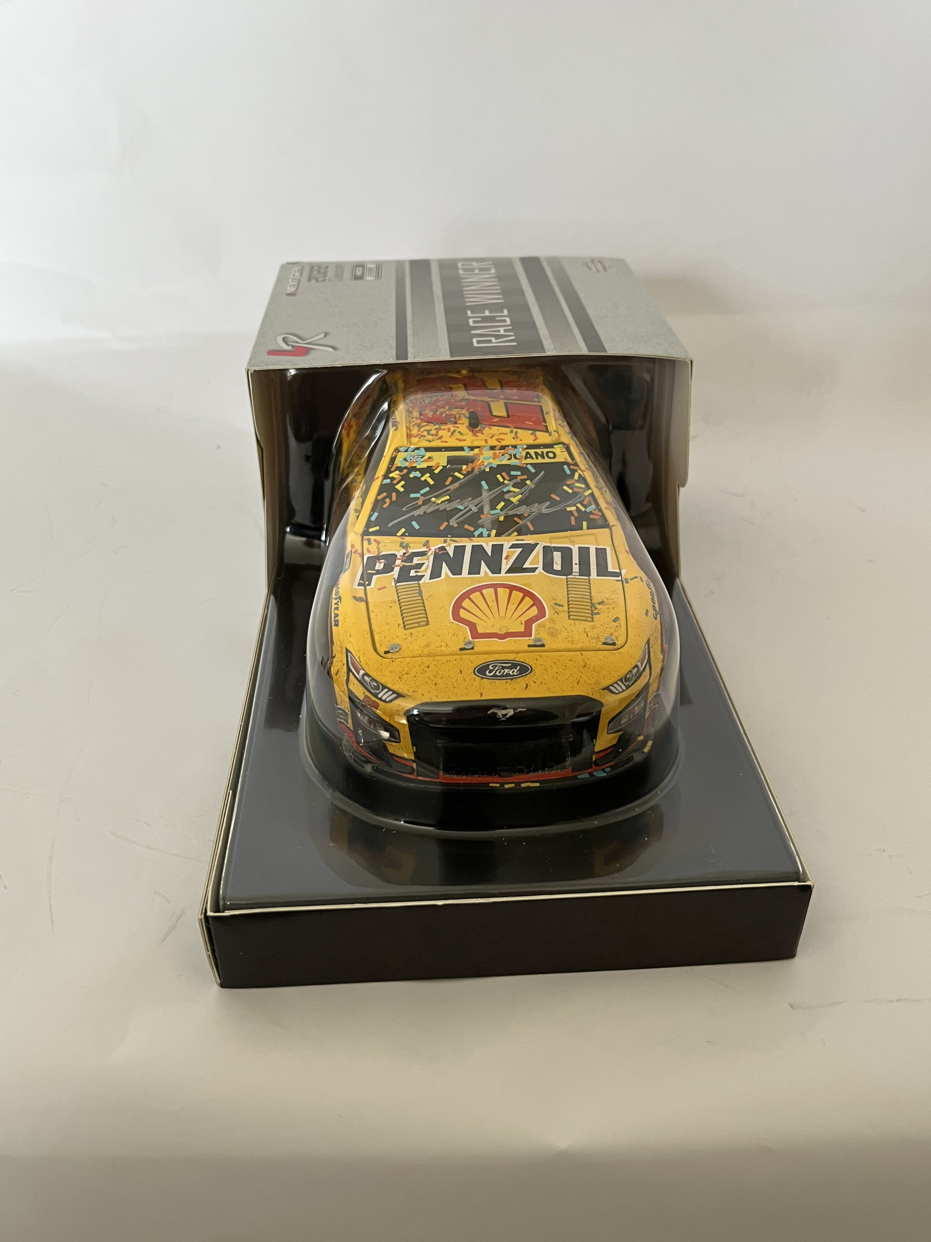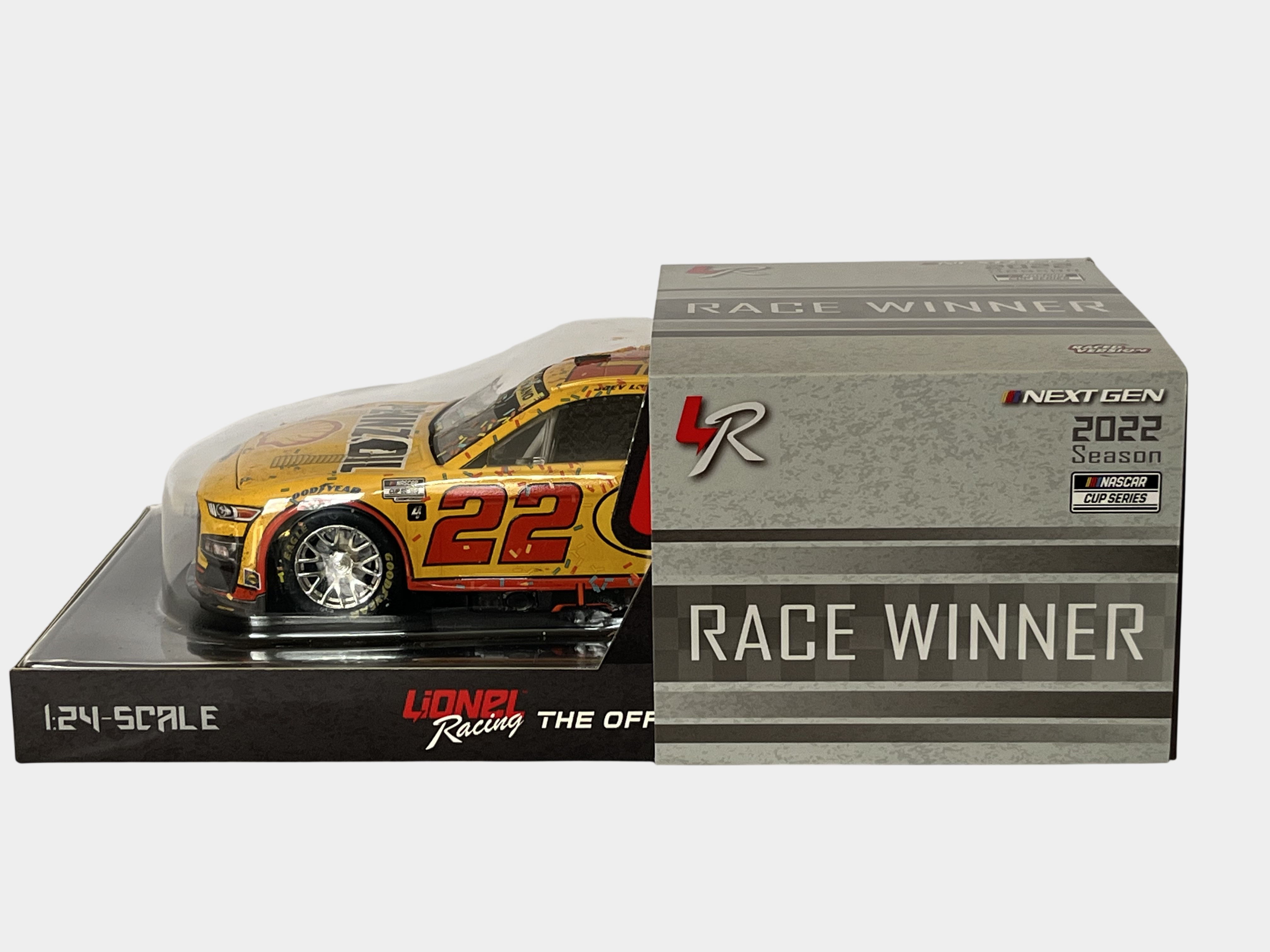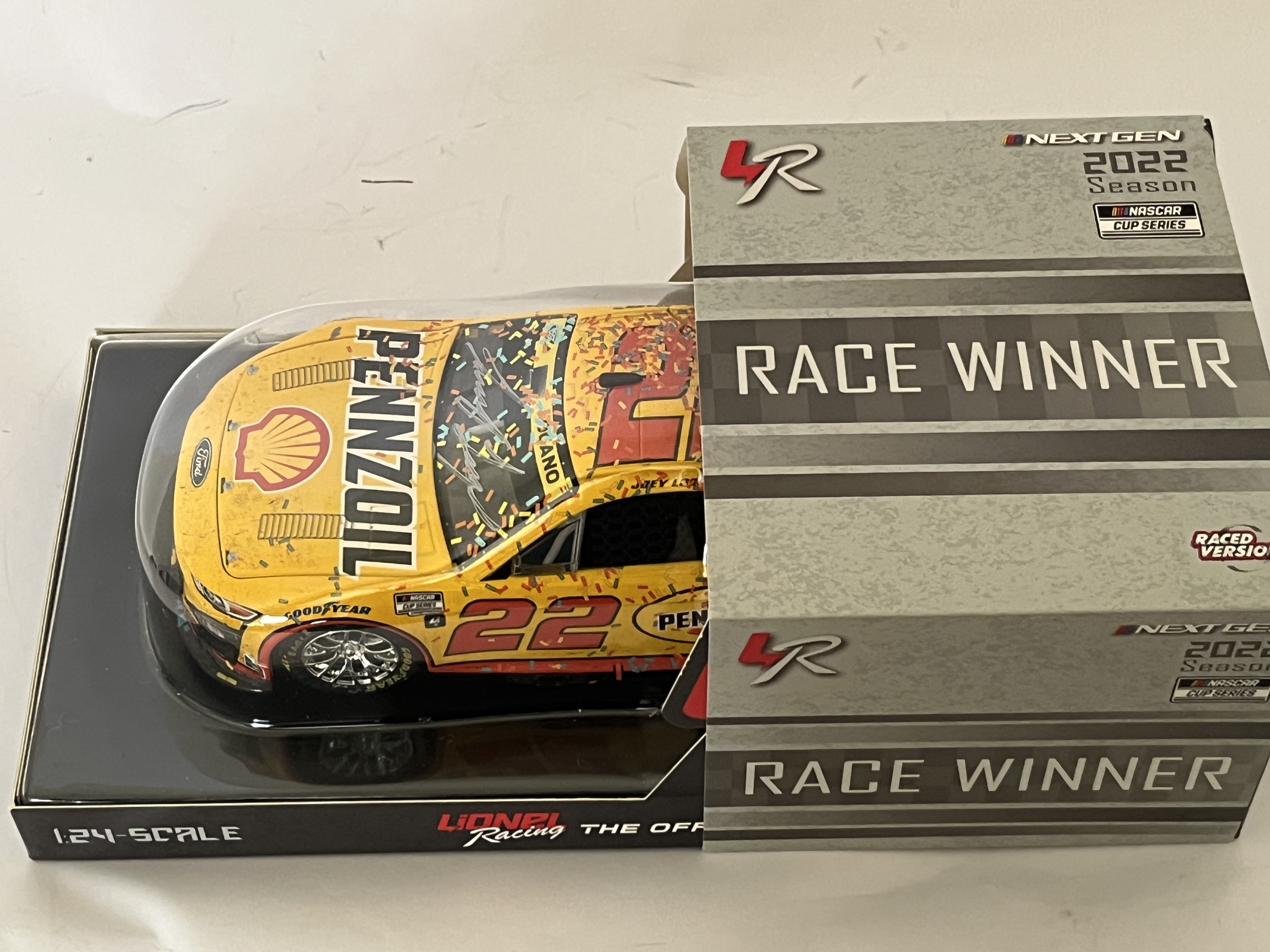 Manufactured by Lionel Racing under the Action Racing Collectables brand, this is a 1:24 scale die-cast model of Joey Logano’s number 22 Shell-Pennzoil Ford Mustang. This specific model is a Raced Version representing the car as it appeared following Logano’s victory at Phoenix during the 2022 NASCAR Cup Series season. The exterior features a specialized paint application designed to simulate track grime, rubber markings, and multi-colored victory lane confetti. The windshield is autographed by the driver in silver-toned ink. The model is mounted on its original black plastic display base which is marked 1:24-SCALE and LIONEL Racing THE OFFICIAL DIECAST OF NASCAR. It is accompanied by its original gray and black Race Winner themed outer box and a clear plastic display cover. The factory label on the box end identifies the item as JOEY LOGANO #22 Shell-Pennzoil Phoenix Win 2022 Mustang Autographed 1 of 324.